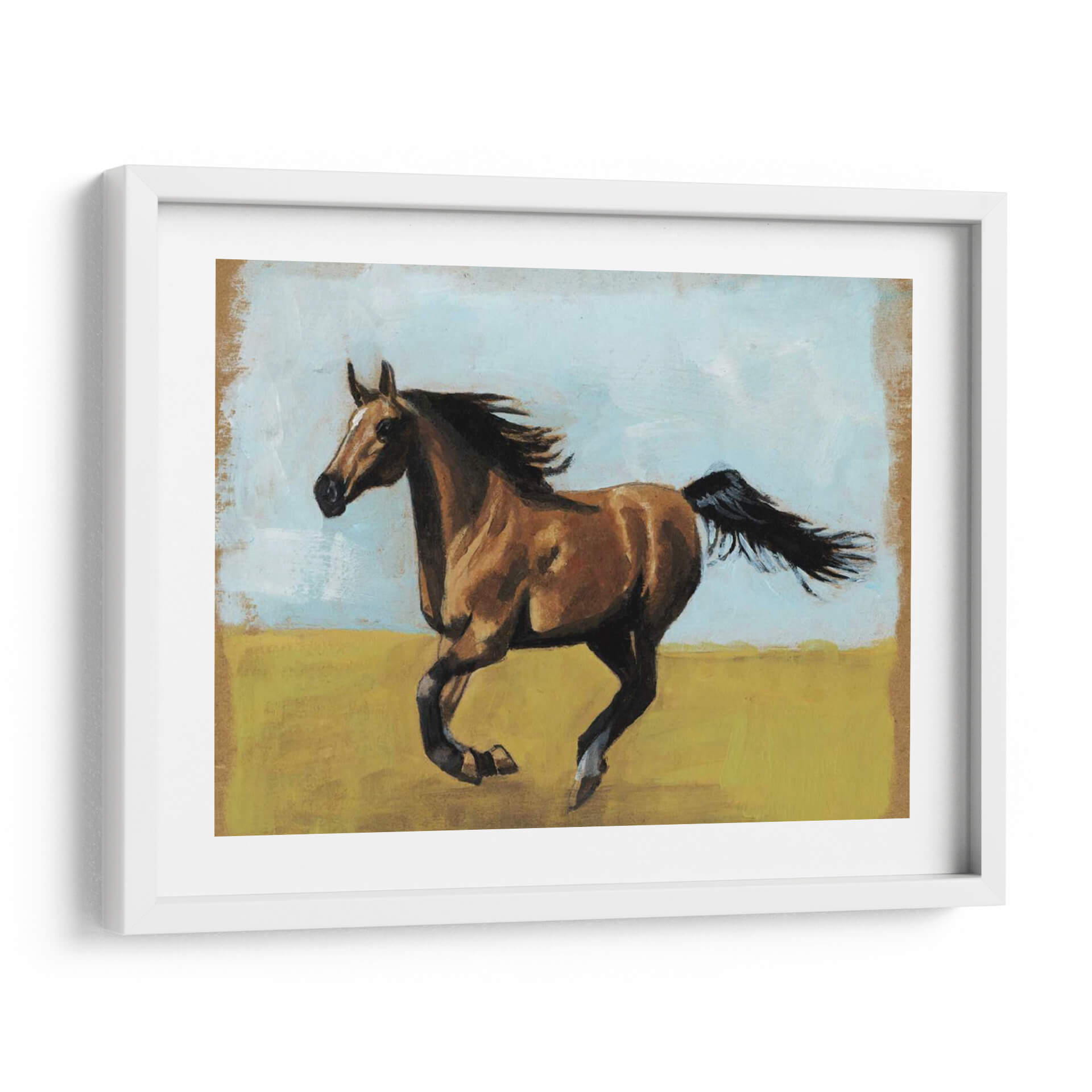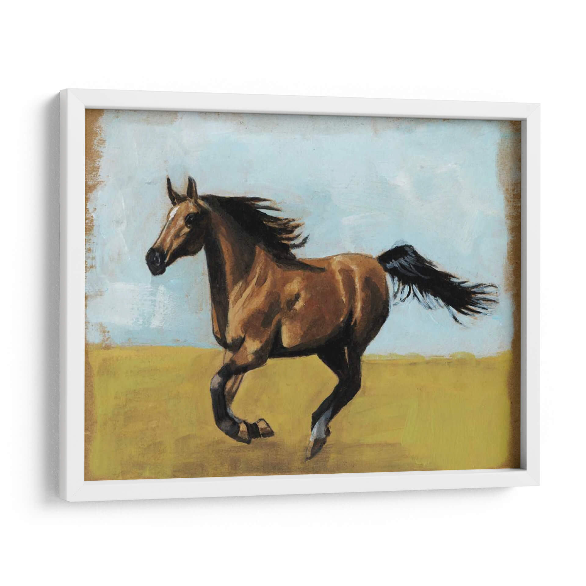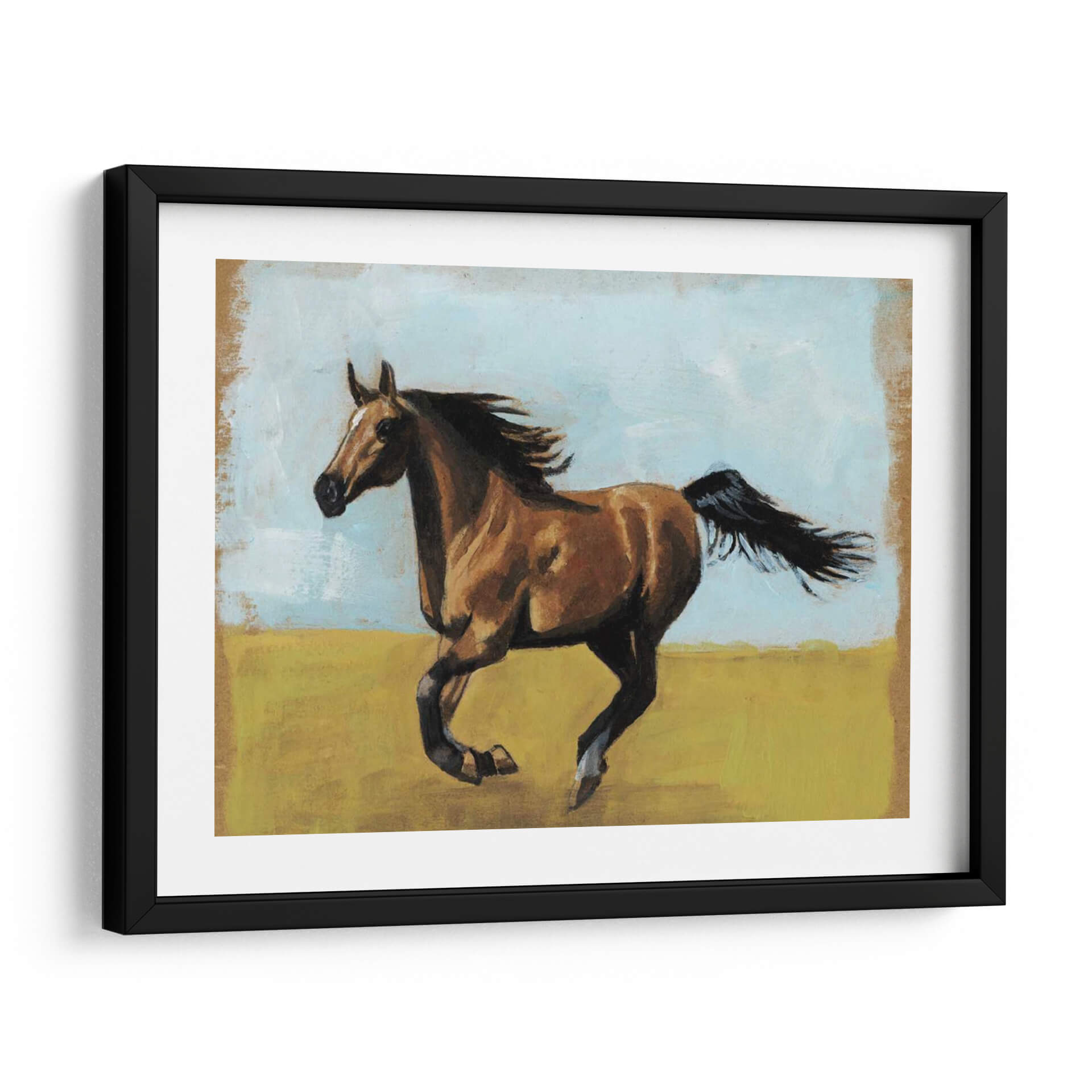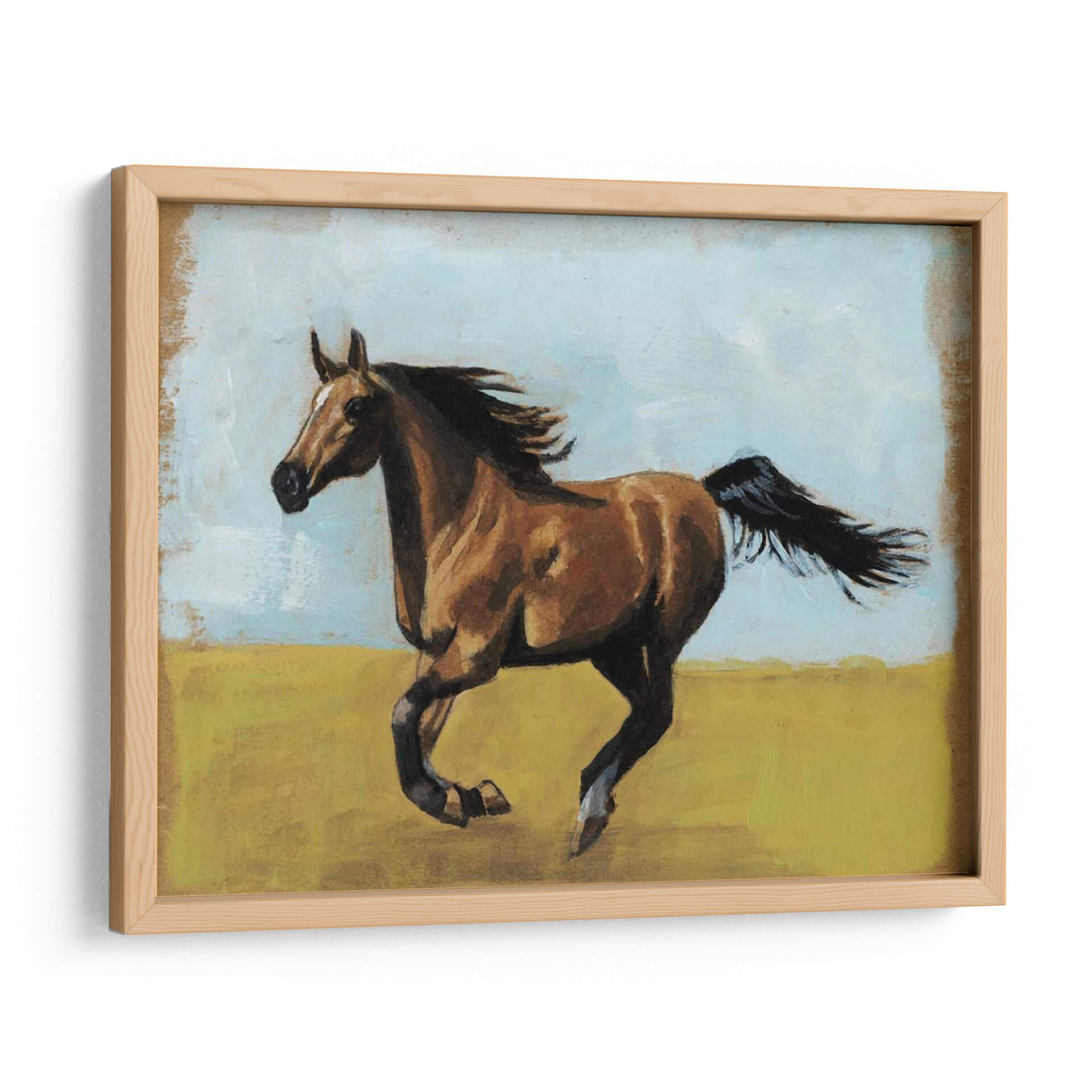 Captura la majestuosidad y la fuerza indómita de la naturaleza con "Estudios Ecuestres II" de Naomi McCavitt, un cuadro decorativo que evoca la libertad del movimiento. Esta obra maestra presenta un caballo de color marrón profundo en pleno galope, con su crin y cola ondeando al viento, transmitiendo una sensación de energía y vitalidad. El artista utiliza pinceladas audaces y texturizadas para dar vida a la figura equina, resaltando su musculatura y la gracia de su trote. La paleta de colores se centra en tonos tierra cálidos, con un contraste vibrante entre el amarillo ocre del suelo y el azul cielo suave del fondo, creando una atmósfera serena pero dinámica. Los bordes rústicos y la técnica pictórica sugieren una conexión con lo orgánico y lo auténtico. Este cuadro es ideal para añadir un toque de sofisticación y espíritu salvaje a salones modernos, estudios o incluso dormitorios, funcionando como un punto focal cautivador. "Estudios Ecuestres II" no es solo una pieza decorativa, sino una invitación a sentir la potencia y la elegancia del caballo en movimiento, resonando con quienes aprecian el arte figurativo contemporáneo y buscan infundir sus espacios con carácter y emoción. Una adición perfecta para coleccionistas de arte ecuestre o para quienes desean traer la belleza del mundo natural al interior de su hogar.