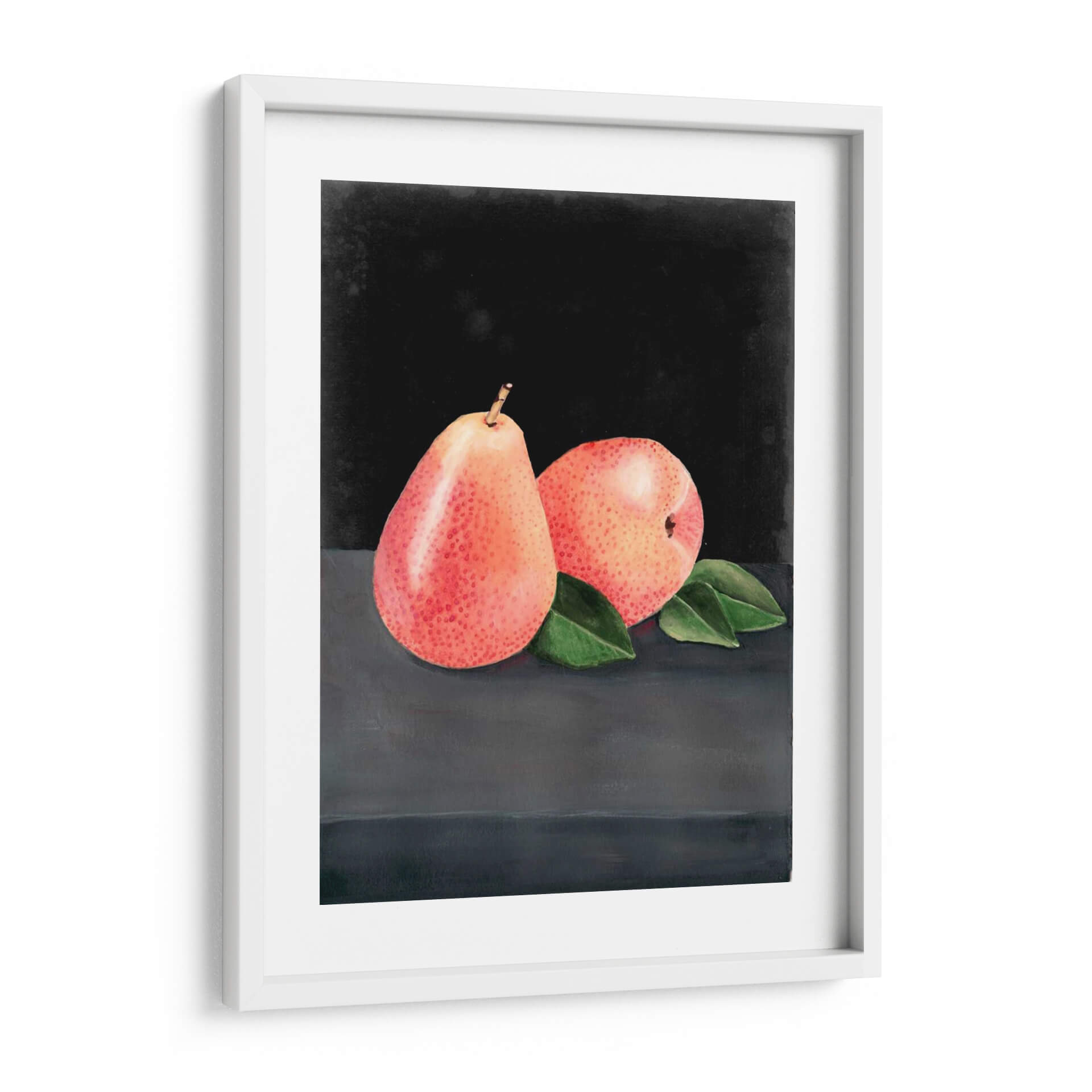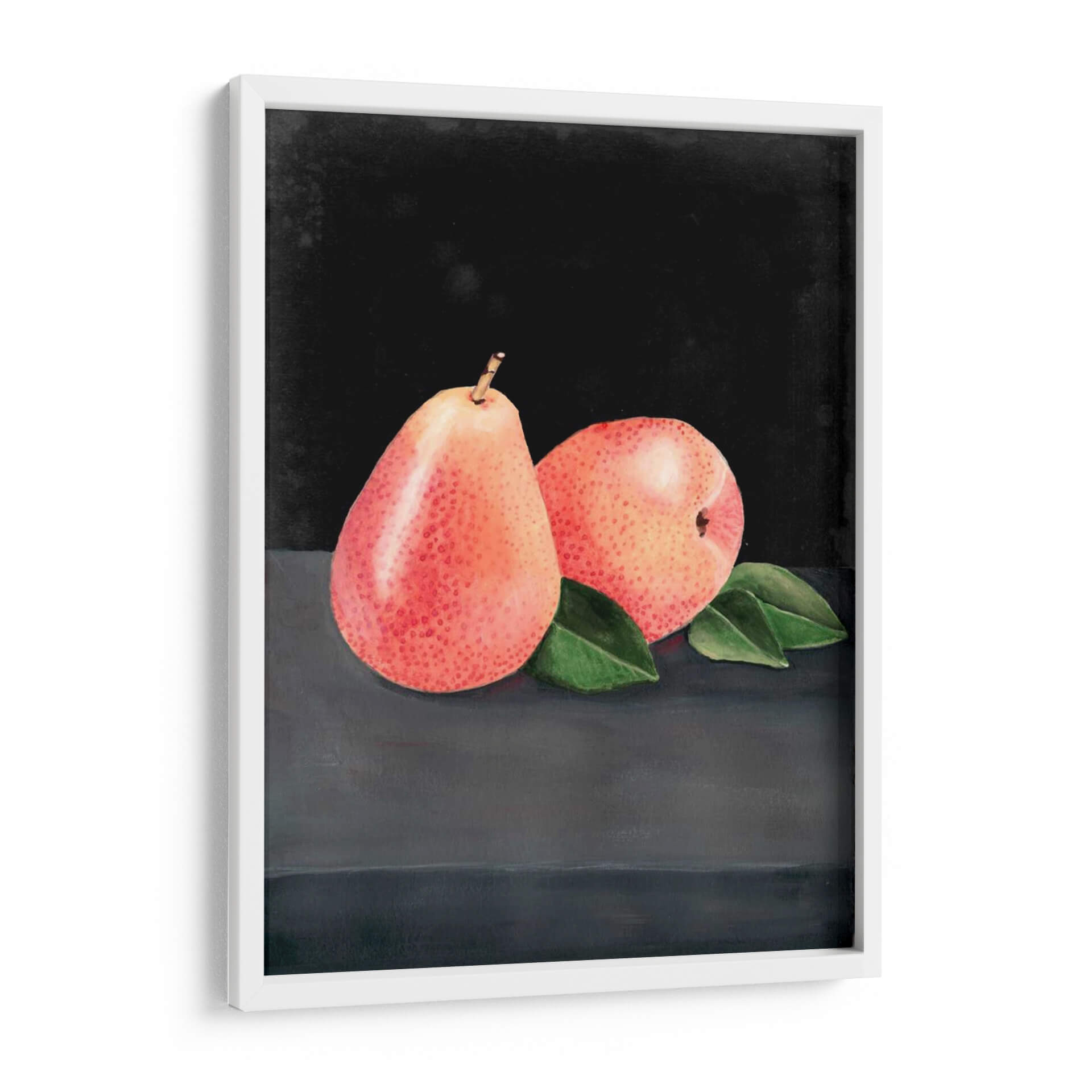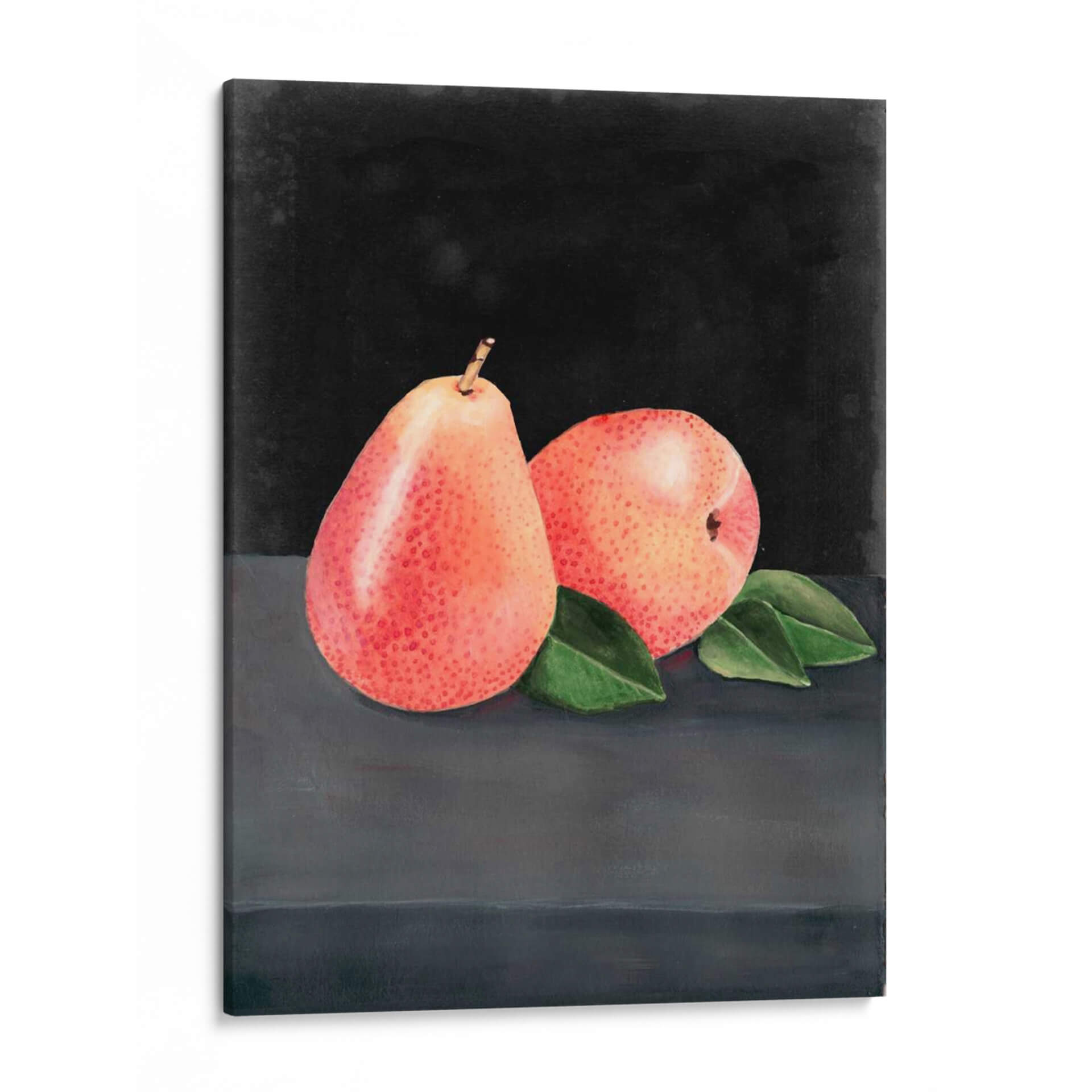 Inmortaliza la frescura y la sencillez con este cautivador cuadro decorativo de "Fruta En El Estante Vi", una obra de la talentosa artista Naomi McCavitt. La pieza presenta dos peras de un vibrante tono rojizo anaranjado, dispuestas sobre una superficie oscura y misteriosa, acompañadas de hojas verdes que aportan un toque de vitalidad natural. Los colores cálidos de la fruta contrastan sutilmente con el fondo profundo y el plano inferior sombrío, creando una atmósfera de intimidad y contemplación. La técnica de pintura evoca una sensación de realismo sutil, invitando al espectador a apreciar la textura y la forma de cada pera. Este cuadro es ideal para añadir un punto de interés visual a tu cocina, comedor o cualquier espacio que busque un toque de naturaleza estilizada y elegancia discreta. Su composición equilibrada y su paleta de colores sugerente lo convierten en una pieza versátil, capaz de complementar tanto decoraciones modernas como rústicas. "Fruta En El Estante Vi" no es solo una representación de fruta, es una invitación a disfrutar de la belleza en lo cotidiano, aportando serenidad y un toque artístico a tu hogar.