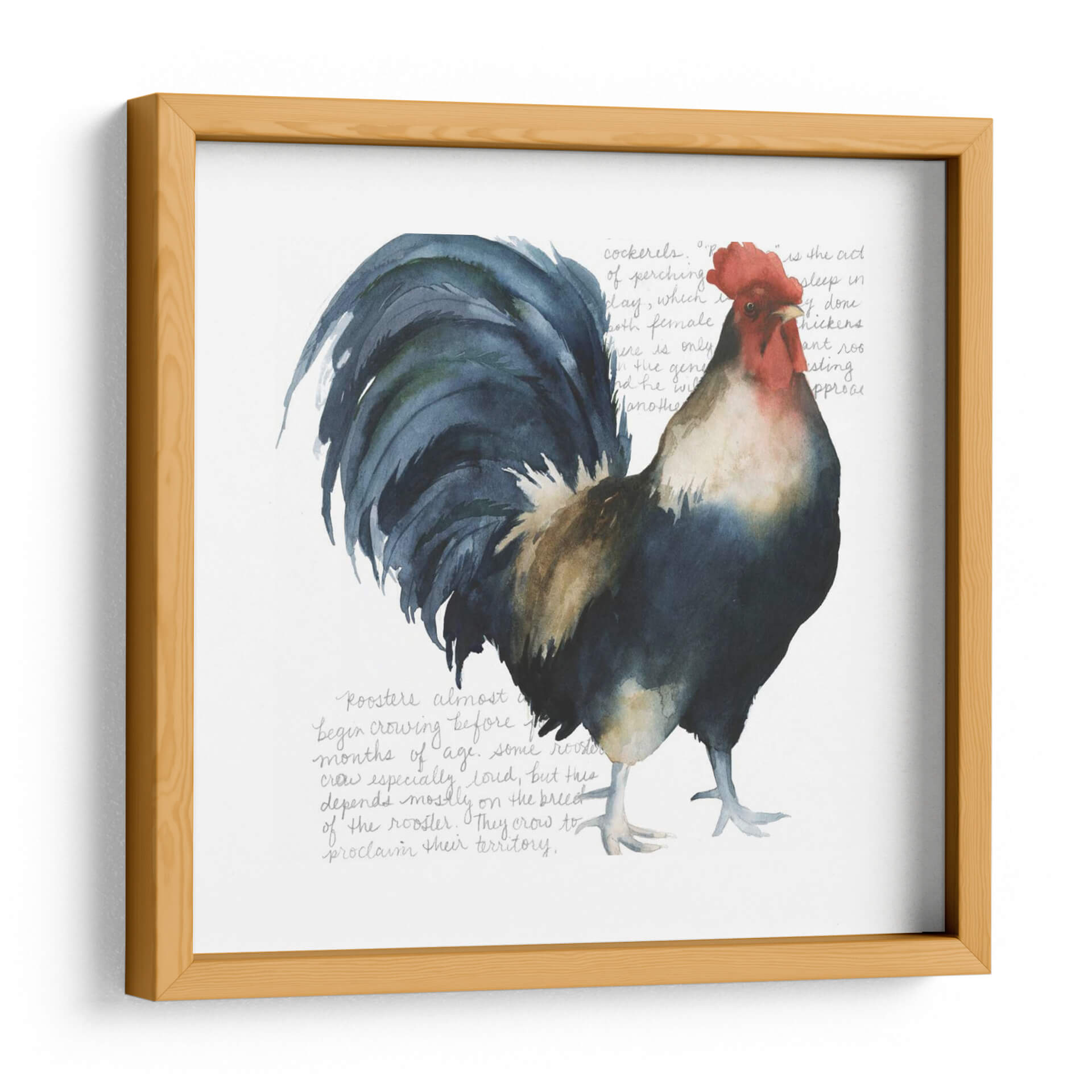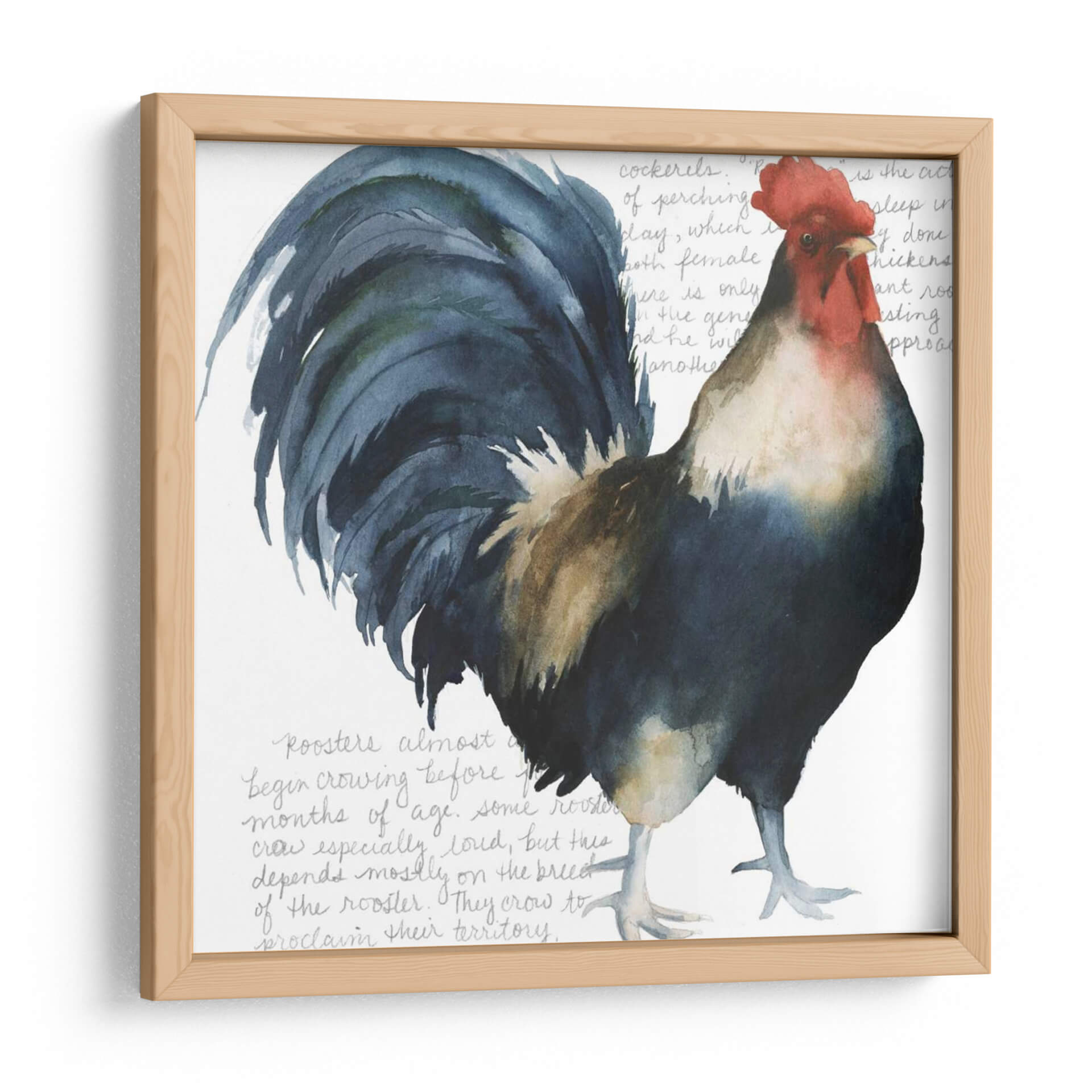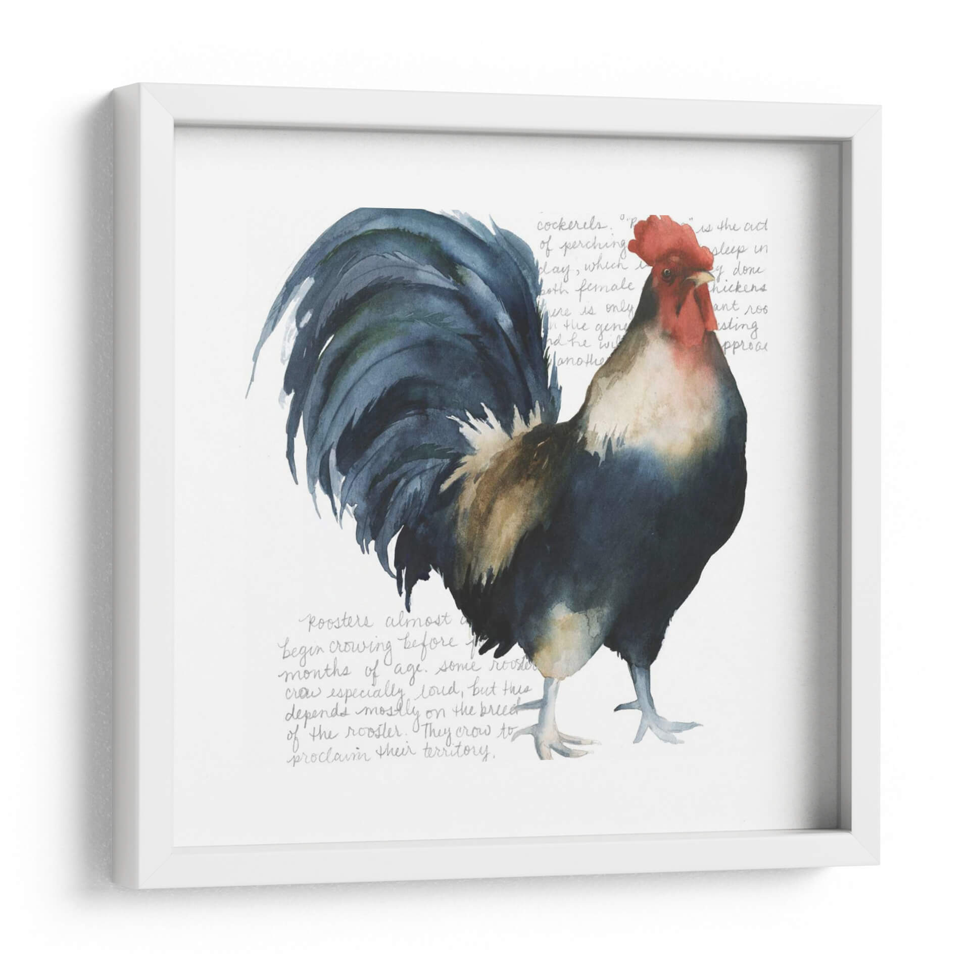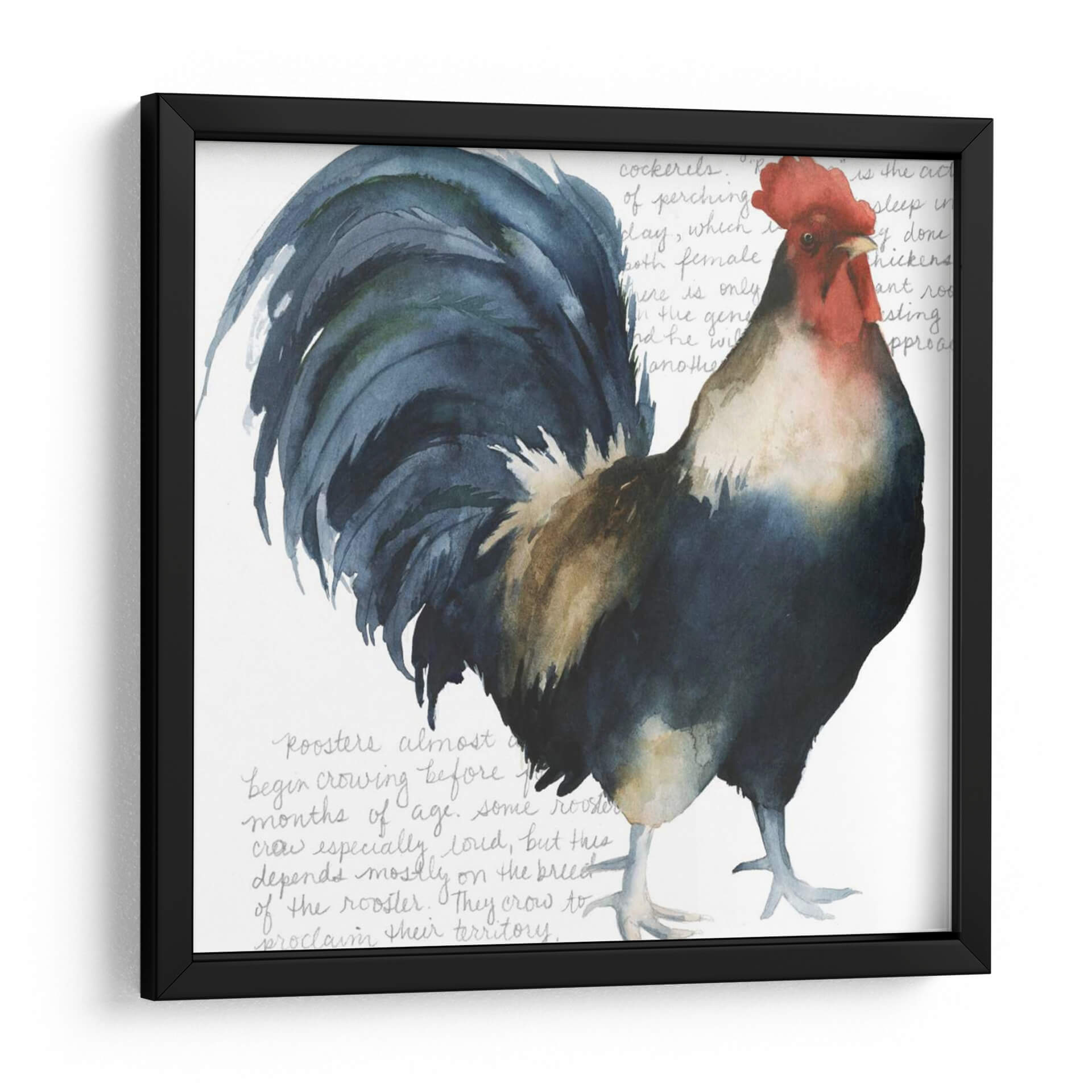 Captura la esencia rústica y vibrante de la vida en el campo con "Gallo Cuervo Yo", una obra de arte de Grace Popp que celebra la majestuosidad del gallo. Esta pieza, realizada con una técnica que evoca la delicadeza de la acuarela, presenta a un gallo imponente en tonos profundos de azul cobalto, negro, ocre y un vibrante rojo en su cresta. El fondo blanco, sutilmente texturizado con lo que parecen ser anotaciones caligráficas o fragmentos de texto antiguo en gris pálido, crea un contraste limpio que resalta la figura central, otorgándole una presencia casi escultórica. La composición se centra en el gallo, cuya mirada directa y postura orgullosa transmiten una sensación de fuerza y vitalidad. Ideal para añadir un toque de carácter y color a cocinas, comedores o cualquier espacio que busque un punto focal orgánico y lleno de vida. Esta obra no es solo decoración, es una ventana a la naturaleza y al espíritu indomable del campo, perfecta para quienes aprecian el arte figurativo con un toque contemporáneo y expresivo. "Gallo Cuervo Yo" invita a la reflexión sobre la belleza de lo cotidiano y la magnificencia en los detalles.