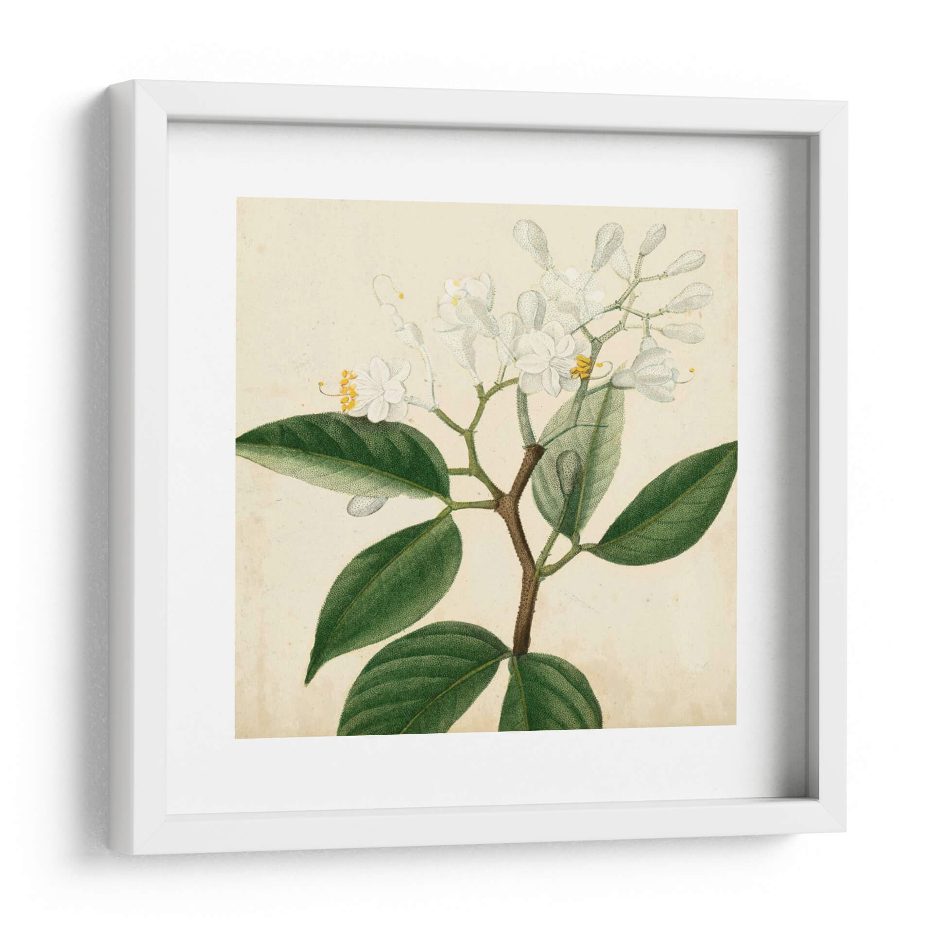 Emb uevo en la serenidad botánica con "Garden Bounty Vi", una obra de arte que captura la delicadeza de la naturaleza con un estilo inspirado en las ilustraciones botánicas clásicas. Esta pieza presenta un vibrante ramo de flores blancas y capullos, adornados con detalles sutiles de amarillo, emergiendo de un follaje verde intenso y exuberante. La paleta de colores, dominada por verdes profundos y blancos puros sobre un fondo crema envejecido, evoca una sensación de calma, elegancia y conexión con el mundo natural. La composición, que se centra en la intrincada rama y sus flores, ofrece una visión detallada y casi científica, pero imbuida de una belleza artística palpable. Ideal para añadir un toque de sofisticación atemporal a cualquier espacio, desde un sereno dormitorio hasta una luminosa sala de estar o un estudio tranquilo. "Garden Bounty Vi" no es solo una decoración, sino una invitación a apreciar la belleza efímera de la botánica en su máxima expresión, transformando tu hogar en un santuario de paz y estilo.