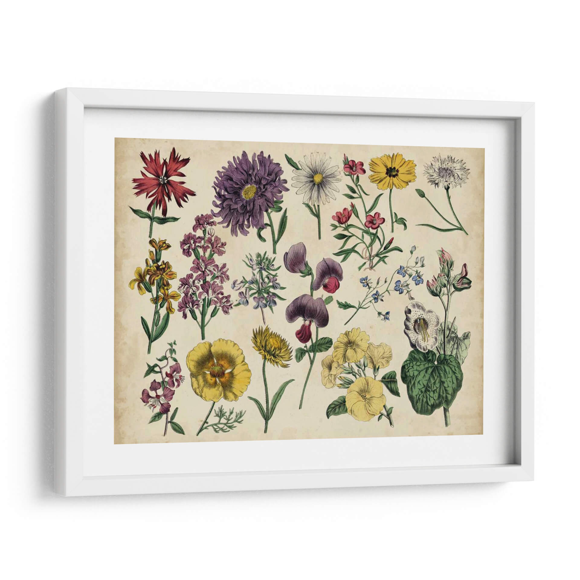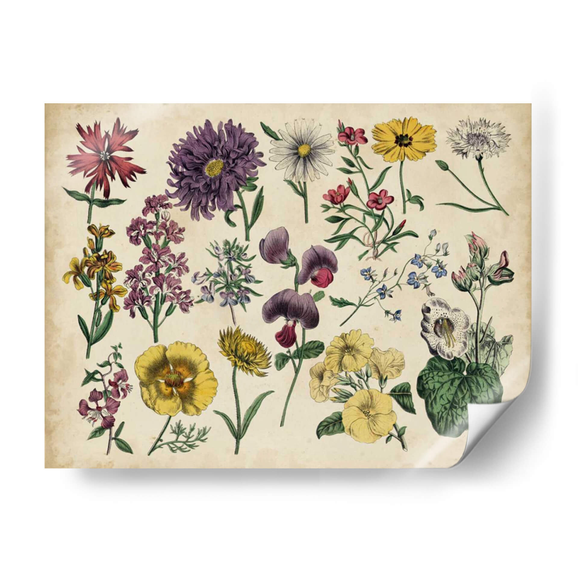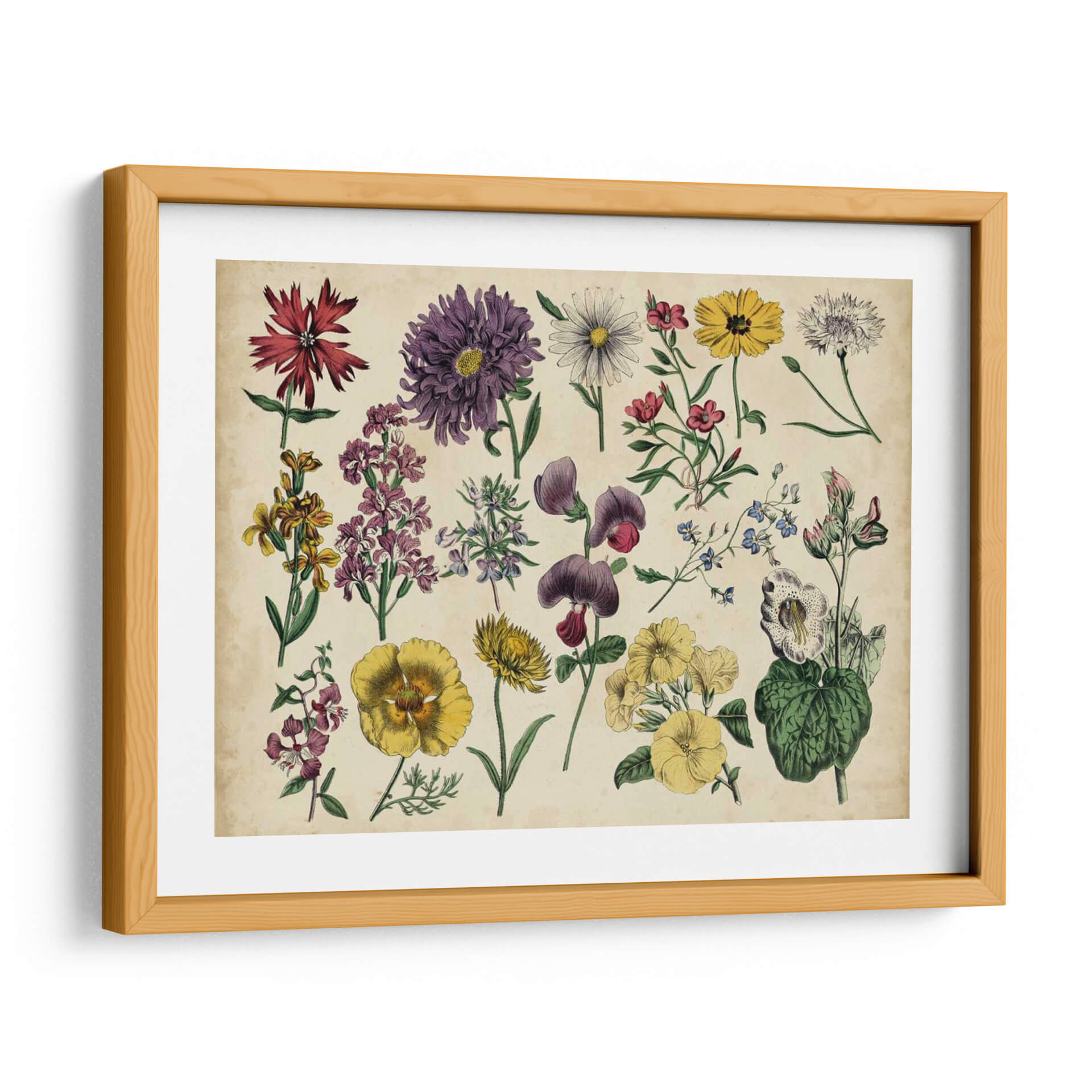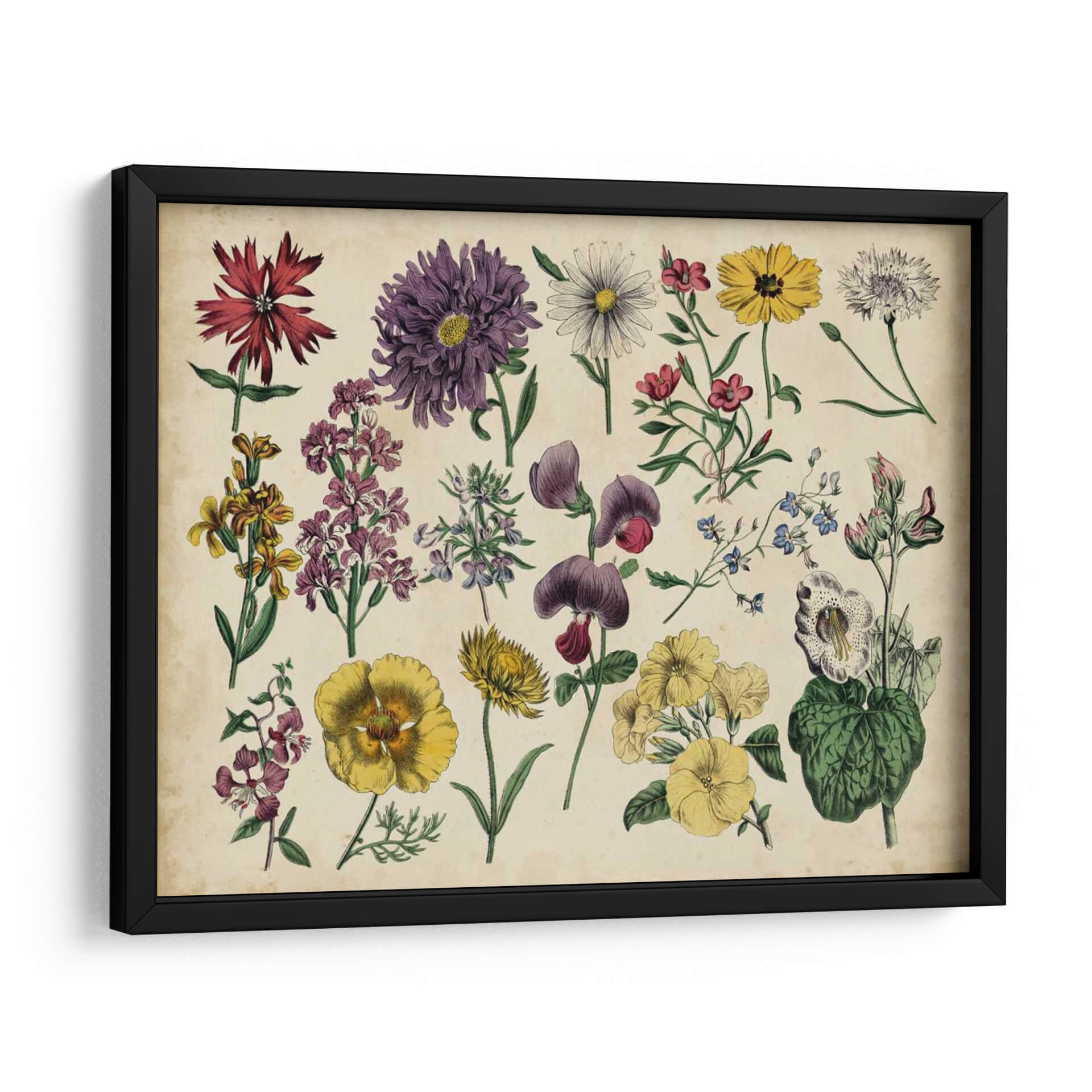 Embellece tu hogar con el encanto atemporal del cuadro decorativo 'Gráfico Botánico Antiguo IV'. Esta exquisita pieza captura la belleza detallada de diversas flores y plantas en un estilo de ilustración botánica clásica, evocando una sensación de nostalgia y apreciación por la naturaleza. La paleta de colores, dominada por tonos tierra, verdes y toques vibrantes de morado, amarillo y rojo, aporta calidez y sofisticación a cualquier espacio. Cada flor está representada con una precisión meticulosa, desde los pétalos delicados hasta los tallos y hojas, creando una composición visualmente rica y equilibrada. Este cuadro decorativo es perfecto para añadir un toque de elegancia natural a tu sala de estar, dormitorio, estudio u oficina. Su diseño inspirado en grabados botánicos antiguos lo convierte en un punto focal ideal para ambientes que buscan un aire clásico o vintage, pero también puede complementar a la perfección una decoración moderna, aportando un contraste orgánico y una dosis de color. Transforma tus paredes en una galería botánica y disfruta de la serenidad y el detalle que esta obra aporta a tu vida diaria. Ideal para amantes de la botánica, la historia natural y el arte decorativo.