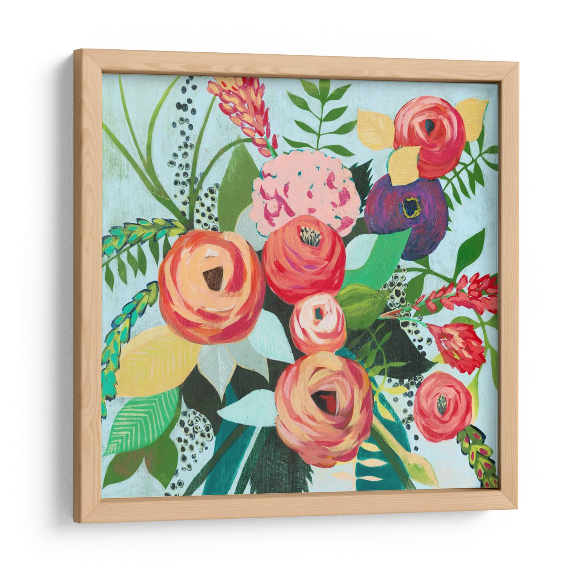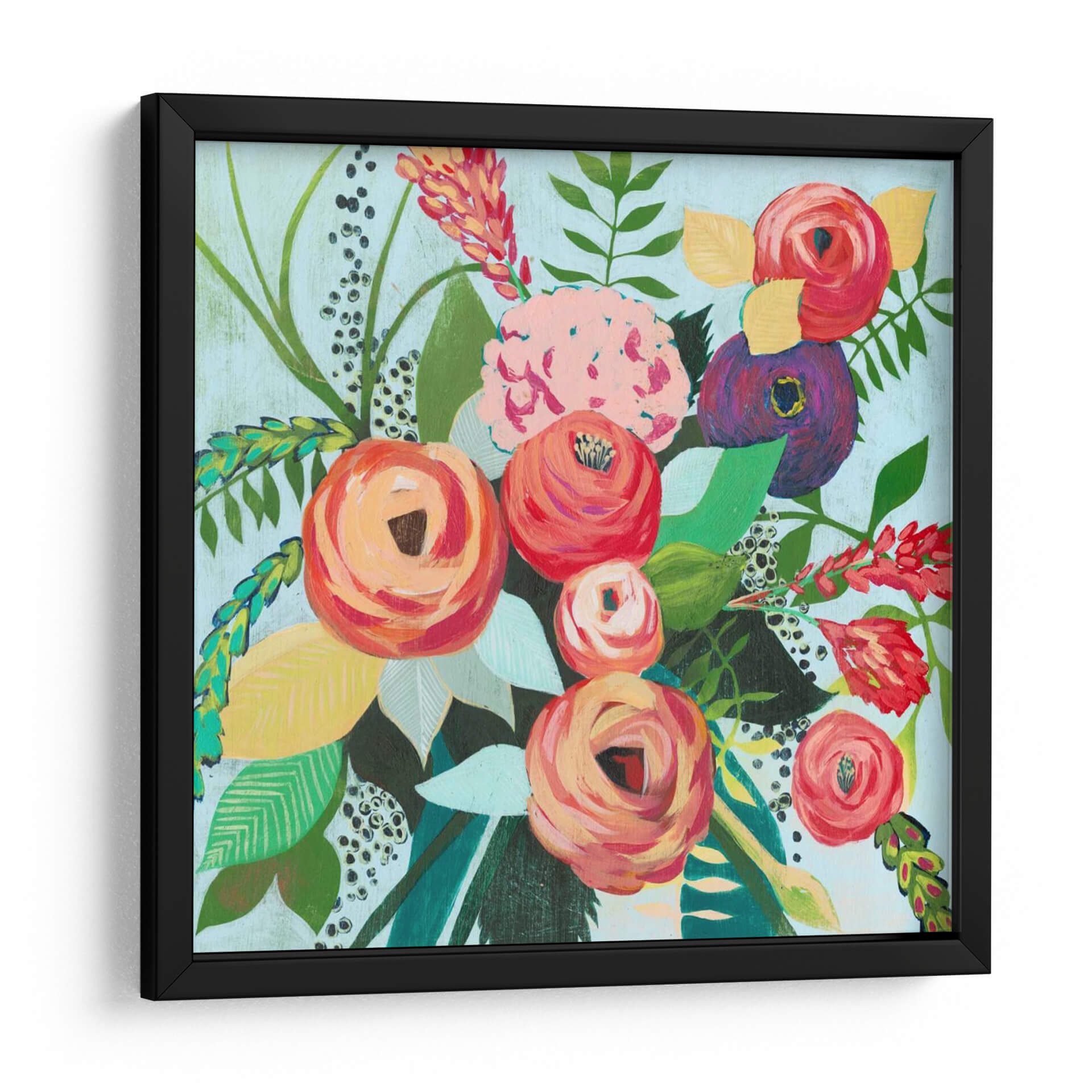 Inunda tu hogar de vida y color con 'Halcyon Bouquet I', una vibrante obra de arte de Grace Popp que captura la alegría exuberante de un jardín en plena floración. Esta pieza se caracteriza por un vibrante despliegue de flores en tonos naranjas, rosas intensos y toques de púrpura, contrastando con un fondo sereno en azul pálido. La técnica pictórica, con pinceladas audaces y texturas visibles, aporta una cualidad moderna y expresiva al ramo. Cada flor parece danzar en el lienzo, creando una composición dinámica y llena de energía que invita a la contemplación. "Halcyon Bouquet I" es ideal para añadir un toque de vitalidad y optimismo a cualquier espacio, ya sea una sala de estar luminosa, un comedor acogedor o incluso un estudio creativo. Su diseño floral contemporáneo la convierte en un punto focal perfecto para quienes buscan una decoración que sea a la vez elegante y llena de personalidad. Este cuadro decorativo evoca sentimientos de felicidad y renovación, transformando tu pared en un jardín de inspiración diaria. Descubre la belleza de la naturaleza reinterpretada por el arte y dale a tu hogar la frescura que merece con esta cautivadora pieza floral.
