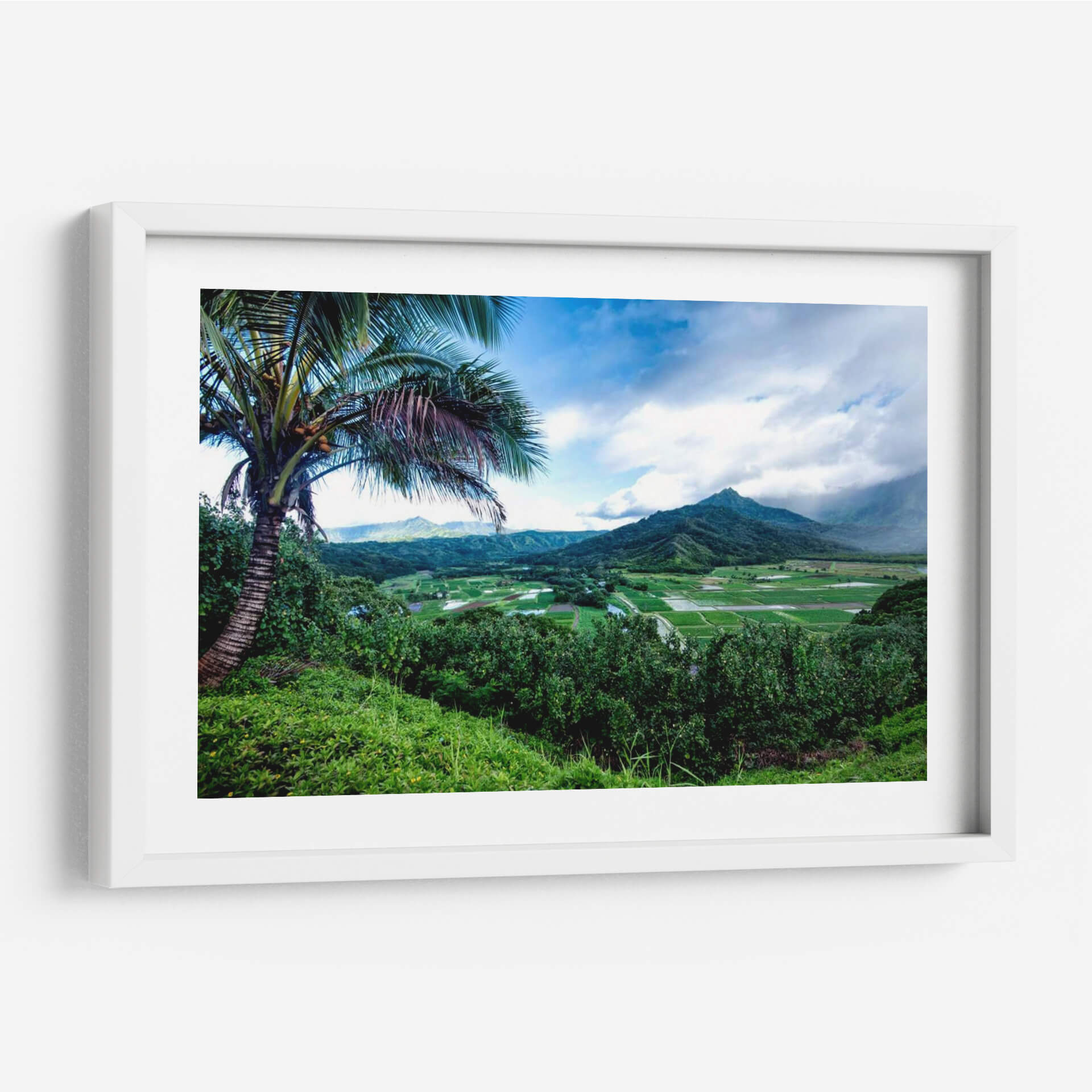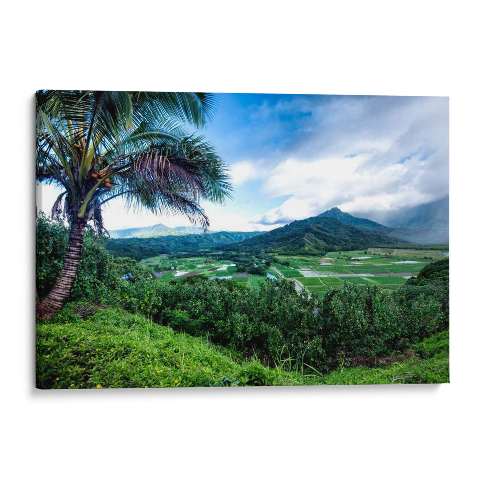 Sumérgete en la exuberante belleza de "Hanalei Valley", una obra maestra del artista Danny Head que captura la esencia de un paraíso tropical. Este cuadro decorativo te transporta directamente a un valle verde vibrante, flanqueado por majestuosas montañas y un cielo azul dinámico con nubes algodonosas. La composición, dominada por una frondosa palmera en primer plano, invita a una profunda contemplación de la naturaleza. Los tonos verdes predominantes, desde el verde esmeralda de la vegetación exuberante hasta el verde más apagado de los arrozales o campos de cultivo en la distancia, crean una atmósfera de serenidad y frescura. La paleta de colores se complementa con toques de azul cielo y el marrón texturizado del tronco de la palmera, aportando realismo y profundidad. El estilo fotográfico y detallado de la obra resalta la magnificencia del paisaje, ideal para añadir un toque de naturaleza y tranquilidad a cualquier espacio. "Hanalei Valley" es más que una simple decoración de pared; es una ventana a un mundo de paz y armonía natural, perfecta para salones, dormitorios o estudios que buscan inspirar calma y conexión con el entorno.
