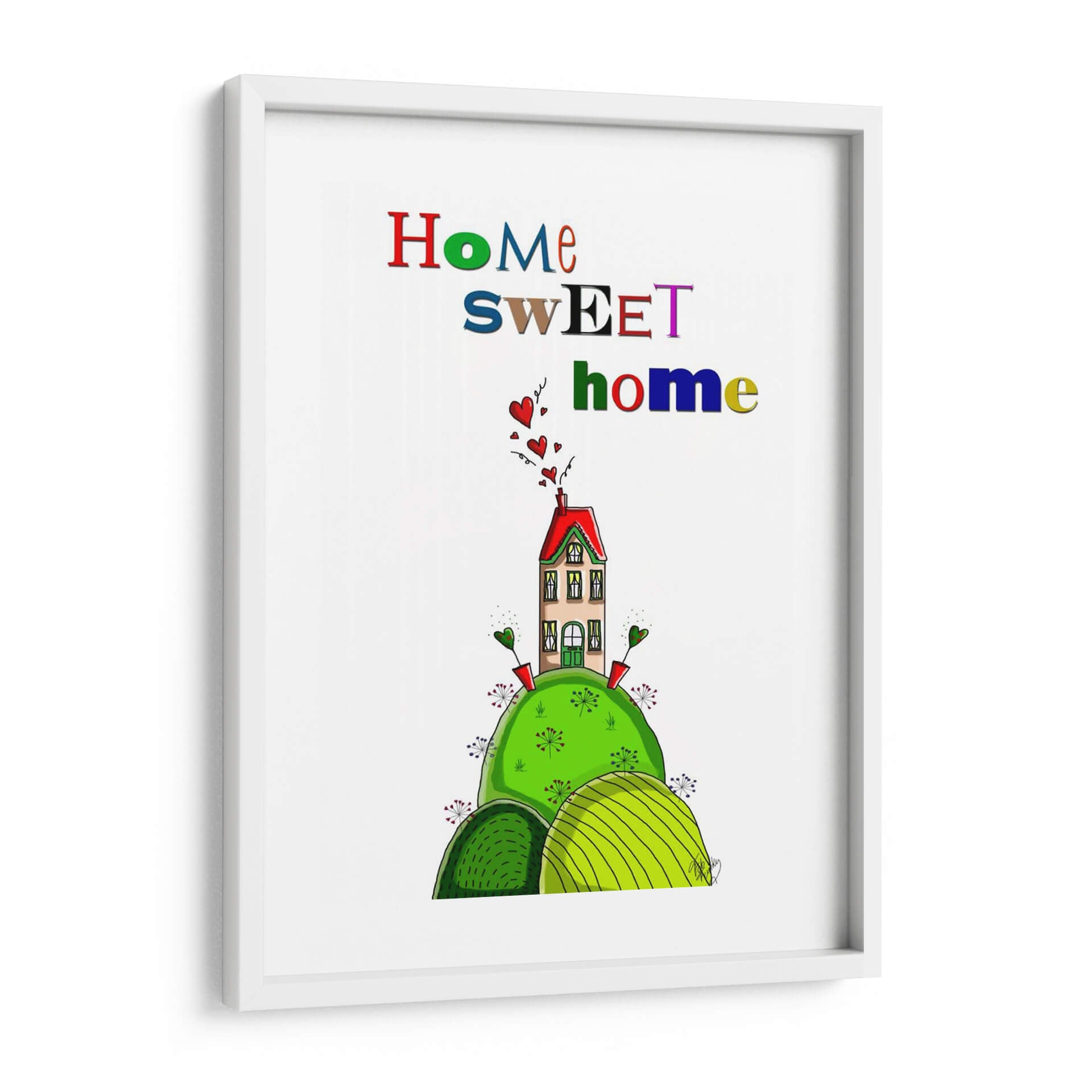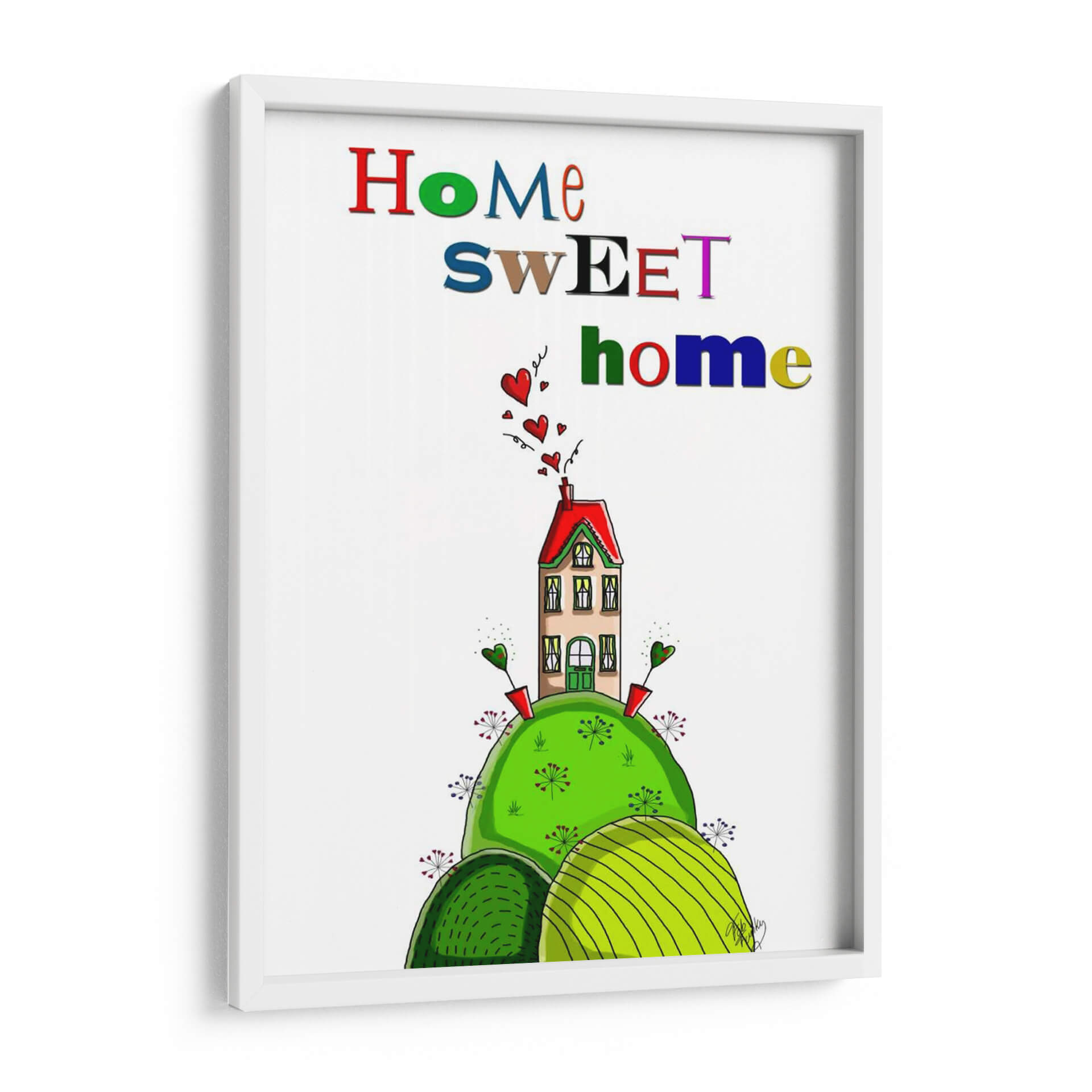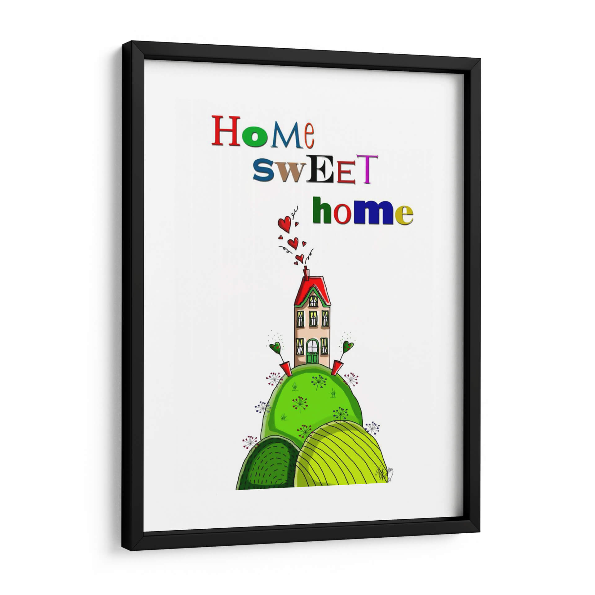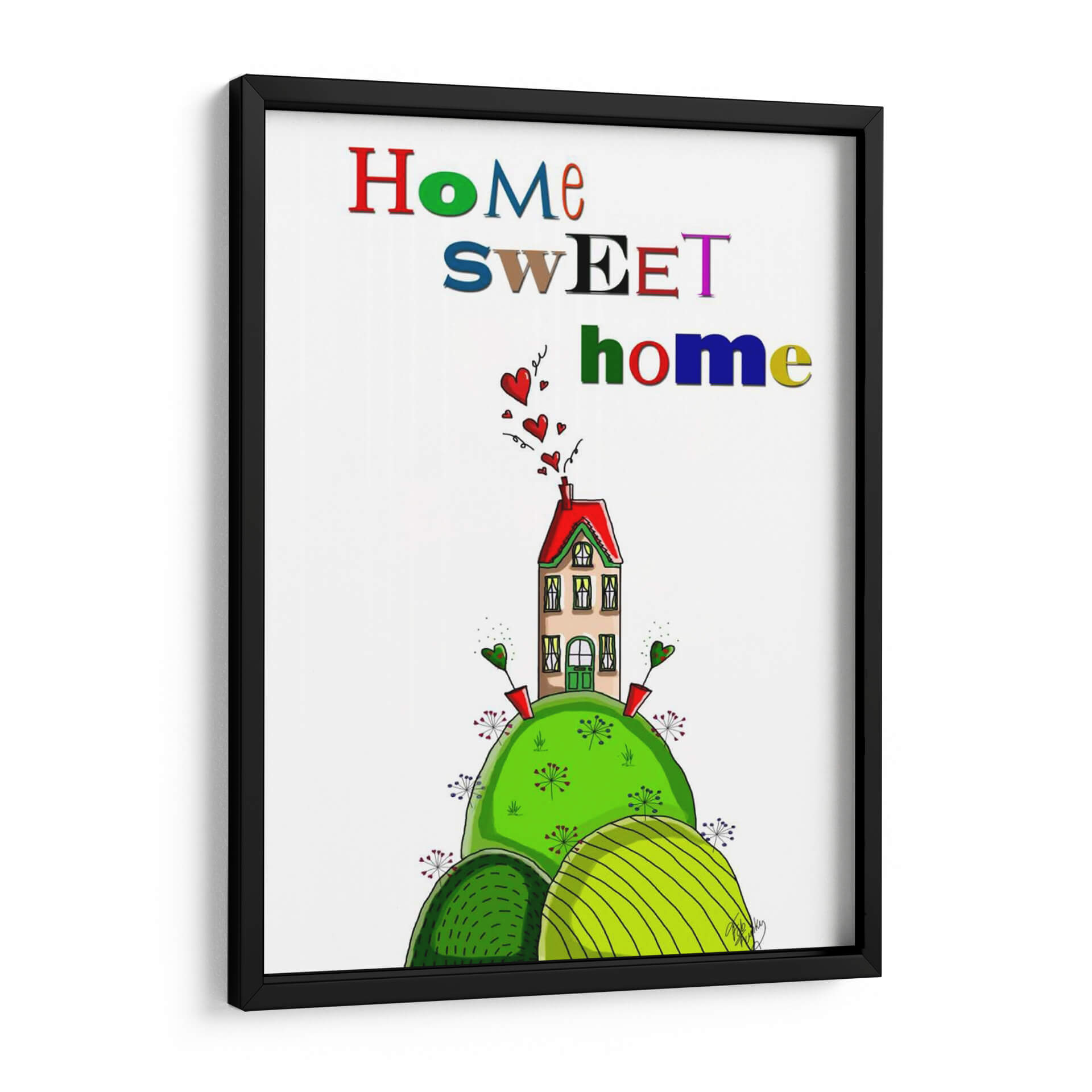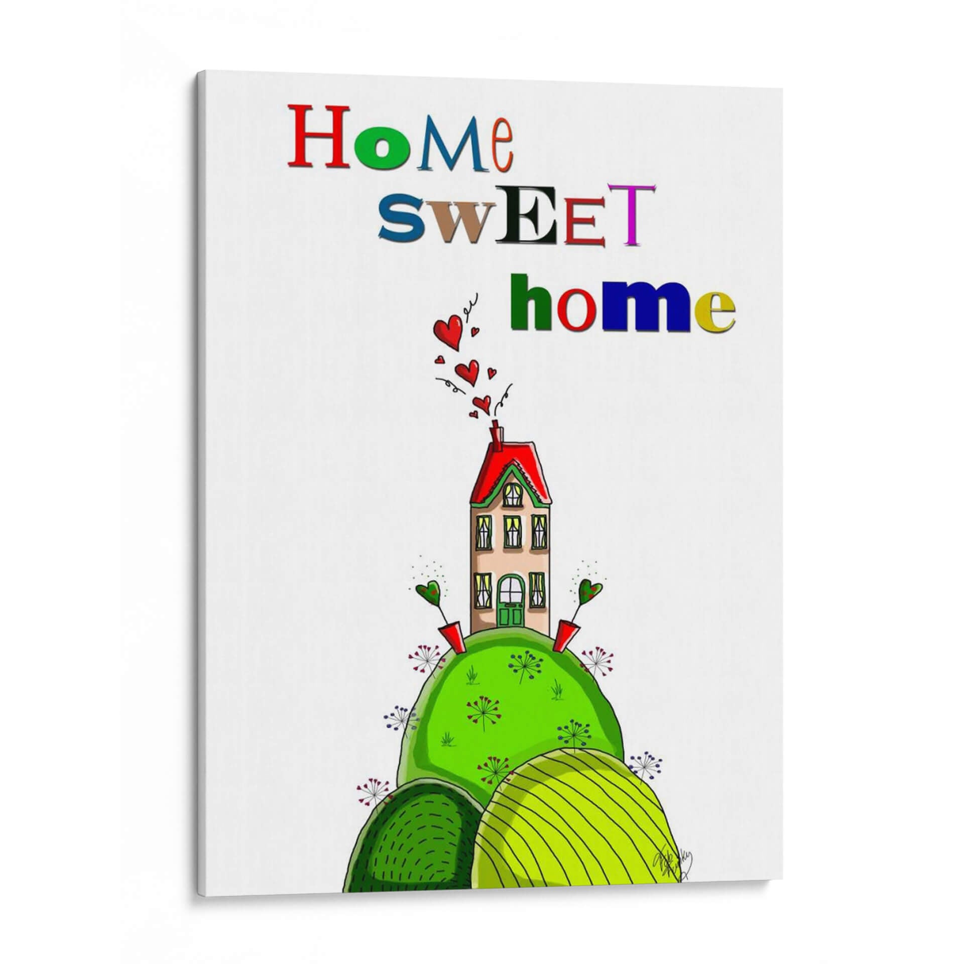 Dale la bienvenida a tu hogar con esta encantadora obra de arte "Hogar Dulce Hogar", una pieza vibrante y acogedora que irradia calidez y alegría. La composición presenta una casa de ensueño, estilizada y colorida, posada sobre una colina exuberante de un verde intenso. Alrededor de la casa, pequeños corazones flotantes añaden un toque de amor y sentimentalismo, mientras que unas flores estilizadas y brotes verdes salpican la base, creando una escena idílica y caprichosa. La paleta de colores es audaz y juguetona, con el rojo vibrante del tejado contrastando maravillosamente con los tonos verdes de la naturaleza y el suave beige de la casa, todo ello realzado por letras multicolores que deletrean "Home Sweet Home". Este cuadro decorativo es perfecto para infundir una sensación de pertenencia y felicidad en cualquier espacio. Su estilo único, cercano a la ilustración infantil pero con un encanto sofisticado, lo convierte en un punto focal ideal para salas de estar, comedores, o incluso como un regalo conmovedor para nuevos hogares o seres queridos. Añade un toque de personalidad y emoción a tu decoración con esta pieza que celebra el concepto de "hogar" en su máxima expresión, invitando a la sonrisa y al bienestar.