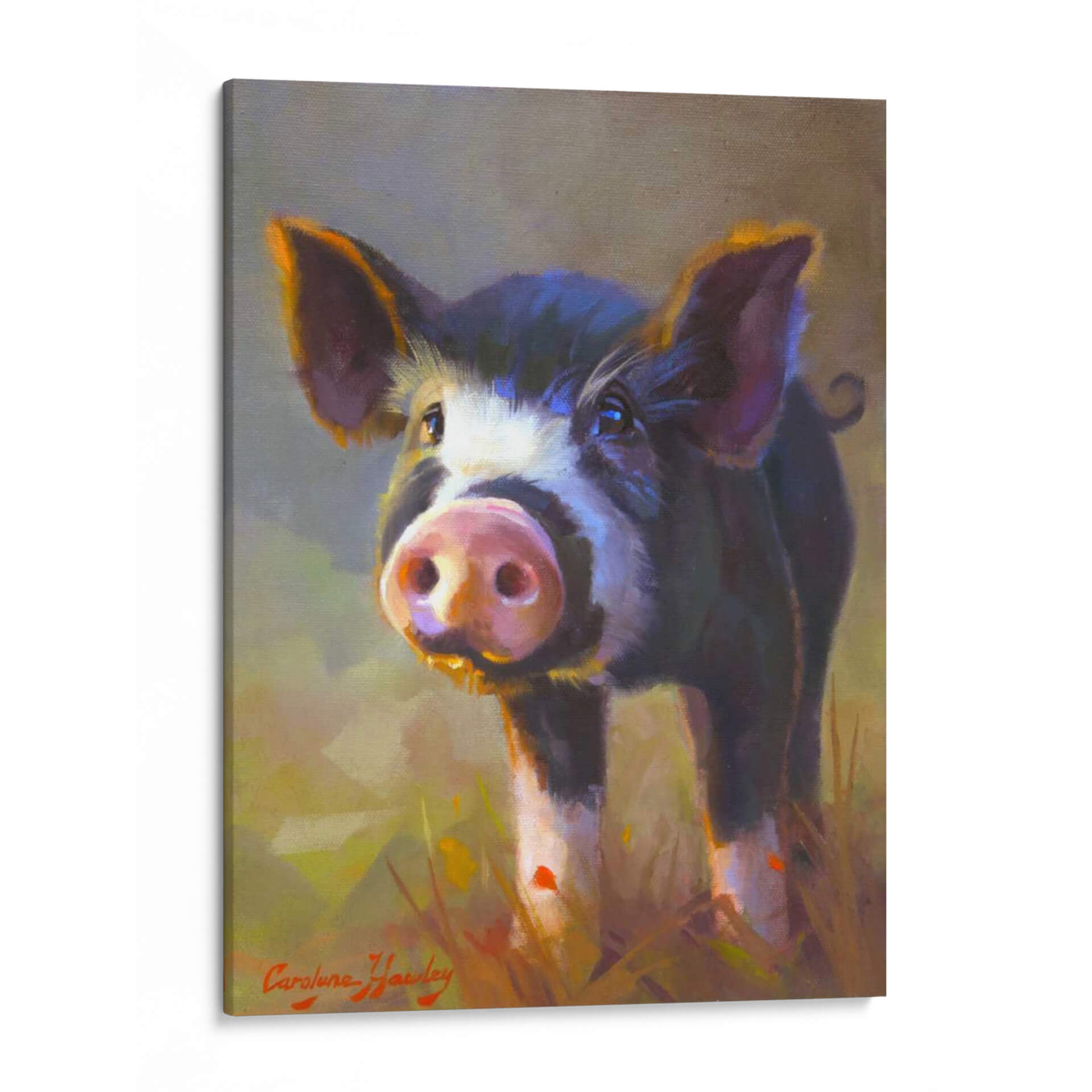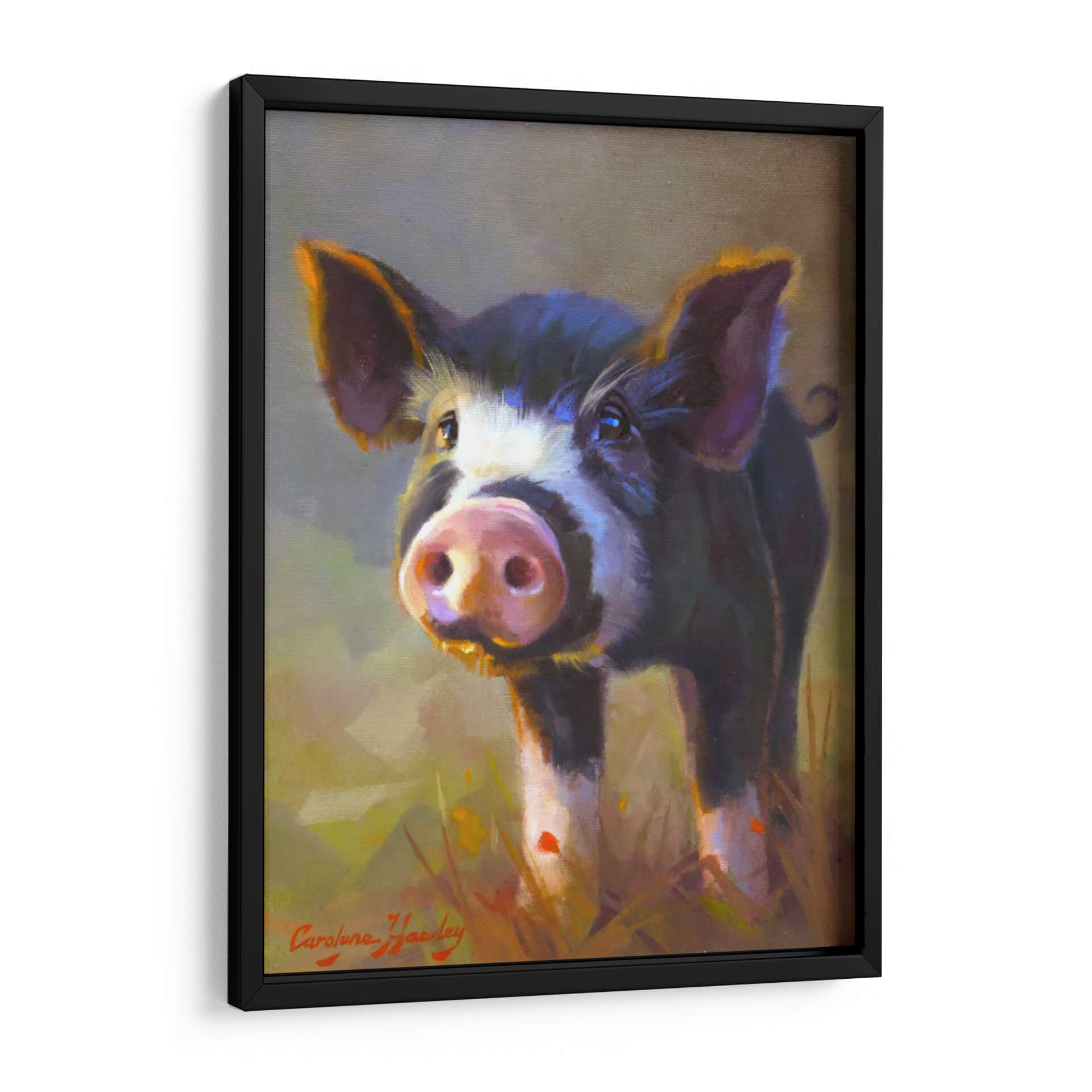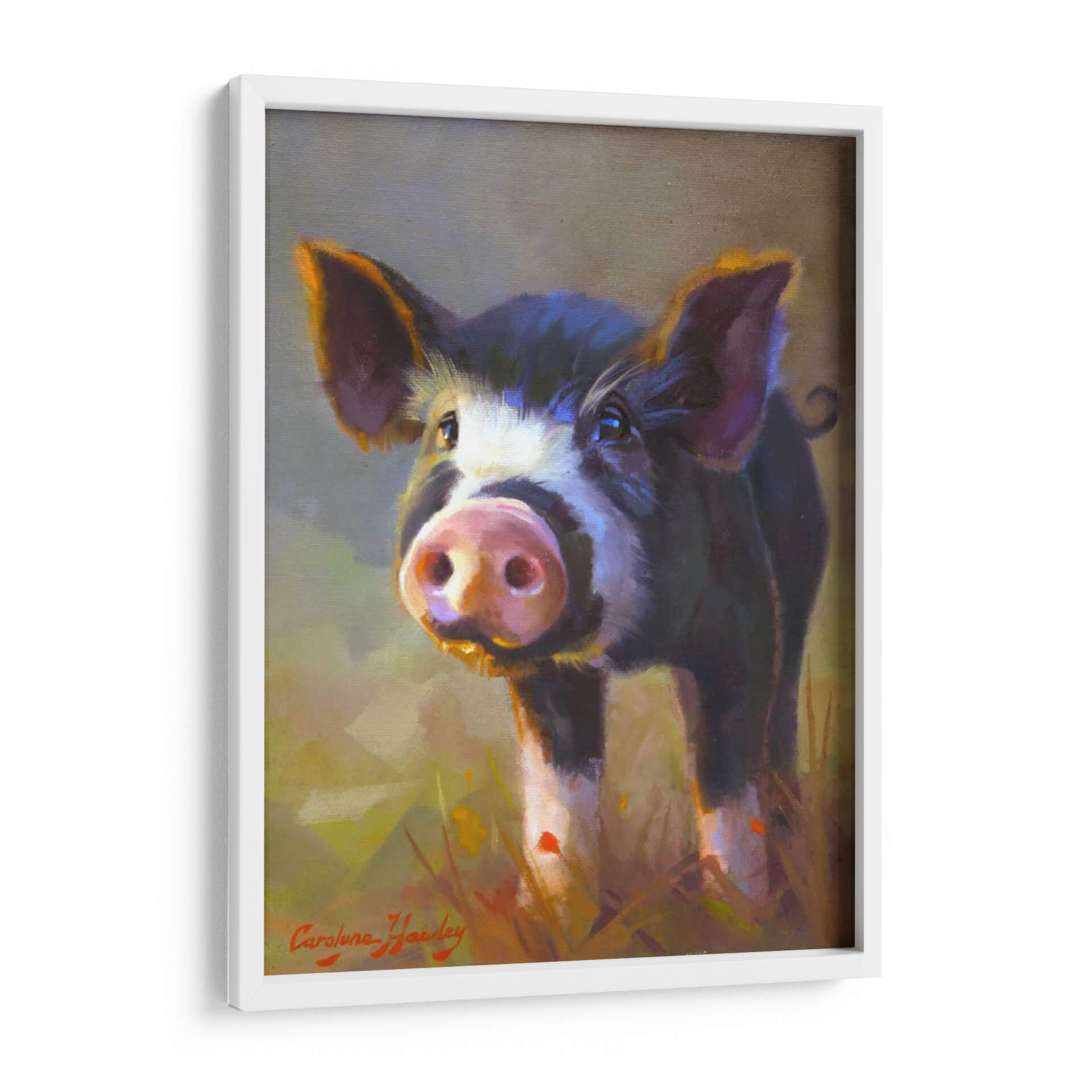 Captura la inocencia y el encanto rústico con este cautivador cuadro decorativo titulado "Jazmín" de Carolyne Hawley. La obra presenta un primer plano de un tierno cerdo, con una mirada curiosa y expresiva que parece interactuar directamente con el espectador. La técnica pictórica, de carácter impresionista y con pinceladas sueltas, aporta una textura vibrante y una sensación de movimiento, especialmente visible en el pelaje del animal y en la hierba que lo rodea. La paleta de colores es rica y cálida, dominada por tonos tierra, ocres y amarillos dorados que evocan la luz natural y un ambiente campestre acogedor. Los toques de color púrpura y azul en las sombras añaden profundidad y sofisticación a la composición. Este cuadro decorativo es perfecto para añadir un toque de personalidad y calidez a cualquier espacio, ya sea una sala de estar, una cocina de estilo rústico o incluso un dormitorio infantil. Su temática animal, tratada con sensibilidad artística, lo convierte en una pieza ideal para amantes de la naturaleza y para aquellos que buscan una decoración mural que transmita alegría y sencillez. Integra elementos de arte figurativo con un enfoque moderno, haciendo de "Jazmín" una adición memorable a tu colección de arte de pared.