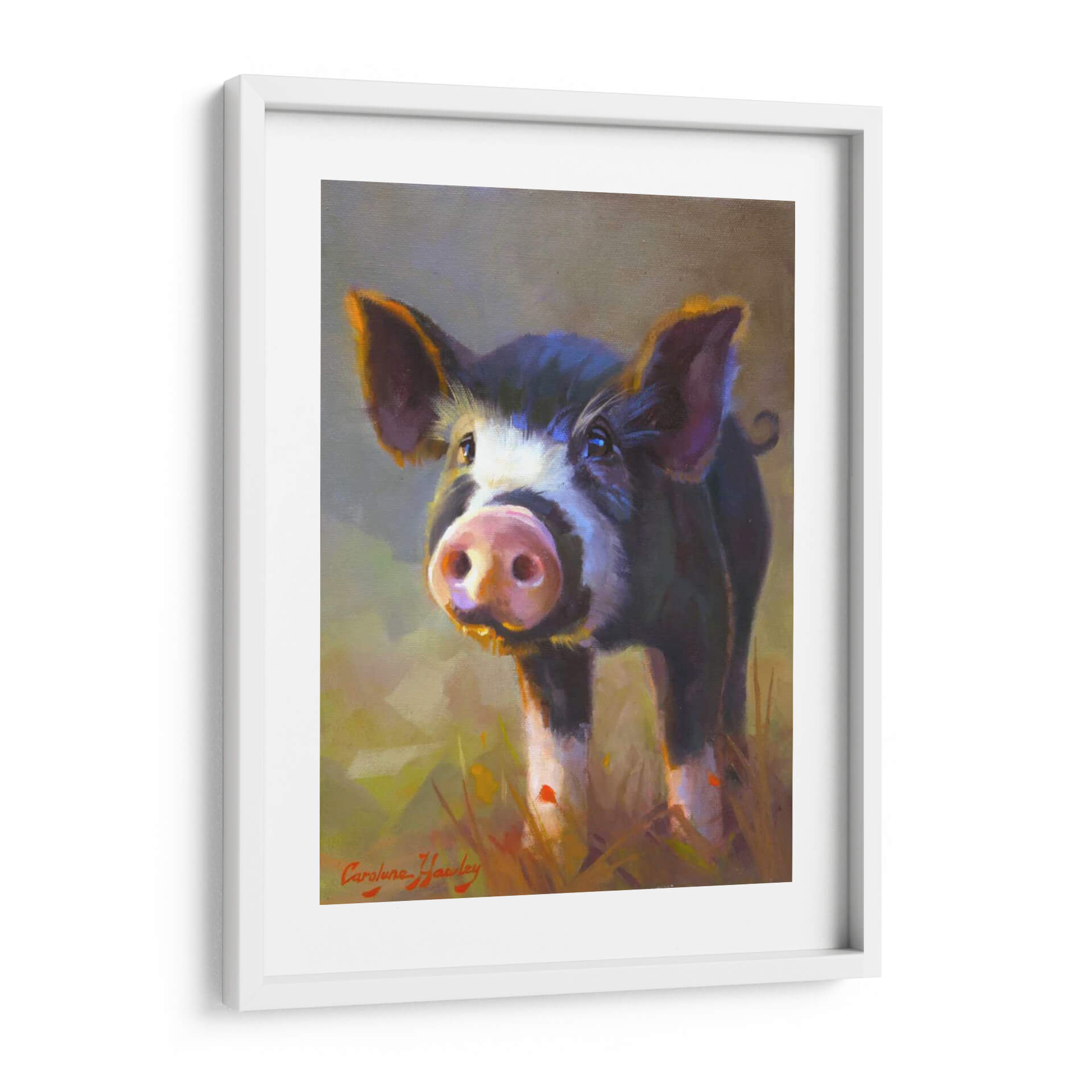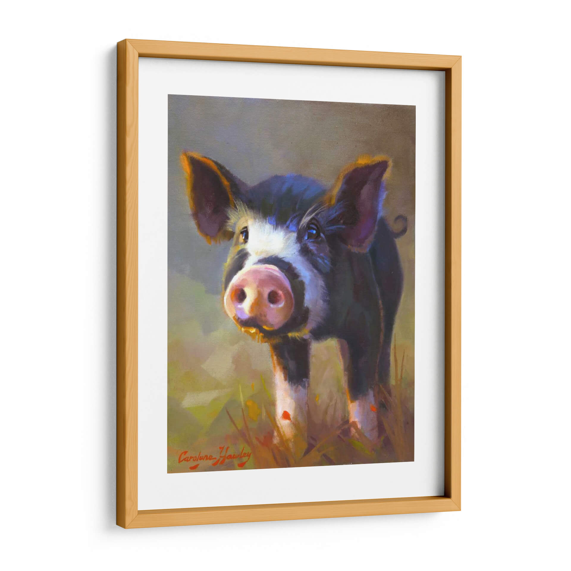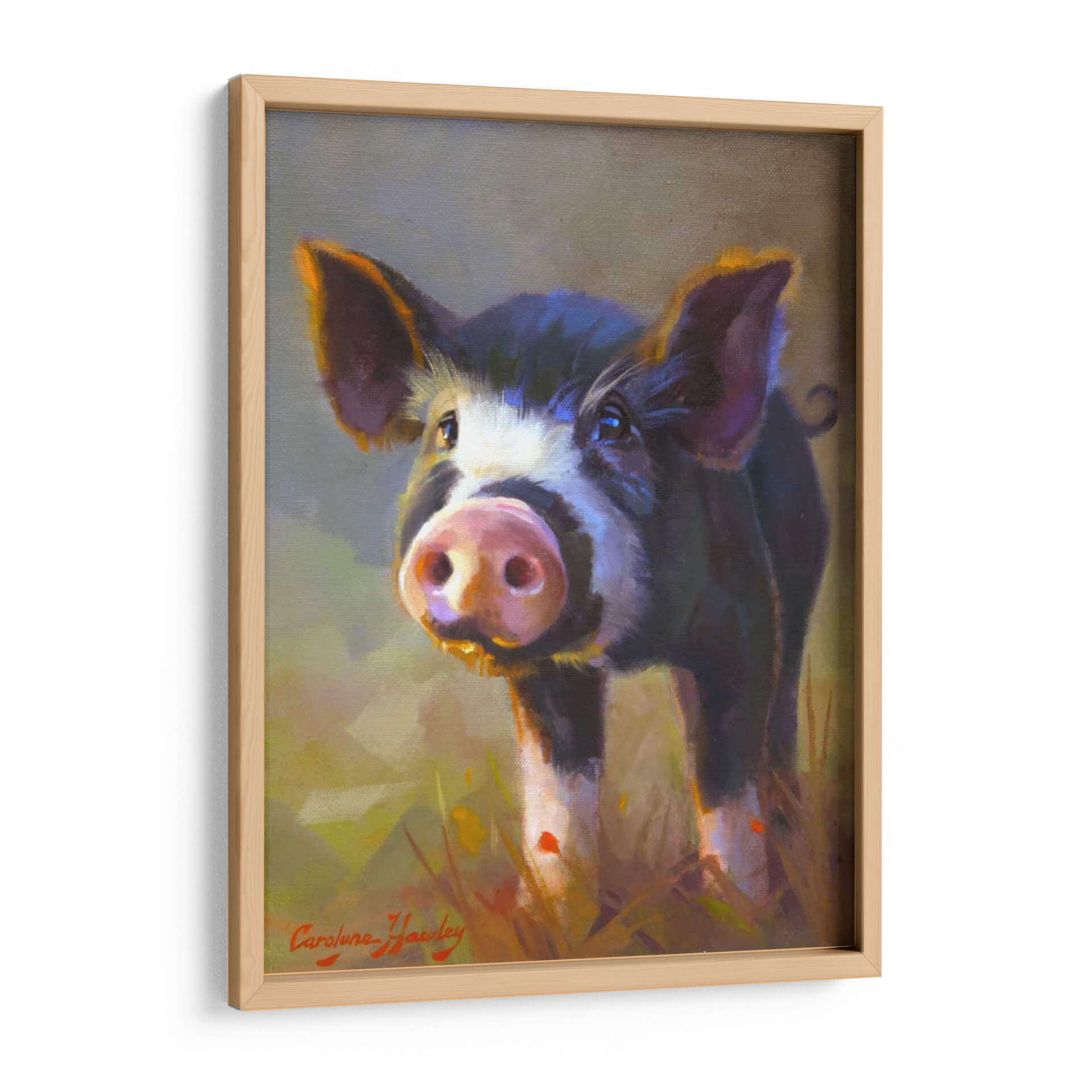 Captura la inocencia y el encanto rústico con este cautivador cuadro decorativo titulado "Jazmín" de Carolyne Hawley. La obra presenta un primer plano de un tierno cerdo, con una mirada curiosa y expresiva que parece interactuar directamente con el espectador. La técnica pictórica, de carácter impresionista y con pinceladas sueltas, aporta una textura vibrante y una sensación de movimiento, especialmente visible en el pelaje del animal y en la hierba que lo rodea. La paleta de colores es rica y cálida, dominada por tonos tierra, ocres y amarillos dorados que evocan la luz natural y un ambiente campestre acogedor. Los toques de color púrpura y azul en las sombras añaden profundidad y sofisticación a la composición. Este cuadro decorativo es perfecto para añadir un toque de personalidad y calidez a cualquier espacio, ya sea una sala de estar, una cocina de estilo rústico o incluso un dormitorio infantil. Su temática animal, tratada con sensibilidad artística, lo convierte en una pieza ideal para amantes de la naturaleza y para aquellos que buscan una decoración mural que transmita alegría y sencillez. Integra elementos de arte figurativo con un enfoque moderno, haciendo de "Jazmín" una adición memorable a tu colección de arte de pared.