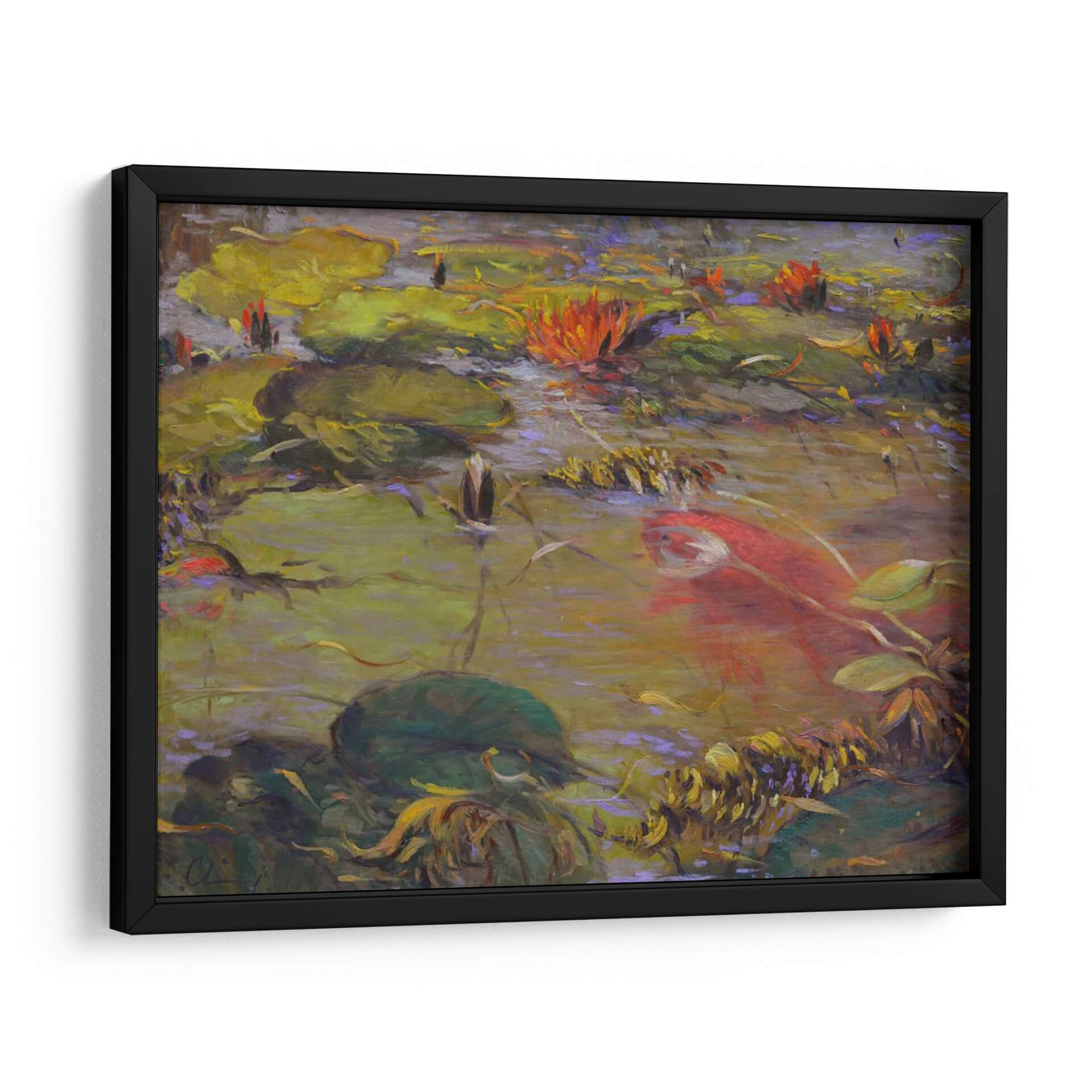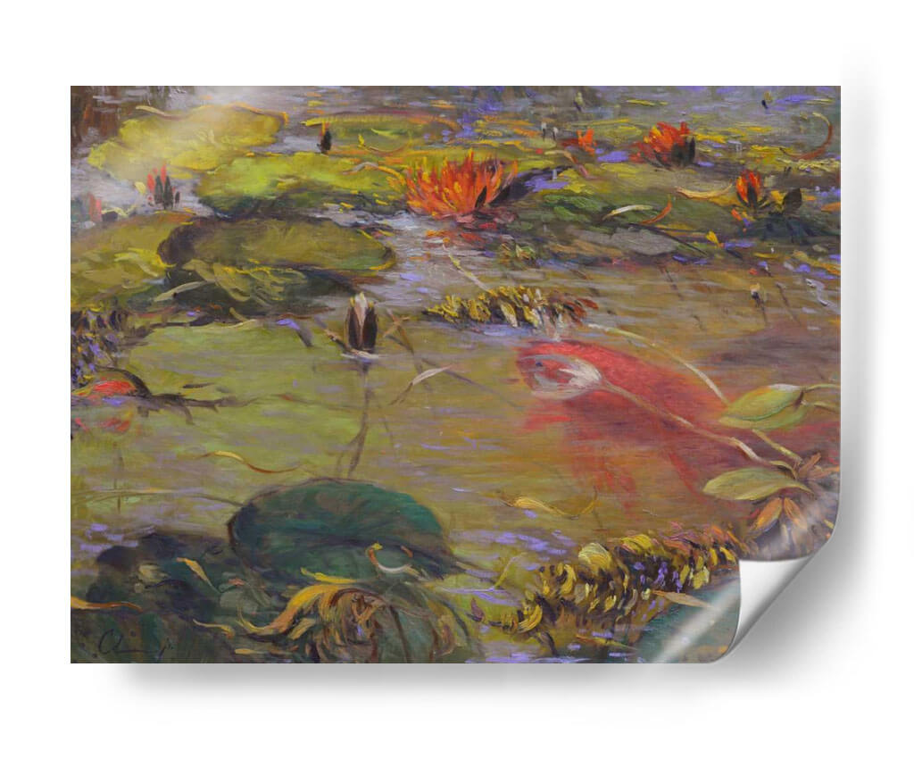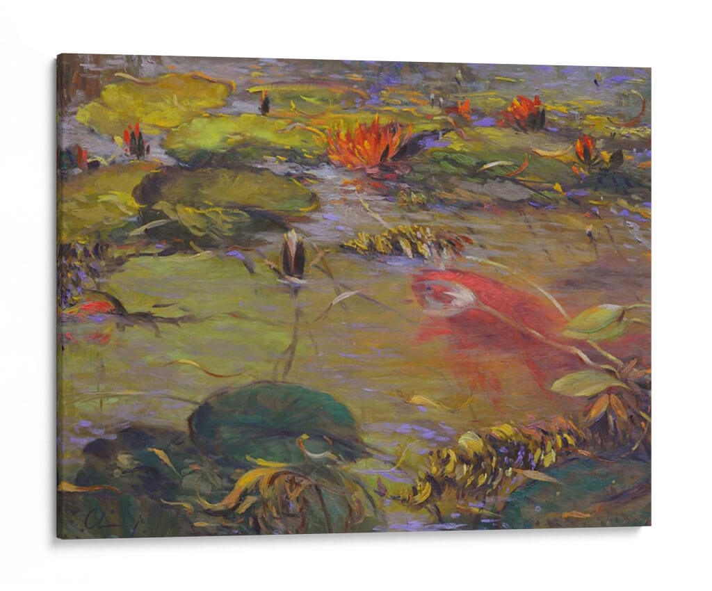 Sumérgete en la serena belleza de 'Koi y Lirios I', una obra maestra del artista Chuck Larivey que captura la esencia de un estanque tranquilo. Esta pieza vibrante te transporta a un mundo de colores exuberantes y formas fluidas, donde los lirios de agua despliegan su encanto y los peces koi se deslizan elegantemente bajo la superficie. La paleta de colores, rica en verdes, amarillos dorados, naranjas intensos y toques de púrpura, crea una atmósfera de paz y armonía, evocando la tranquilidad de la naturaleza. El estilo pictórico, con pinceladas sueltas y expresivas, aporta una sensación de movimiento y vida a la composición, invitando al espectador a perderse en los detalles y las texturas. Este cuadro decorativo es perfecto para infundir calma y sofisticación en cualquier espacio, ya sea tu sala de estar, dormitorio o estudio. 'Koi y Lirios I' no es solo una obra de arte, es una ventana a un oasis de serenidad, ideal para quienes buscan añadir un toque de elegancia natural y color a su decoración de pared, creando un ambiente de contemplación y bienestar.
