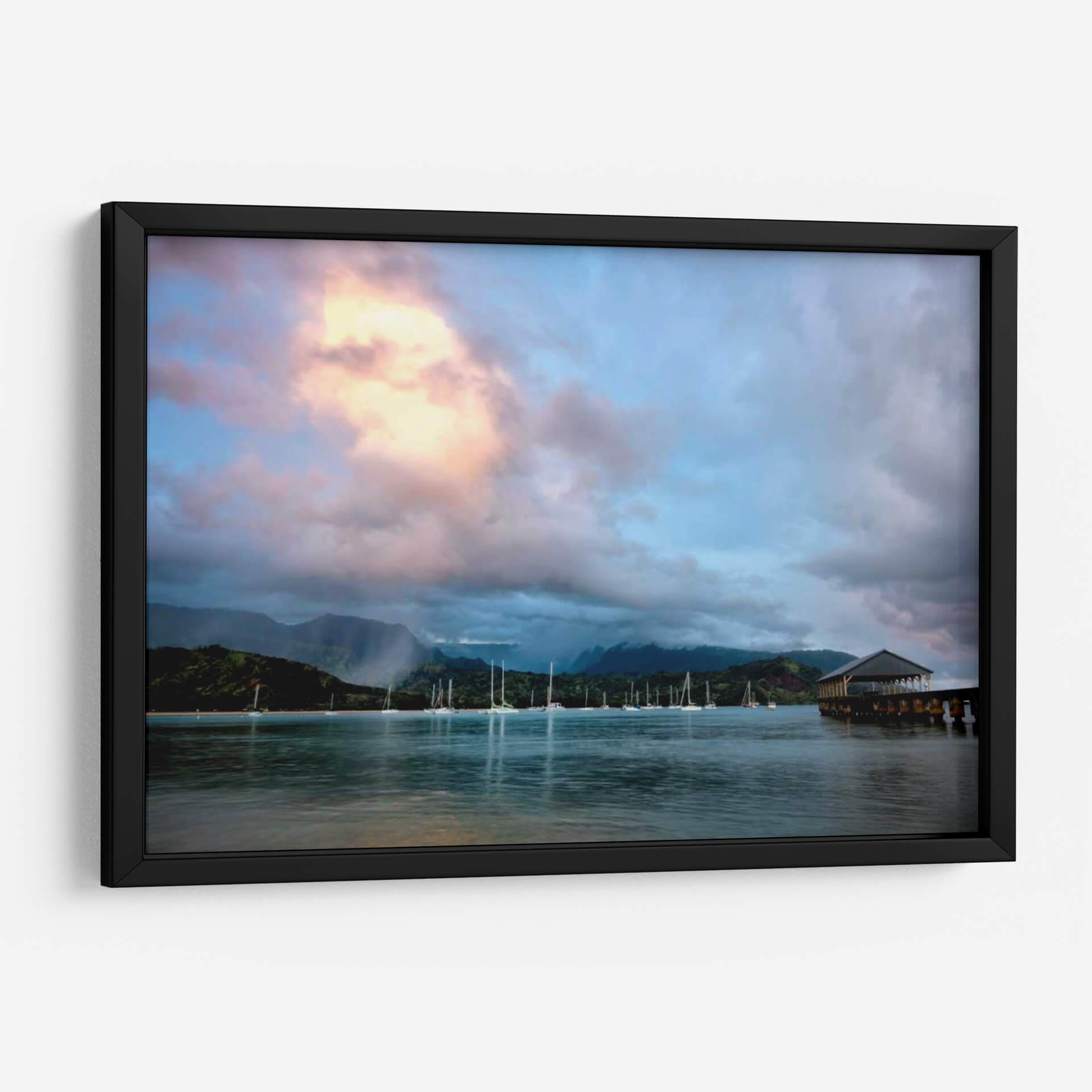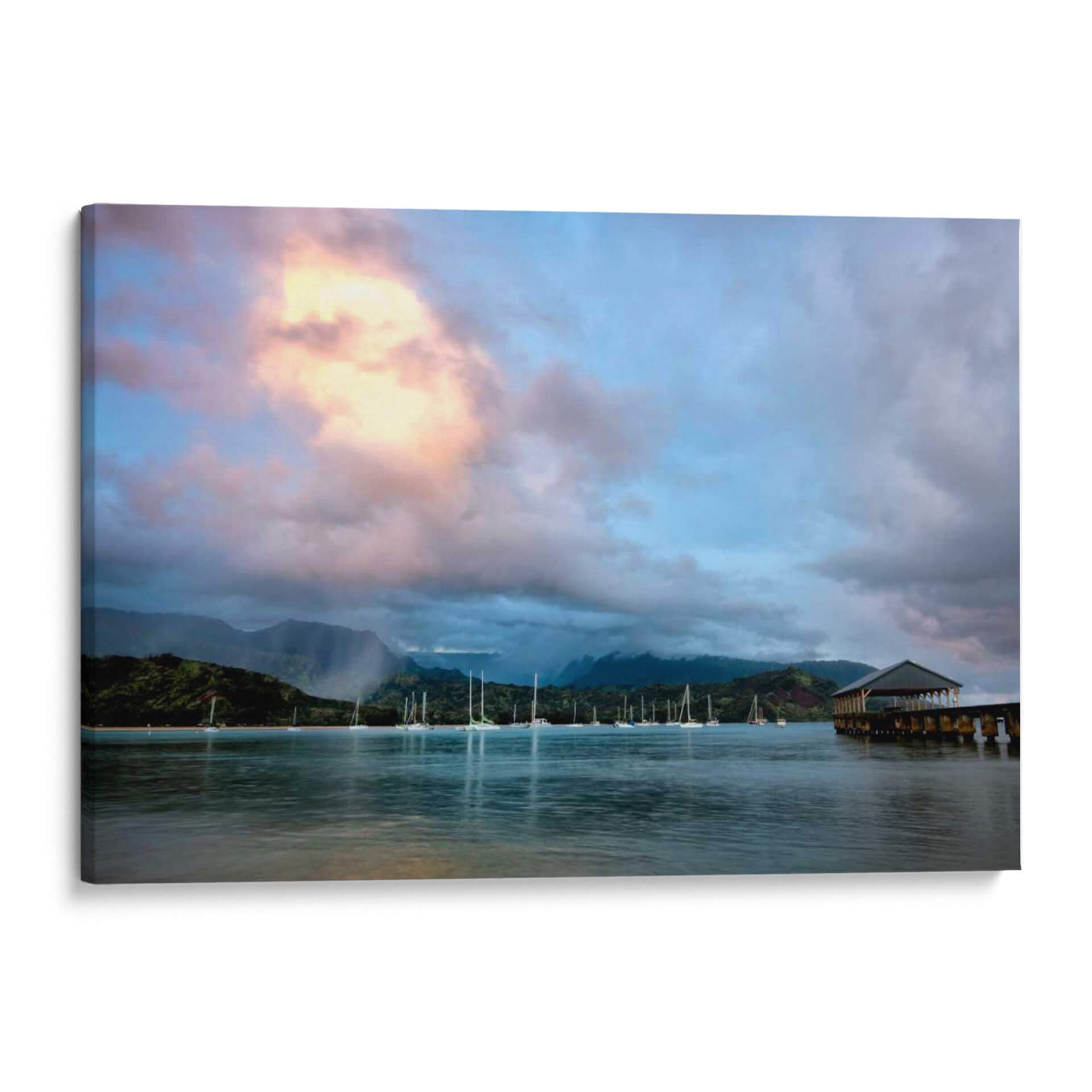 Captura la serenidad y la belleza etérea de "Lluvias en Hanalei", una obra de arte que evoca la atmósfera tranquila de una bahía serena al amanecer o atardecer. Este cuadro decorativo presenta un paisaje costero bañado por una luz suave y melancólica, donde un cielo dramático con nubes rosadas y azules se refleja en aguas tranquilas. Múltiples veleros anclados en la bahía añaden un toque de vida y movimiento a la escena, mientras que las montañas exuberantes y cubiertas de vegetación al fondo crean una sensación de profundidad y majestuosidad. La presencia de un muelle rústico con un techo añade un elemento arquitectónico que ancla la composición y ofrece un punto de interés adicional. La paleta de colores, que oscila entre tonos azules profundos, grises tenues, y toques cálidos de rosa y amarillo en las nubes, crea un ambiente de paz y contemplación. Ideal para quienes buscan añadir un toque de calma y elegancia natural a su hogar u oficina, este cuadro es perfecto para salas de estar, dormitorios o cualquier espacio que desee transformar en un refugio de serenidad y belleza paisajística. Su estilo fotorealista captura la esencia de un momento efímero, invitando a la reflexión y al disfrute de la naturaleza.