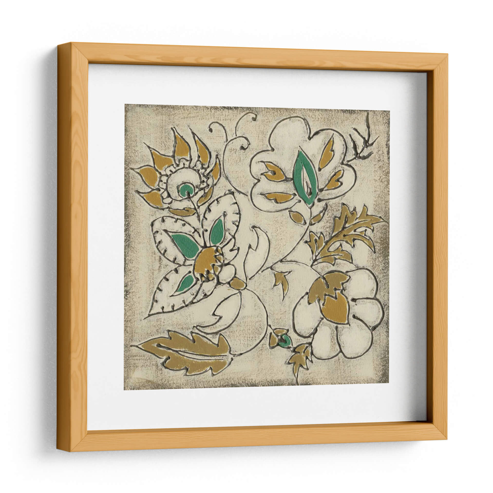 Sumérgete en la delicadeza de "Lovenware Floral Iv", una obra de arte que captura la esencia de la naturaleza con un estilo contemporáneo y refinado. Esta pieza presenta un diseño floral estilizado, donde las formas orgánicas se entrelazan en una composición armoniosa. La paleta de colores, dominada por tonos cálidos y terrosos como el ocre y el beige, se complementa con toques vibrantes de verde esmeralda y blanco cremoso, creando una atmósfera de serenidad y elegancia. Las líneas definidas que enmarcan cada pétalo y hoja aportan un aire moderno y gráfico, a la vez que evocan la textura sutil de un grabado antiguo. "Lovenware Floral Iv" es ideal para añadir un punto de interés visual y una conexión con lo natural a cualquier espacio, desde un salón moderno hasta una oficina que busque un ambiente inspirador y tranquilo. Su diseño versátil permite integrarse con diversas decoraciones, aportando sofisticación y un toque artístico distintivo. Esta obra invita a la contemplación, ofreciendo una ventana a un jardín interior lleno de calma y belleza. Deja que este cuadro decorativo floral transforme tu hogar o lugar de trabajo, creando un ambiente acogedor y lleno de estilo.