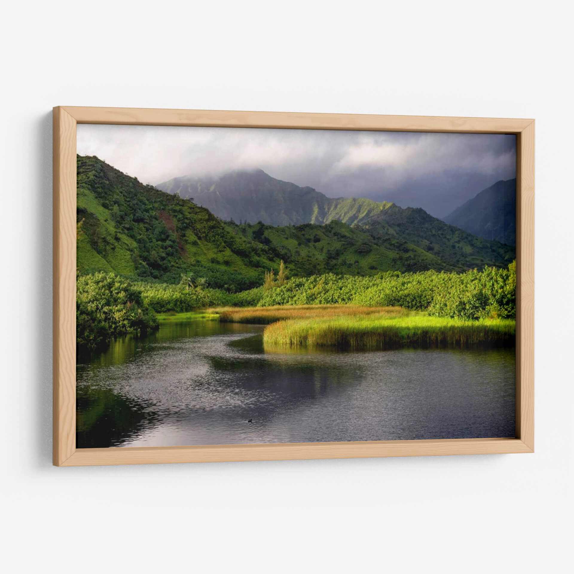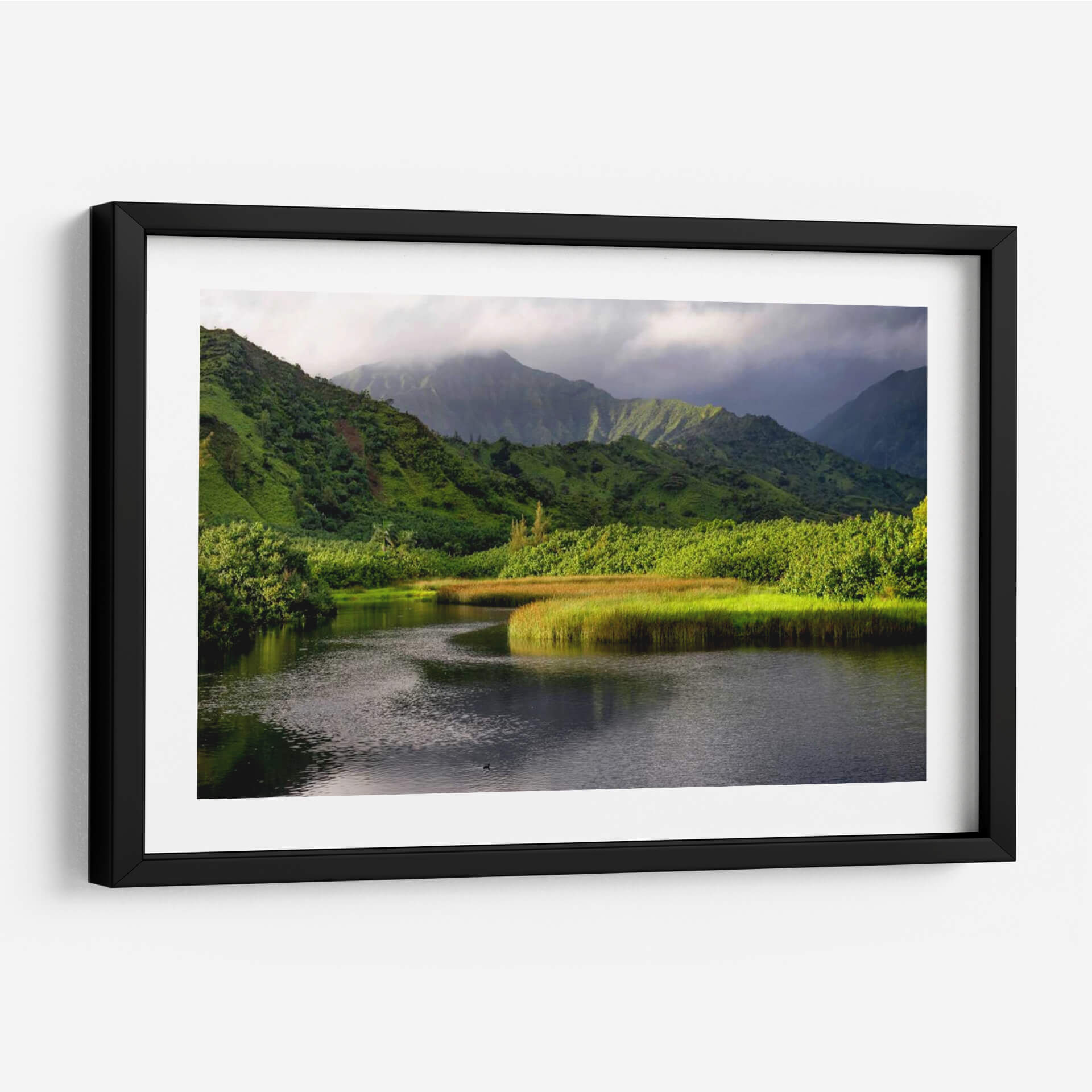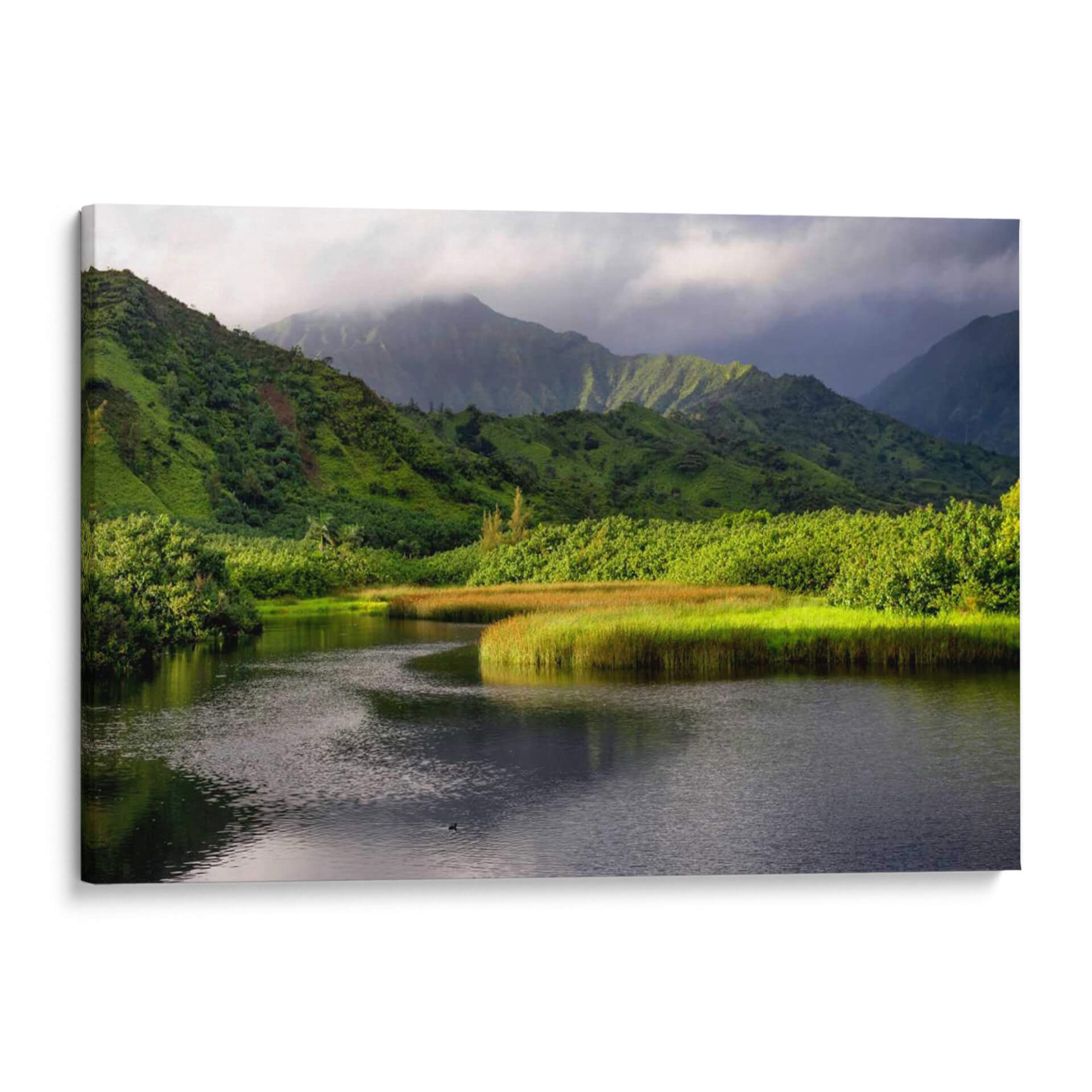Sumérgete en la serenidad del 'Marisma Costero V', una obra de arte que captura la majestuosidad de un paisaje natural enigmático. El artista Danny Head nos transporta a un escenario donde imponentes montañas cubiertas de vegetación exuberante se elevan hacia un cielo plomizo, creando una atmósfera de misterio y calma. Un río serpenteante, cuyas aguas oscuras reflejan el verde intenso de la orilla y el cielo nublado, fluye a través de un lecho de juncos dorados, añadiendo textura y vida a la composición. La paleta de colores, dominada por verdes profundos y tonos tierra, evoca una sensación de conexión con la naturaleza y tranquilidad. Este cuadro decorativo es ideal para aquellos que buscan infundir paz y sofisticación en sus espacios, ya sea un rincón de lectura en el hogar o una oficina que necesite un toque de serenidad paisajística. Su estilo evocador y composición armónica lo convierten en una pieza central perfecta para salones, dormitorios o estudios que deseen transmitir una sensación de refugio natural y belleza contemplativa.