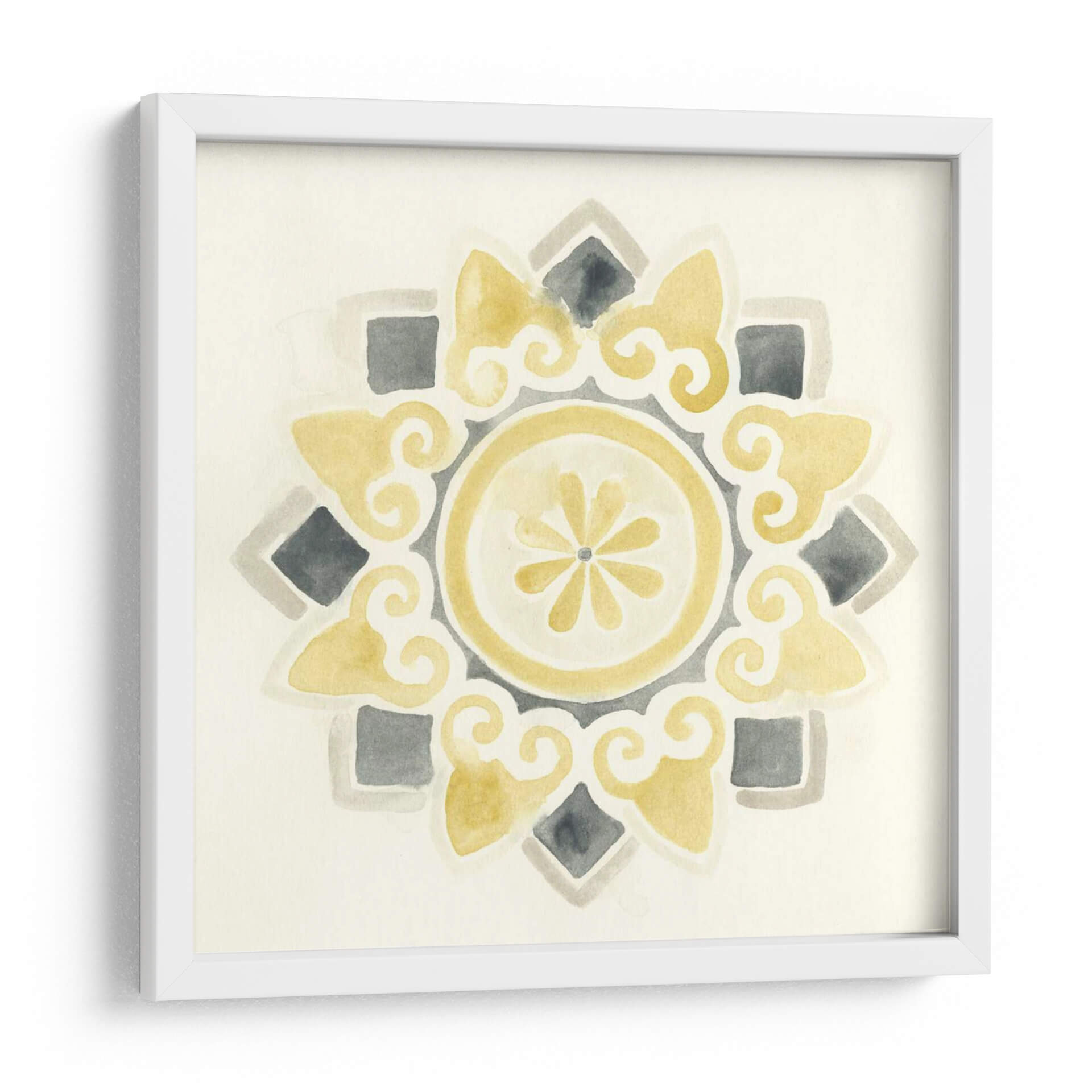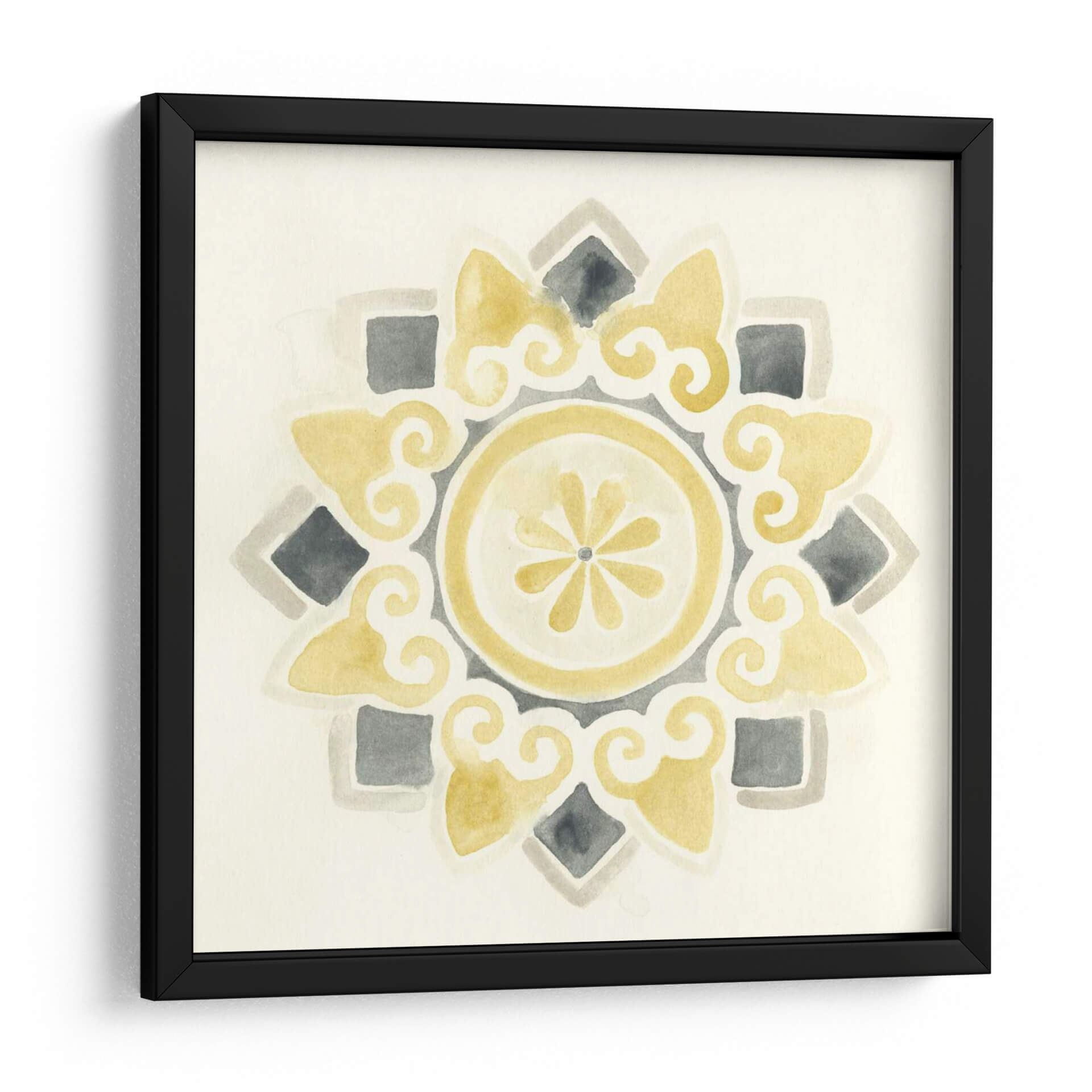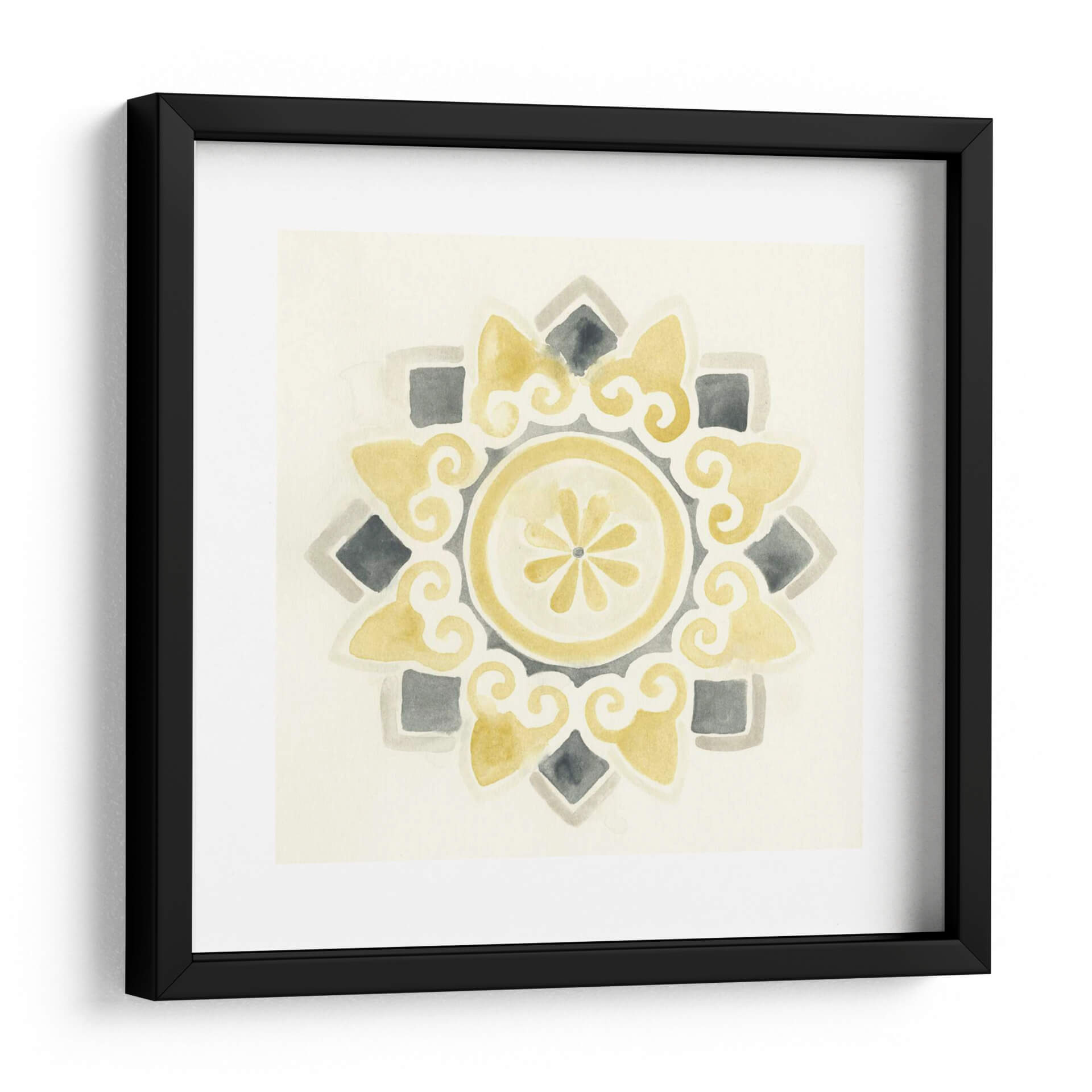 Sumérgete en la serenidad y el estilo contemporáneo con "Medallones Modernos I", una obra de arte digital que evoca la belleza atemporal de los patrones geométricos. Esta pieza, creada por June Erica Vess, presenta una delicada composición en acuarela que combina tonos suaves de amarillo ocre, grises neutros y un fondo marfil cremoso, creando una atmósfera de calma y sofisticación. El diseño central, un medallón intrincado con volutas fluidas y un núcleo floral estilizado, irradia equilibrio y armonía visual. Los elementos cuadrados y los detalles en forma de lágrima se distribuyen simétricamente, invitando a la contemplación y añadiendo un toque de elegancia sutil a cualquier espacio. Ideal para quienes buscan añadir un acento artístico refinado a salones, dormitorios o estudios, este cuadro decorativo transformará tu pared en un punto focal de serenidad moderna. Su paleta de colores versátil permite integrarlo fácilmente en diversas decoraciones, desde las más minimalistas hasta las bohemias chic, aportando una sensación de calidez y diseño cuidado. Descubre cómo "Medallones Modernos I" puede infundir tranquilidad y estilo en tu hogar.