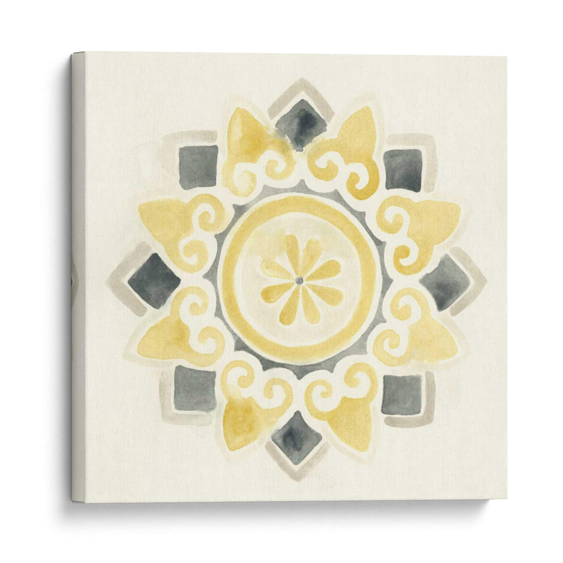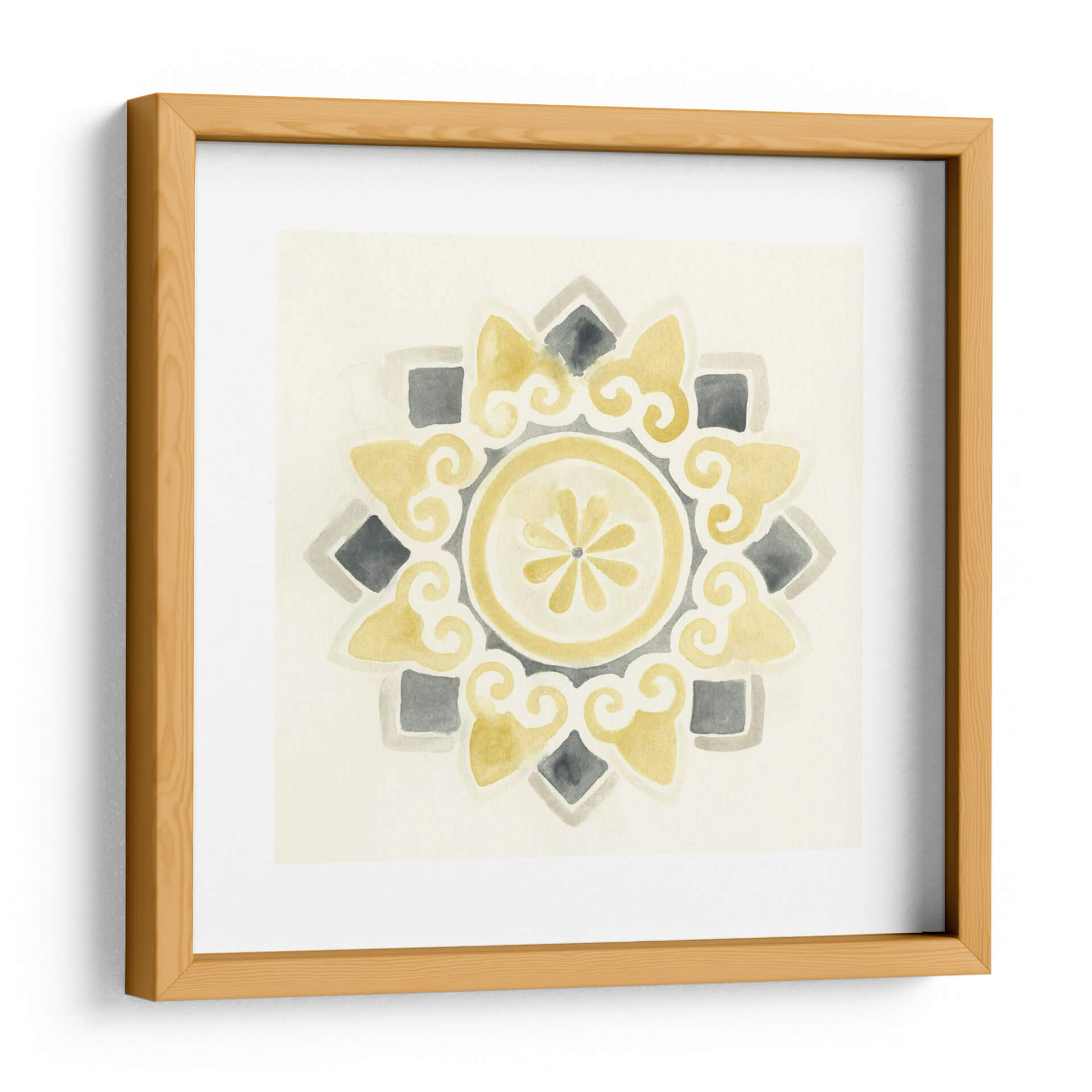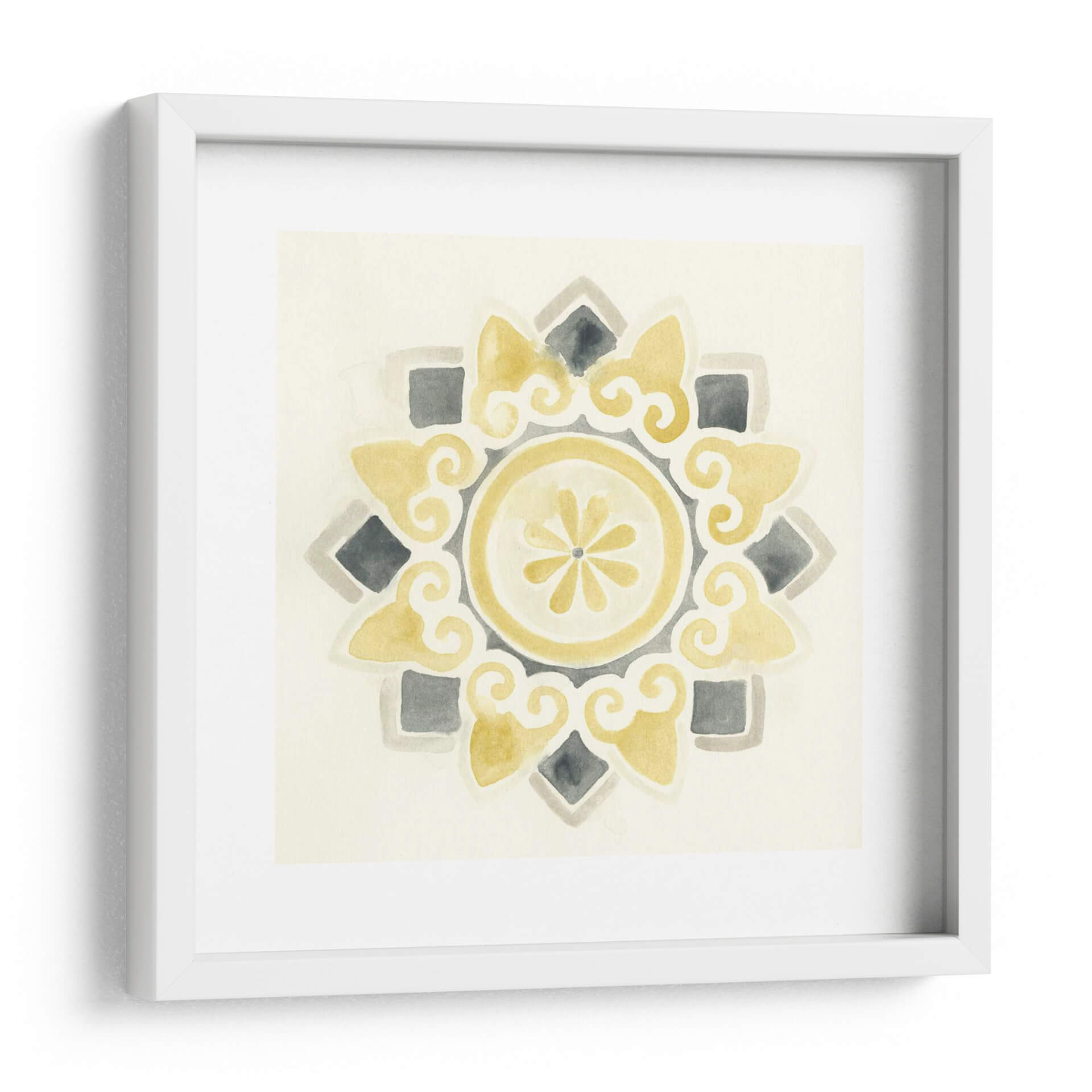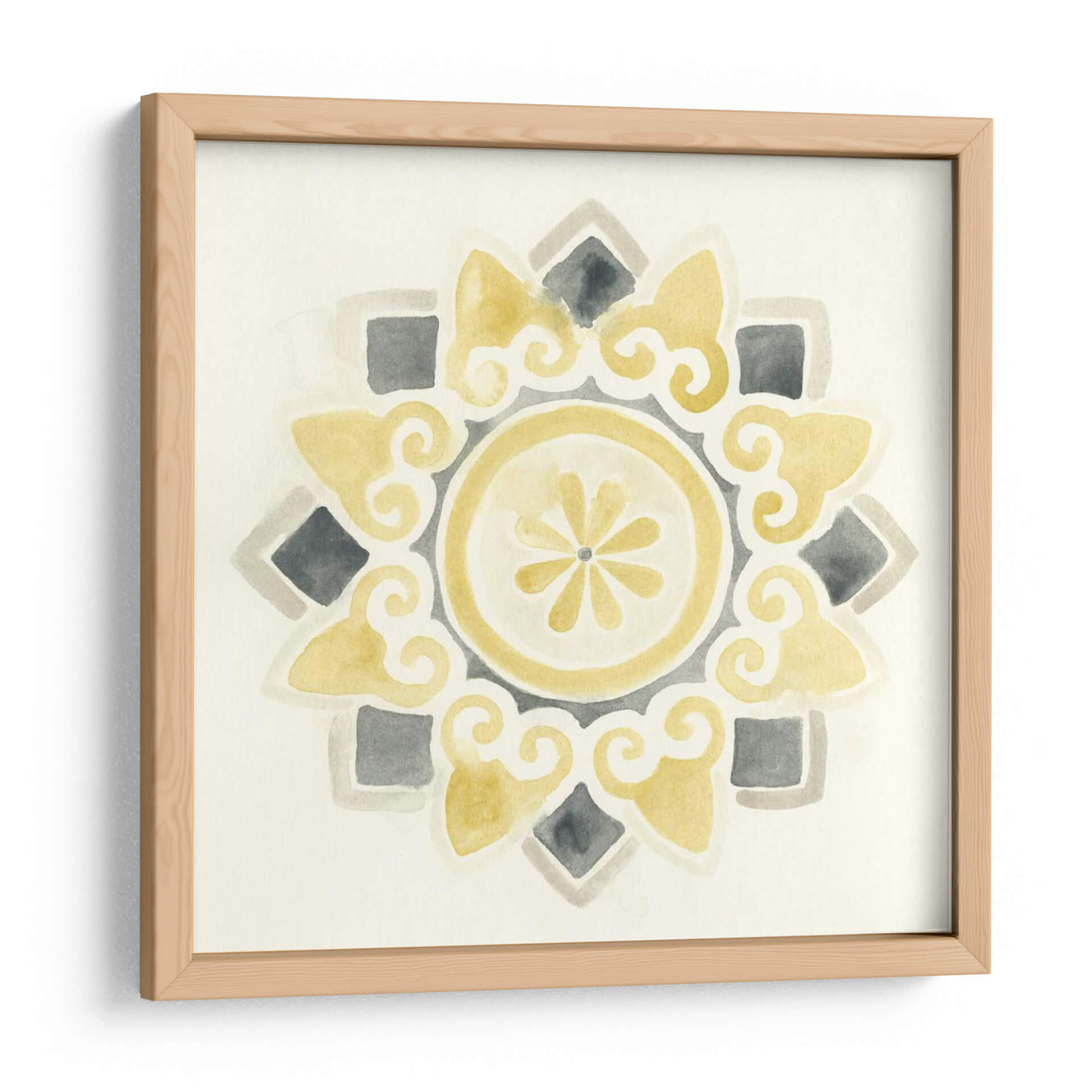 Sumérgete en la serenidad y el estilo contemporáneo con "Medallones Modernos I", una obra de arte digital que evoca la belleza atemporal de los patrones geométricos. Esta pieza, creada por June Erica Vess, presenta una delicada composición en acuarela que combina tonos suaves de amarillo ocre, grises neutros y un fondo marfil cremoso, creando una atmósfera de calma y sofisticación. El diseño central, un medallón intrincado con volutas fluidas y un núcleo floral estilizado, irradia equilibrio y armonía visual. Los elementos cuadrados y los detalles en forma de lágrima se distribuyen simétricamente, invitando a la contemplación y añadiendo un toque de elegancia sutil a cualquier espacio. Ideal para quienes buscan añadir un acento artístico refinado a salones, dormitorios o estudios, este cuadro decorativo transformará tu pared en un punto focal de serenidad moderna. Su paleta de colores versátil permite integrarlo fácilmente en diversas decoraciones, desde las más minimalistas hasta las bohemias chic, aportando una sensación de calidez y diseño cuidado. Descubre cómo "Medallones Modernos I" puede infundir tranquilidad y estilo en tu hogar.