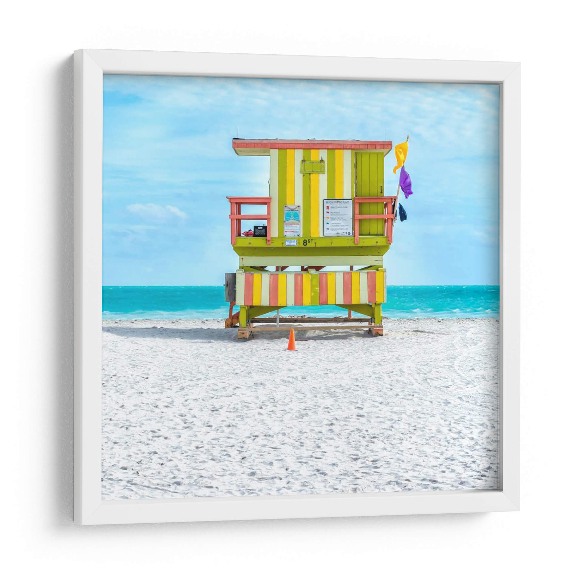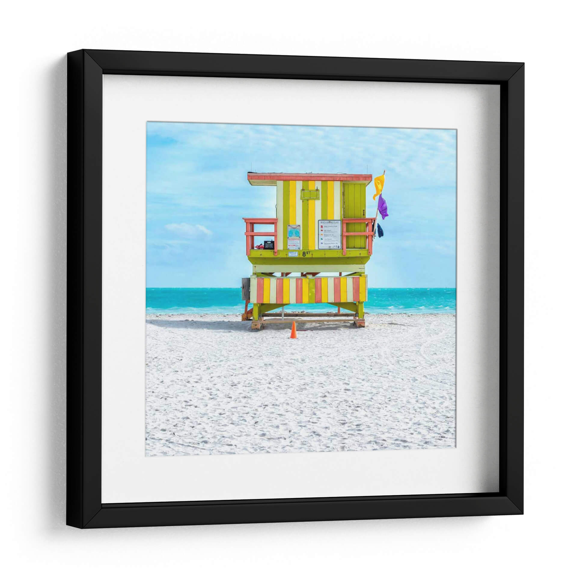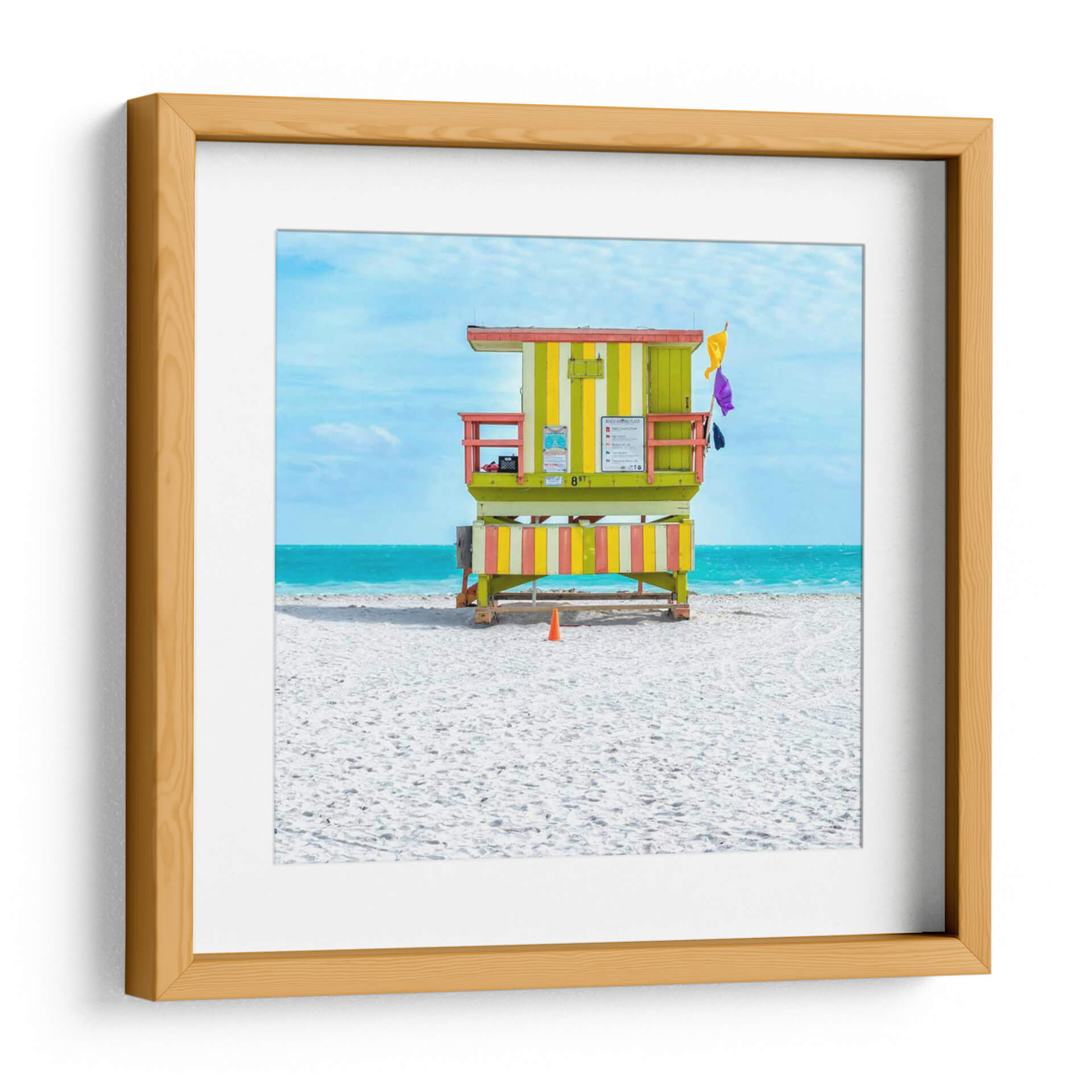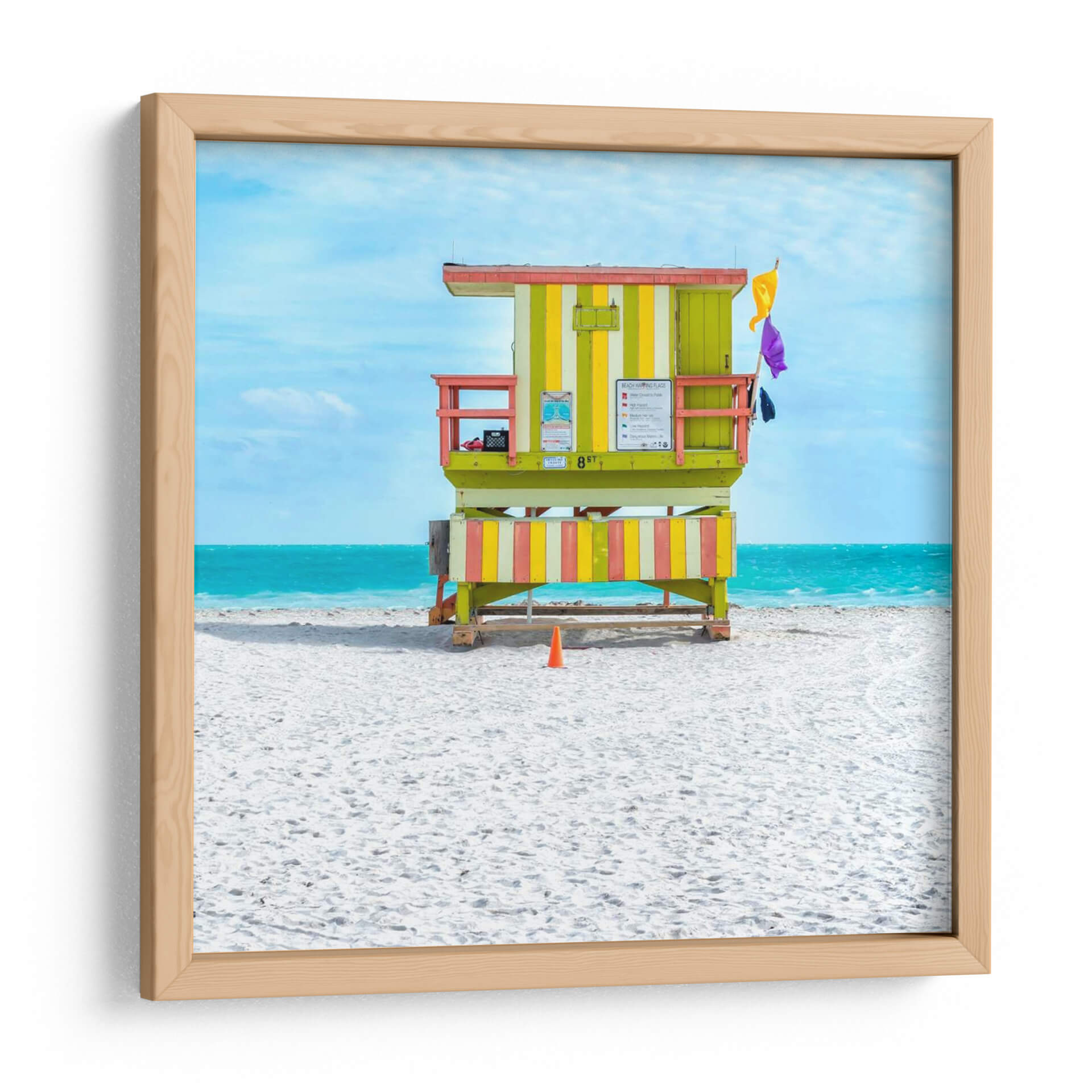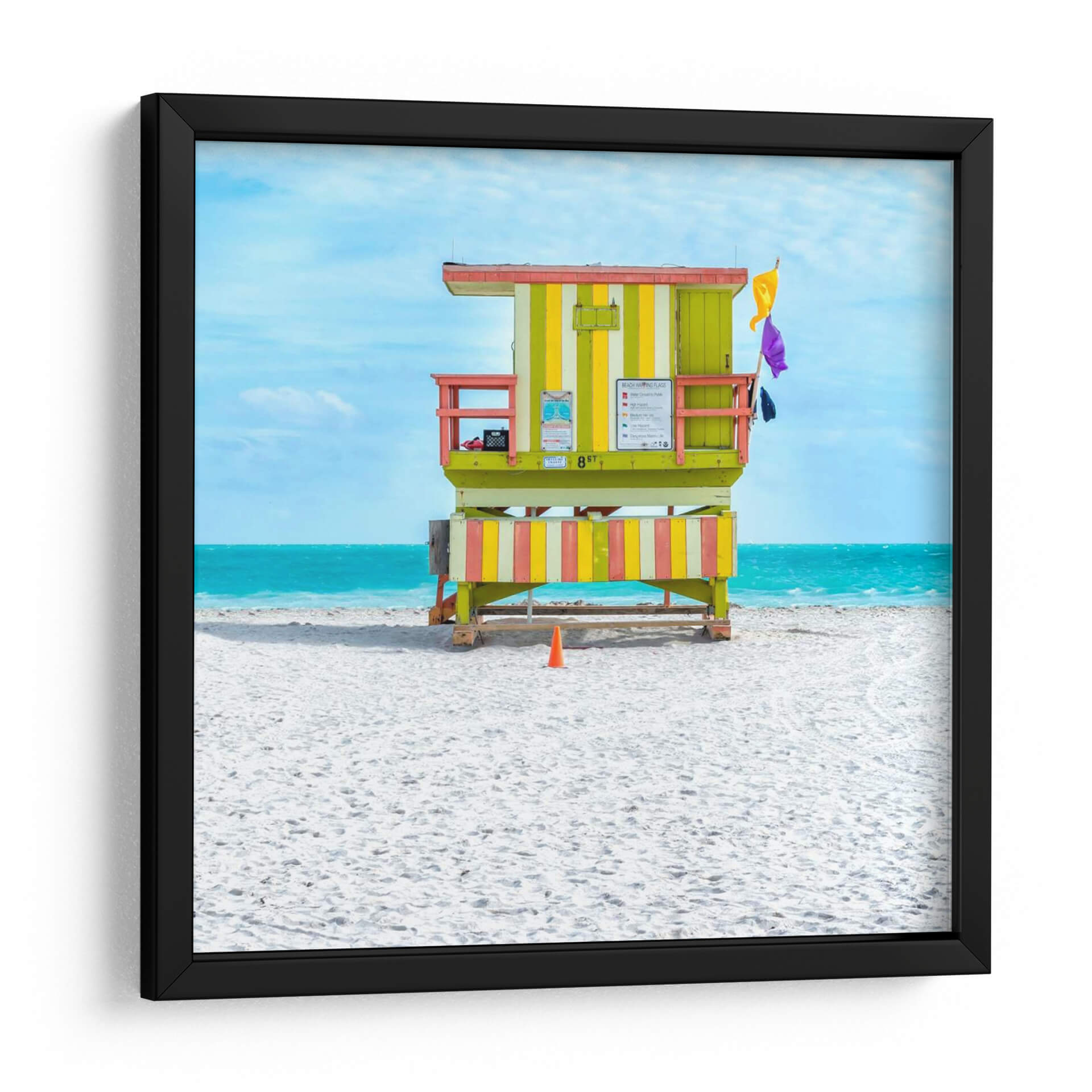 Sumérgete en la vibrante energía de la costa con "Miami Beach Ix", una obra que captura la esencia de un día soleado en uno de los destinos más icónicos del mundo. Este cuadro decorativo presenta una icónica caseta de socorrista, bañada en una explosión de colores primarios y pasteles. Las rayas verticales en tonos verde lima, amarillo y rosa salpican la estructura, creando un patrón visualmente atractivo que evoca la nostalgia y la alegría del verano. El azul turquesa del océano se extiende hasta el horizonte, contrastando maravillosamente con el blanco puro y detallado de la arena, salpicada por una solitaria señal de tráfico naranja que añade un toque de realismo. El cielo despejado, con unas pocas nubes esponjosas, completa la escena, transmitiendo una sensación de amplitud y serenidad. "Miami Beach Ix" es más que una simple imagen; es una invitación a sentir la brisa marina y la calidez del sol. Ideal para añadir un toque de color y vitalidad a cualquier sala de estar, dormitorio o incluso un espacio de oficina, esta pieza es perfecta para quienes buscan capturar la esencia de unas vacaciones o un estilo de vida playero en su decoración.