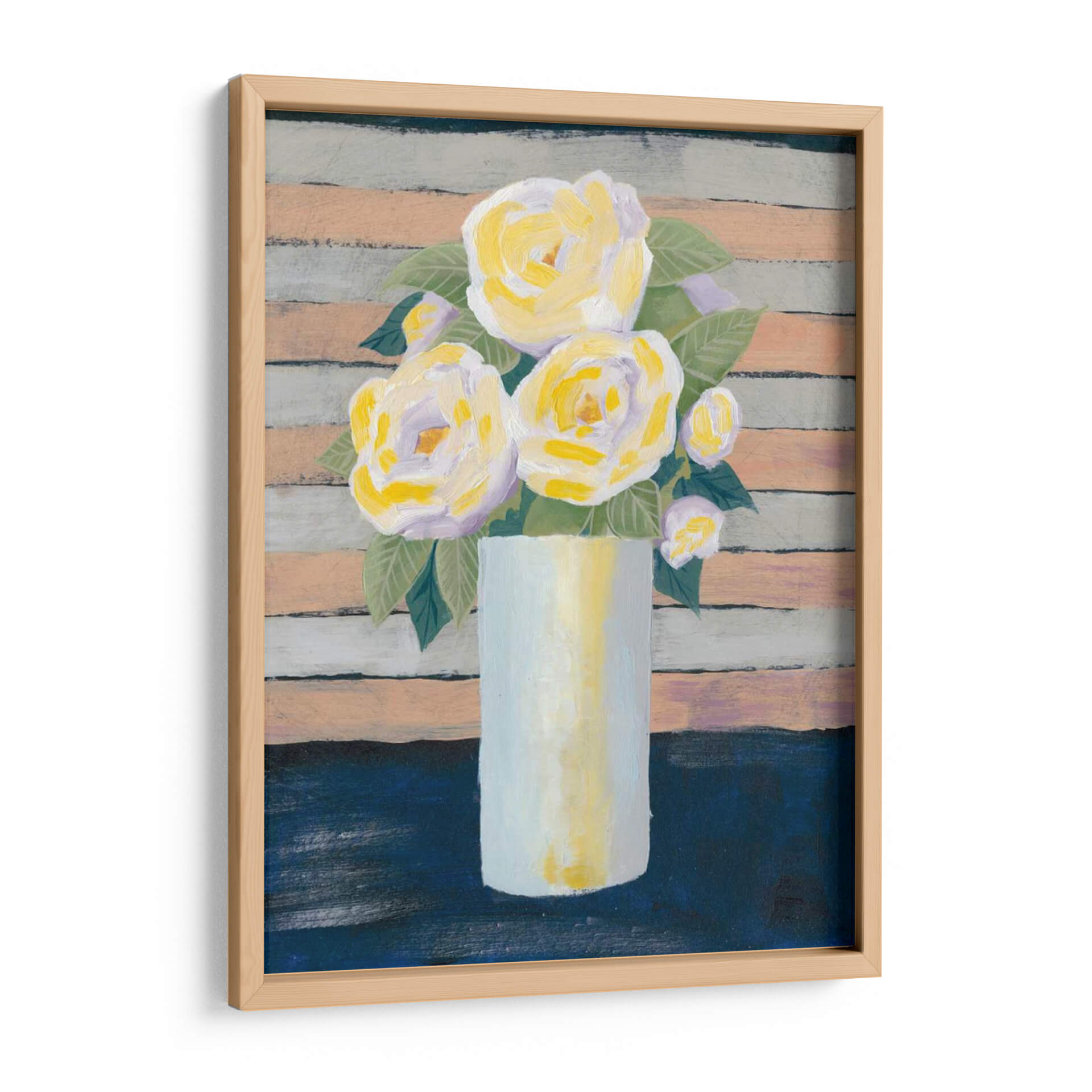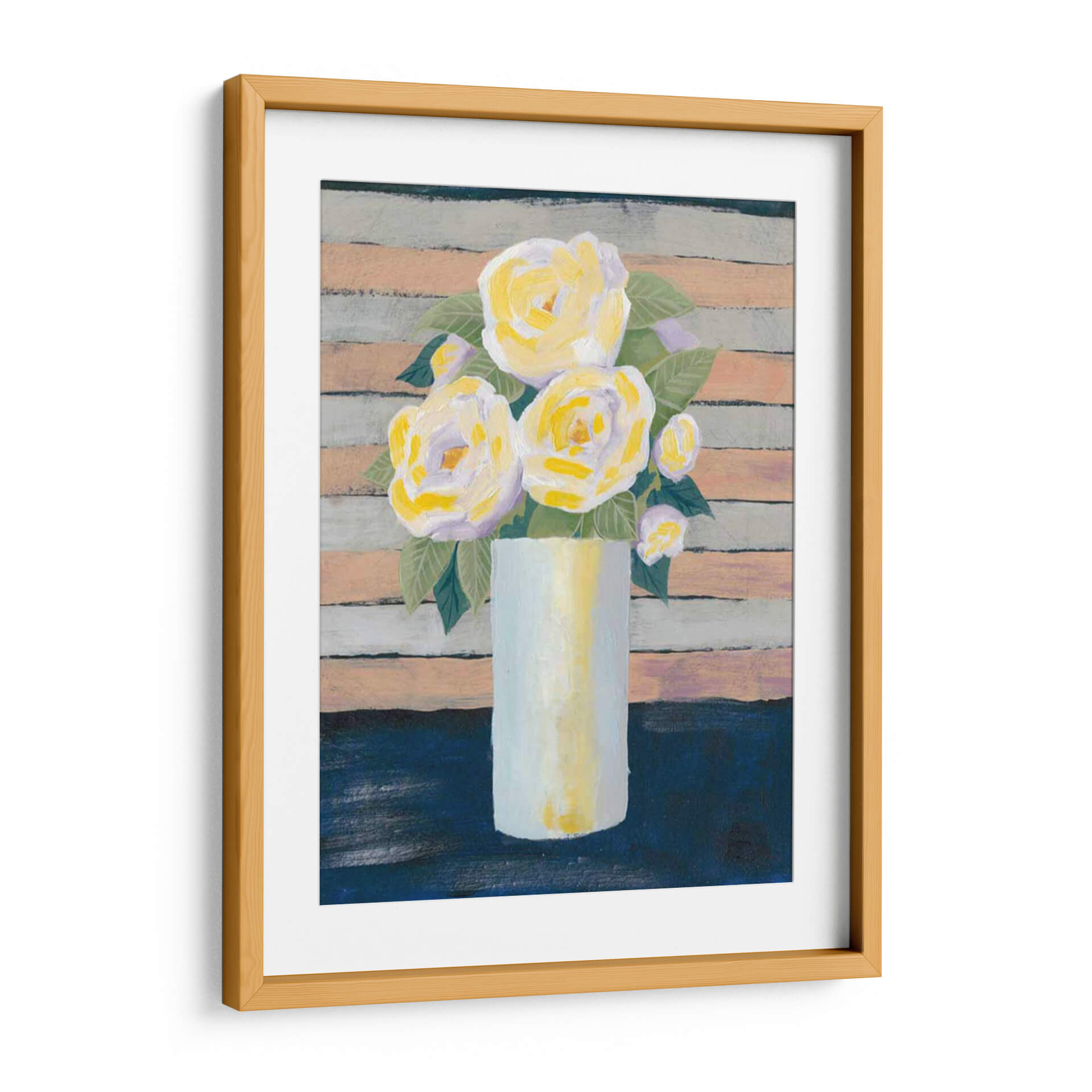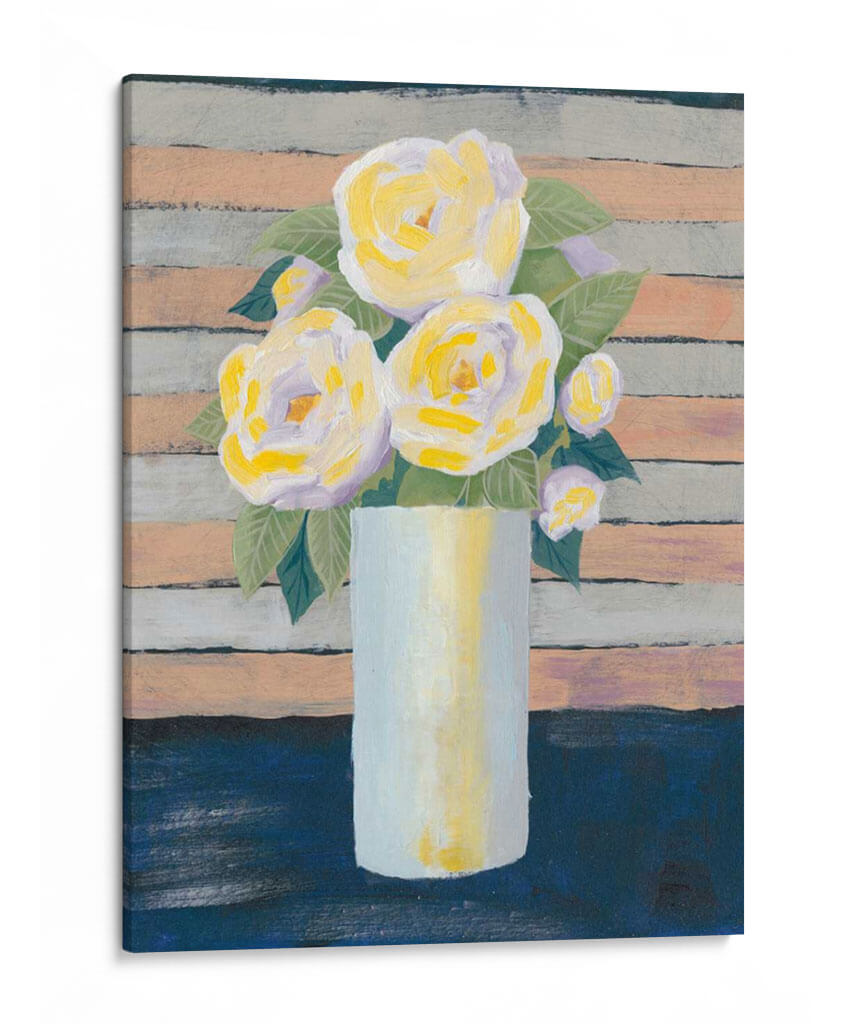 Embárcate en un viaje visual con "Miércoles Blooms I", una cautivadora obra de arte de Grace Popp que captura la esencia vibrante de la naturaleza en plena floración. Este cuadro decorativo presenta un ramo de flores de tonos pastel, predominantemente amarillos y blancos, con sutiles toques de lila, deslumbrantemente presentadas en un jarrón minimalista. El fondo, compuesto por rayas horizontales en tonos suaves de melocotón, gris y verde pálido, crea una atmósfera acogedora y rústica, contrastando elegantemente con la base de color azul oscuro. La técnica de pintura, con pinceladas visibles y texturizadas, aporta una sensación de frescura y espontaneidad, evocando el estilo impresionista moderno. "Miércoles Blooms I" es más que una simple imagen; es una invitación a la serenidad y la belleza, perfecta para añadir un toque de color y vida a cualquier espacio. Ideal para salones modernos, dormitorios acogedores u oficinas que buscan una dosis de optimismo. Esta pieza contemporánea es un recordatorio de la alegría que la naturaleza puede infundir en nuestro día a día, convirtiéndose en un punto focal encantador en tu decoración.