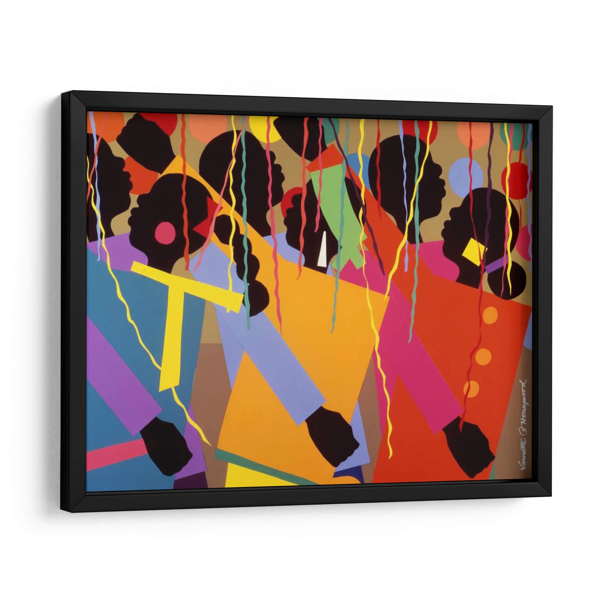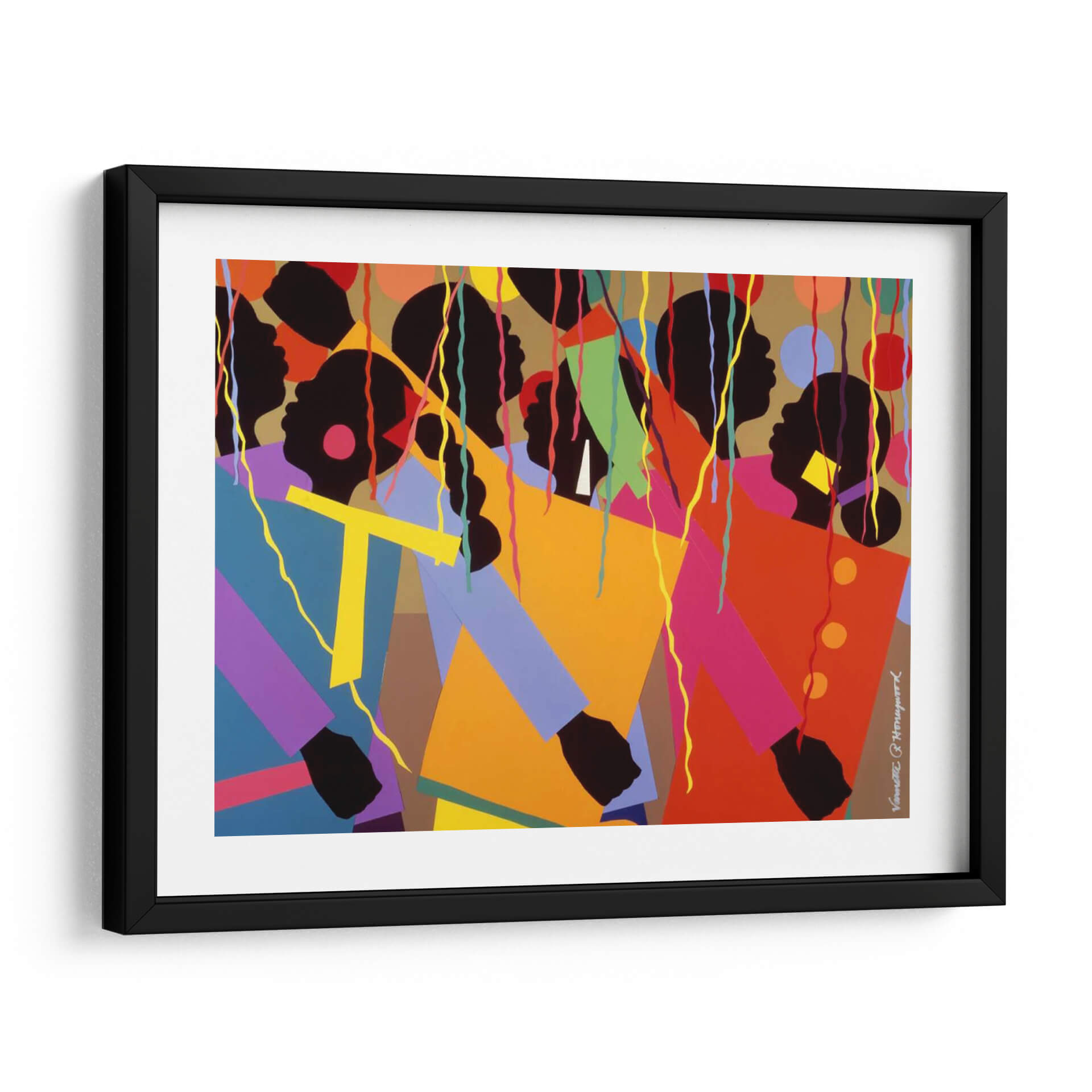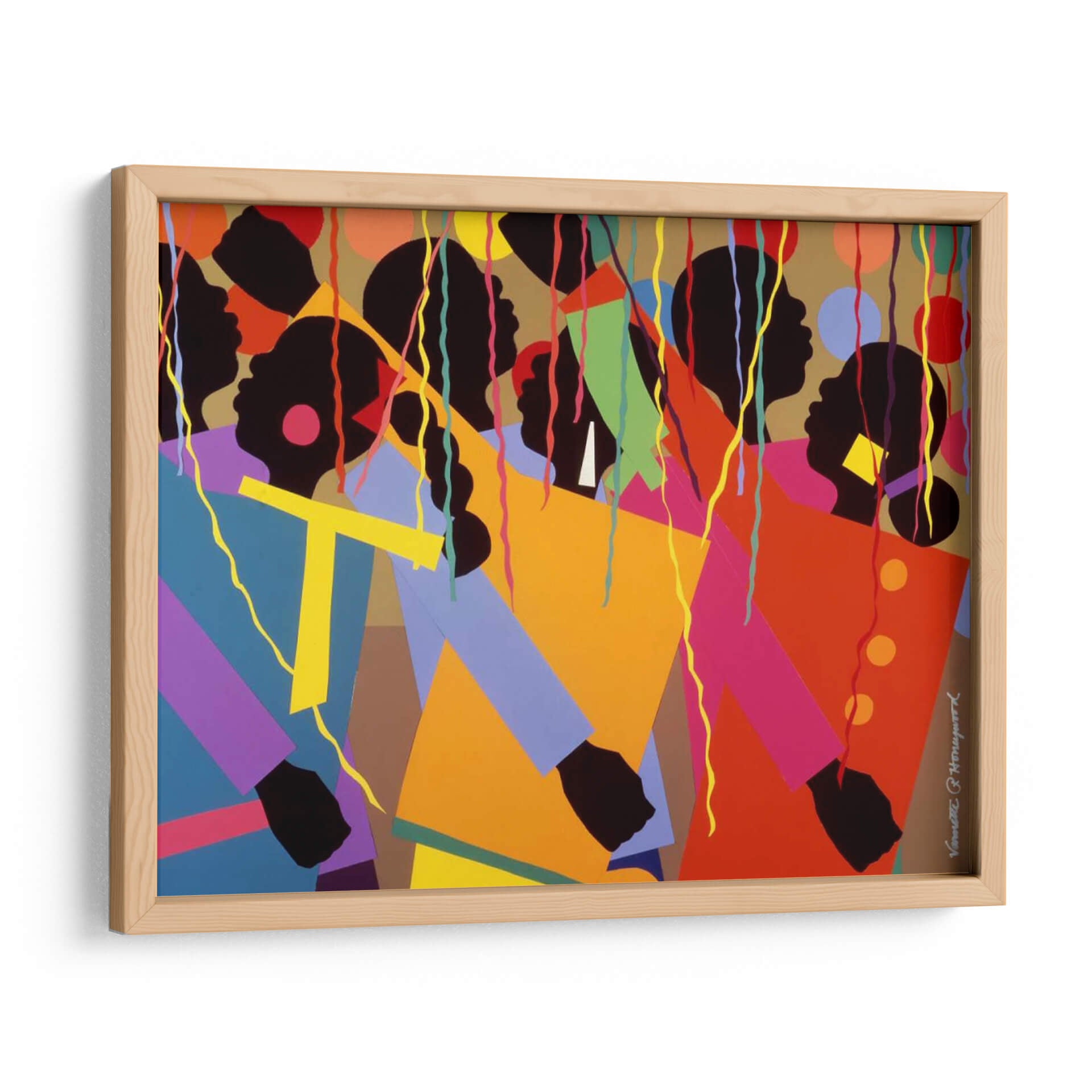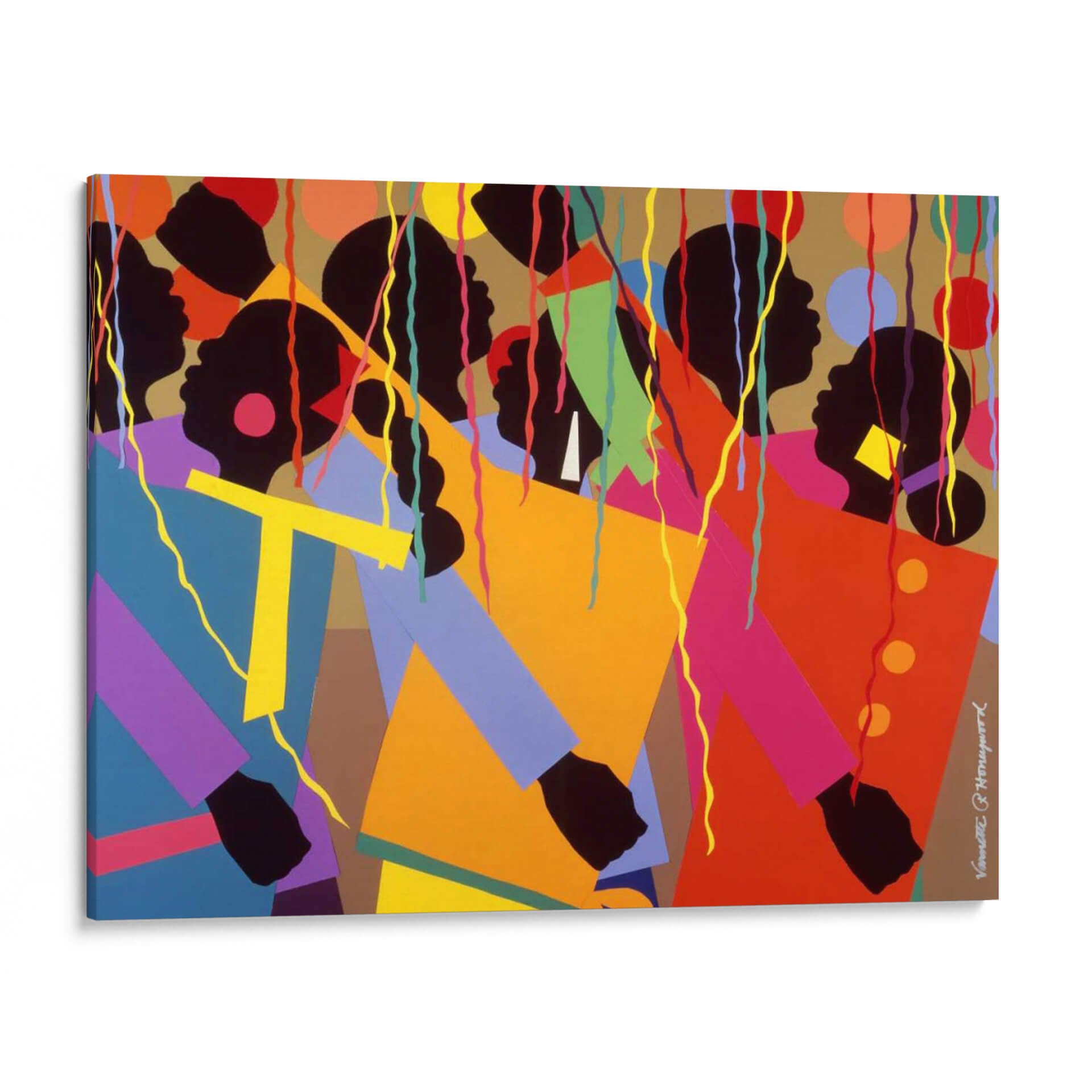 Sumérgete en la vibrante celebración que captura el cuadro decorativo 'Partido' de Varnette Honeywood. Esta obra maestra utiliza siluetas audaces de rostros en perfil, envueltas en un torbellino de colores vivos y serpentinas colgantes, evocando una atmósfera de alegría y conexión social. La paleta de colores, dominada por naranjas cálidos, amarillos intensos, azules eléctricos y toques de rosa y verde, crea un contraste dinámico que atrae la mirada y energiza cualquier espacio. El estilo gráfico y simplificado, con formas geométricas audaces y un uso distintivo del color plano, caracteriza la obra de Honeywood, celebrando la cultura y la comunidad afroamericana con un espíritu festivo. "Partido" es más que una decoración; es una invitación a la celebración, ideal para añadir un toque de optimismo y ritmo a tu sala de estar, comedor o espacio de entretenimiento. Su composición dinámica y su energía palpable la convierten en el punto focal perfecto para conversaciones y momentos memorables. Descubre la expresión artística de Varnette Honeywood y lleva la fiesta a tu hogar.