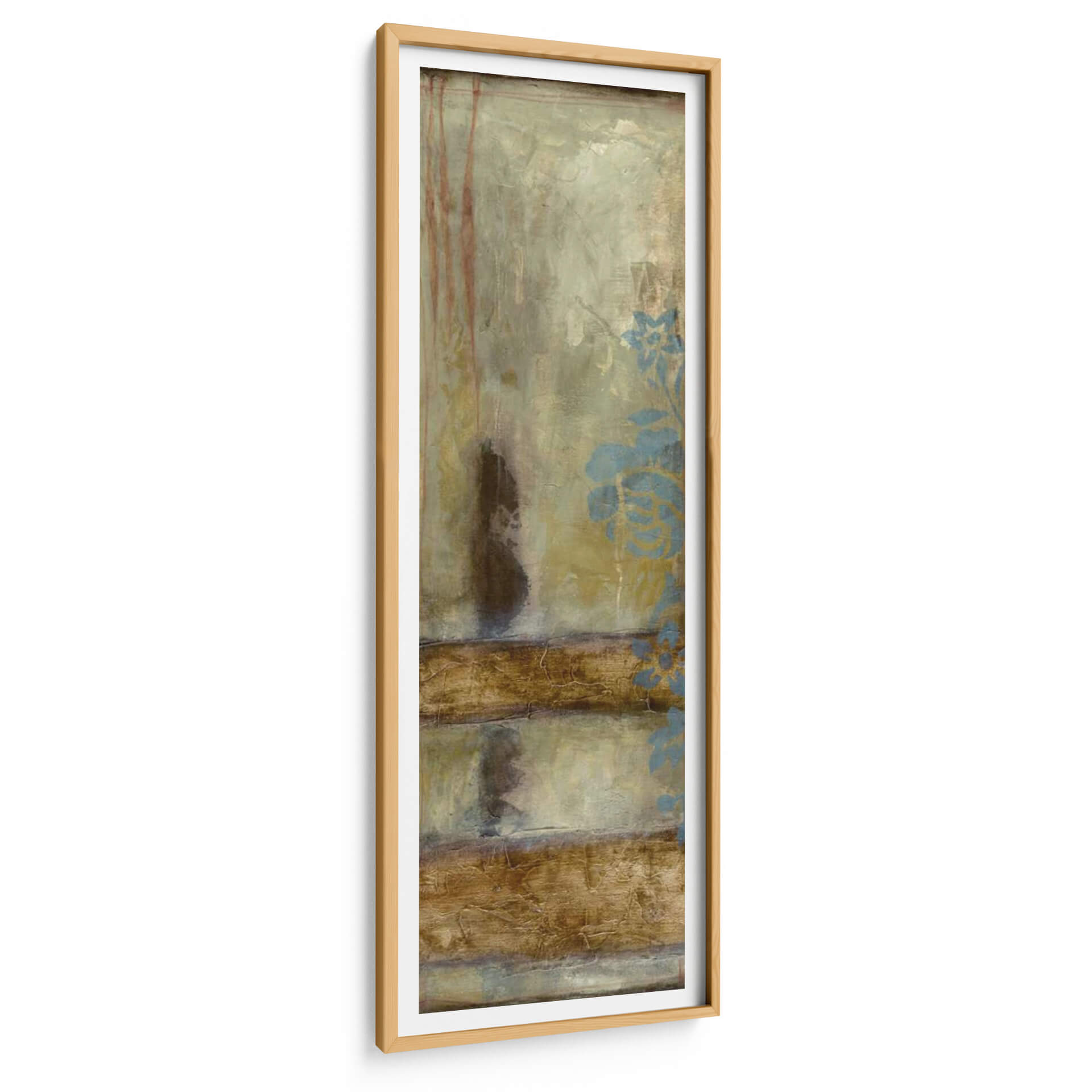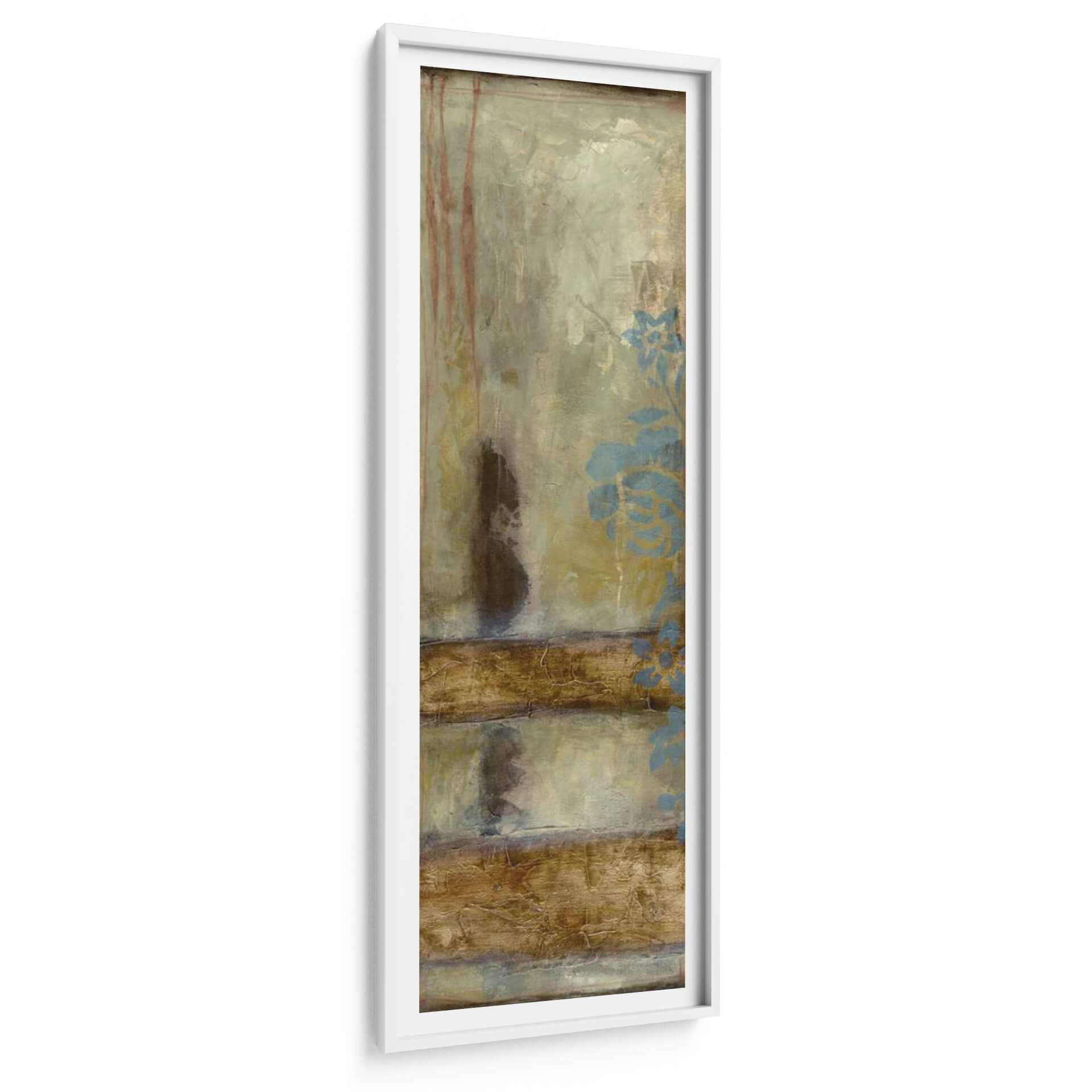 Transforma tu espacio con la cautivadora obra de arte "Patina Ii" de Jennifer Goldberger, una pieza vertical que evoca una sensación de profundidad y textura. Los tonos tierra, dominados por ocres, marrones y toques de verde musgo, se entrelazan con finas líneas rojizas y delicados motivos florales en un sereno azul verdoso. La composición abstracta presenta capas de pintura desgastada y texturas que sugieren un paso del tiempo, creando una atmósfera de misterio y serenidad. Las pinceladas gruesas y la superposición de colores aportan una riqueza visual que invita a la contemplación. "Patina Ii" es ideal para añadir un toque de sofisticación sutil y calma a cualquier rincón de tu hogar u oficina, funcionando como un punto focal elegante en pasillos estrechos, estudios o dormitorios. Este cuadro decorativo contemporáneo es perfecto para quienes buscan arte que combine la belleza natural con una estética moderna y evocadora, aportando calidez y un aire de tranquilidad a la decoración de interiores.