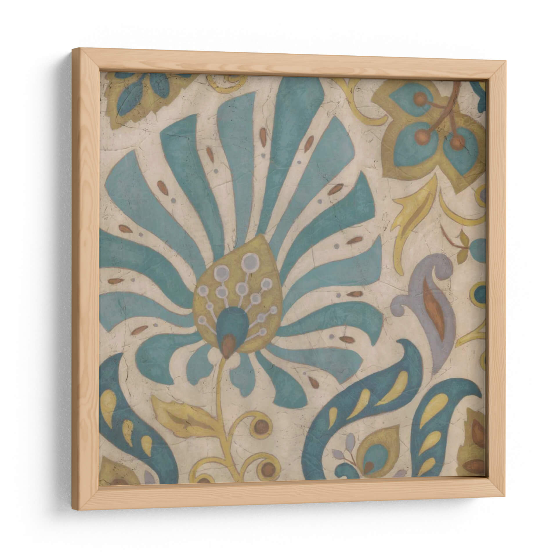 Sumérgete en la belleza atemporal de "Peacock Paisley I", una obra de arte que evoca la rica tradición de los patrones paisley con un toque contemporáneo. Esta pieza presenta un diseño intrincado y simétrico, centrado en una estilizada flor de pavo real rodeada de motivos botánicos fluidos. La paleta de colores, dominada por serenos tonos azul turquesa y vibrantes amarillos dorados sobre un fondo texturizado de color arena, crea una atmósfera de calma y sofisticación. El estilo, que fusiona elementos del arte oriental y un enfoque moderno, lo convierte en un cuadro decorativo versátil. Ideal para añadir un toque de elegancia a tu sala de estar, un punto de interés en tu oficina o una pincelada de color en tu dormitorio. "Peacock Paisley I" es más que una simple decoración de pared; es una invitación a la serenidad y al aprecio por el arte detallado, diseñado para complementar espacios modernos y clásicos por igual, aportando un aire de refinamiento y carácter único a cualquier ambiente. Su composición equilibrada y sus colores armónicos transformarán tu hogar.