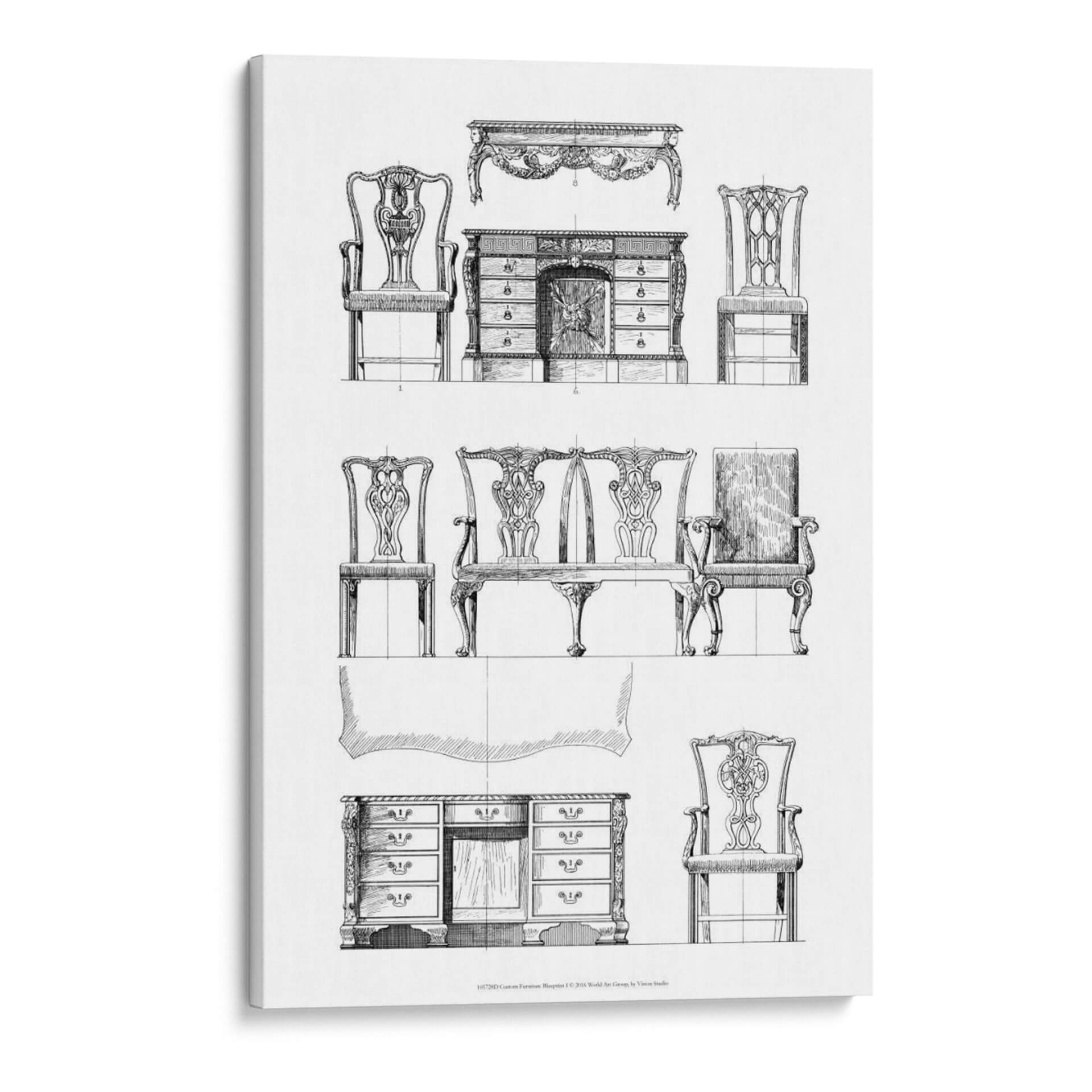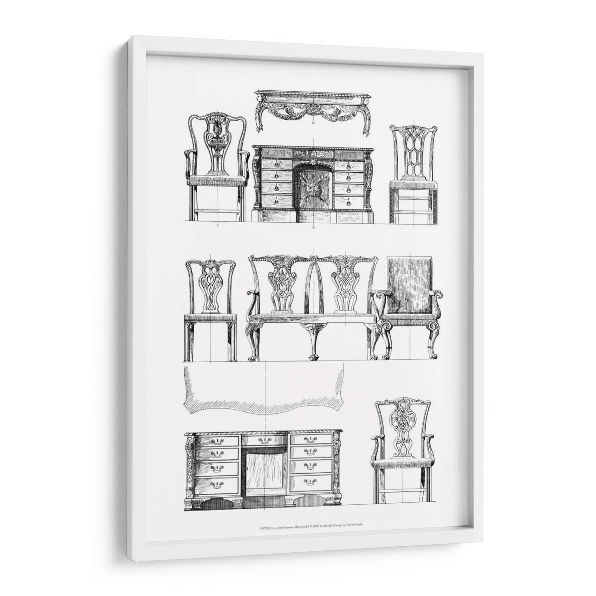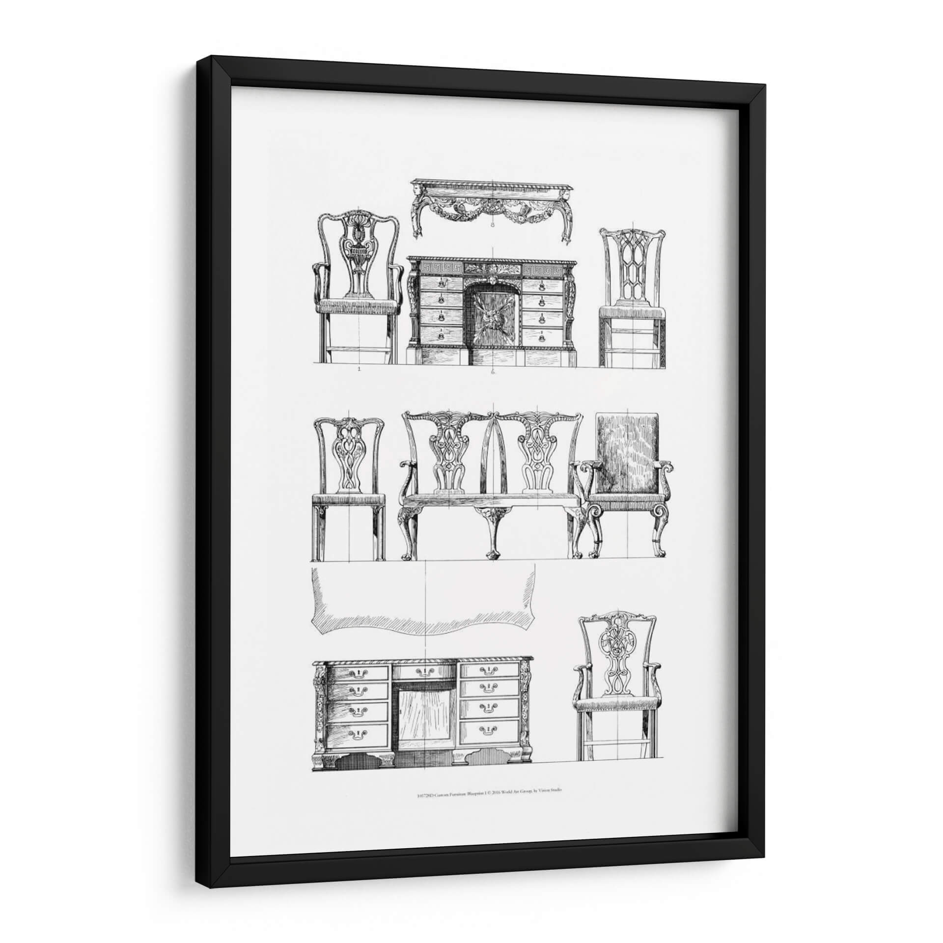 Sumérgete en la elegancia atemporal con "Plan De Muebles Personalizados I", una obra de Vision Studio que captura la esencia del diseño clásico y la artesanía detallada. Este cuadro decorativo presenta un conjunto de mobiliario exquisitamente dibujado, destacando la ornamentación intrincada de sillas de estilo Chippendale y un elegante escritorio o tocador. La paleta de colores monocromática, en tonos de negro y blanco, resalta la precisión de las líneas y la profundidad de cada detalle, creando una atmósfera de sofisticación y orden. Ideal para espacios que buscan un toque de refinamiento histórico o para amantes del diseño de interiores con aprecio por las piezas con carácter y narrativa. La composición organizada, presentando diferentes vistas y elementos de mobiliario, evoca una sensación de estudio y planificación, perfecta para inspirar creatividad en oficinas, despachos o salas de estar con un estilo clásico o ecléctico. Añade una dimensión de arte y diseño a tu hogar con esta pieza única que celebra la belleza de la ebanistería tradicional y las líneas arquitectónicas.