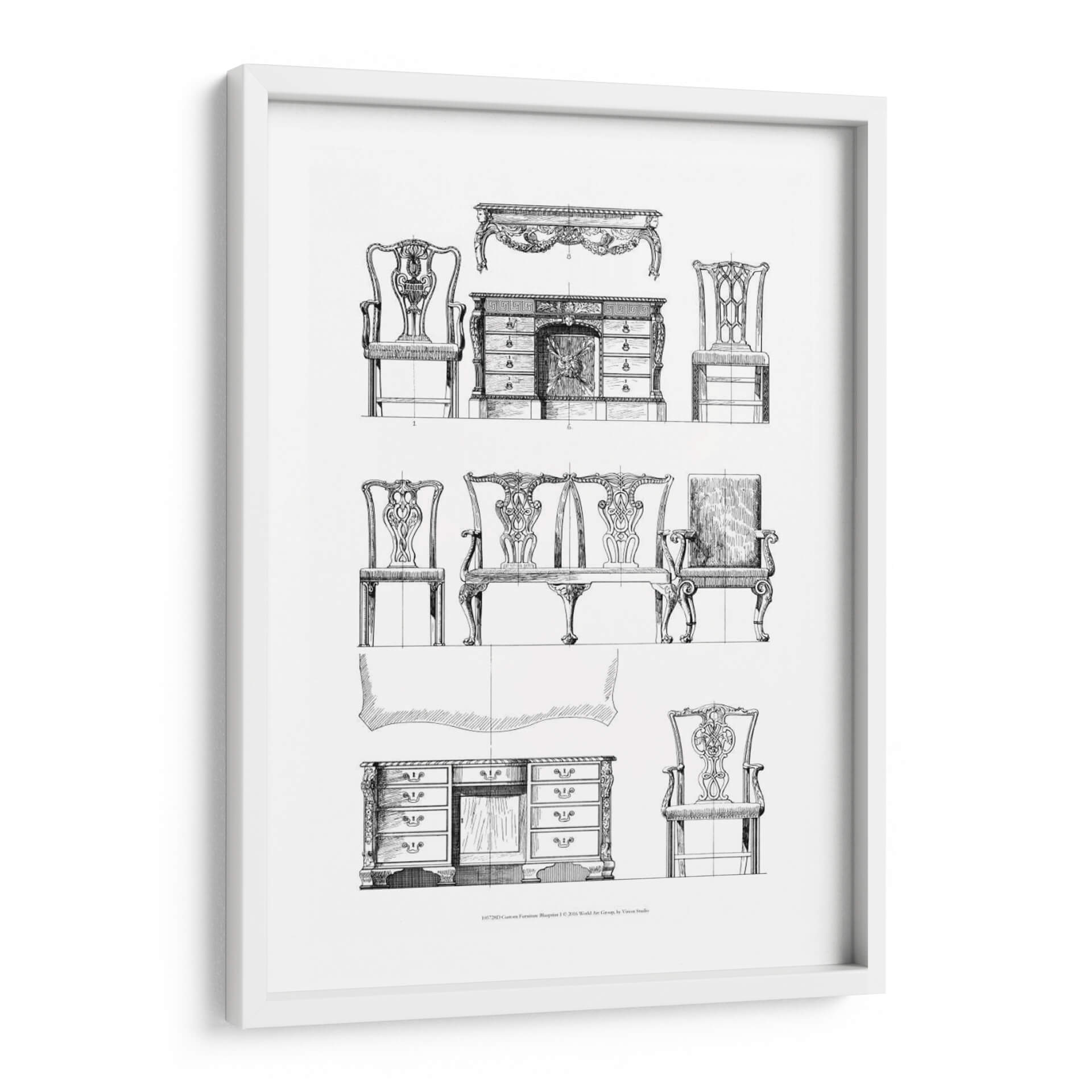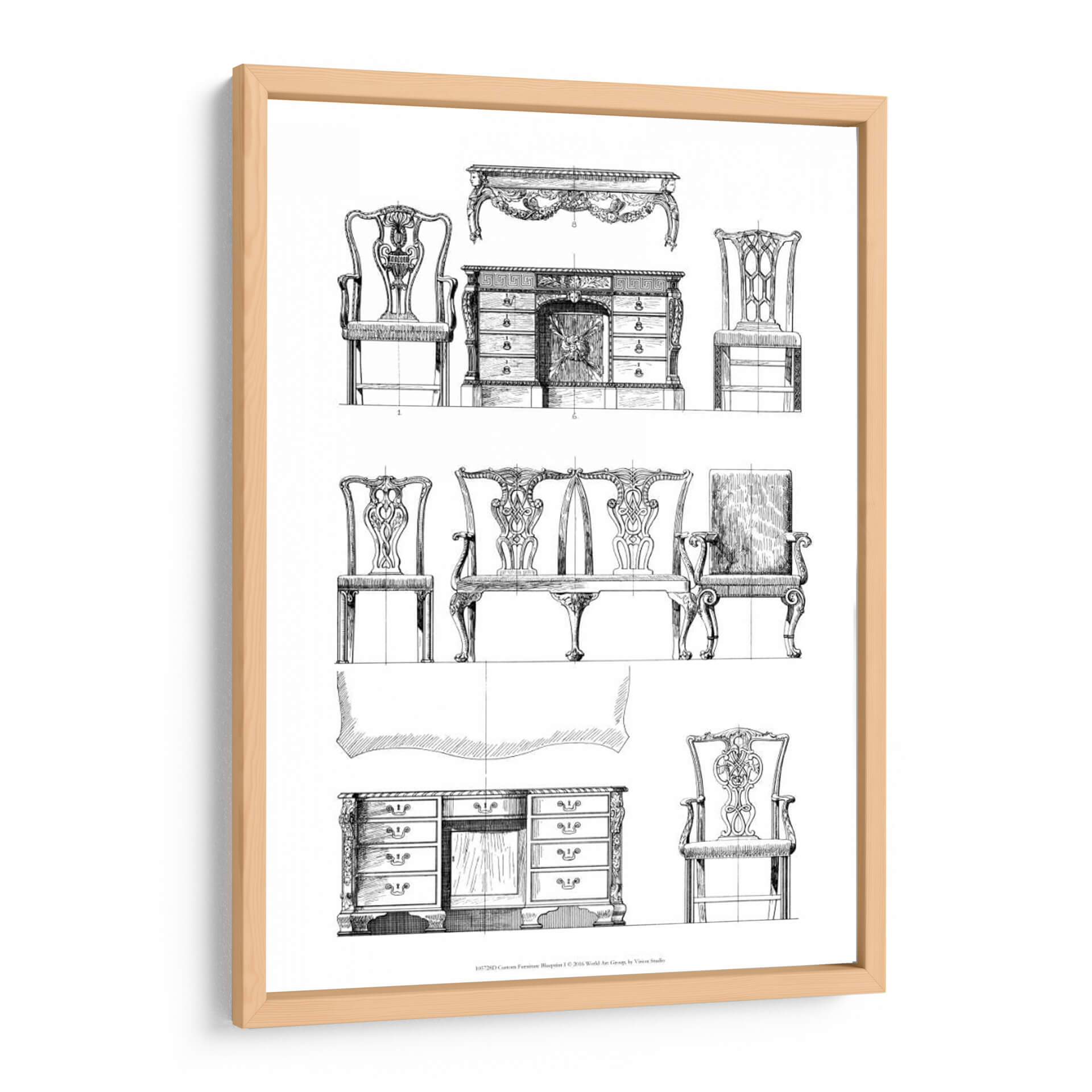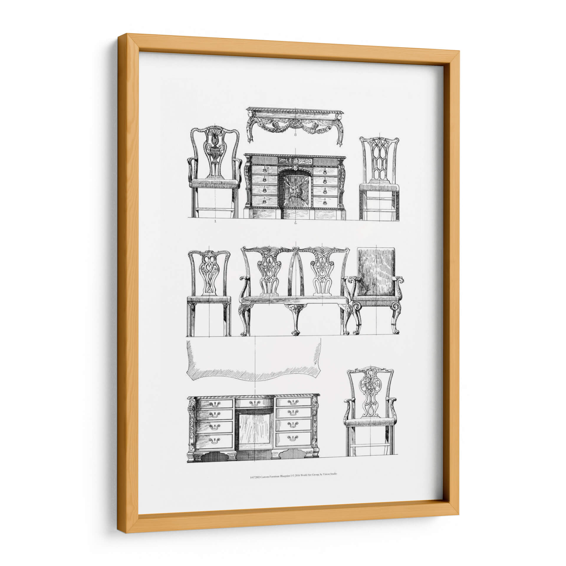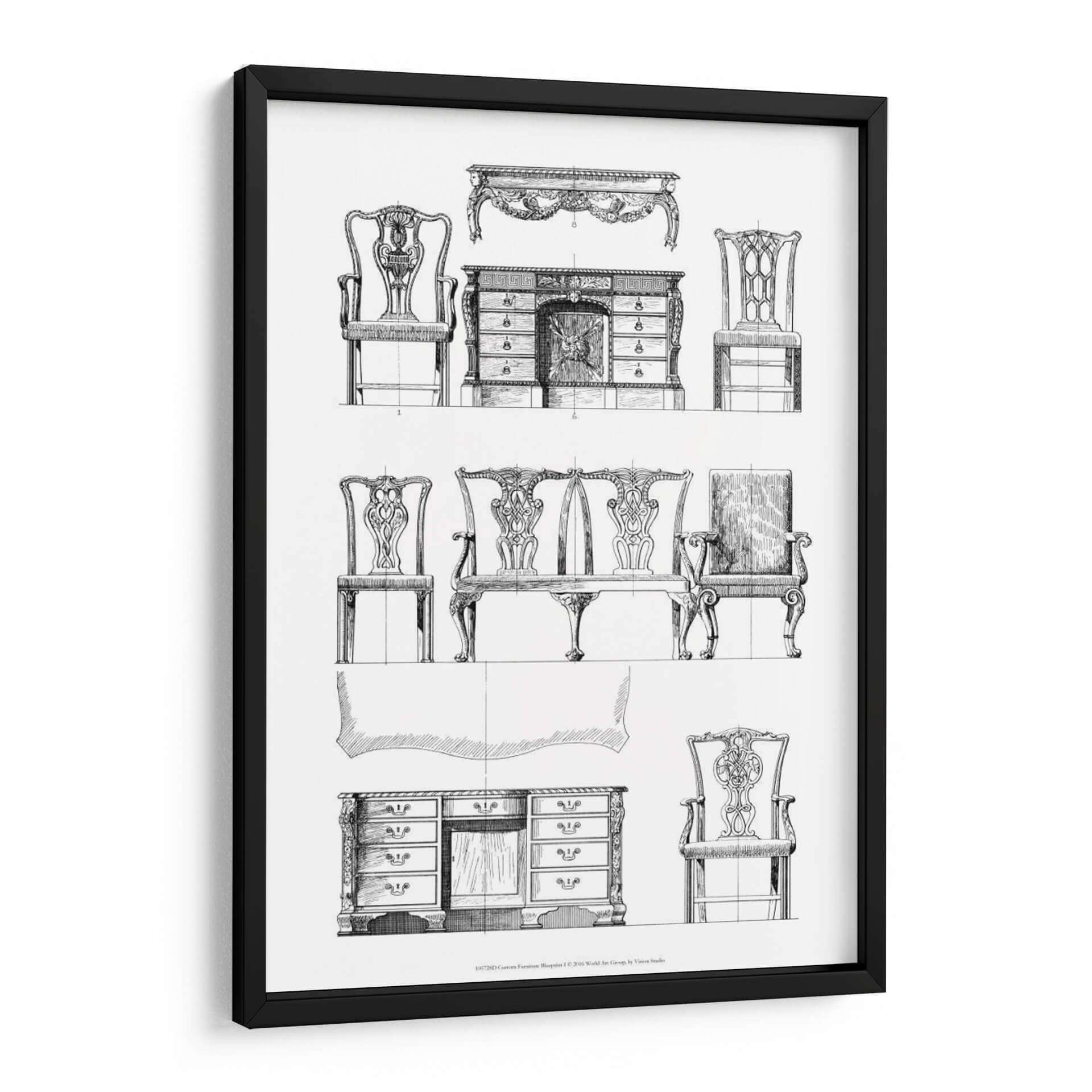 Sumérgete en la elegancia atemporal con "Plan De Muebles Personalizados I", una obra de Vision Studio que captura la esencia del diseño clásico y la artesanía detallada. Este cuadro decorativo presenta un conjunto de mobiliario exquisitamente dibujado, destacando la ornamentación intrincada de sillas de estilo Chippendale y un elegante escritorio o tocador. La paleta de colores monocromática, en tonos de negro y blanco, resalta la precisión de las líneas y la profundidad de cada detalle, creando una atmósfera de sofisticación y orden. Ideal para espacios que buscan un toque de refinamiento histórico o para amantes del diseño de interiores con aprecio por las piezas con carácter y narrativa. La composición organizada, presentando diferentes vistas y elementos de mobiliario, evoca una sensación de estudio y planificación, perfecta para inspirar creatividad en oficinas, despachos o salas de estar con un estilo clásico o ecléctico. Añade una dimensión de arte y diseño a tu hogar con esta pieza única que celebra la belleza de la ebanistería tradicional y las líneas arquitectónicas.