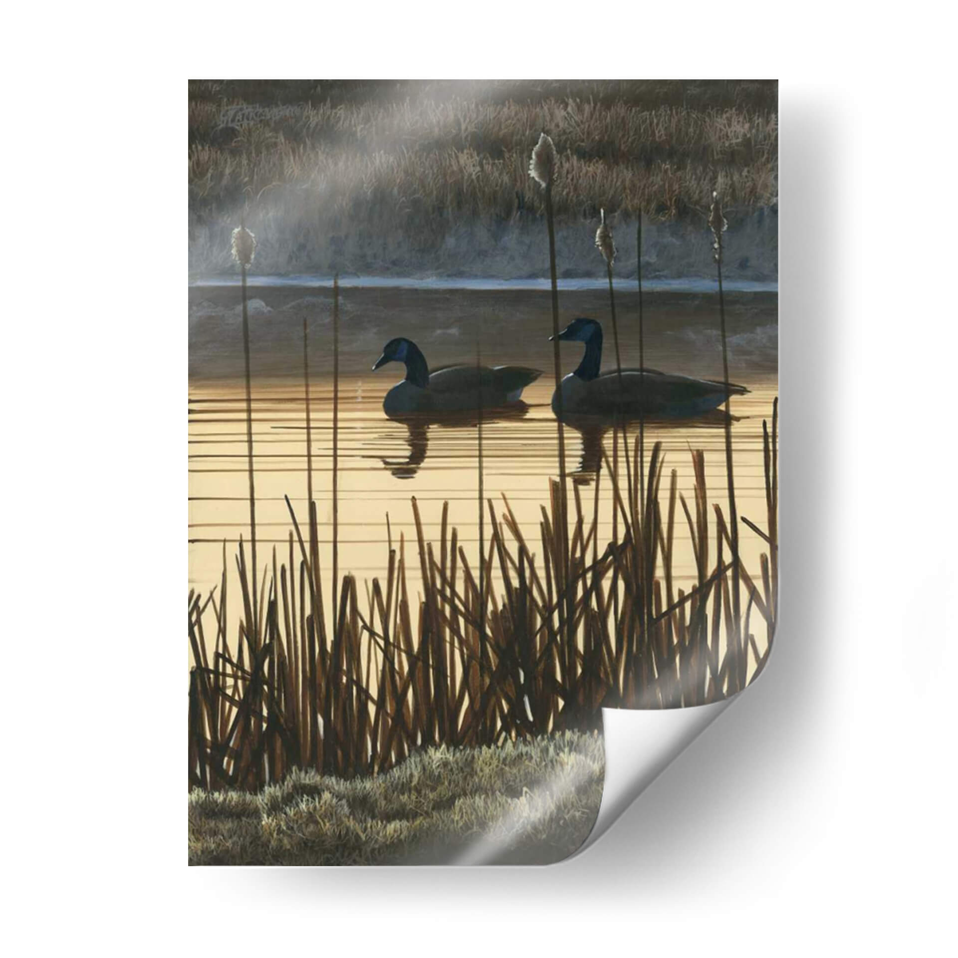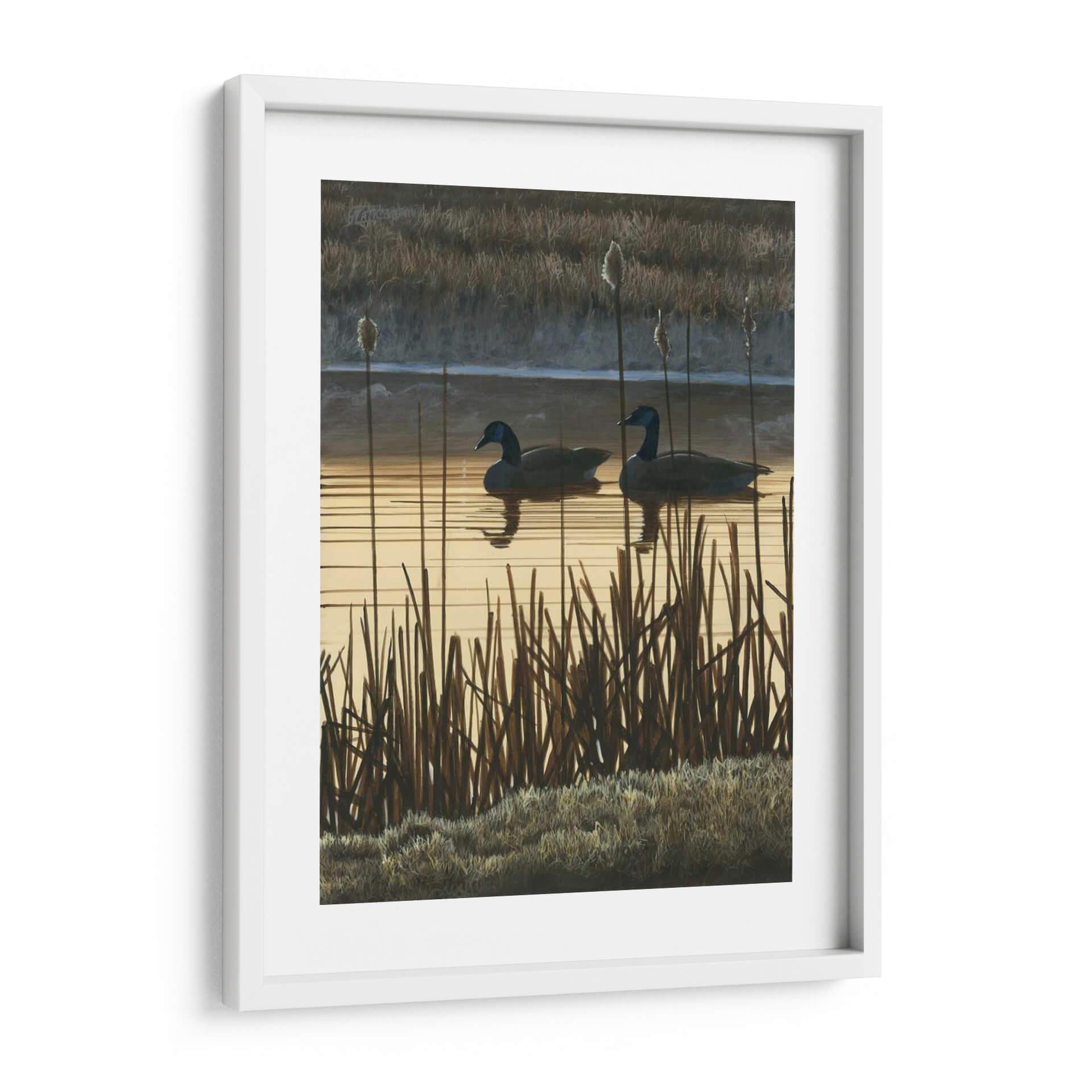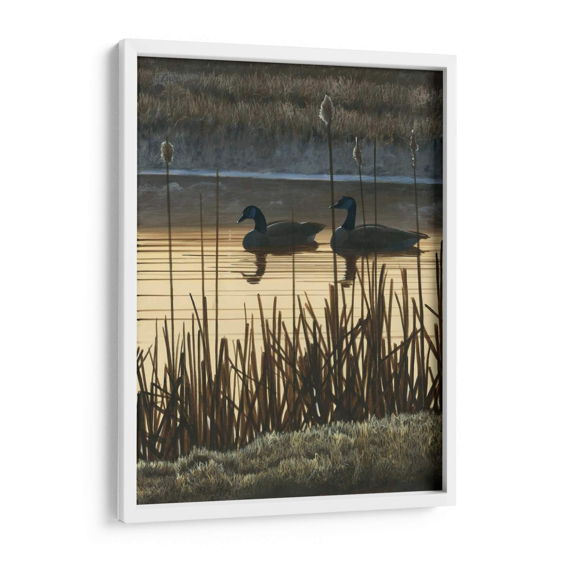 Sumérgete en la serena belleza de 'Primera Luz II', una obra de arte contemporáneo que captura un momento efímero en un humedal al amanecer. El artista Fred Szatkowski nos presenta un paisaje evocador dominado por tonos tierra cálidos y sutiles contrastes. Dos gansos navegan tranquilamente sobre un espejo de agua que refleja la luz dorada del sol naciente, mientras altas cañas y pastos secos enmarcan la escena, añadiendo textura y profundidad. La paleta de colores, que oscila entre dorados suaves, marrones terrosos y grises sombríos, crea una atmósfera de calma y contemplación, perfecta para añadir un toque de naturaleza serena a tu hogar u oficina. Este cuadro decorativo es ideal para espacios que buscan transmitir paz y conexión con el entorno natural. Su estilo realista con toques impresionistas permite apreciar los detalles de la vegetación y el movimiento del agua, invitando a la reflexión y al disfrute visual. 'Primera Luz II' no es solo una imagen, sino una ventana a un momento de tranquilidad, un recordatorio de la belleza simple y poderosa del mundo natural, transformando cualquier pared en un santuario de paz.