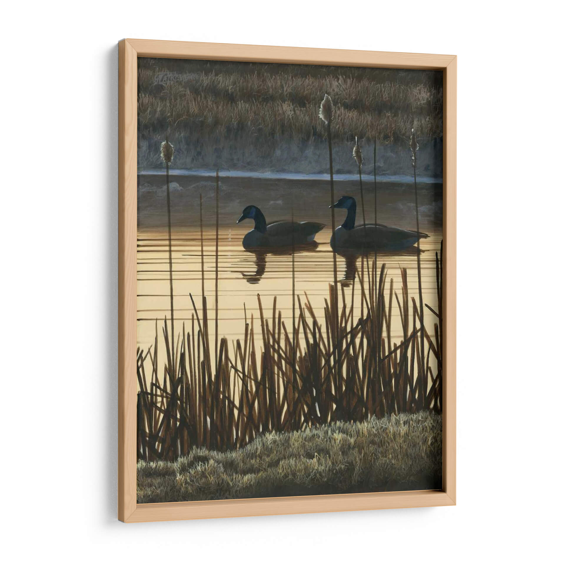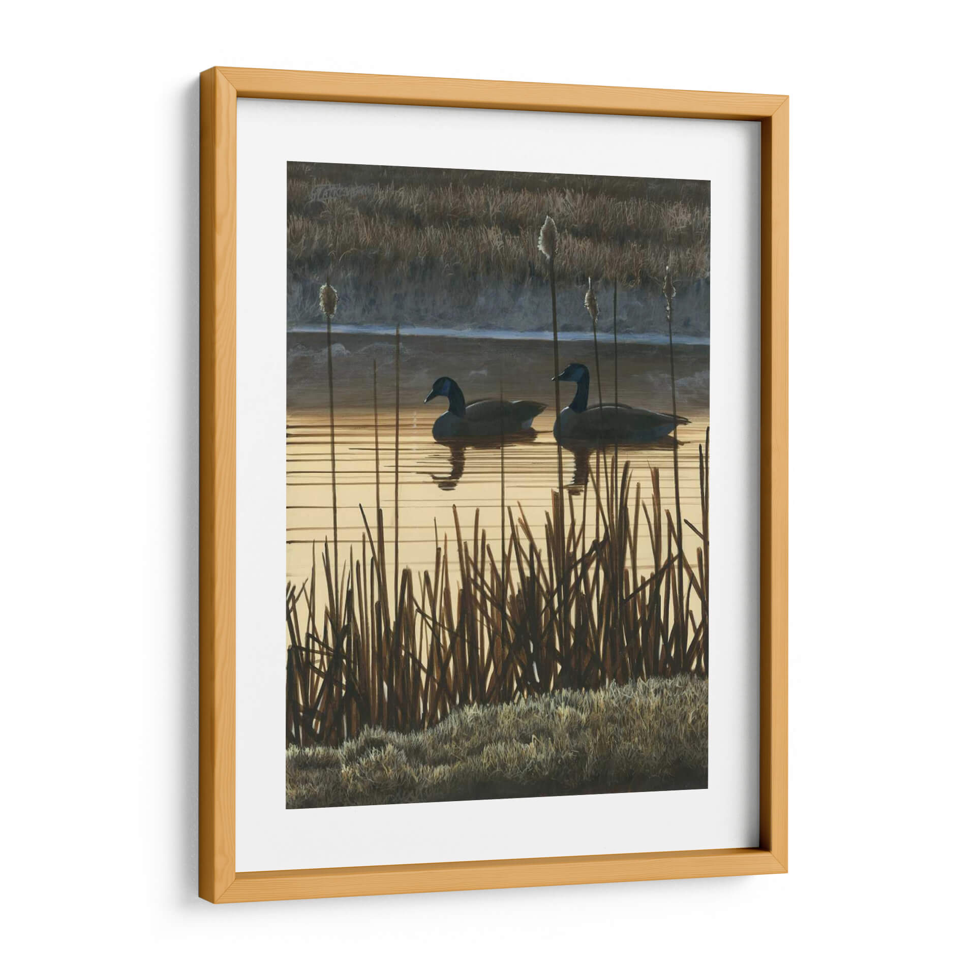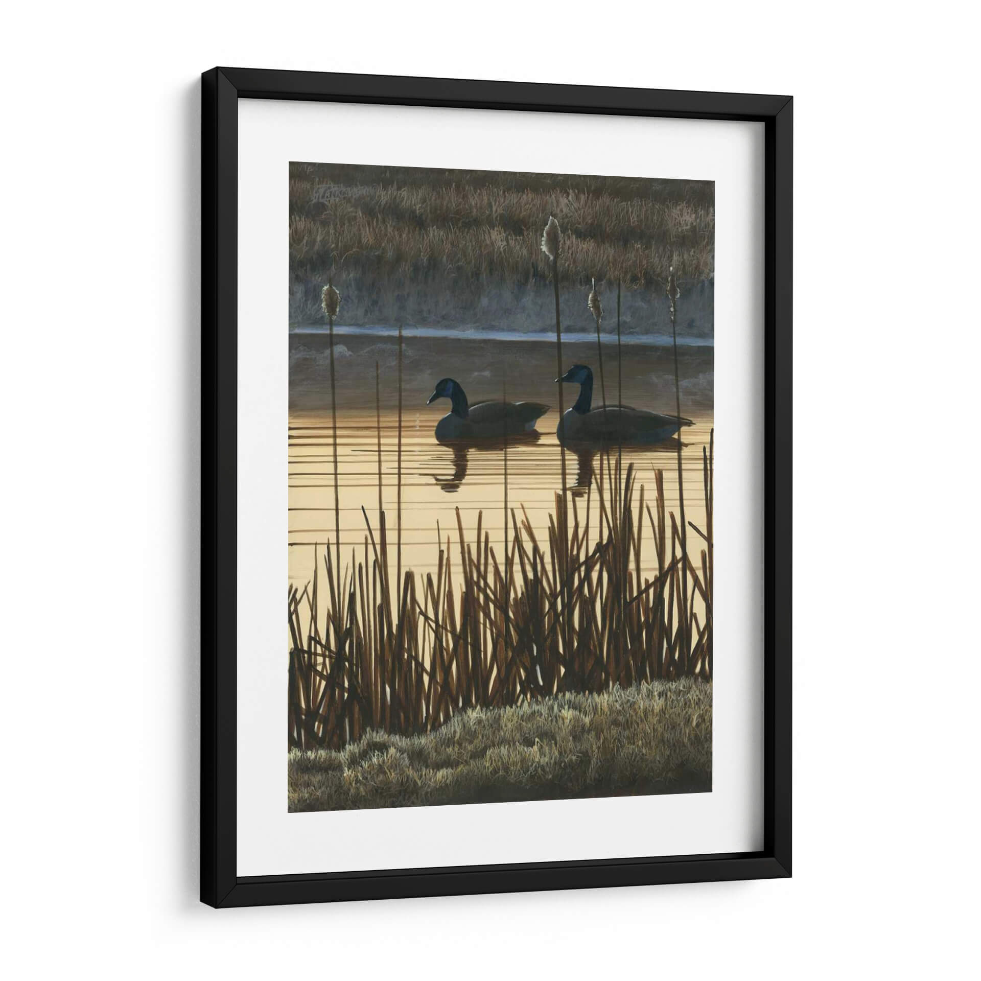 Sumérgete en la serena belleza de 'Primera Luz II', una obra de arte contemporáneo que captura un momento efímero en un humedal al amanecer. El artista Fred Szatkowski nos presenta un paisaje evocador dominado por tonos tierra cálidos y sutiles contrastes. Dos gansos navegan tranquilamente sobre un espejo de agua que refleja la luz dorada del sol naciente, mientras altas cañas y pastos secos enmarcan la escena, añadiendo textura y profundidad. La paleta de colores, que oscila entre dorados suaves, marrones terrosos y grises sombríos, crea una atmósfera de calma y contemplación, perfecta para añadir un toque de naturaleza serena a tu hogar u oficina. Este cuadro decorativo es ideal para espacios que buscan transmitir paz y conexión con el entorno natural. Su estilo realista con toques impresionistas permite apreciar los detalles de la vegetación y el movimiento del agua, invitando a la reflexión y al disfrute visual. 'Primera Luz II' no es solo una imagen, sino una ventana a un momento de tranquilidad, un recordatorio de la belleza simple y poderosa del mundo natural, transformando cualquier pared en un santuario de paz.