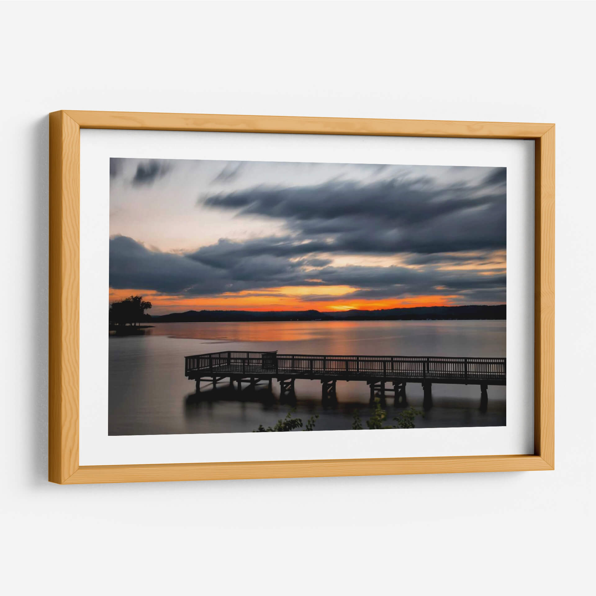 Captura la serenidad y la belleza efímera de un atardecer junto al lago con "Puesta De Sol Del Lago", una obra de arte contemporáneo que evoca paz y contemplación. La pieza presenta un muelle de madera que se adentra en aguas tranquilas, reflejando los vibrantes tonos anaranjados y dorados del cielo crepuscular. Las nubes, capturadas con un efecto de larga exposición, añaden una sensación de movimiento etéreo y dramatismo a la escena. La paleta de colores, dominada por los cálidos naranjas y dorados del atardecer que contrastan con los tonos fríos y oscuros de las nubes y el agua, crea una atmósfera de profunda calma y melancolía reflexiva. Este cuadro decorativo es ideal para añadir un toque de sofisticación y tranquilidad a cualquier espacio, ya sea una sala de estar, un dormitorio o una oficina. Su composición paisajística y su estilo fotográfico evocan la sensación de estar presente en ese momento de paz natural. "Puesta De Sol Del Lago" invita a la introspección y a la apreciación de la belleza serena de la naturaleza, convirtiéndose en un punto focal que transmite serenidad y calma.
