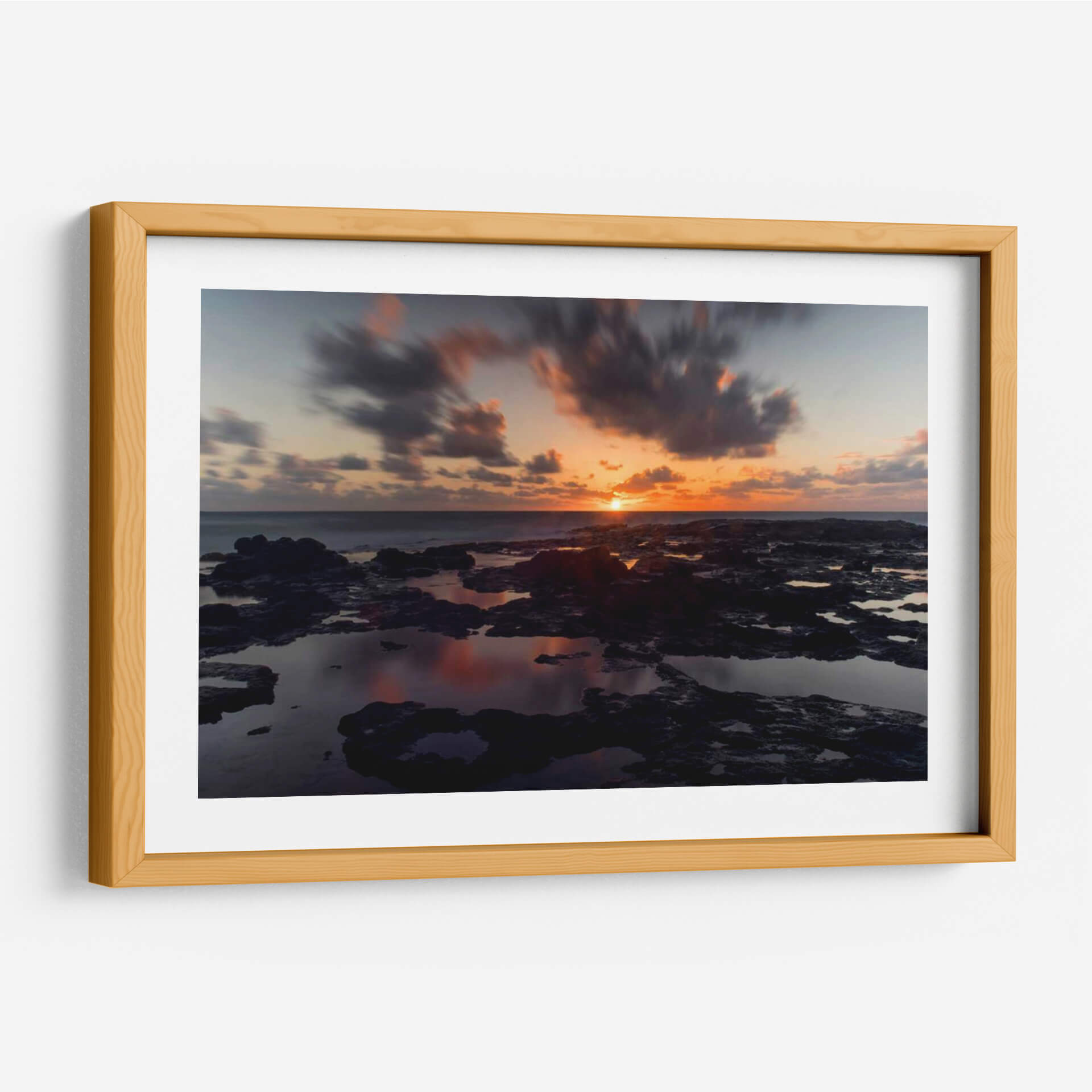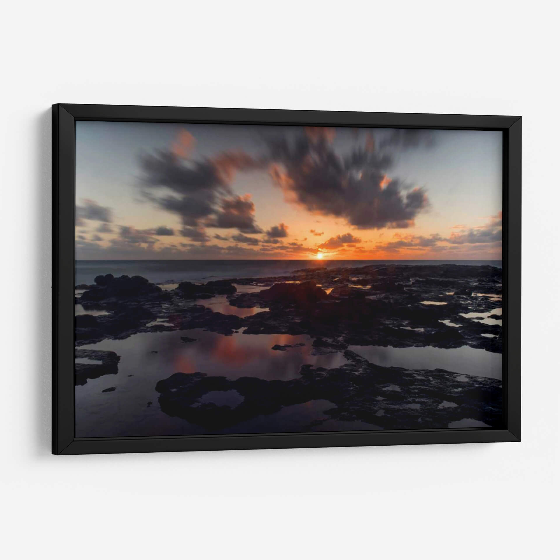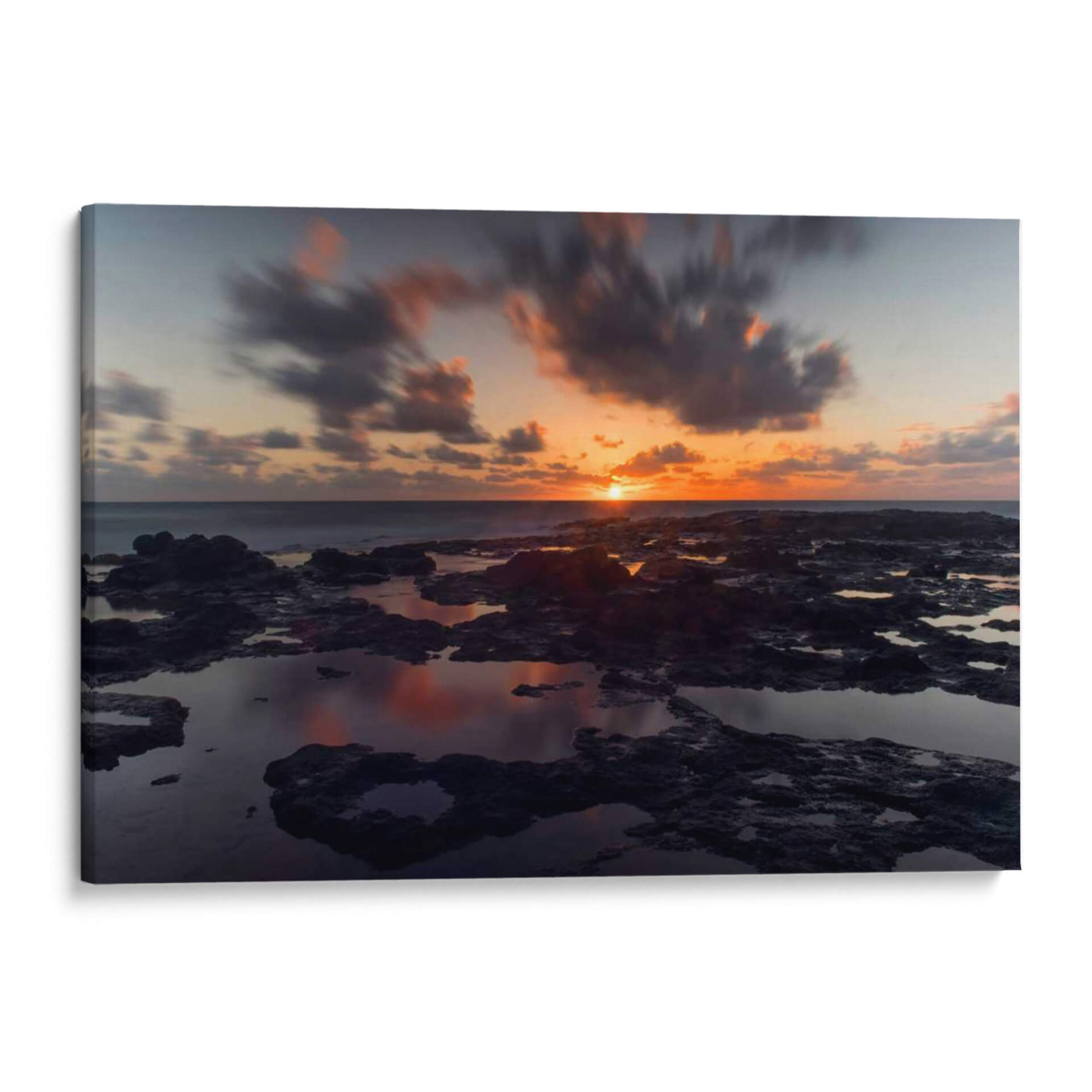 Sumérgete en la atmósfera dramática de "Rocas de Lava", una cautivadora obra de arte que captura la esencia de un atardecer sobre un paisaje rocoso y acuático. Los tonos naranjas y rosados del sol poniente se reflejan en las pozas de agua, creando un efecto espejo que duplica la intensidad del cielo crepuscular. Las formaciones rocosas oscuras y texturizadas contrastan con las nubes etéreas y en movimiento, capturadas con una técnica de larga exposición que suaviza el cielo y aporta una sensación de calma y dinamismo a la vez. Esta pieza es ideal para añadir un toque de serenidad y misterio a tu sala de estar, dormitorio u oficina. El juego de luces y sombras, junto con la paleta de colores cálidos y fríos, convierte a este cuadro decorativo en un punto focal que invita a la contemplación. "Rocas de Lava" es más que una imagen; es una ventana a un momento efímero de belleza natural, perfecta para quienes buscan arte contemporáneo que evoque emociones profundas y conecte con la fuerza de la naturaleza. Dale vida a tus paredes con esta impresionante escena costera.