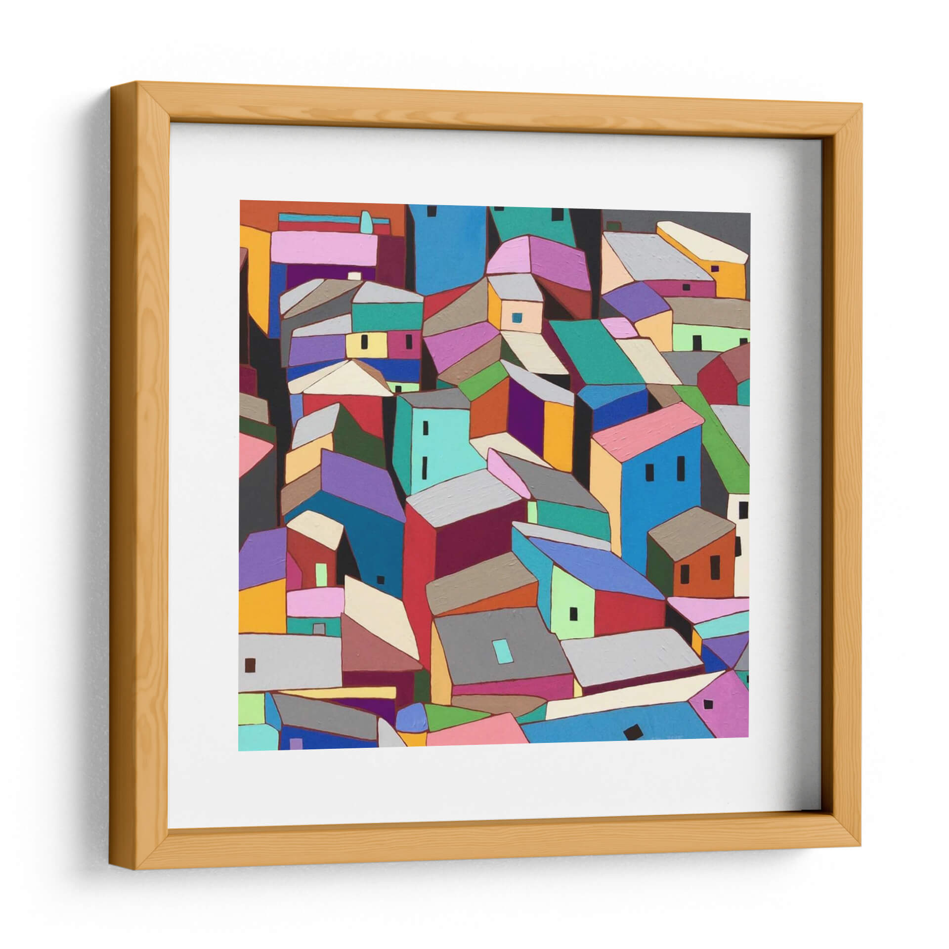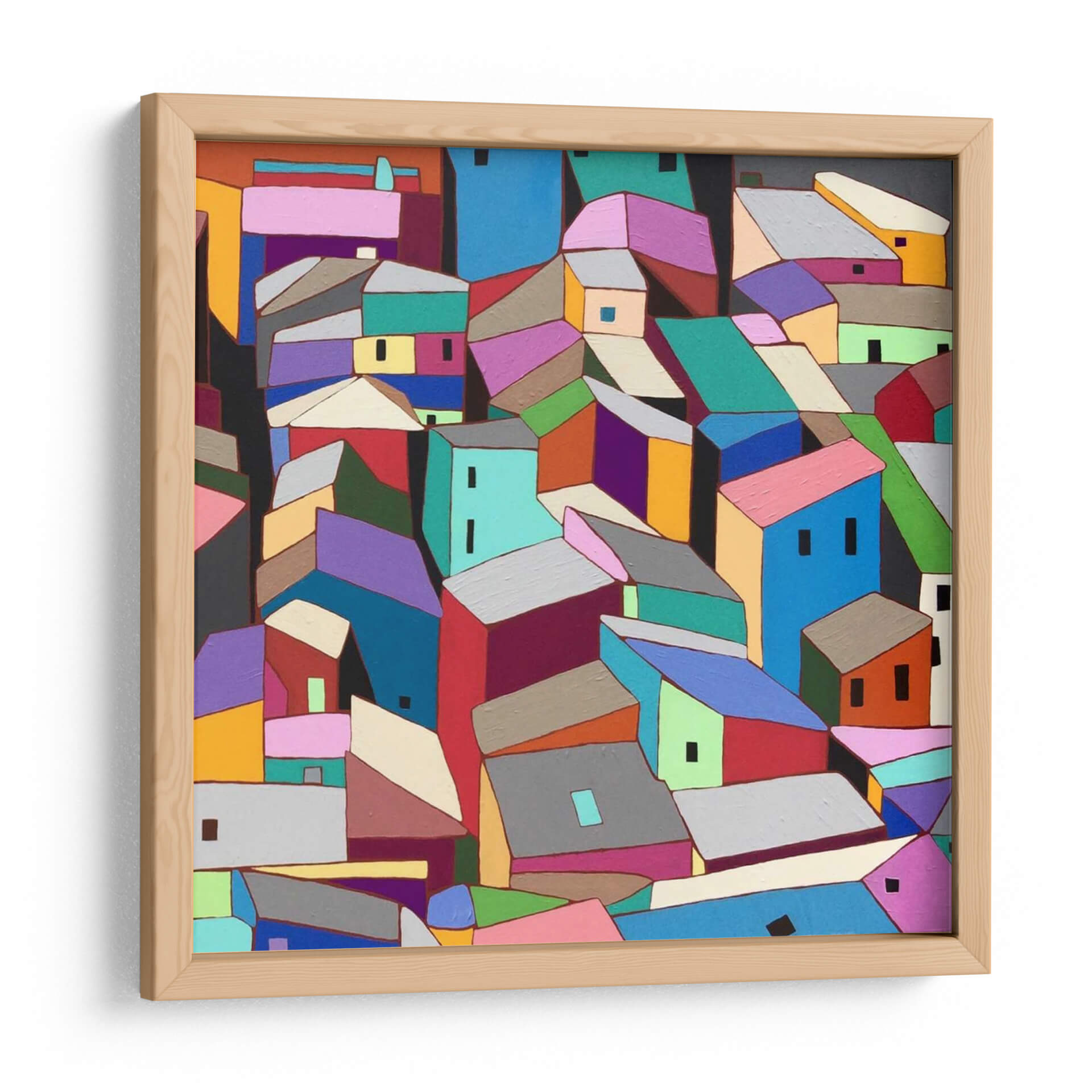 Transforma tu espacio con 'Rooftops II' de Nikki Galapon, una obra de arte contemporáneo que captura la esencia vibrante de un paisaje urbano abstracto. Esta pieza explora la interconexión de edificios a través de formas geométricas audaces y una paleta de colores efervescente que incluye azules eléctricos, rosas intensos, verdes turquesa y toques de naranja y amarillo. La composición dinámica, con sus tejados superpuestos y fachadas estilizadas, invita a una contemplación lúdica, sugiriendo la complejidad y el encanto de la vida urbana sin representar detalles literales. El estilo de Galapon es distintivo, fusionando elementos de abstracción geométrica con una sensibilidad moderna, creando una obra que es a la vez estimulante y estéticamente atractiva. Ideal para añadir un toque de color y personalidad a cualquier sala de estar, oficina o dormitorio, este cuadro decorativo moderno se convierte en un punto focal que despierta conversaciones y refleja un gusto por el arte audaz y contemporáneo. La obra evoca una sensación de energía positiva y orden dentro del caos aparente de la ciudad, ofreciendo una perspectiva única y artística de un entorno familiar.