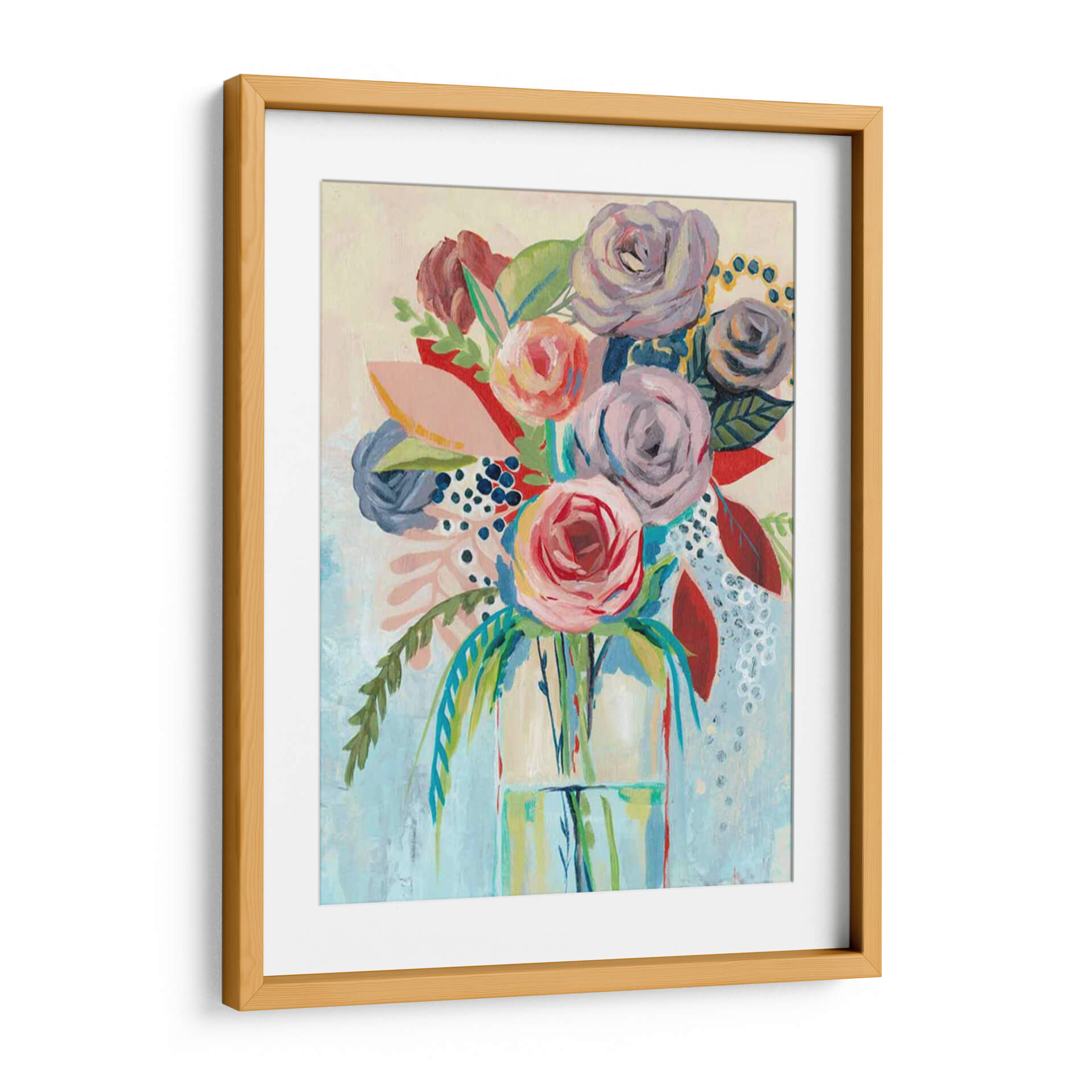 Inunda tu espacio con la vibrante energía y el encanto botánico de "Roseate Posy I", una obra de arte contemporáneo que celebra la belleza de la naturaleza a través de una interpretación audaz y expresiva. Creada por la talentosa artista Grace Popp, este cuadro decorativo presenta un exuberante ramo de flores capturado en un estilo que fusiona lo abstracto con lo figurativo. Las delicadas rosas, representadas en tonos pastel de lavanda, rosa pálido y coral, se entrelazan con toques audaces de rojo intenso y azul profundo, creando un contraste visual cautivador. El fondo, bañado en suaves tonos crema y azules celestes, realza la viveza de las flores y aporta una sensación de serenidad y amplitud. La composición, dinámica y llena de texturas, evoca una sensación de alegría y vitalidad, perfecta para animar cualquier rincón de tu hogar u oficina. Este cuadro es una elección ideal para quienes buscan añadir un toque de color y sofisticación a su decoración, transformando cualquier pared en una galería personal. "Roseate Posy I" no es solo una imagen, es una invitación a la contemplación y al disfrute de la belleza efímera de las flores, interpretada con una sensibilidad artística única.