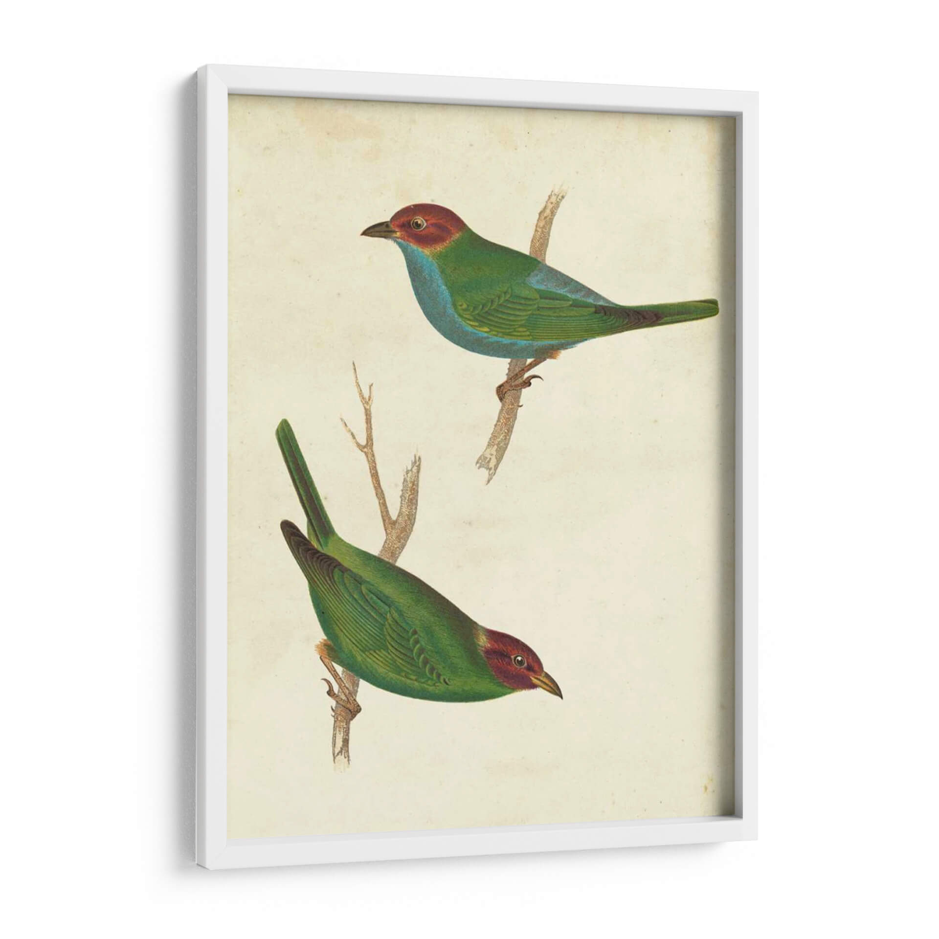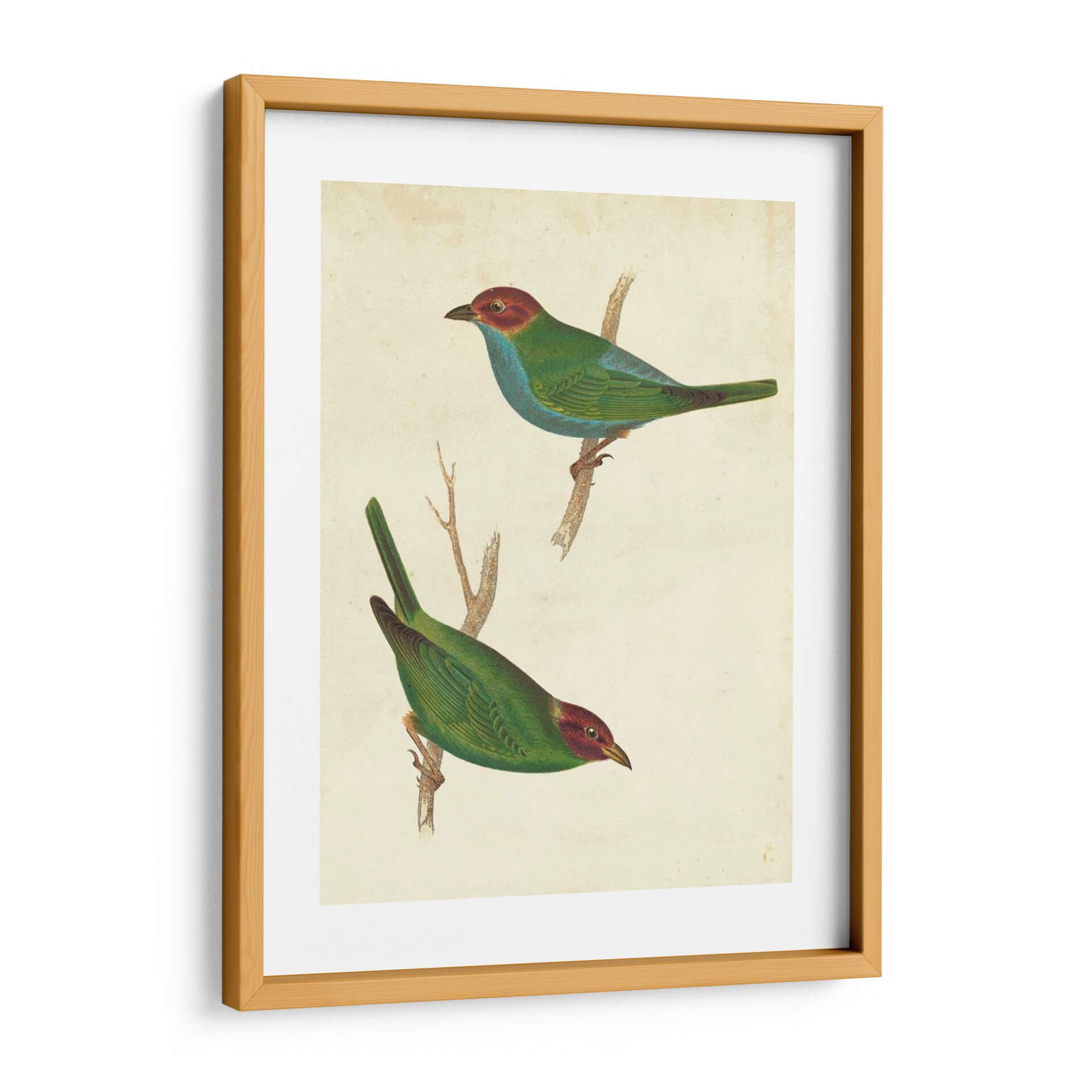 Descubre la elegancia natural con este exquisito cuadro decorativo que presenta dos "Tanager Peruano II", una obra inspirada en la ornitología y el arte clásico. La pieza exhibe dos aves vibrantes, con plumajes en tonos verdes y azules intensos, contrastando bellamente con sus cabezas de un rojo terroso. Las aves están representadas con un detalle meticuloso, posadas sobre ramas secas que añaden un toque de realismo y conexión con la naturaleza. El fondo, de un suave tono crema o pergamino envejecido, evoca la sensación de ilustraciones científicas antiguas, aportando un aire de sofisticación atemporal y un encanto vintage a la composición. Este cuadro decorativo es ideal para quienes buscan infundir calma, belleza y un toque de la majestuosidad de la fauna en su hogar u oficina. Su paleta de colores rica pero equilibrada lo convierte en una adición versátil para diversos estilos de decoración, desde el clásico hasta el contemporáneo, añadiendo un punto de interés visual y una conexión con el mundo natural. Perfecto para salas de estar, estudios o cualquier espacio que desee realzar con un arte evocador y lleno de detalles.