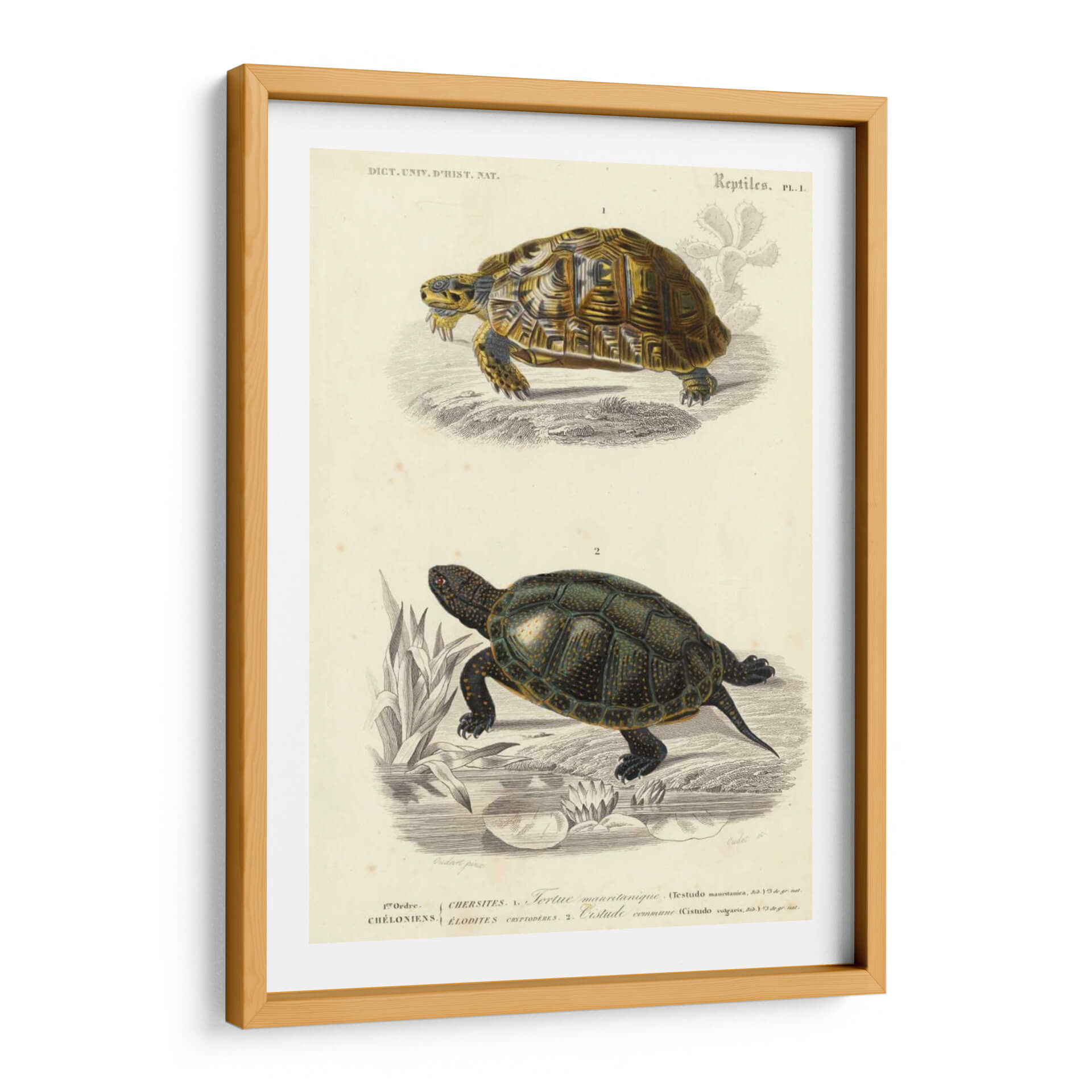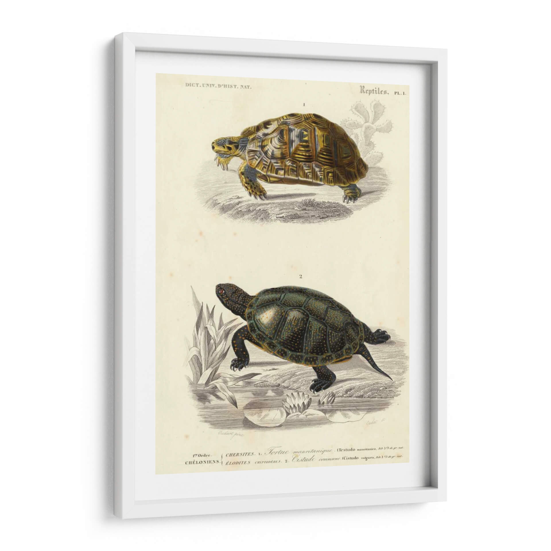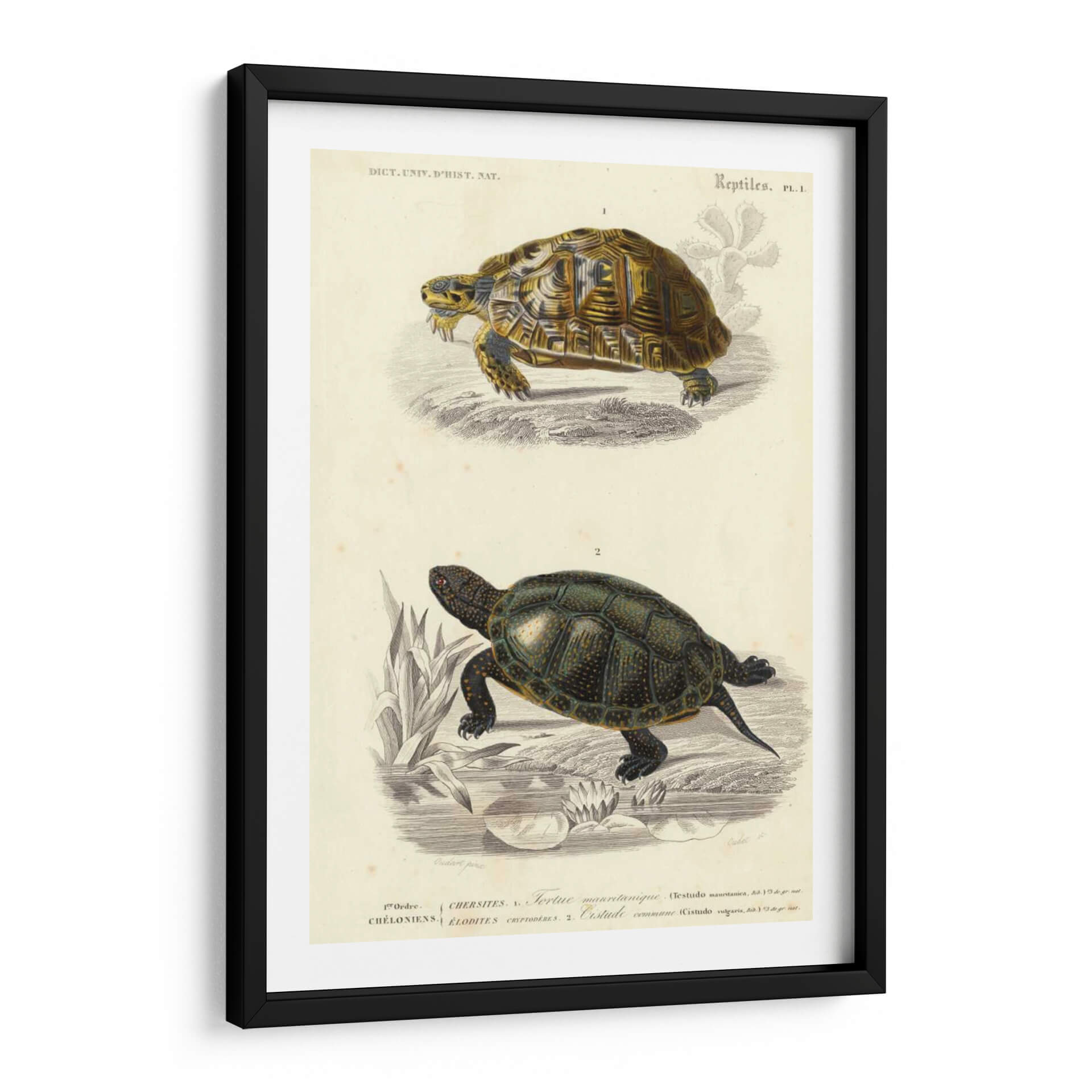 Sumérgete en el fascinante mundo de la herpetología con "Tortuga Antigua Dúo II", una exquisita obra de arte del artista Oudart. Esta pieza captura la majestuosidad de dos tortugas en un estilo de ilustración científica clásica, evocando una sensación de sabiduría ancestral y conexión con la naturaleza. La paleta de colores se centra en tonos tierra y ocres para la tortuga superior, contrastando con el verde oscuro y los detalles dorados de la tortuga inferior, todo sobre un fondo de papel envejecido que aporta un toque vintage. La composición presenta a cada reptil en su hábitat, uno en tierra árida con referencias botánicas sutiles, y el otro en un entorno acuático con lirios y vegetación densa, creando un díptico naturalista de gran detalle. Ideal para espacios que buscan un aire de estudio, biblioteca o un rincón de lectura con carácter. Este cuadro decorativo es perfecto para amantes de la naturaleza, la ciencia o para quienes aprecian el arte con historia, añadiendo un toque de elegancia atemporal y serenidad a cualquier hogar u oficina.