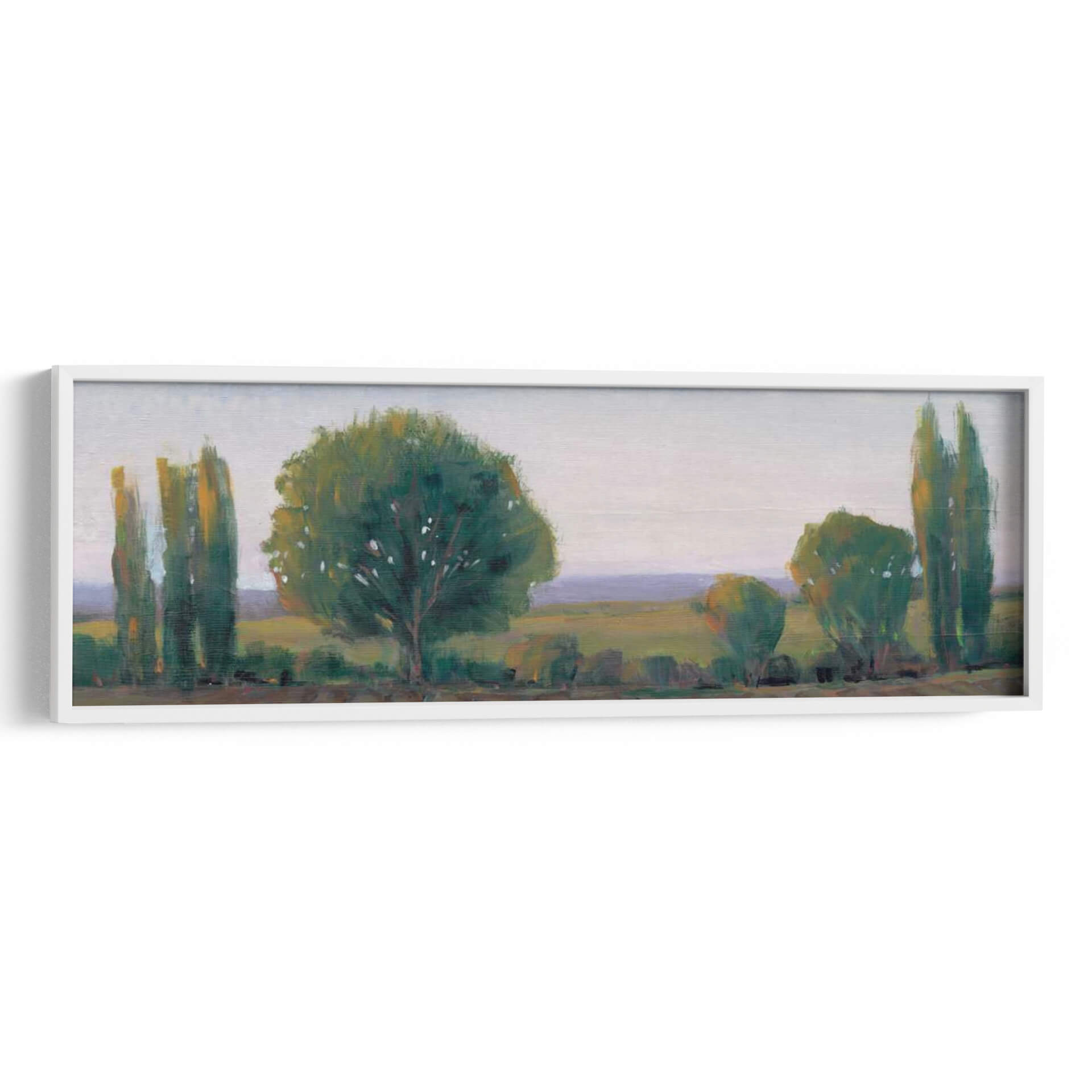 Embellece tu espacio con la obra "Treelina Panorámica I" de Tim O'Toole, una pieza de arte contemporáneo que evoca la serenidad de un paisaje natural. Este cuadro decorativo presenta una composición horizontal que captura la belleza de árboles esbeltos y frondosos en un entorno de tonos tierra y verdes profundos. La paleta de colores suaves, con sutiles toques de amarillo y azul pálido en el cielo, crea una atmósfera de calma y tranquilidad, ideal para cualquier rincón de tu hogar u oficina. El estilo impresionista de O'Toole, con pinceladas visibles y un juego magistral de luces y sombras, aporta una textura rica y una sensación de profundidad a la pieza. "Treelina Panorámica I" es perfecta para quienes buscan añadir un toque de naturaleza y sofisticación a su decoración, sirviendo como un punto focal que invita a la contemplación y al relax. Transforma tu sala de estar, dormitorio o estudio en un oasis de paz con este lienzo que captura la esencia efímera de un atardecer campestre.