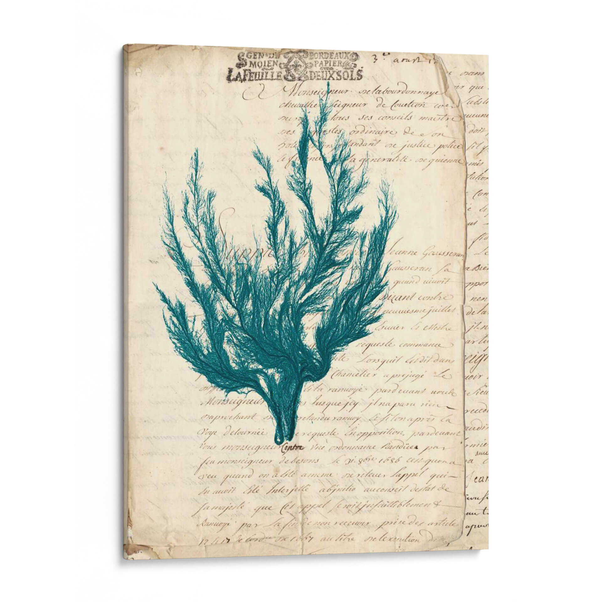 Aporta una dosis de elegancia natural y misterio a tu espacio con "Vintage Teal Seaweed V", una obra de arte digital que evoca la serenidad de las profundidades marinas. La pieza presenta una detallada ilustración de algas marinas en un vibrante tono verde azulado, contrastando sutilmente con un fondo texturizado que simula un antiguo documento manuscrito. Los intrincados detalles de las algas crean un efecto visual hipnotizante, invitando a la contemplación. Su paleta de colores, dominada por el teal profundo y los tonos beige apagados del papel, transmite una sensación de calma, historia y conexión con la naturaleza. Este cuadro decorativo es ideal para añadir un toque de sofisticación botánica a salones, dormitorios o estudios, funcionando como un punto focal sereno que dialoga con estilos decorativos tanto clásicos como contemporáneos. La composición, centrada en la delicada forma de las algas, aporta equilibrio y armonía visual. Es una pieza que combina la belleza etérea del mundo submarino con un aire vintage y académico, perfecta para aquellos que buscan arte con profundidad y carácter.