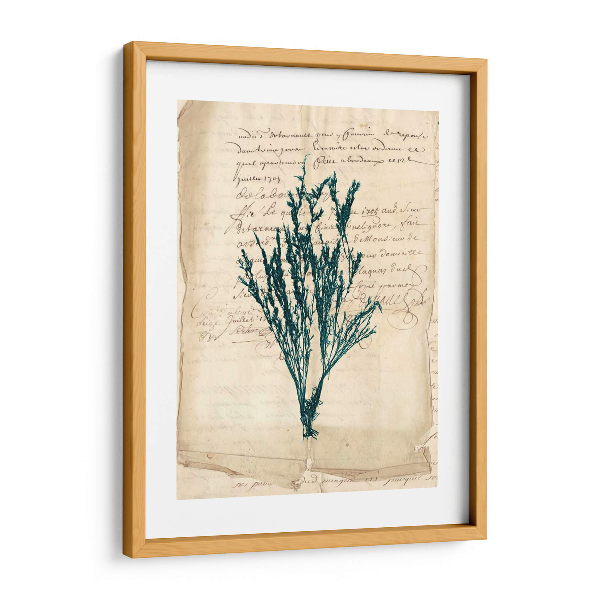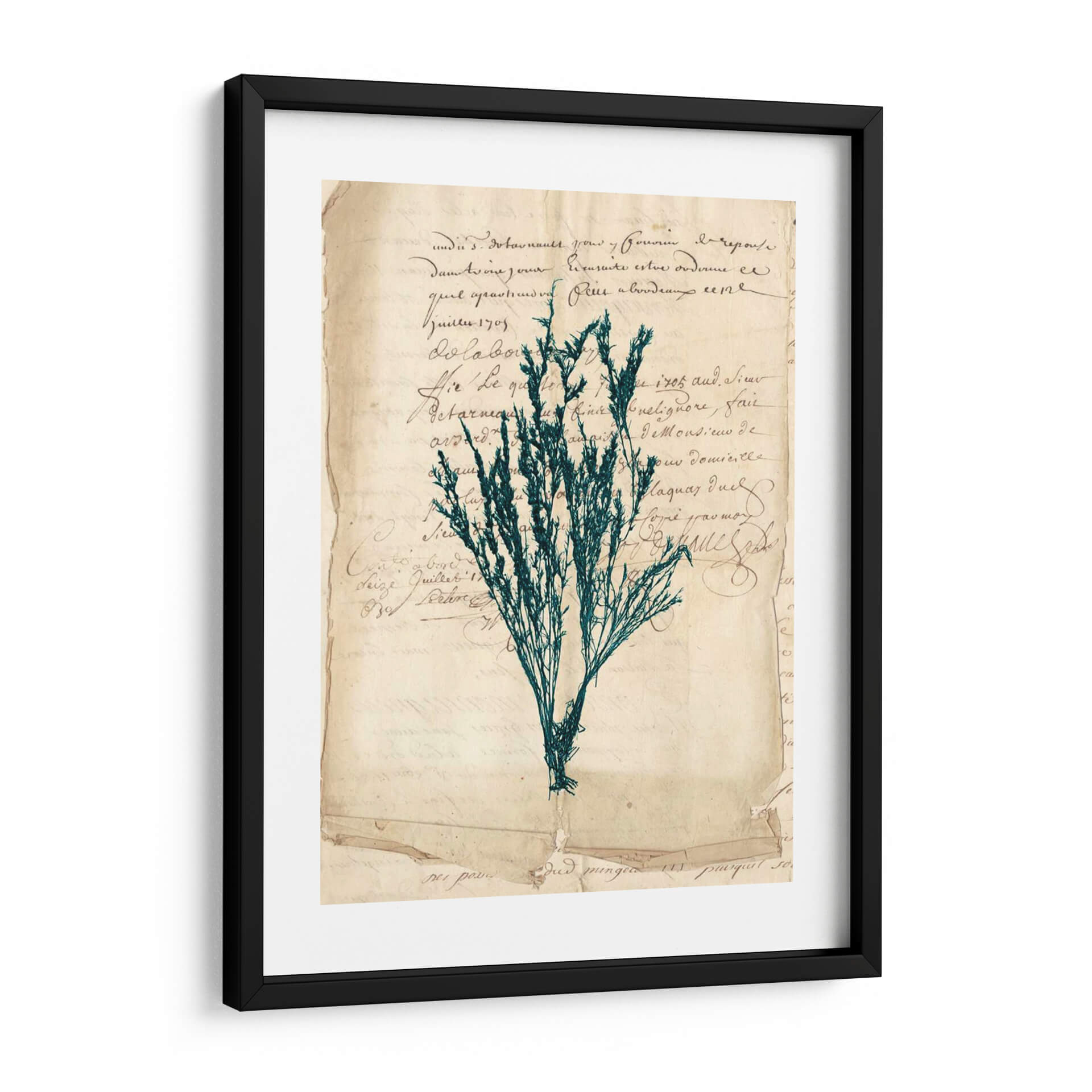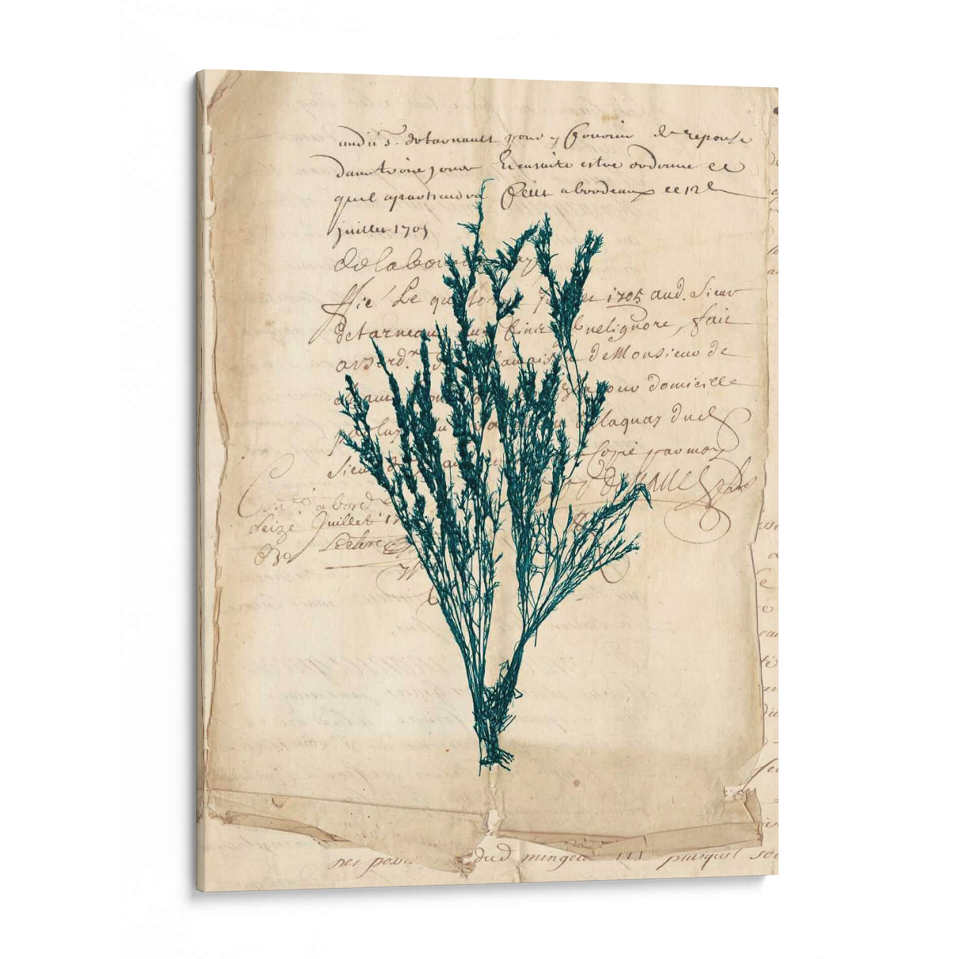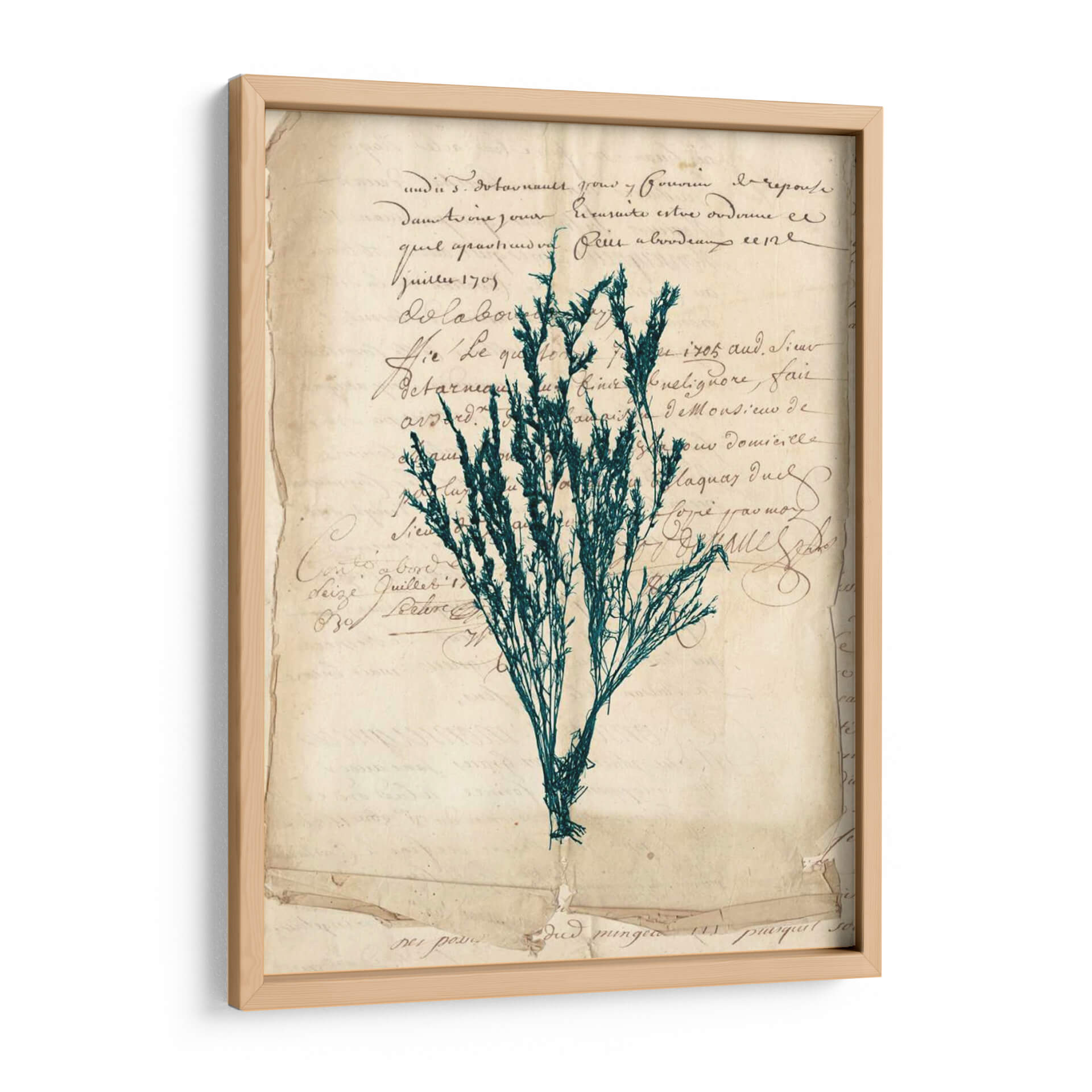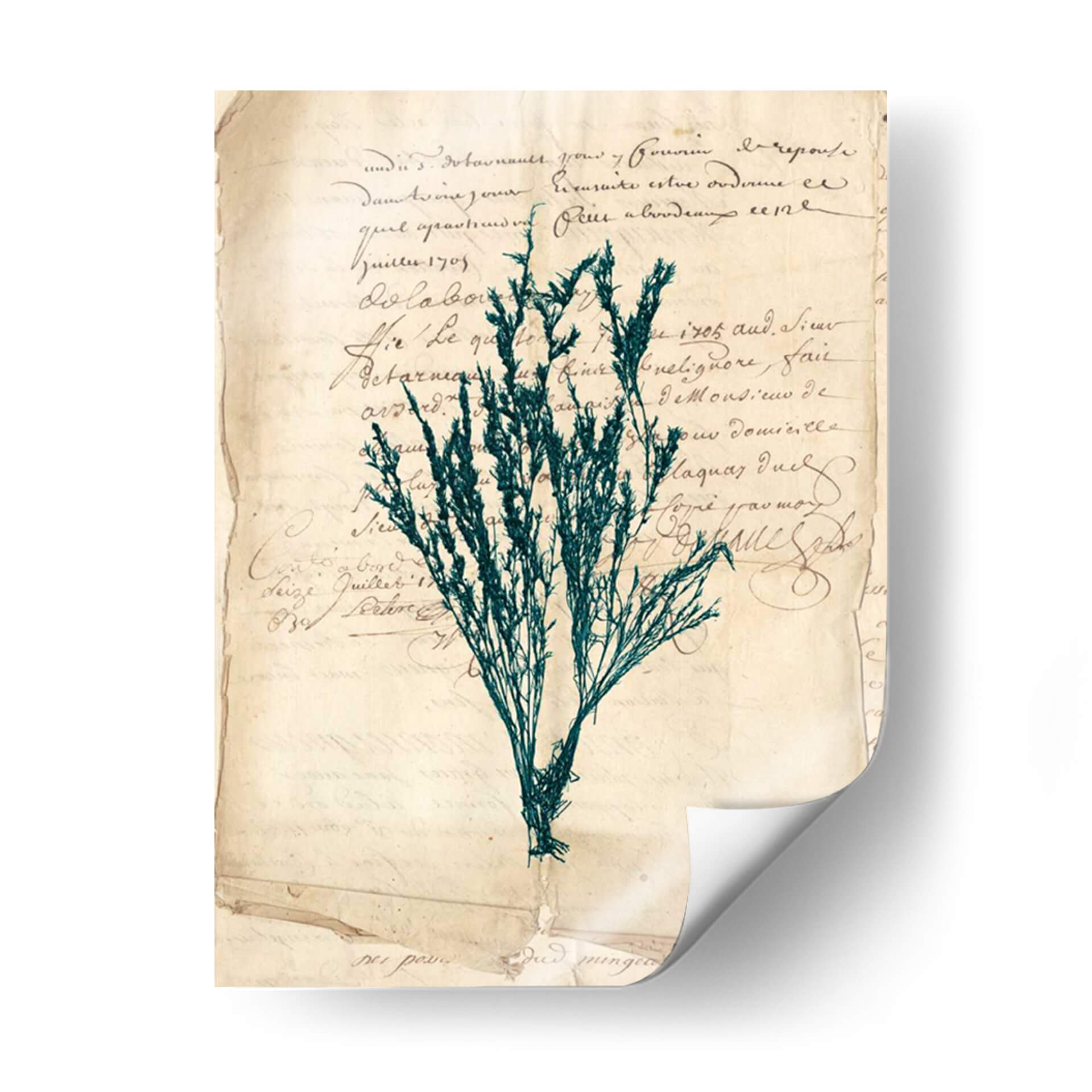 Sumérgete en la elegancia atemporal de "Vintage Teal Seaweed Viii", una obra de arte decorativo que evoca la serenidad y la belleza del mundo natural. Este cuadro presenta una delicada representación de algas marinas en un vibrante tono teal, contrastando sutilmente con un fondo que simula documentos antiguos o cartas manuscritas. La composición, con su aire vintage y botánico, crea una atmósfera de calma y nostalgia, perfecta para añadir un toque de sofisticación a cualquier espacio. Los colores, dominados por el verde azulado de las algas y los tonos sepia del papel, se combinan para generar una sensación de profundidad y textura. Ideal para salones, dormitorios o estudios que busquen una pieza de carácter y distinción. "Vintage Teal Seaweed Viii" no es solo una decoración de pared, sino una ventana a un rincón tranquilo de la naturaleza, presentado con un estilo artístico que fusiona lo botánico con lo histórico.
