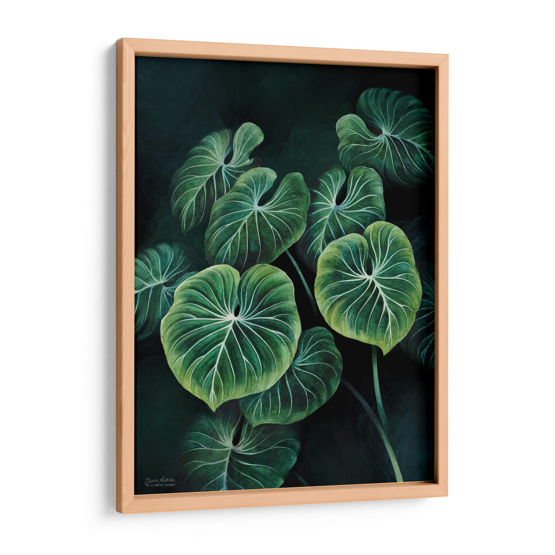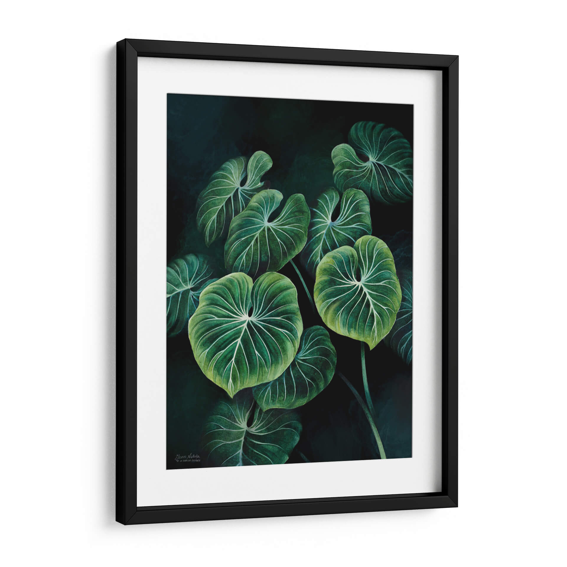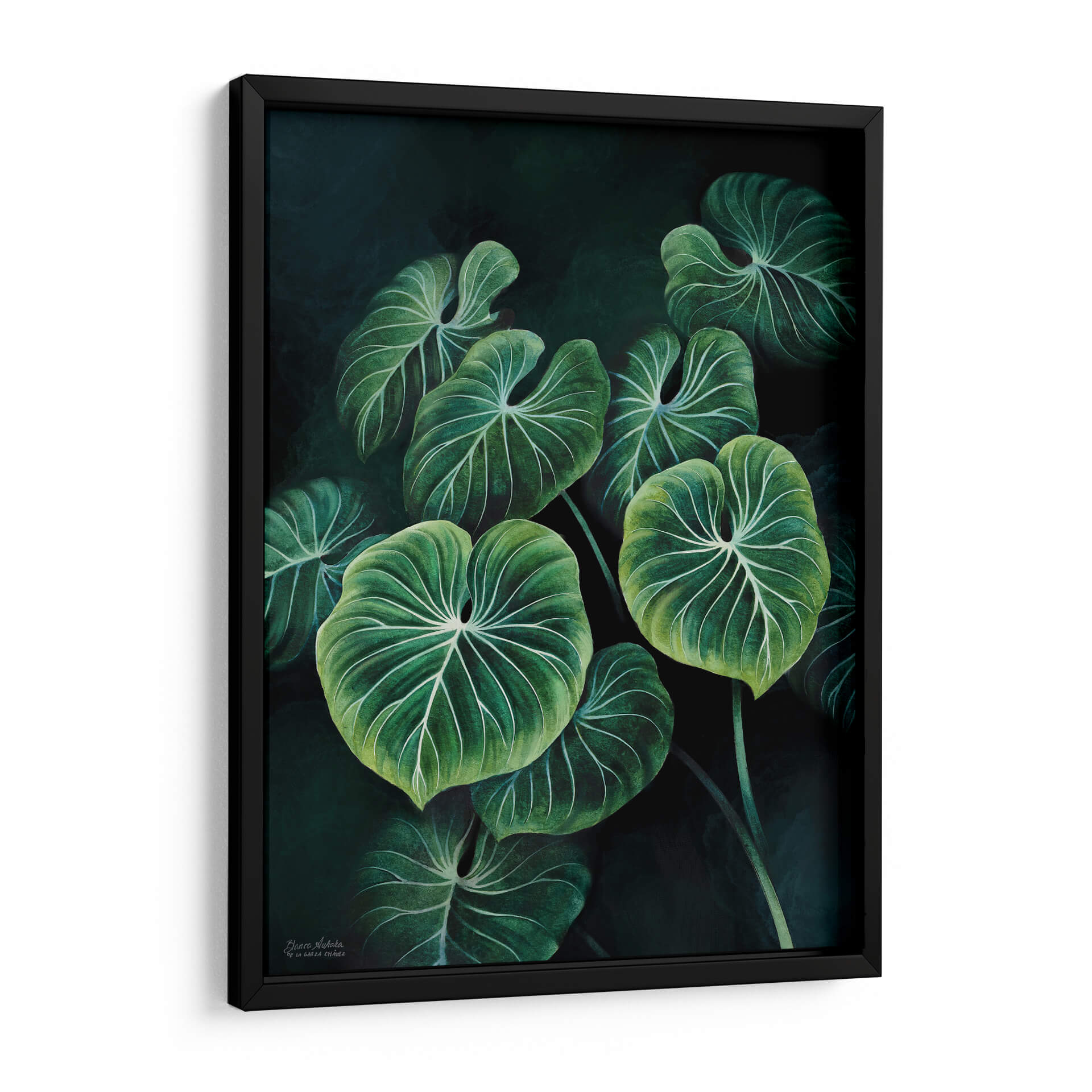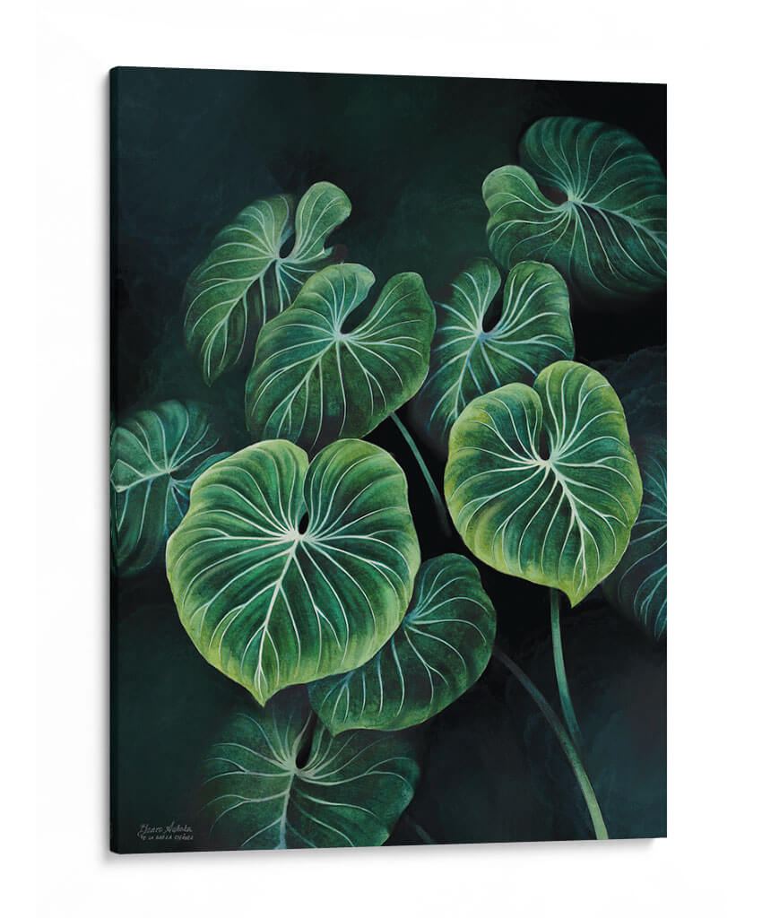 Sumérgete en la exuberante belleza de la naturaleza con nuestro cuadro decorativo 'Planta Philodendron Gloriosum', una obra maestra de Blanca Aurora que captura la esencia de la selva tropical con un toque contemporáneo. Este lienzo transporta a tu hogar u oficina la serenidad y la vitalidad de las hojas verdes profundas, realzadas por un intrincado patrón de venas blancas que crean un contraste cautivador. La paleta de colores, dominada por verdes intensos y oscuros con sutiles toques de luz que resaltan la textura, evoca una atmósfera de tranquilidad y sofisticación natural. La composición, centrada en el primer plano de estas icónicas hojas de filodendro, invita a la contemplación y añade profundidad a cualquier espacio. Ideal para quienes buscan infundir calma y un aire de exotismo en su decoración, este cuadro decorativo es perfecto para salas de estar, dormitorios o estudios que desean un toque de vida y elegancia orgánica. Su estilo detallado y realista, combinado con un fondo oscuro y atmosférico, lo convierte en una pieza versátil capaz de complementar tanto ambientes modernos como clásicos, aportando una sensación de conexión con el mundo natural.