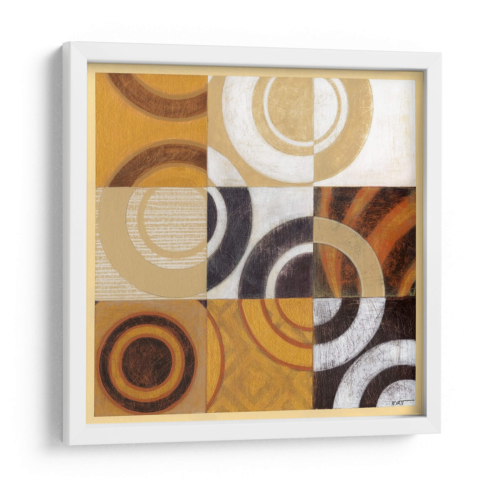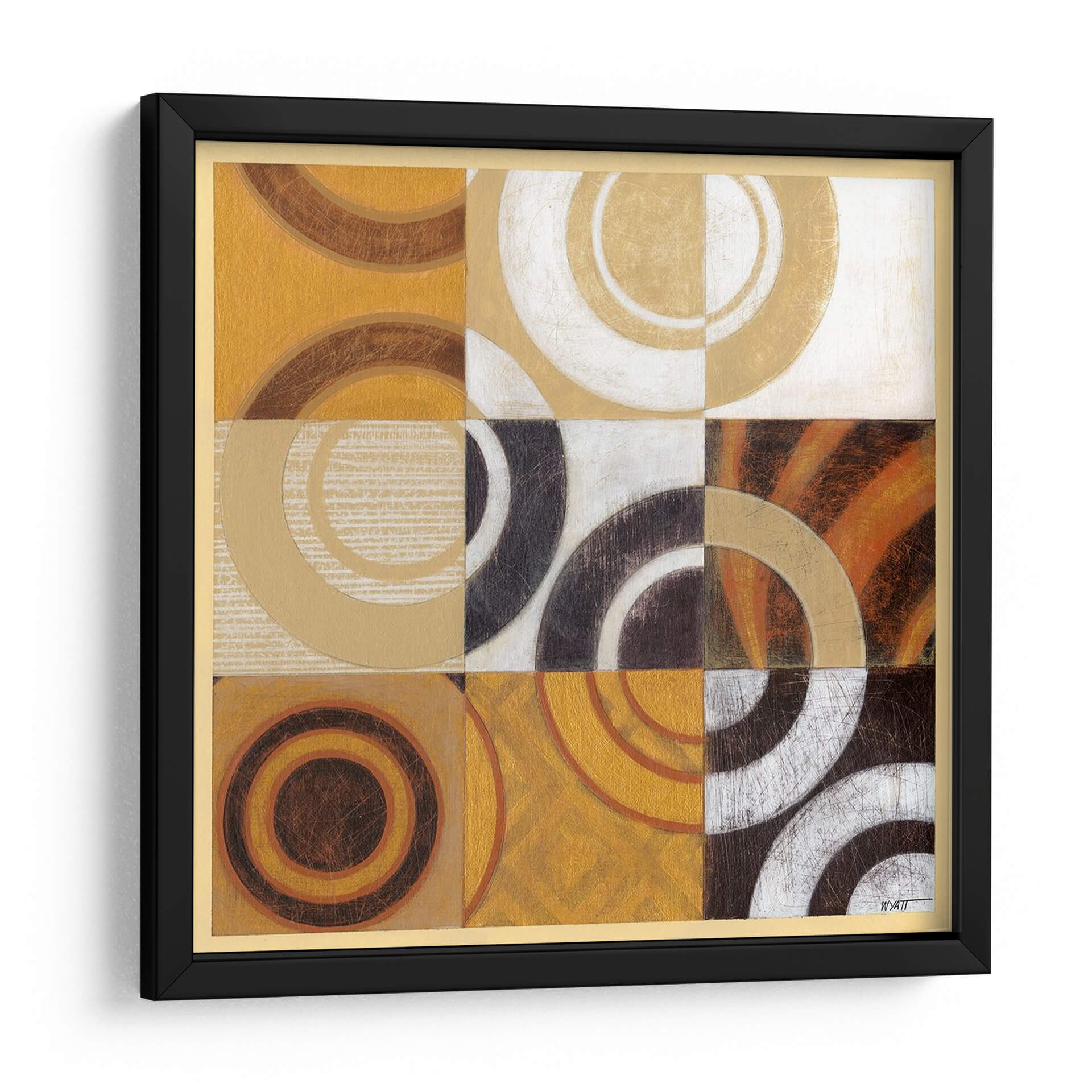 Sumérgete en la abstracción geométrica y la calidez de "Pulso I", una obra de arte contemporáneo que redefine la elegancia en tu espacio. Este cuadro decorativo es una explosión controlada de círculos concéntricos y formas curvas, dispuestas en una cuadrícula armoniosa que invita a la contemplación. La paleta de colores, dominada por tonos ocres, dorados, marrones profundos y toques de blanco y negro, crea una atmósfera rica y sofisticada, evocando tanto la energía del pulso vital como la serenidad de un atardecer. Las texturas sutiles y los acabados metálicos añaden una dimensión táctil y visual, haciendo que cada mirada sea una nueva experiencia. "Pulso I" es ideal para añadir un punto focal moderno y vibrante a tu sala de estar, un toque de distinción a tu oficina o una dosis de inspiración artística a tu dormitorio. Su diseño abstracto y su cuidada composición lo convierten en una pieza versátil, capaz de complementar una amplia gama de estilos decorativos, desde el contemporáneo hasta el ecléctico. Deja que esta obra maestra de Norman Wyatt Jr. transforme tu hogar en una galería personal, llena de carácter y estilo.