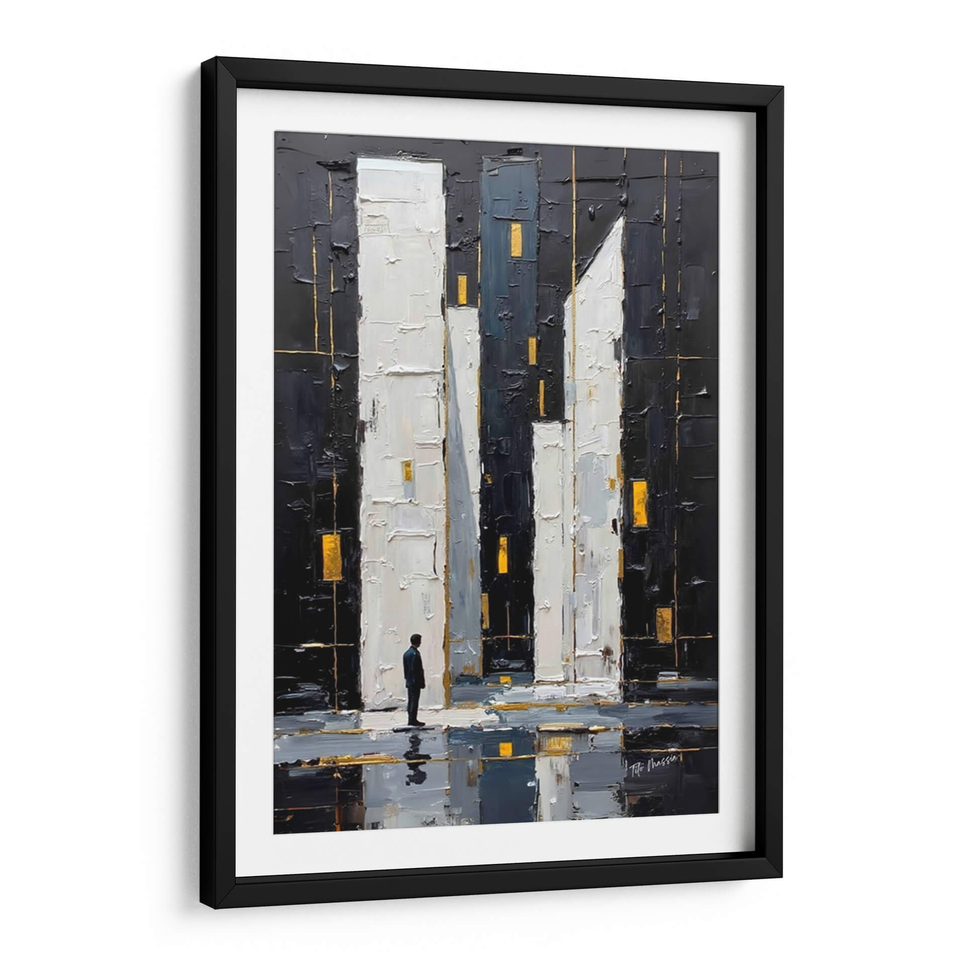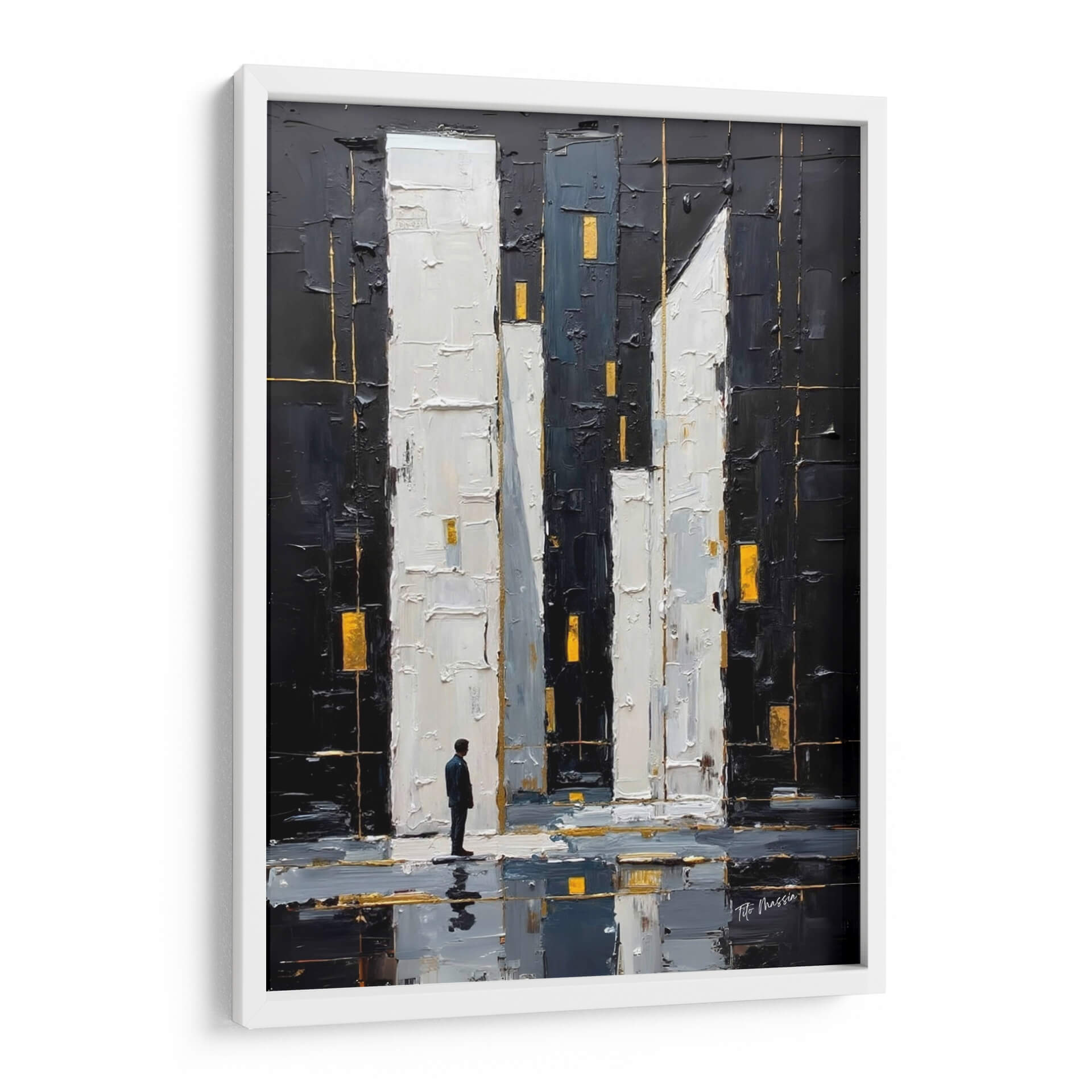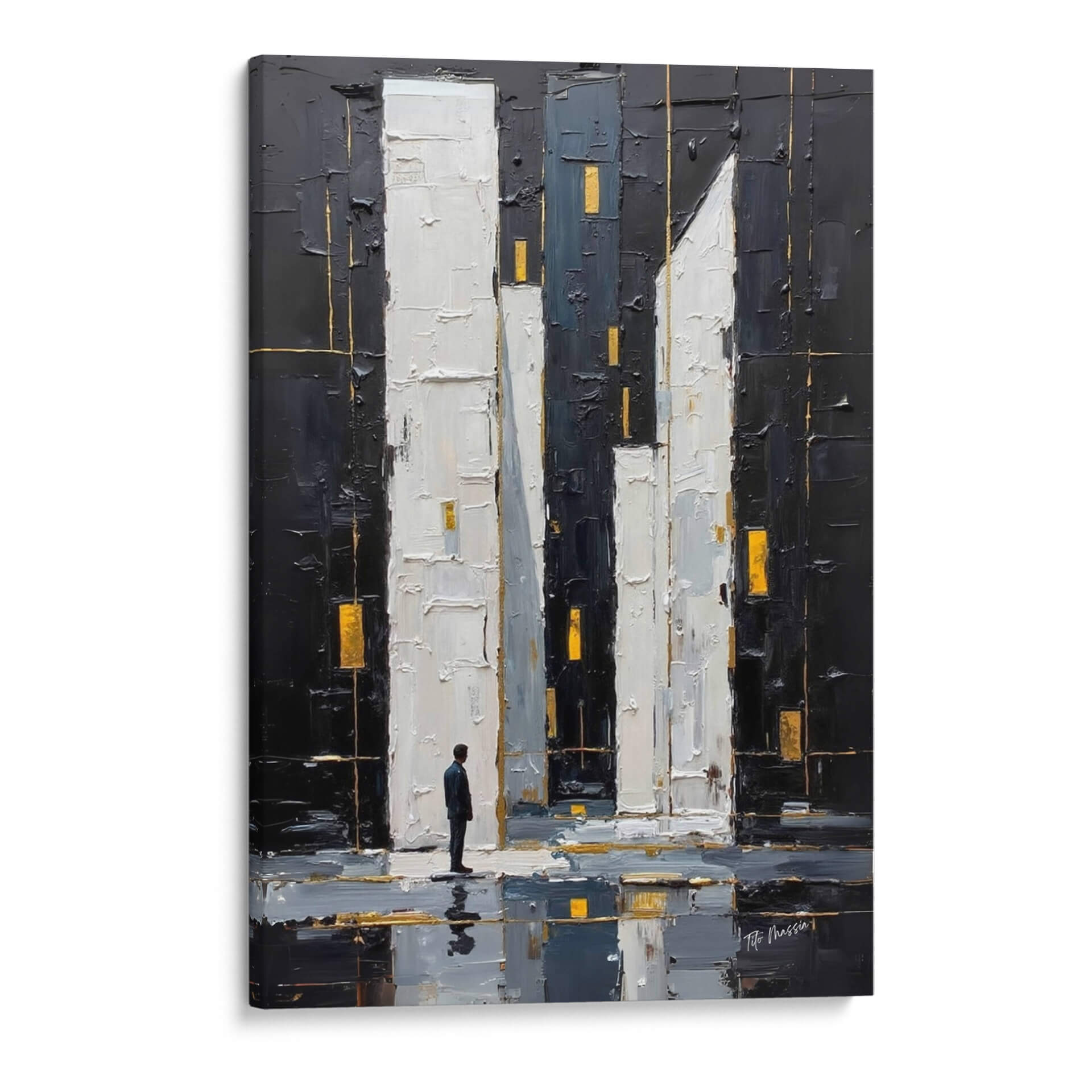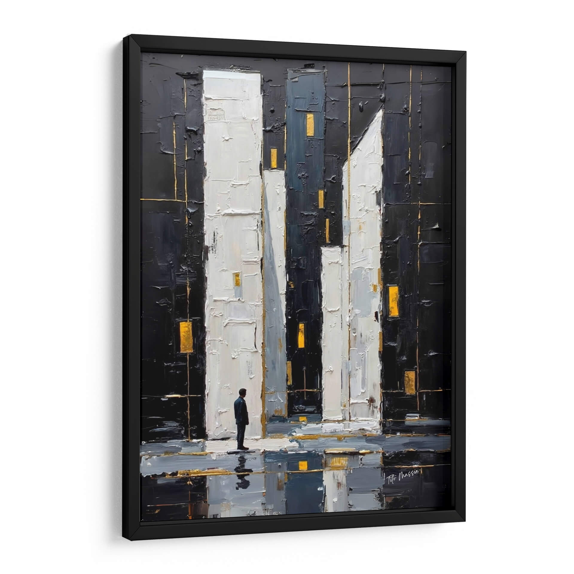 Sumérgete en la atmósfera urbana y reflexiva de "Soledad en la Metrópolis" de Tito Massia. Este impactante cuadro decorativo captura la esencia de la vida moderna a través de una composición audaz y una paleta de colores sofisticada. Las imponentes estructuras arquitectónicas, representadas con texturas ricas y trazos expresivos, se alzan contra un fondo de noche urbana, salpicado por destellos dorados que evocan las luces de la ciudad. Una figura solitaria en primer plano invita a la contemplación, generando una sensación de introspección y conexión personal en medio del bullicio. Los tonos predominantes de negro, blanco y gris, realzados por sutiles toques dorados, crean un contraste dramático y una elegancia atemporal. Ideal para espacios que buscan un toque de distinción y profundidad, como salones contemporáneos, estudios o incluso oficinas, este cuadro decorativo es una pieza que no solo embellece, sino que también invita a la conversación y a la reflexión sobre la experiencia humana en el entorno urbano. Añade un aire de misterio y sofisticación a tu hogar con esta obra maestra.