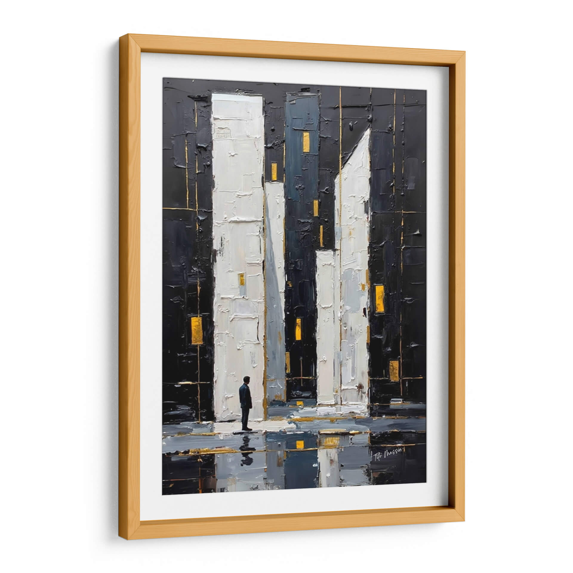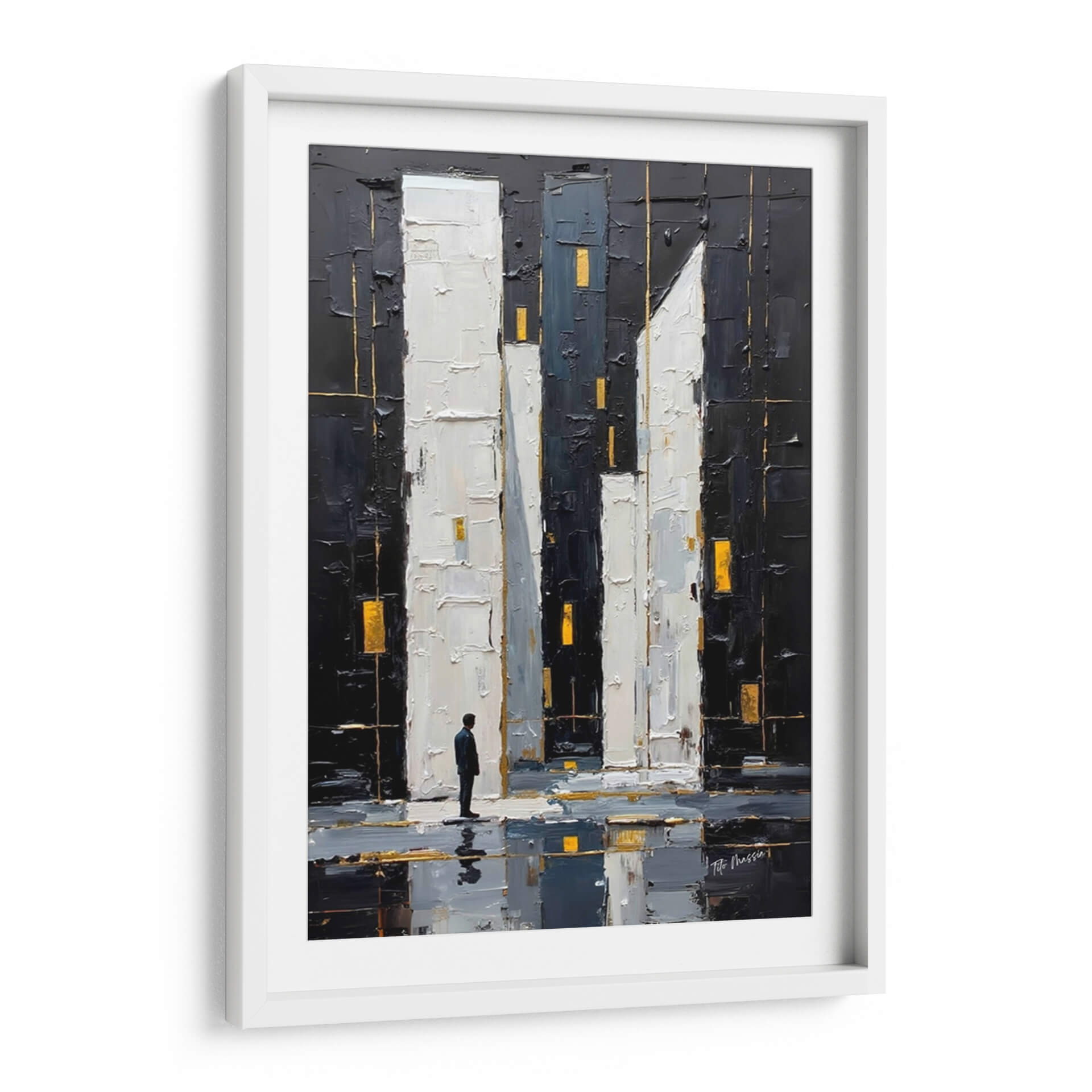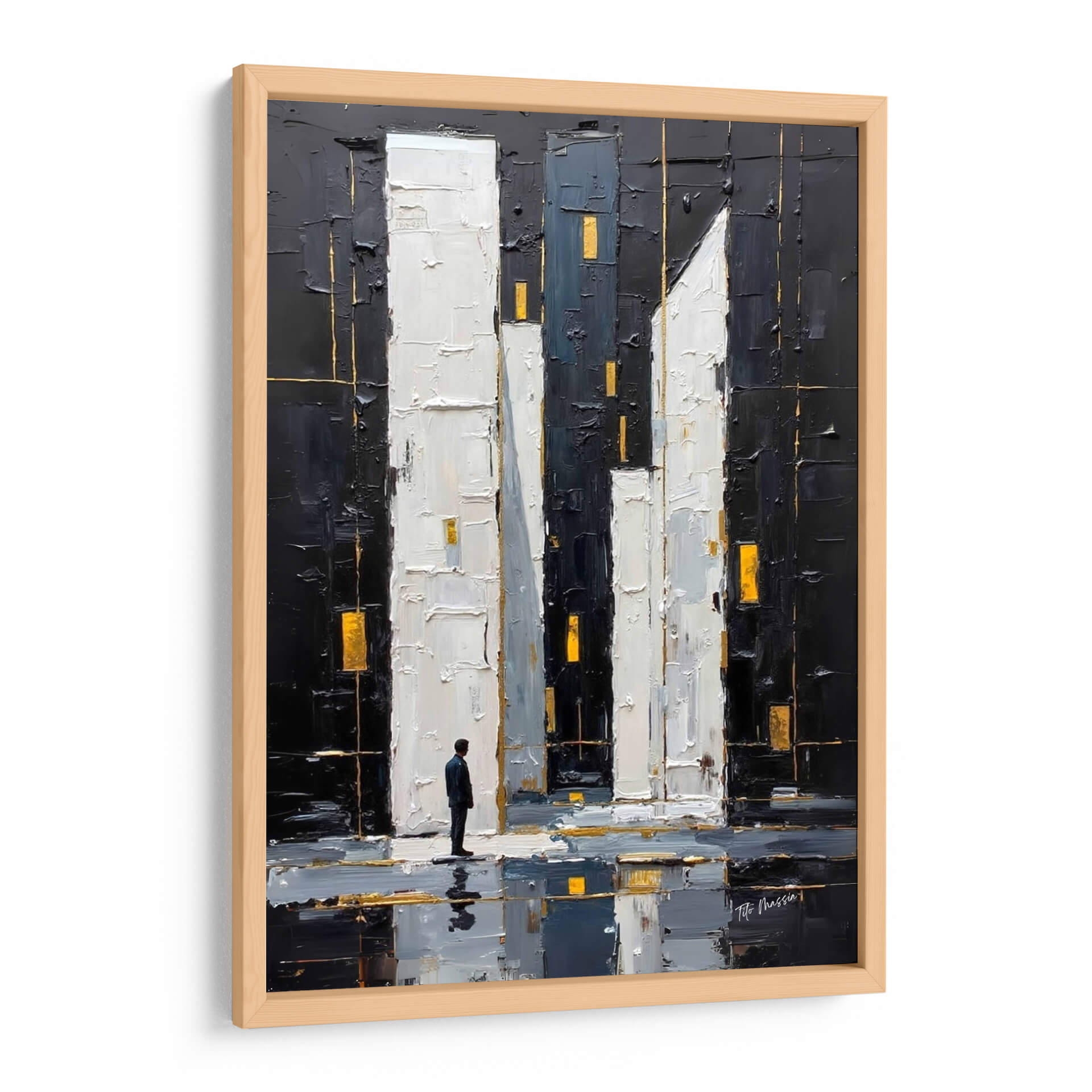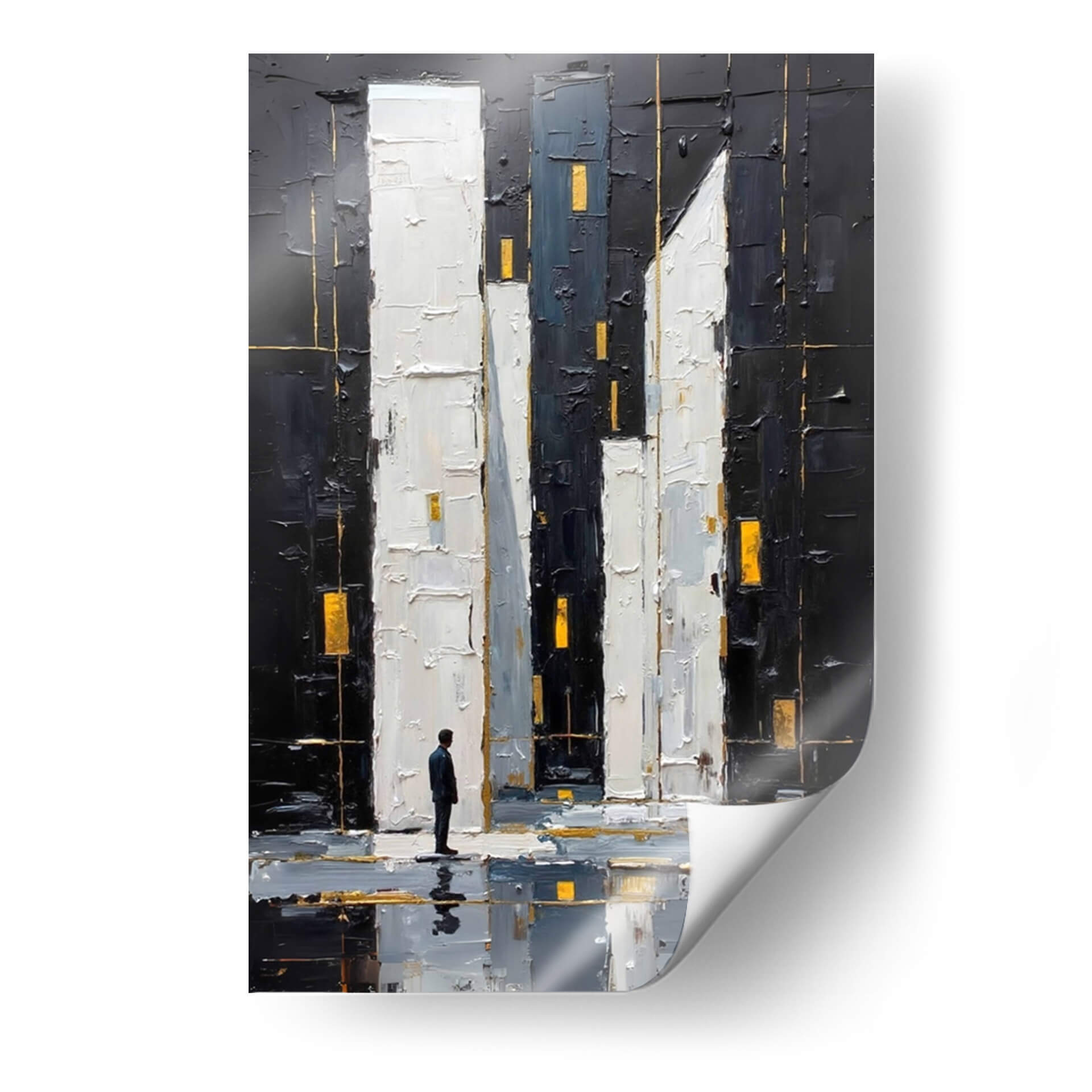 Sumérgete en la atmósfera urbana y reflexiva de "Soledad en la Metrópolis" de Tito Massia. Este impactante cuadro decorativo captura la esencia de la vida moderna a través de una composición audaz y una paleta de colores sofisticada. Las imponentes estructuras arquitectónicas, representadas con texturas ricas y trazos expresivos, se alzan contra un fondo de noche urbana, salpicado por destellos dorados que evocan las luces de la ciudad. Una figura solitaria en primer plano invita a la contemplación, generando una sensación de introspección y conexión personal en medio del bullicio. Los tonos predominantes de negro, blanco y gris, realzados por sutiles toques dorados, crean un contraste dramático y una elegancia atemporal. Ideal para espacios que buscan un toque de distinción y profundidad, como salones contemporáneos, estudios o incluso oficinas, este cuadro decorativo es una pieza que no solo embellece, sino que también invita a la conversación y a la reflexión sobre la experiencia humana en el entorno urbano. Añade un aire de misterio y sofisticación a tu hogar con esta obra maestra.