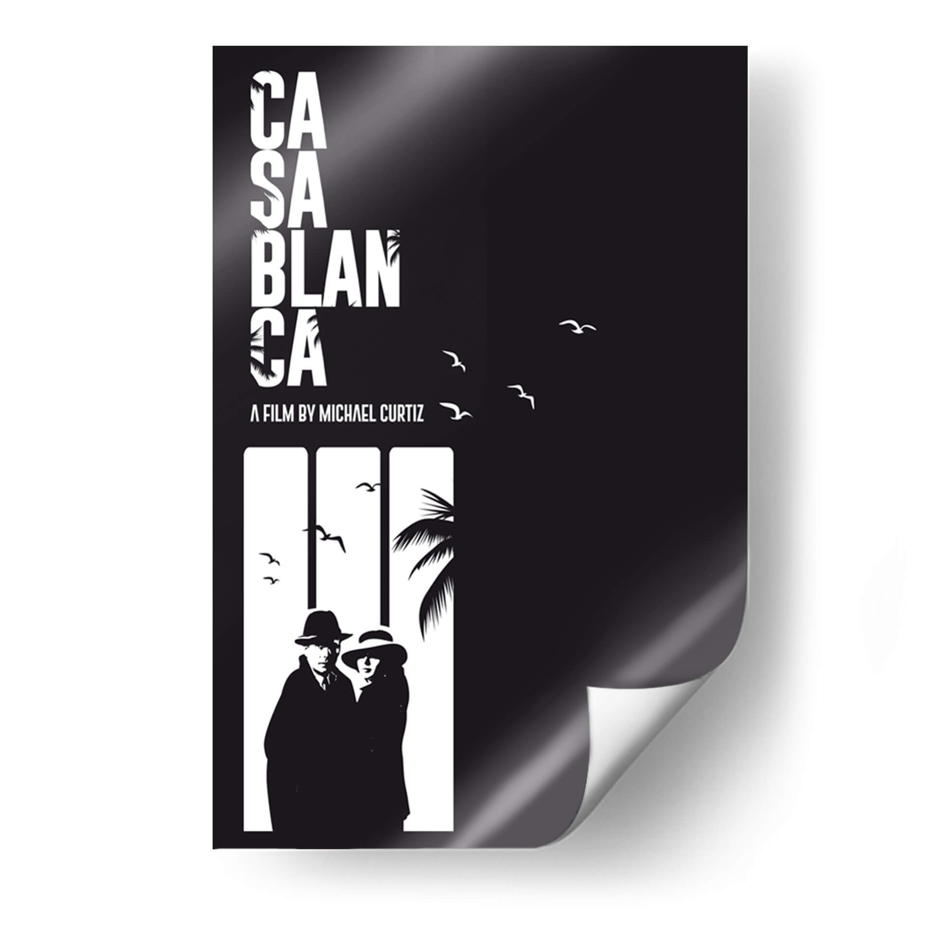 Transporta tu espacio a la época dorada de Hollywood con este cautivador cuadro decorativo inspirado en la icónica película 'Casablanca'. La obra presenta una audaz composición en blanco y negro, dominada por el texto estilizado del título y una silueta evocadora de una pareja bajo sombreros, sugiriendo un aire de misterio y romance clásico. Los sutiles detalles de palmeras y pájaros en vuelo añaden una dimensión cinematográfica, transportando al espectador a escenarios exóticos y tiempos pasados. Este diseño minimalista y de alto contraste, con su paleta monocromática, es perfecto para añadir un toque de sofisticación y nostalgia a cualquier habitación. Ideal para salones, estudios o incluso un bar en casa, este cuadro decorativo es una pieza de conversación que evoca la intriga y la elegancia atemporal de una obra maestra del cine. Su estilo gráfico lo convierte en un complemento versátil para decoraciones modernas, vintage o eclécticas, aportando un punto focal dramático y con carácter a tu pared.