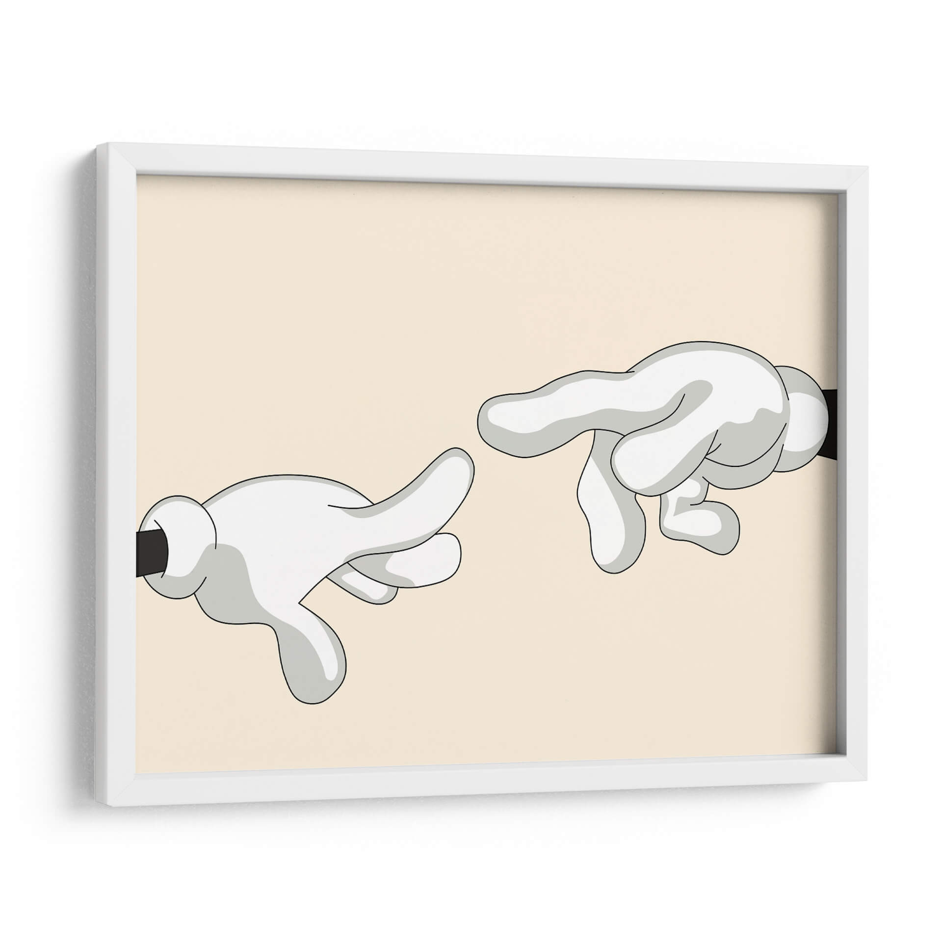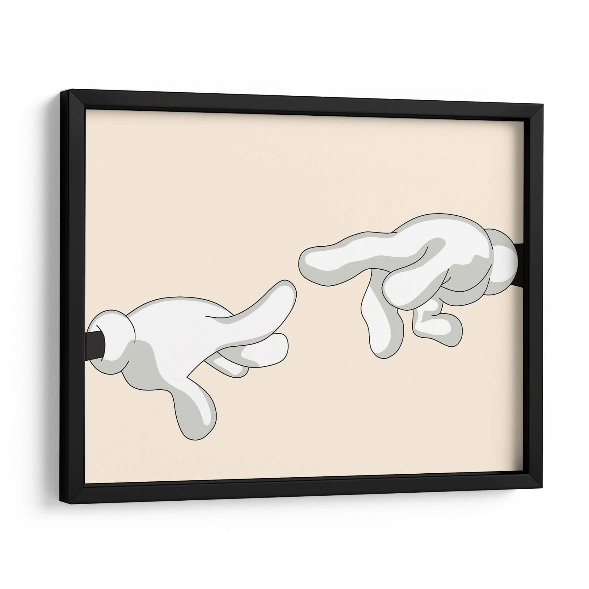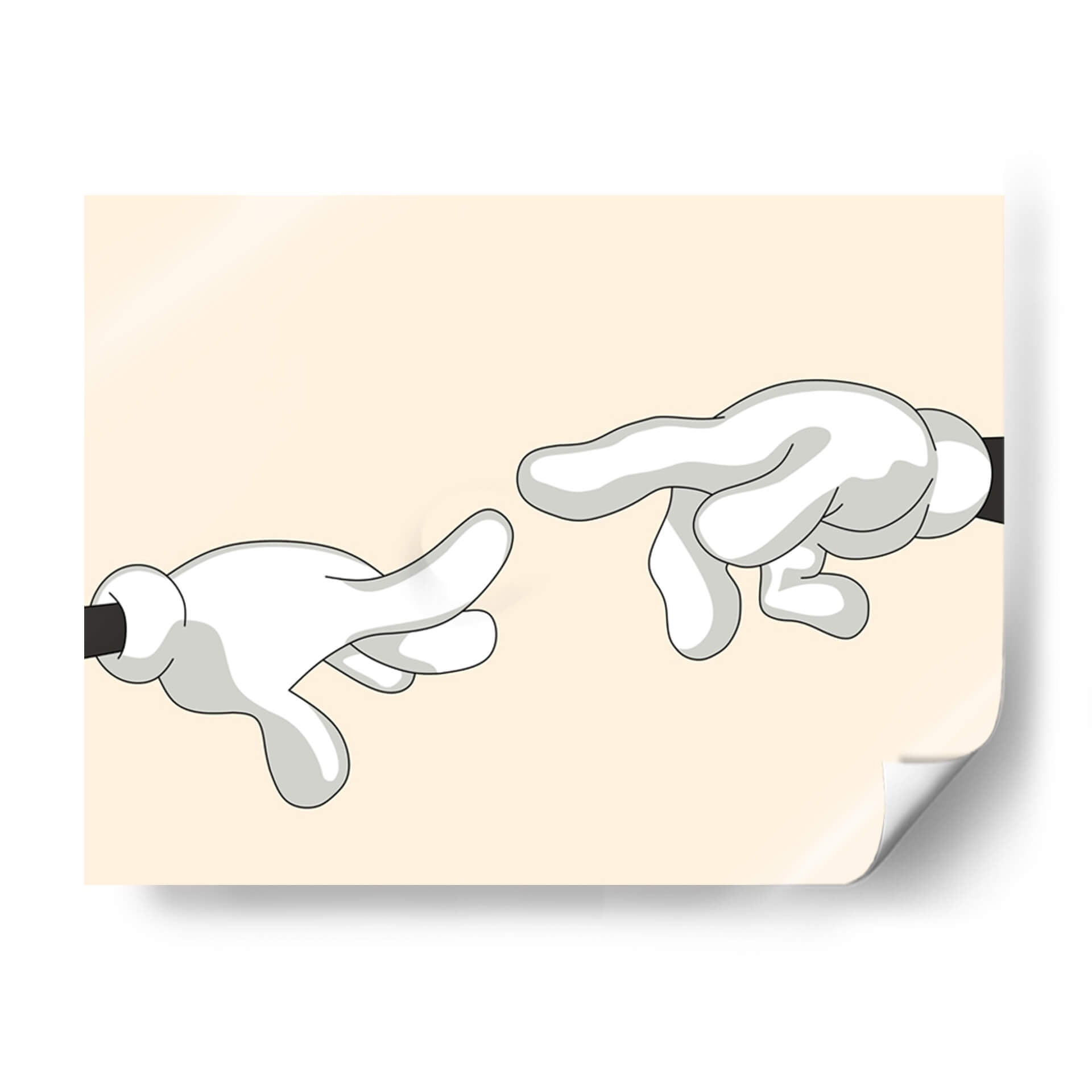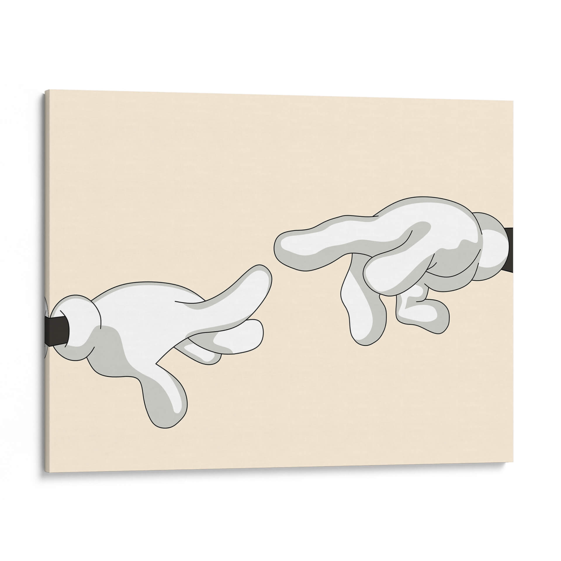 Explora la icónica "Creación de Adán" reimaginada por Khevth Art, una obra que evoca el icónico momento del renacimiento con un toque contemporáneo y lúdico. Este cuadro decorativo presenta una composición minimalista y audaz, donde dos manos enguantadas, con un estilo que recuerda a los dibujos animados clásicos, se extienden una hacia la otra. La paleta de colores, dominada por un suave tono beige de fondo y las figuras en blanco y gris con contornos negros definidos, crea una atmósfera serena y a la vez intrigante. La simplicidad de las formas y la referencia a una obra maestra universalmente reconocida hacen de esta pieza un punto focal cautivador para cualquier espacio. Perfecta para quienes buscan añadir un toque de arte con un guiño a la historia, esta obra es ideal para salas de estar modernas, estudios de diseño o incluso oficinas que deseen transmitir un mensaje sutil de conexión y creatividad. Su diseño limpio y contemporáneo asegura que complementará una variedad de estilos decorativos, desde el minimalista hasta el ecléctico, aportando carácter y conversación a tus paredes. Sumérgete en la reinterpretación de un clásico y dale vida a tu hogar con este singular cuadro decorativo de Khevth Art, una pieza que invita a la reflexión y al asombro.