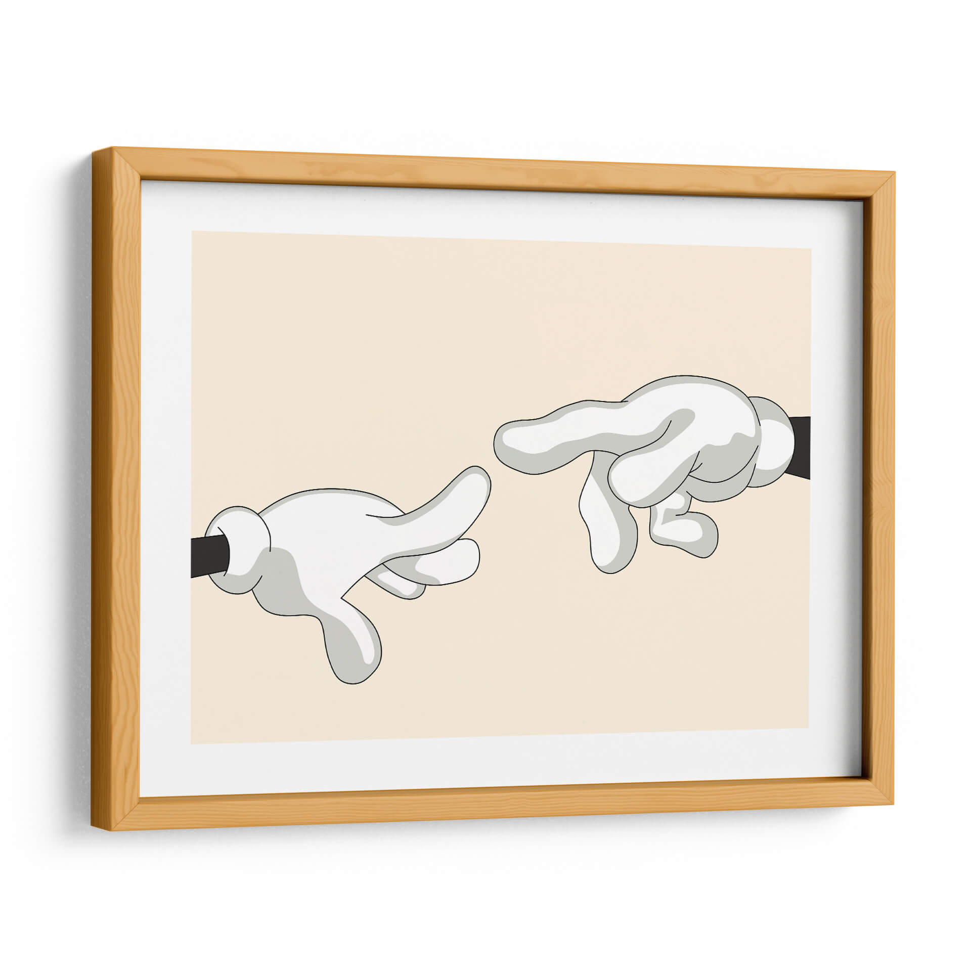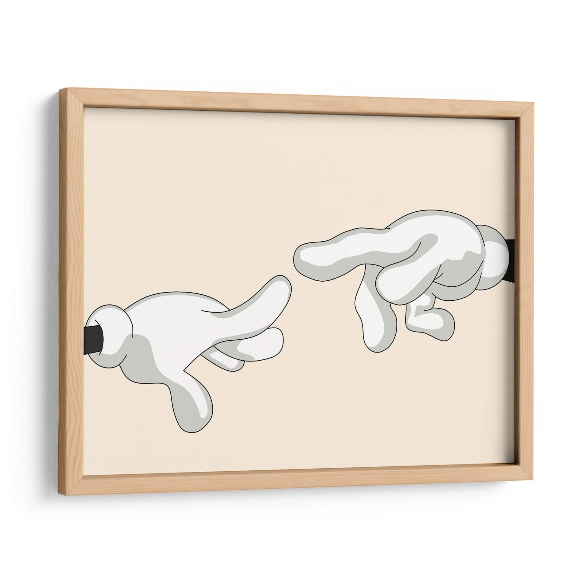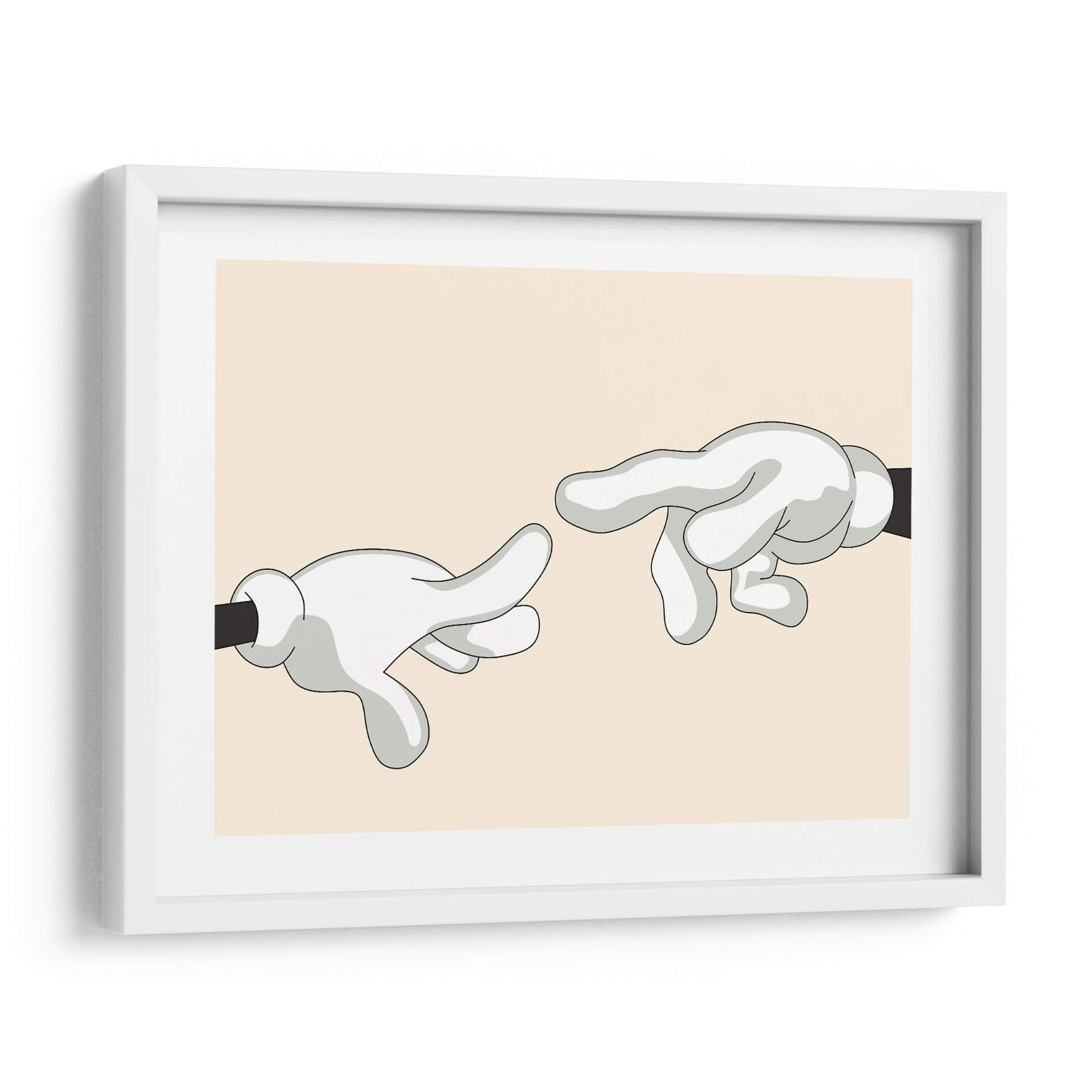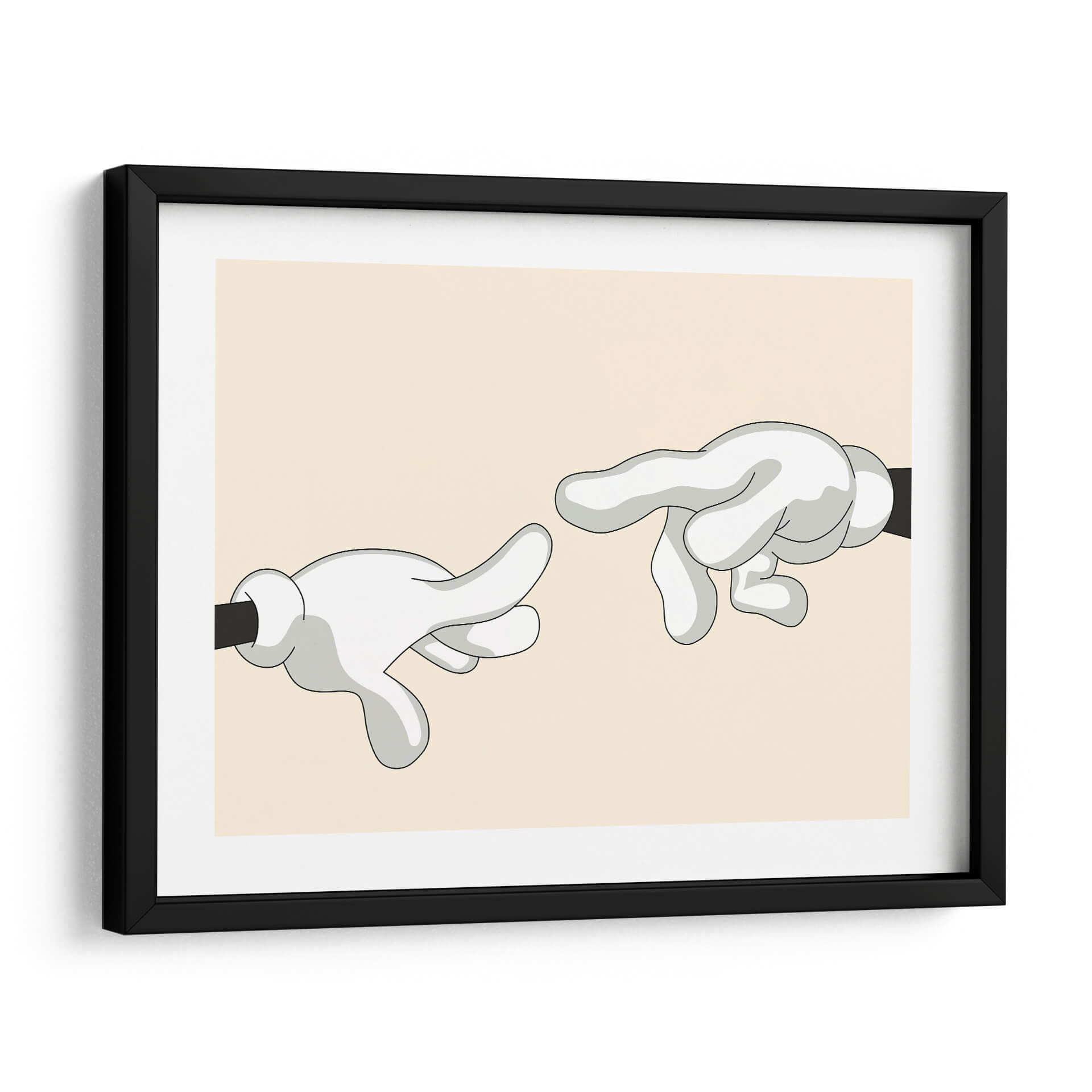 Explora la icónica "Creación de Adán" reimaginada por Khevth Art, una obra que evoca el icónico momento del renacimiento con un toque contemporáneo y lúdico. Este cuadro decorativo presenta una composición minimalista y audaz, donde dos manos enguantadas, con un estilo que recuerda a los dibujos animados clásicos, se extienden una hacia la otra. La paleta de colores, dominada por un suave tono beige de fondo y las figuras en blanco y gris con contornos negros definidos, crea una atmósfera serena y a la vez intrigante. La simplicidad de las formas y la referencia a una obra maestra universalmente reconocida hacen de esta pieza un punto focal cautivador para cualquier espacio. Perfecta para quienes buscan añadir un toque de arte con un guiño a la historia, esta obra es ideal para salas de estar modernas, estudios de diseño o incluso oficinas que deseen transmitir un mensaje sutil de conexión y creatividad. Su diseño limpio y contemporáneo asegura que complementará una variedad de estilos decorativos, desde el minimalista hasta el ecléctico, aportando carácter y conversación a tus paredes. Sumérgete en la reinterpretación de un clásico y dale vida a tu hogar con este singular cuadro decorativo de Khevth Art, una pieza que invita a la reflexión y al asombro.