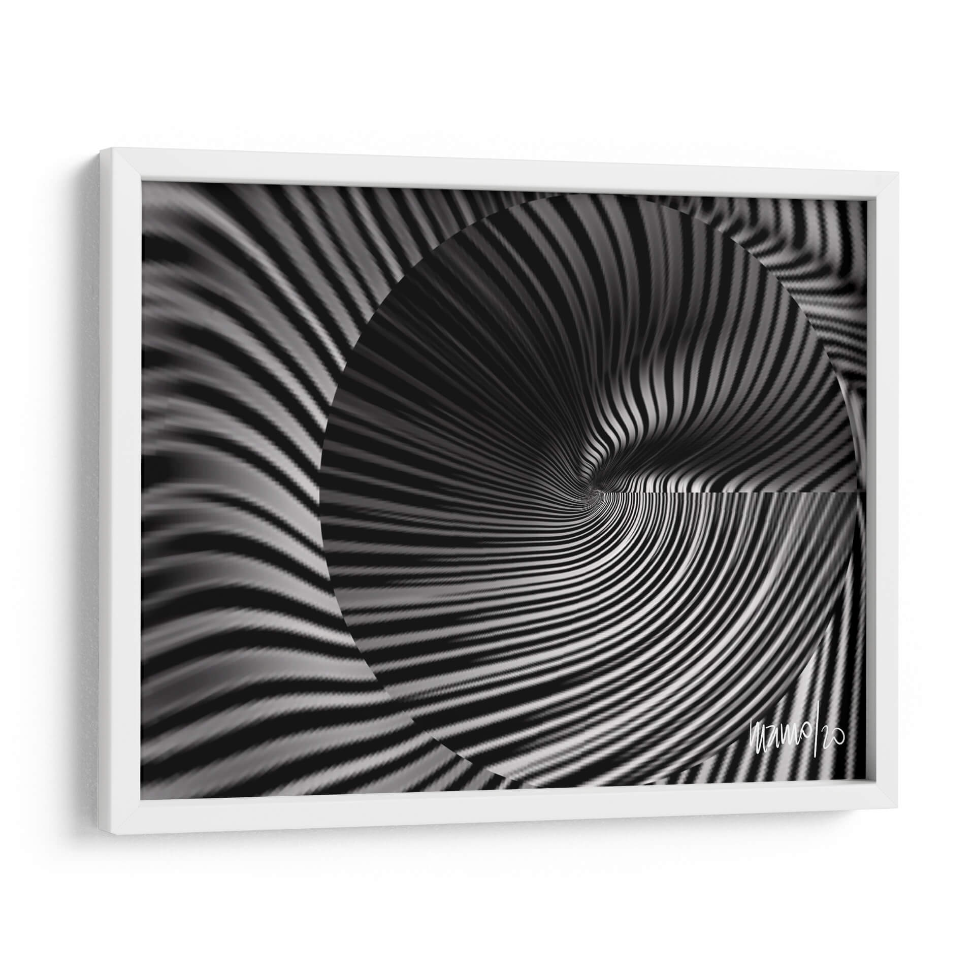 Sumérgete en la profundidad hipnótica de "Diorita 3 H", una obra de arte contemporáneo de Gina Villalobos que desafía la percepción. Este cuadro decorativo abstracto presenta un fascinante juego de líneas y curvas en una paleta monocromática de blancos, negros y grises, creando un vórtice visual que atrae la mirada hacia su centro. La composición dinámica evoca una sensación de movimiento y transformación, ideal para espacios que buscan un toque de intriga y sofisticación moderna. La sutileza de los degradados y la precisión de las formas sugieren una técnica depurada, capaz de generar efectos ópticos cautivadores. "Diorita 3 H" es más que una simple decoración; es una invitación a explorar la abstracción y a añadir una dimensión de energía controlada a tu hogar u oficina. Su diseño versátil encaja perfectamente en ambientes minimalistas, modernos o eclécticos, aportando un punto focal único y una atmósfera de pensamiento profundo. Transforma tus paredes con este impactante lienzo que fusiona la elegancia atemporal con la audacia contemporánea, creando un diálogo visual que cautivará a tus invitados.