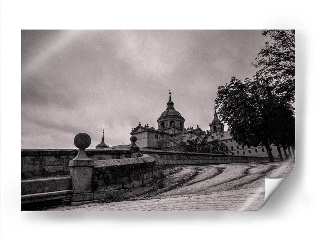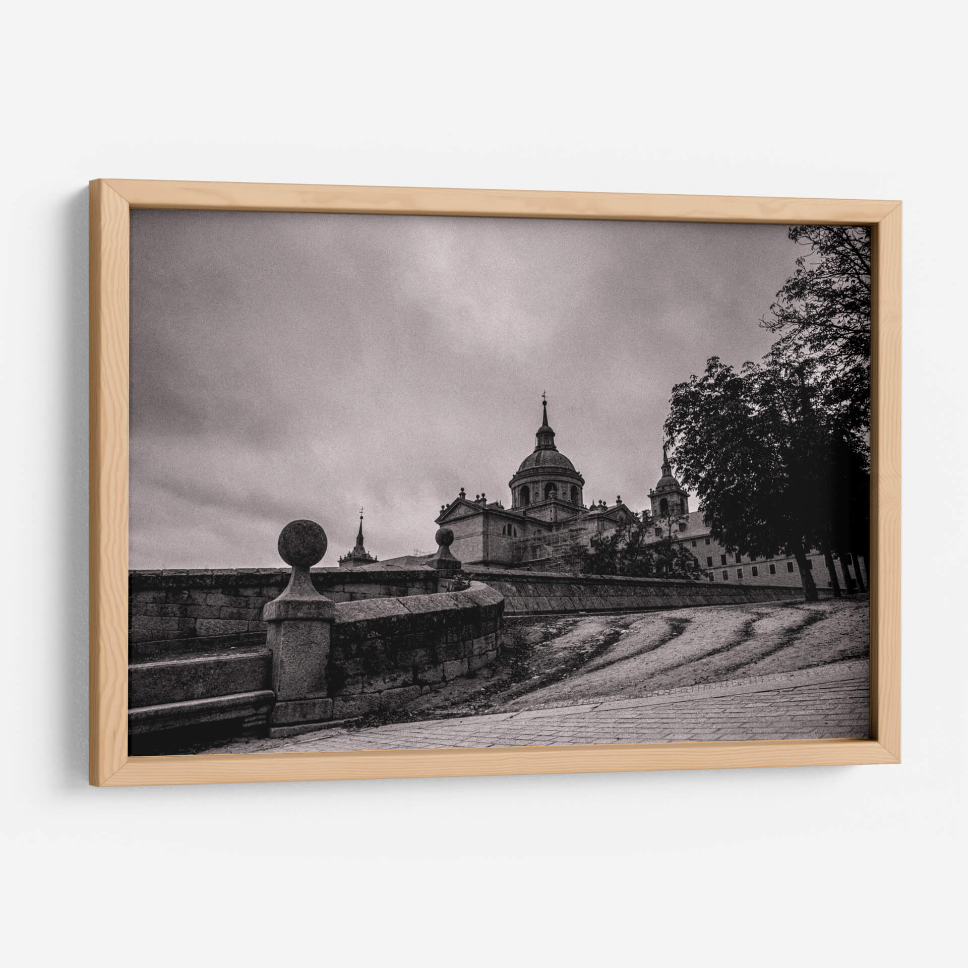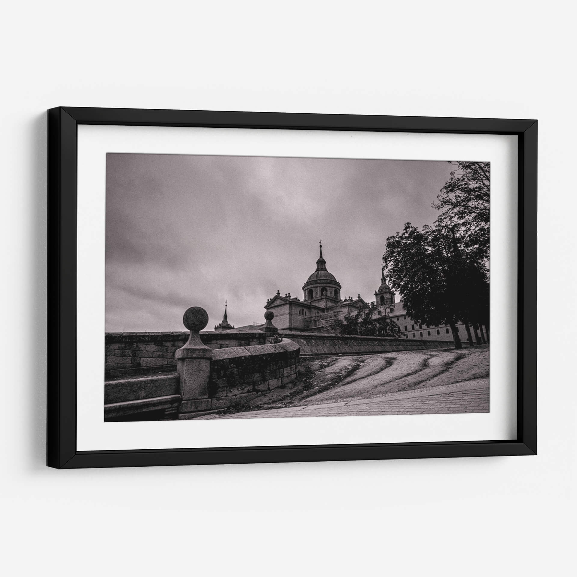 Sumérgete en la majestuosidad arquitectónica de 'El Escorial III', una obra del artista Jaime López Portillo que captura la grandeza y el misterio de un icónico edificio histórico. Esta fotografía en blanco y negro, con su atmósfera sombría y dramática, transporta al espectador a un viaje a través del tiempo y la historia. La imponente cúpula, los detalles intrincados de la fachada y la textura de los muros de piedra se realzan a través de la ausencia de color, creando un juego de luces y sombras que añade profundidad y carácter. La composición, con la perspectiva ascendente hacia el edificio y los árboles robustos en primer plano, genera una sensación de escala y monumentalidad. Ideal para quienes buscan añadir un toque de elegancia atemporal y un punto de reflexión a su hogar u oficina, este cuadro decorativo es perfecto para espacios que valoran la historia, la arquitectura y el arte con carácter. Transforma cualquier pared en una ventana a la historia con esta poderosa imagen.