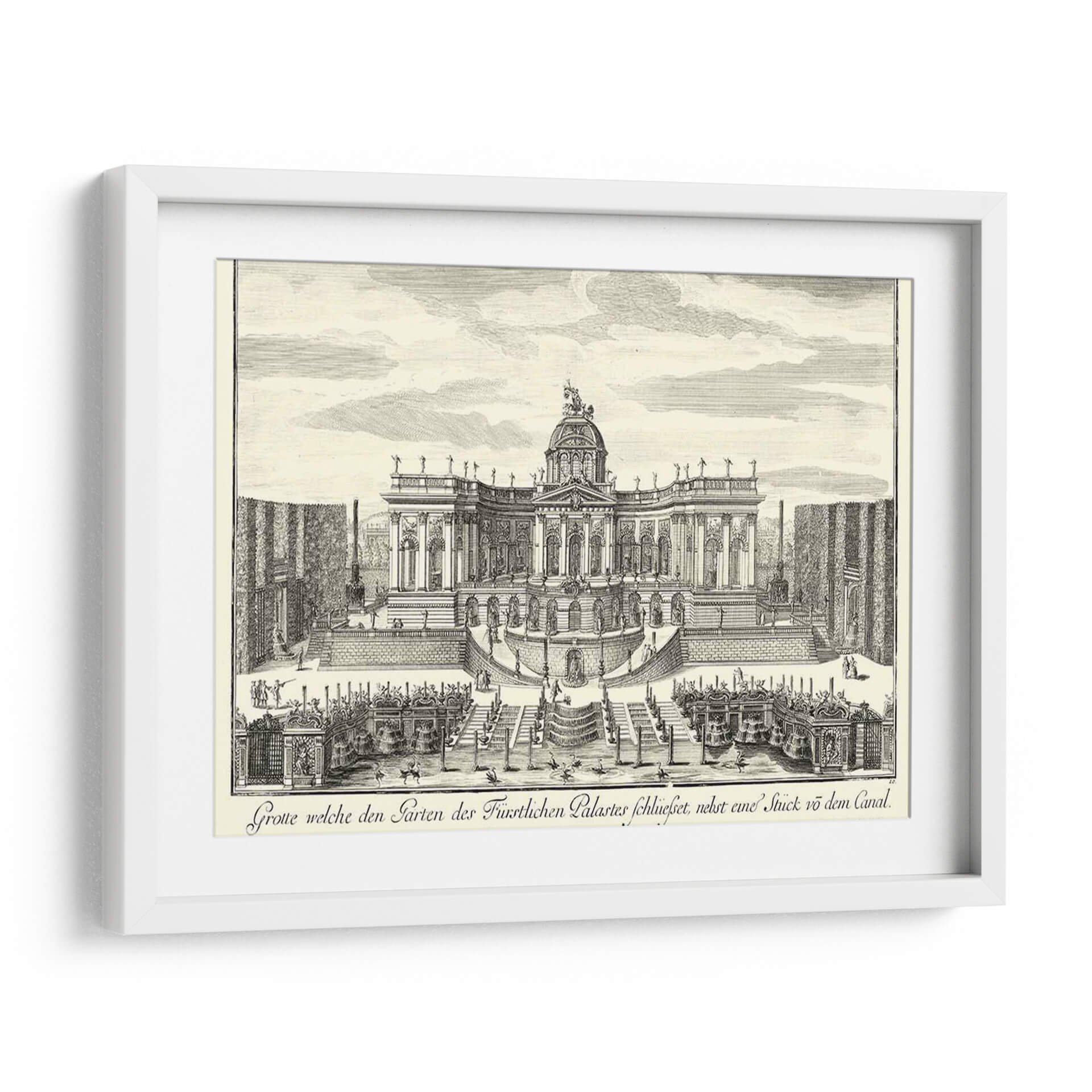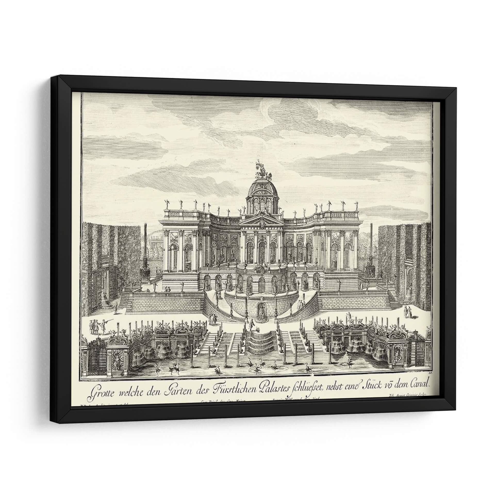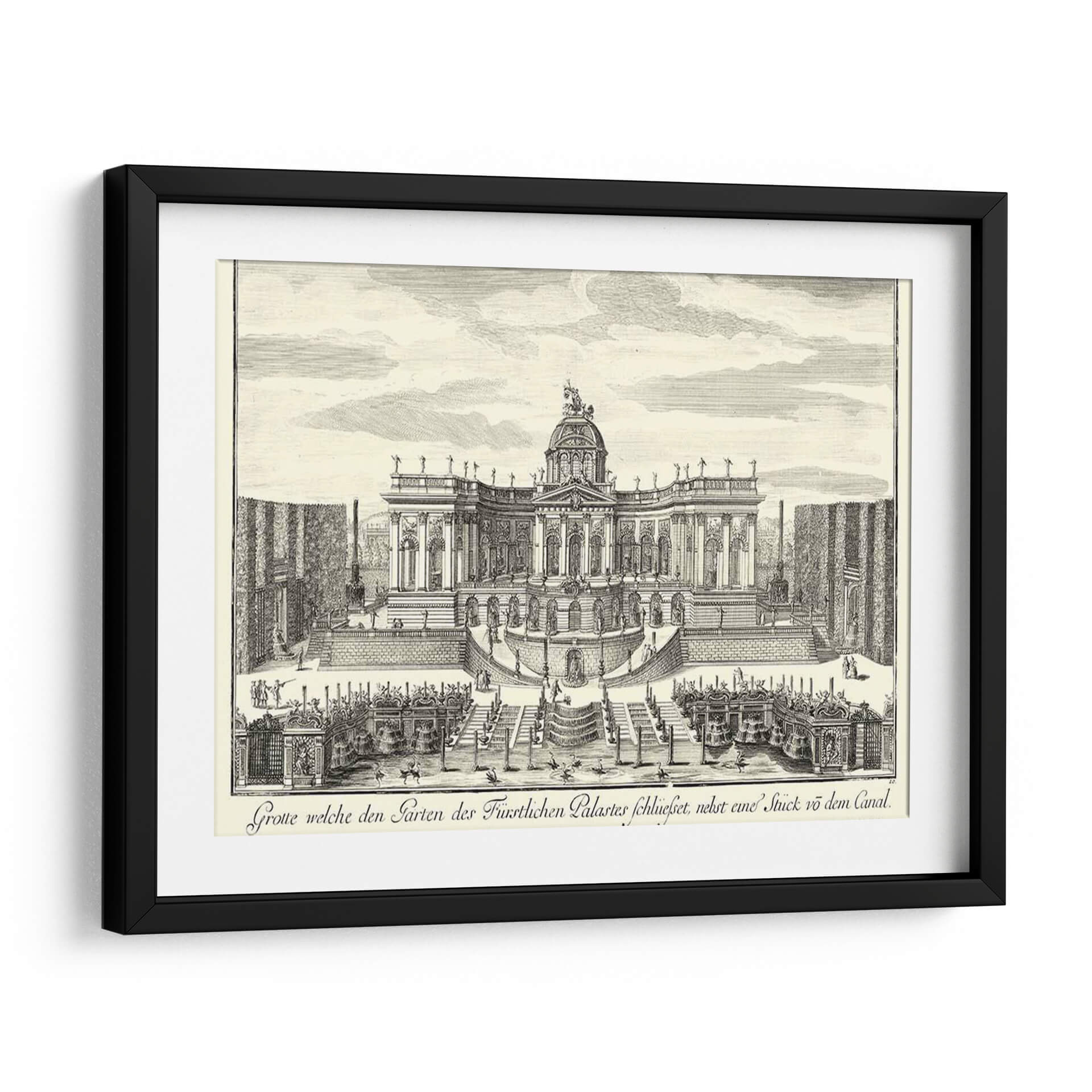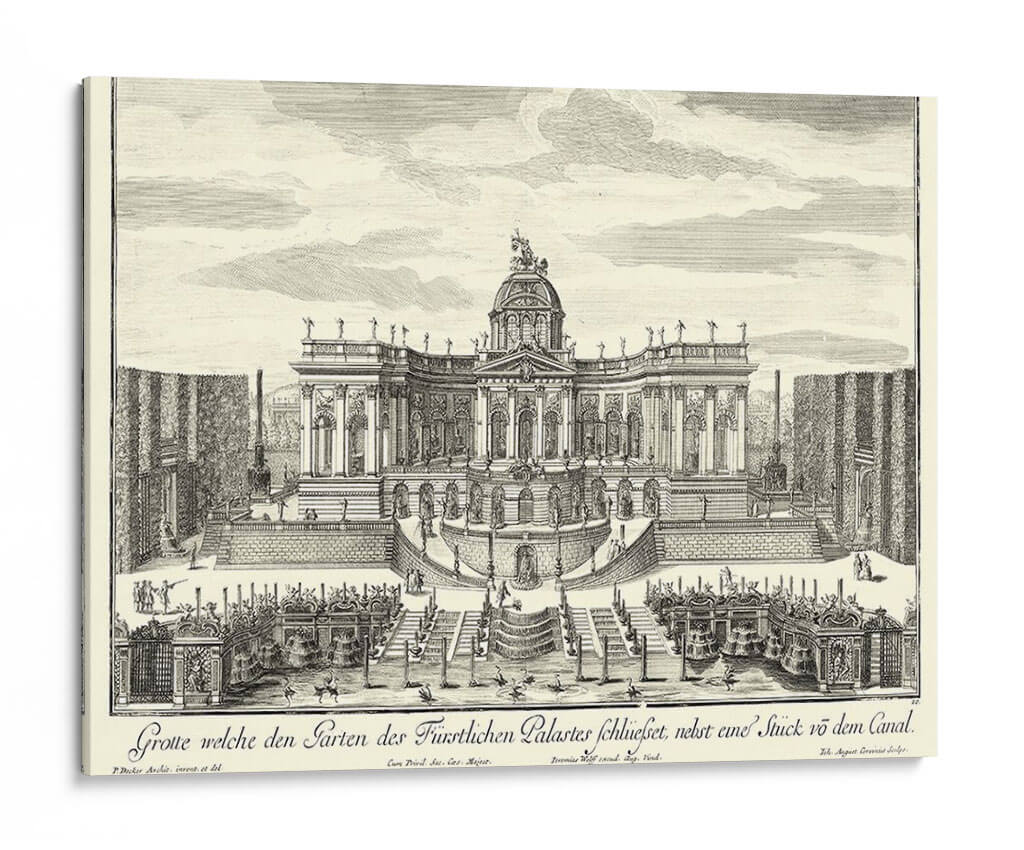 Sumérgete en la grandiosidad arquitectónica y el encanto histórico con este exquisito cuadro decorativo, una recreación detallada de 'Fuentes De Versalles Iv' por Decker. Esta obra transporta al espectador a un jardín barroco exuberante, dominado por una imponente fachada palaciega adornada con cúpulas, estatuas y una simetría majestuosa. Las intrincadas escalinatas, las parterres geométricos y las elegantes fuentes crean una escena de opulencia y orden, invitando a la contemplación de la magnificencia de épocas pasadas. La técnica de grabado, con sus líneas finas y sombreados precisos, aporta una profundidad y textura únicas a la composición, realzando la atmósfera de solemnidad y belleza clásica. Ideal para quienes buscan infundir sus espacios con un aire de sofisticación atemporal, este cuadro es perfecto para salones, estudios o comedores que desean un punto focal de elegancia histórica y refinamiento artístico. Añade un toque de grandeza palaciega a tu decoración y déjate cautivar por el detalle y la atmósfera de esta pieza inspiradora. Es una elección excepcional para coleccionistas y amantes del arte que aprecian la arquitectura histórica y la maestría del grabado.