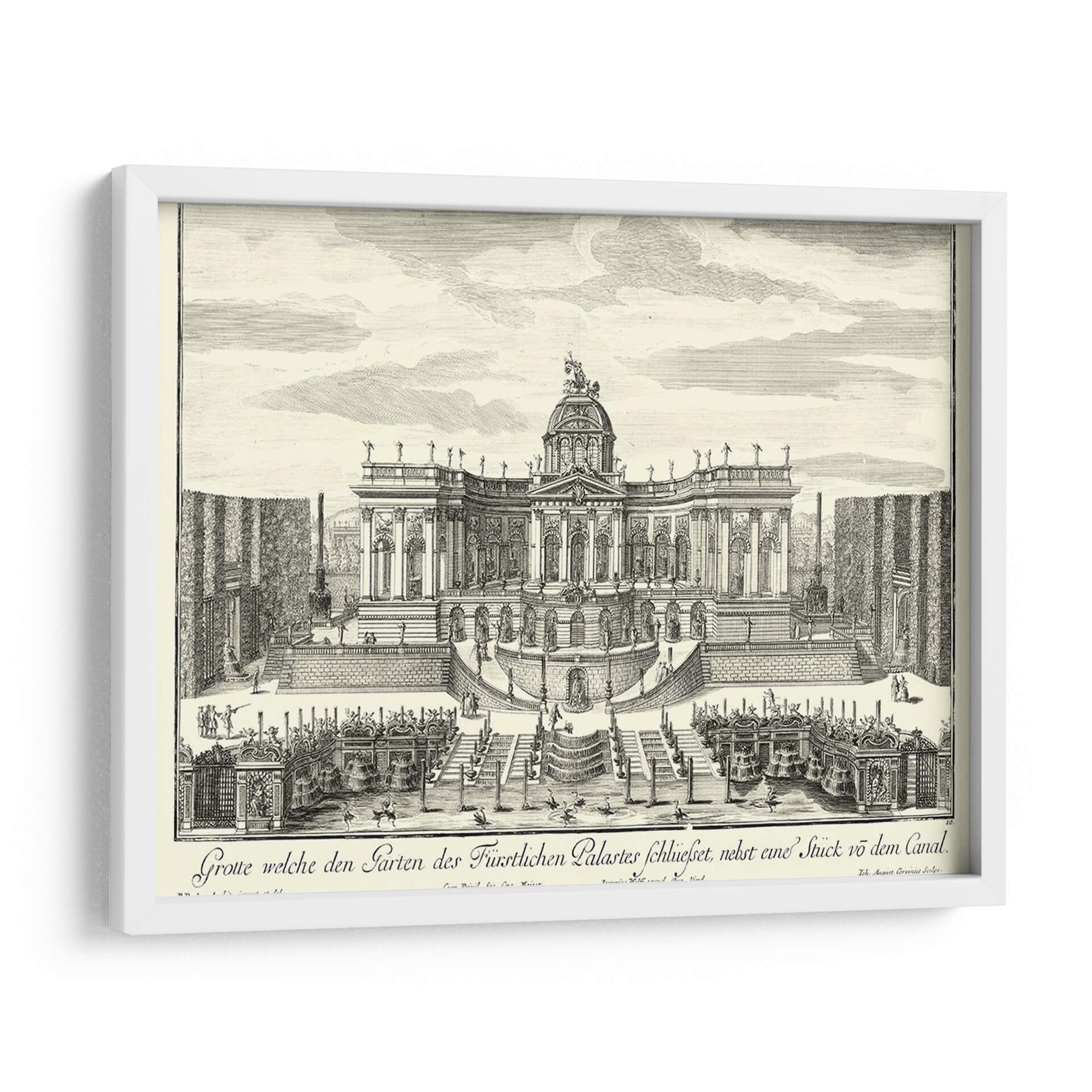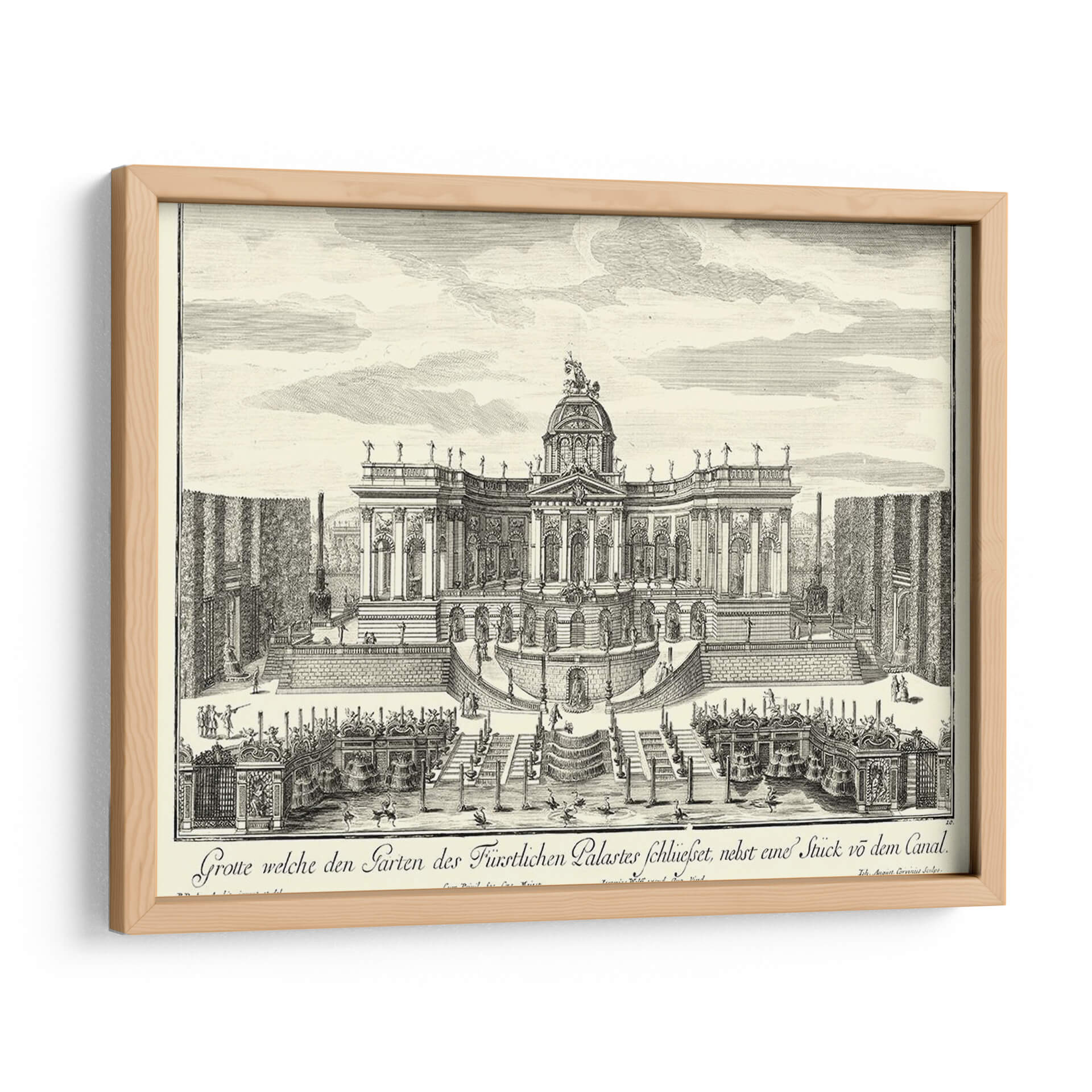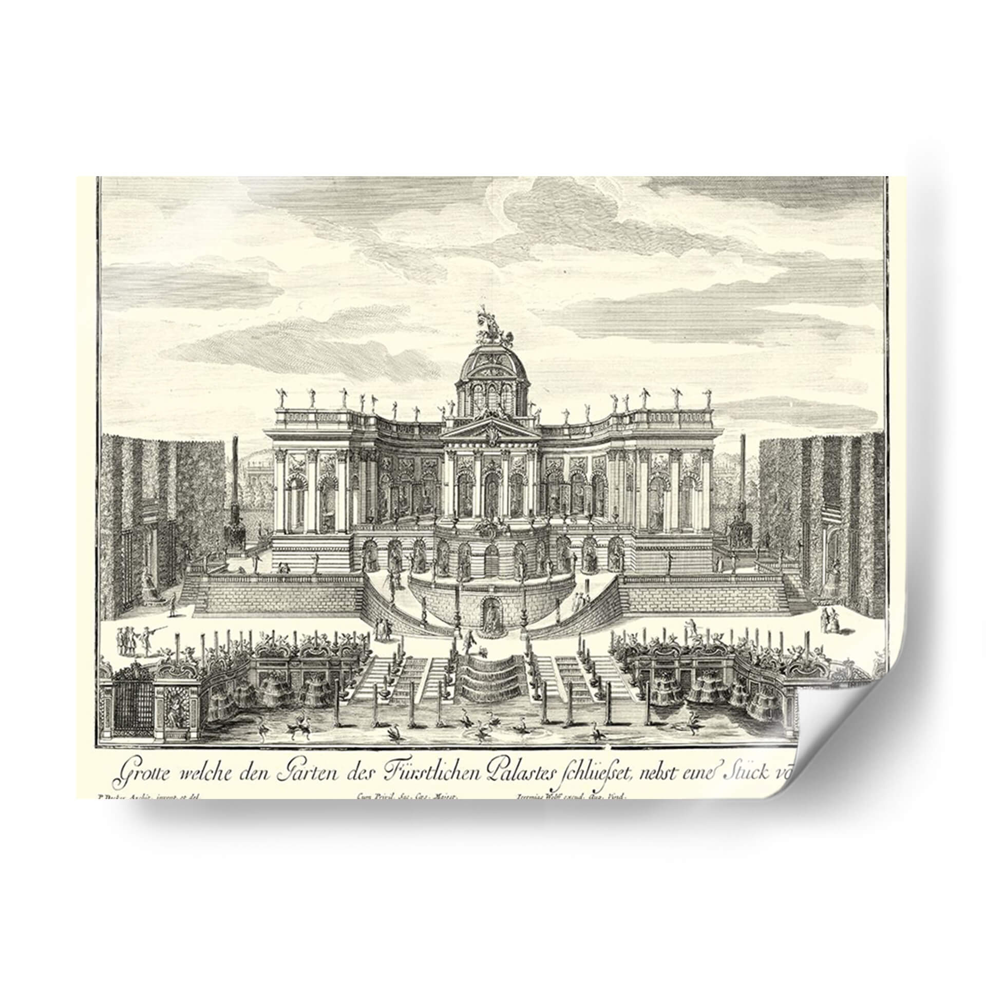 Sumérgete en la grandiosidad arquitectónica y el encanto histórico con este exquisito cuadro decorativo, una recreación detallada de 'Fuentes De Versalles Iv' por Decker. Esta obra transporta al espectador a un jardín barroco exuberante, dominado por una imponente fachada palaciega adornada con cúpulas, estatuas y una simetría majestuosa. Las intrincadas escalinatas, las parterres geométricos y las elegantes fuentes crean una escena de opulencia y orden, invitando a la contemplación de la magnificencia de épocas pasadas. La técnica de grabado, con sus líneas finas y sombreados precisos, aporta una profundidad y textura únicas a la composición, realzando la atmósfera de solemnidad y belleza clásica. Ideal para quienes buscan infundir sus espacios con un aire de sofisticación atemporal, este cuadro es perfecto para salones, estudios o comedores que desean un punto focal de elegancia histórica y refinamiento artístico. Añade un toque de grandeza palaciega a tu decoración y déjate cautivar por el detalle y la atmósfera de esta pieza inspiradora. Es una elección excepcional para coleccionistas y amantes del arte que aprecian la arquitectura histórica y la maestría del grabado.