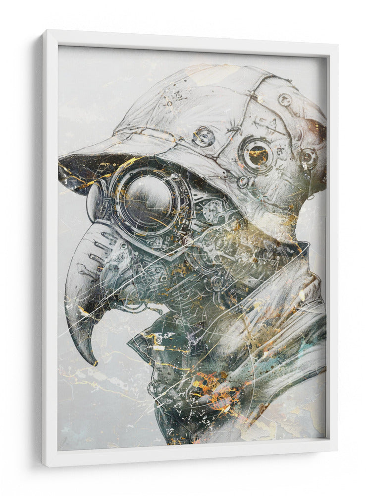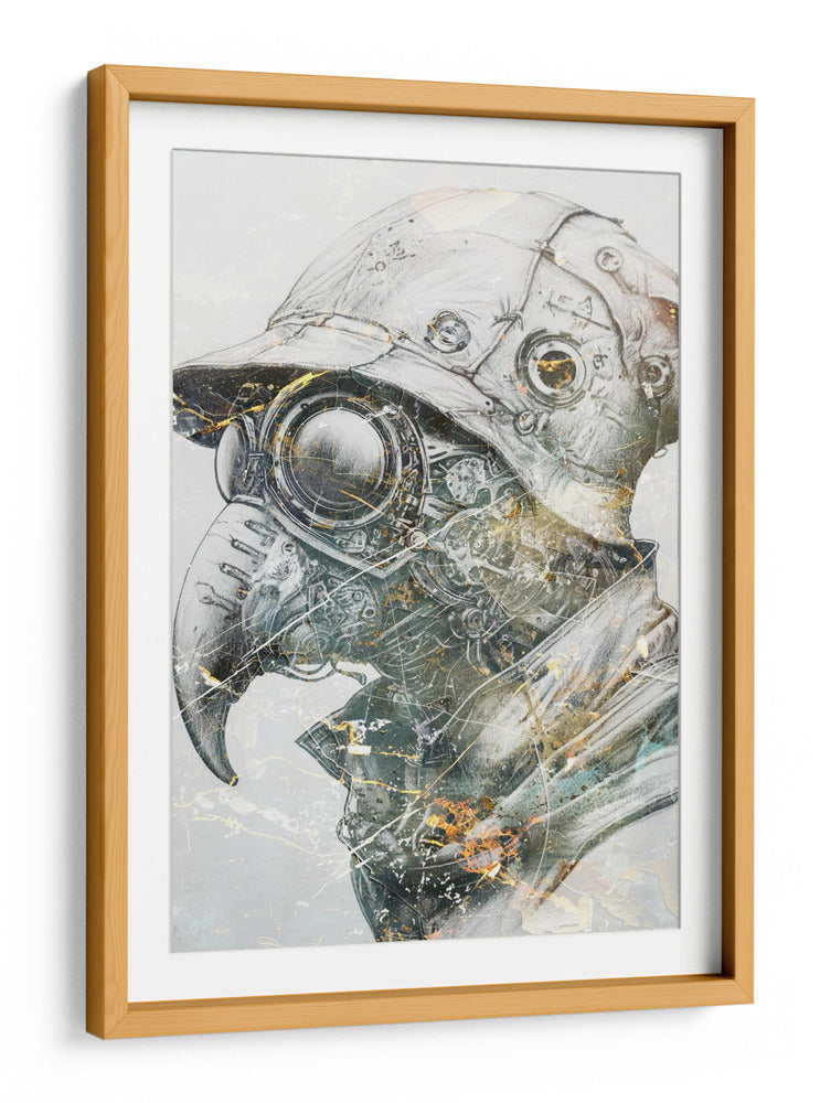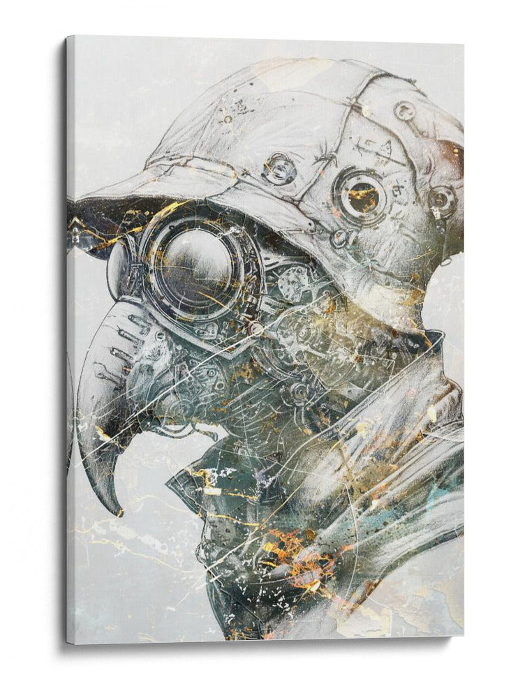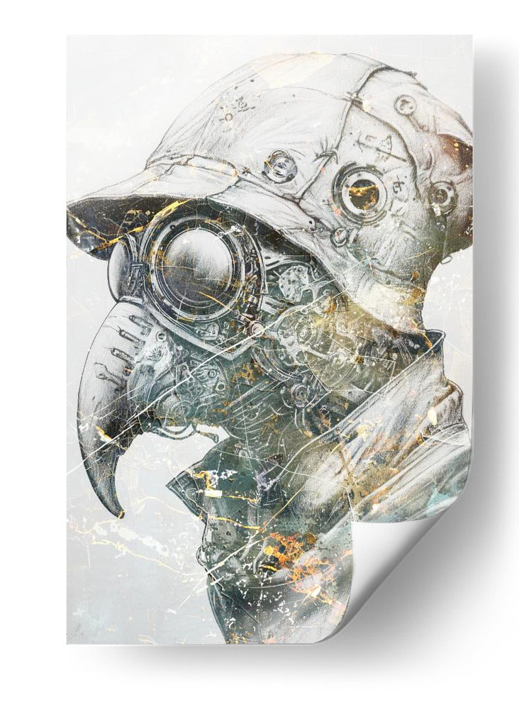 Sumérgete en el enigmático mundo del arte con esta impactante ilustración de calavera, obra del talentoso artista Rafal Kulik. Esta pieza, que fusiona elementos de dibujo detallado con una estética surrealista y steampunk, presenta una calavera ataviada con un casco de aviador o explorador, gafas de buceo y un pico prominente, evocando la figura histórica del doctor de la peste, pero reinterpretada con un giro contemporáneo y audaz. La paleta de colores se centra en grises, negros y toques de dorado y ocre, creando una atmósfera sombría pero intrigante. Las texturas rasgadas y los detalles mecánicos añaden profundidad y un aire industrial-vintage, perfecto para espacios que buscan un toque de originalidad y misterio. Este cuadro decorativo es ideal para salones modernos, estudios o cualquier rincón que desee destacar con una pieza de arte que incite a la conversación y despierte la imaginación. Su composición detallada y su temática única la convierten en un punto focal inconfundible que resuena con personalidades audaces y amantes del arte alternativo.