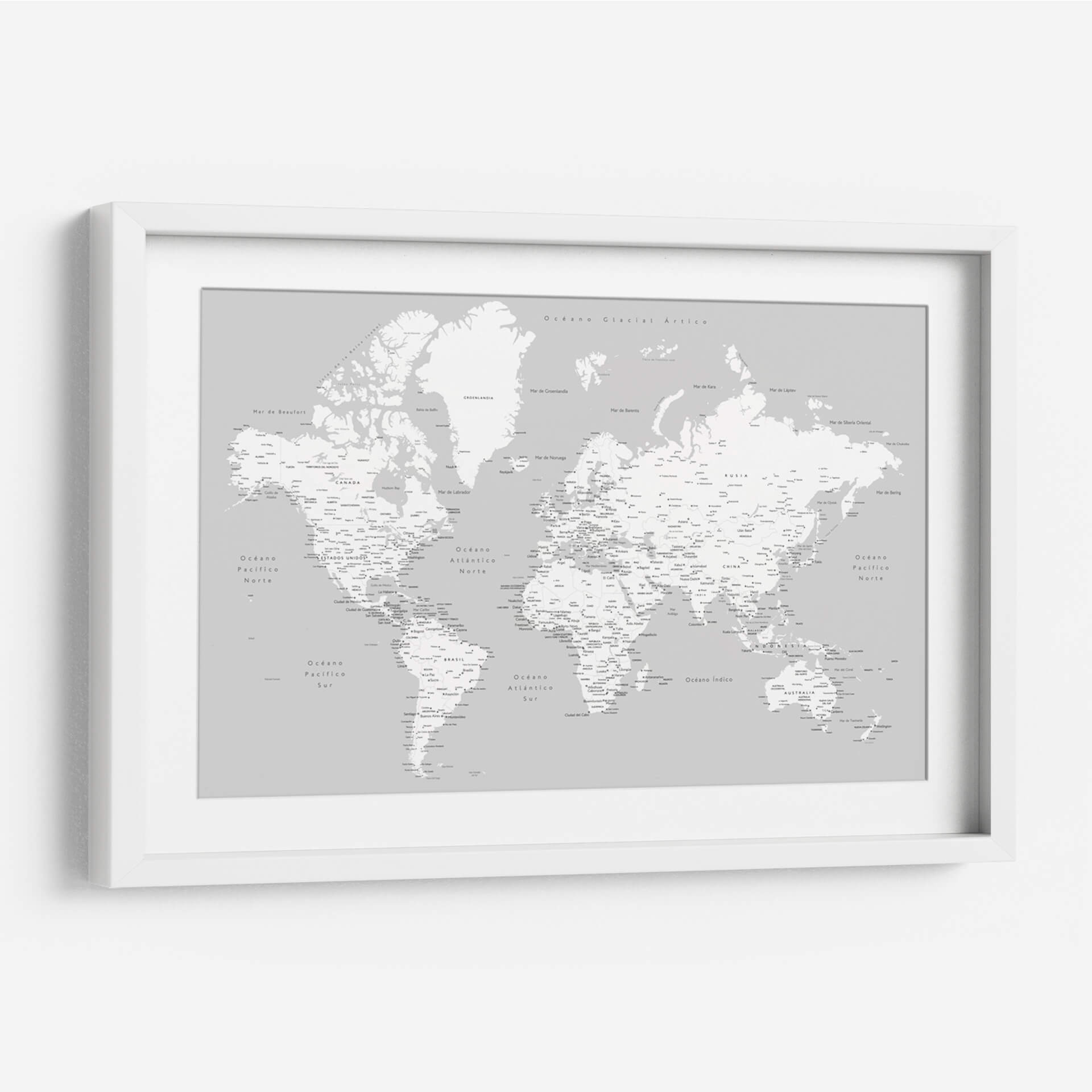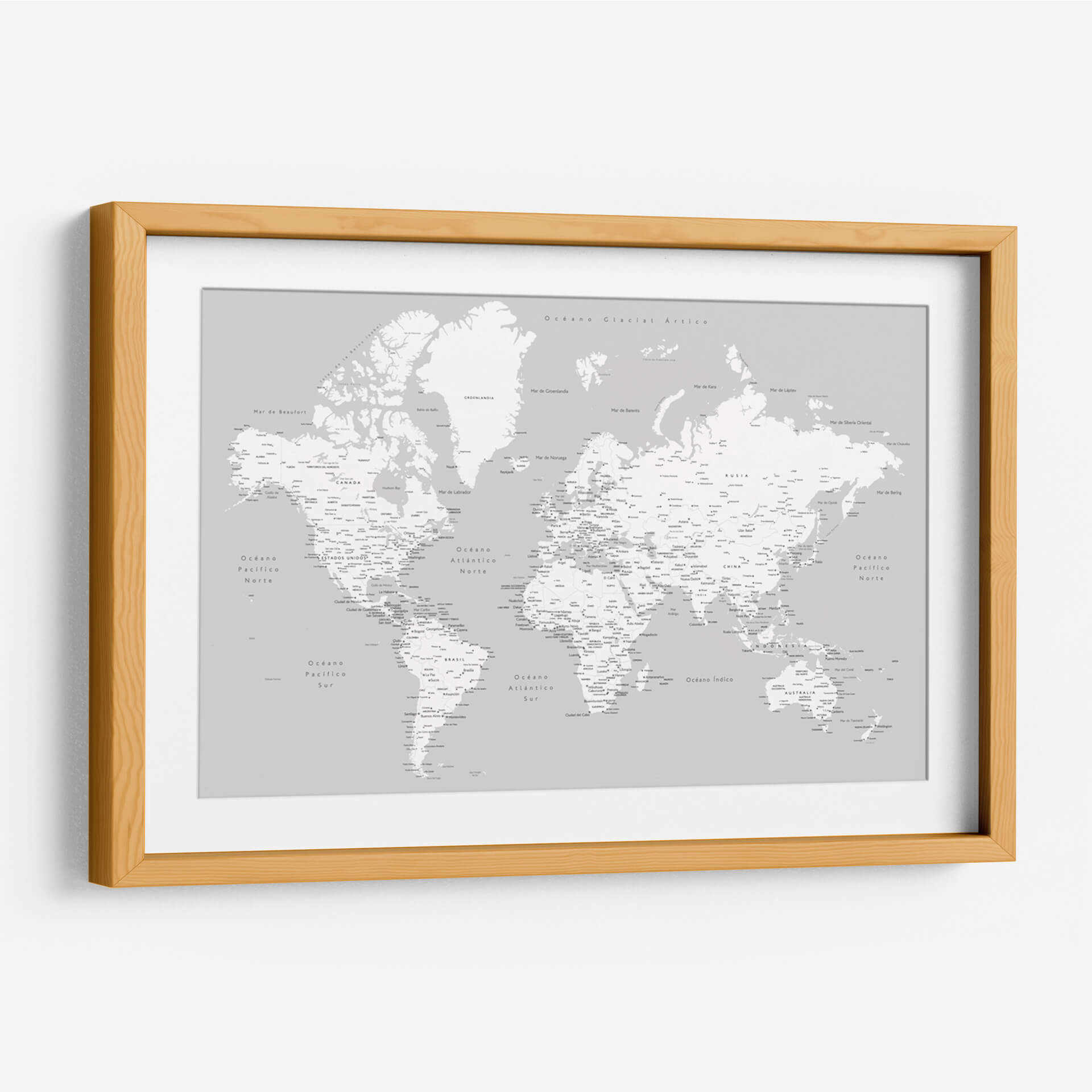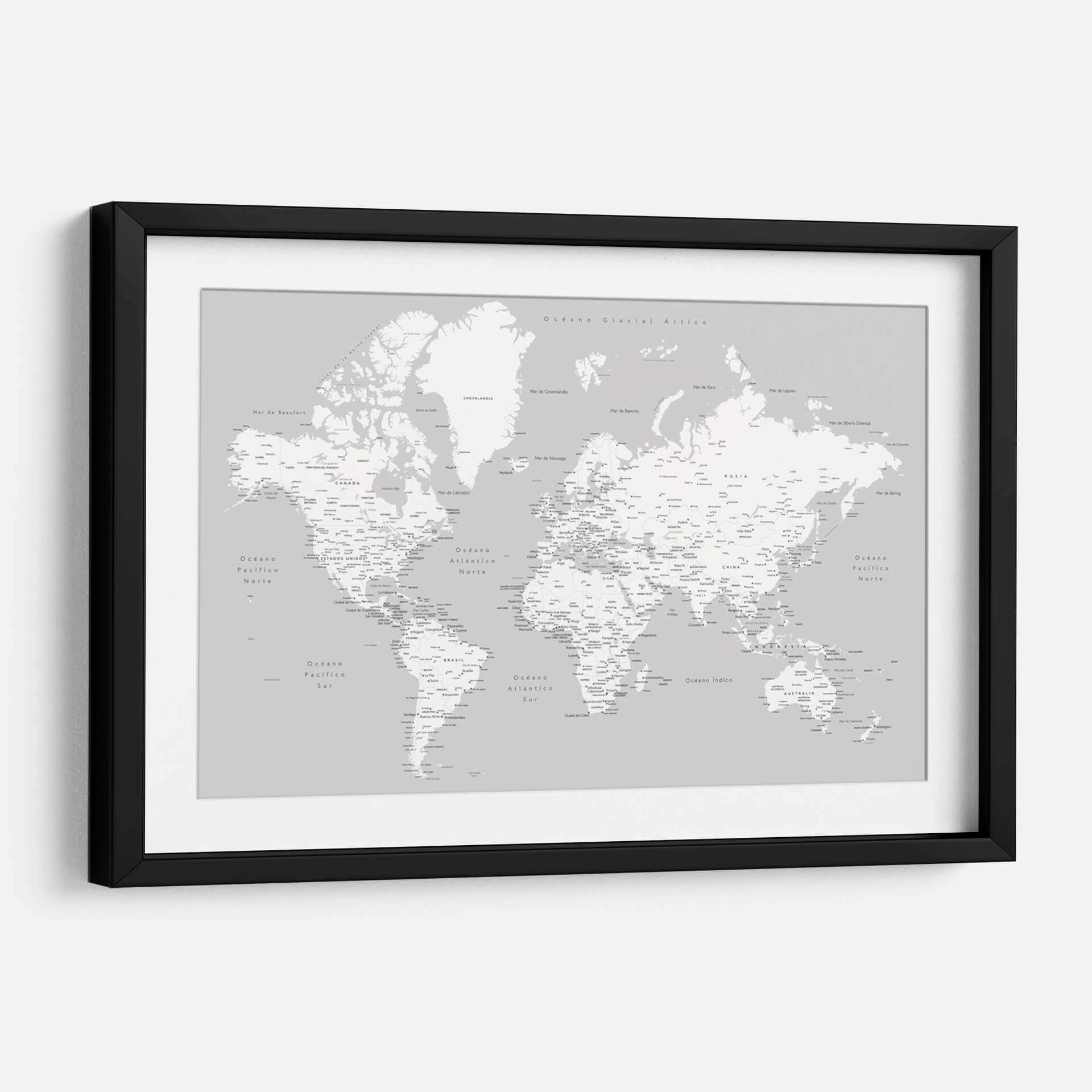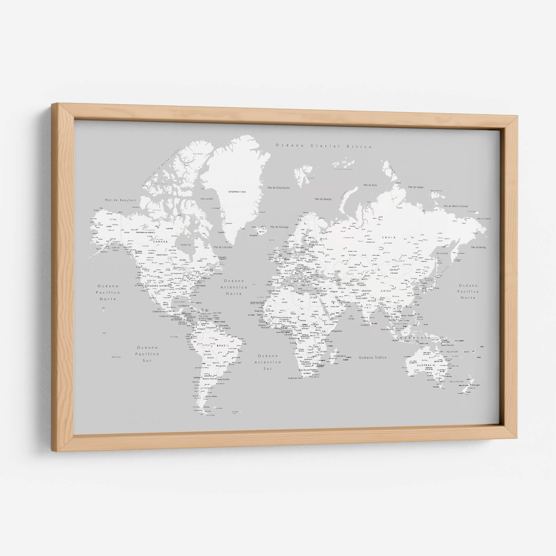 Transforma tu espacio con este cautivador cuadro decorativo de mapa mundial, una pieza que fusiona la elegancia del diseño contemporáneo con la utilidad informativa. La obra presenta el mundo en una paleta de grises sutiles y detallados, con nombres de países, ciudades y océanos claramente visibles en español. Su estilo minimalista y monocromático la convierte en una adición versátil para cualquier decoración, desde oficinas modernas hasta salas de estar acogedoras. Este mapa mundial en lienzo no solo sirve como un elemento decorativo sofisticado, sino que también evoca un sentido de exploración, conocimiento y conexión global. Imagina cómo esta pieza puede convertirse en el punto focal de tu pared, invitando a la conversación y añadiendo un toque de cultura y geografía a tu hogar u oficina. Ideal para los amantes de los viajes, estudiantes, profesionales o cualquier persona que aprecie un diseño limpio y una representación detallada del planeta. Añade un toque de distinción y consciencia global a tu entorno con este impresionante mapa decorativo.