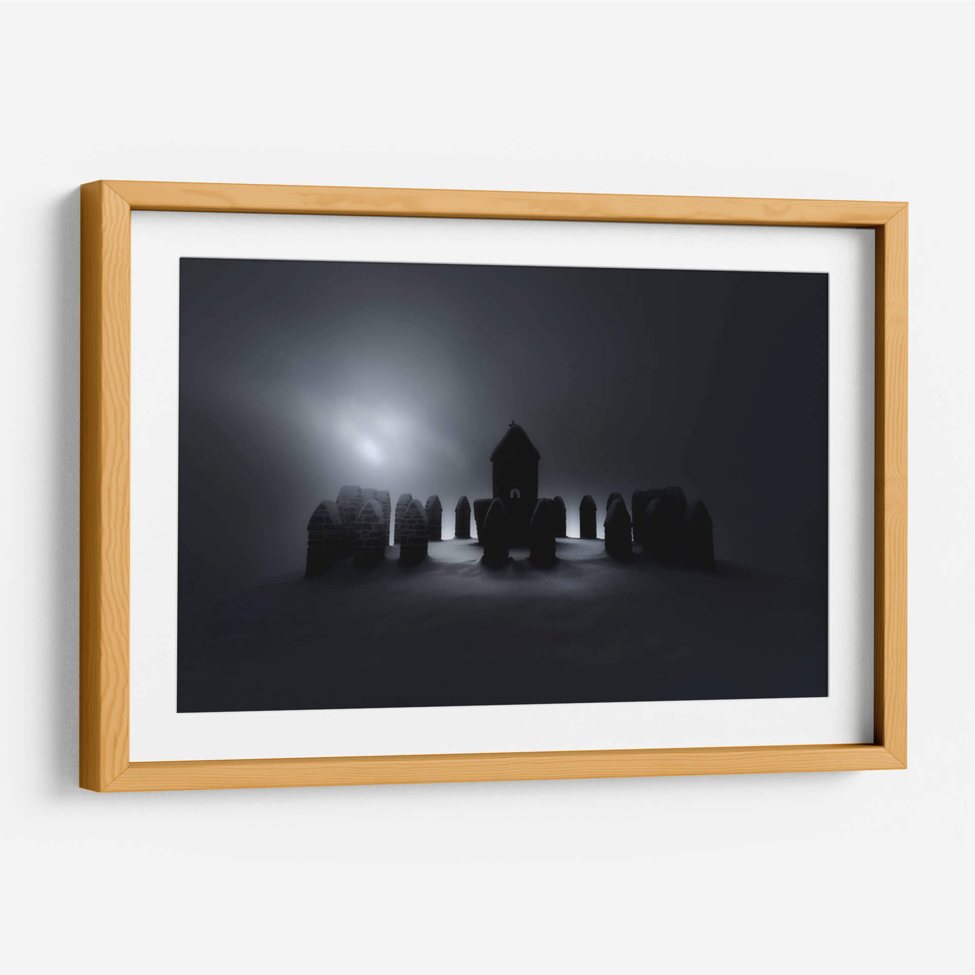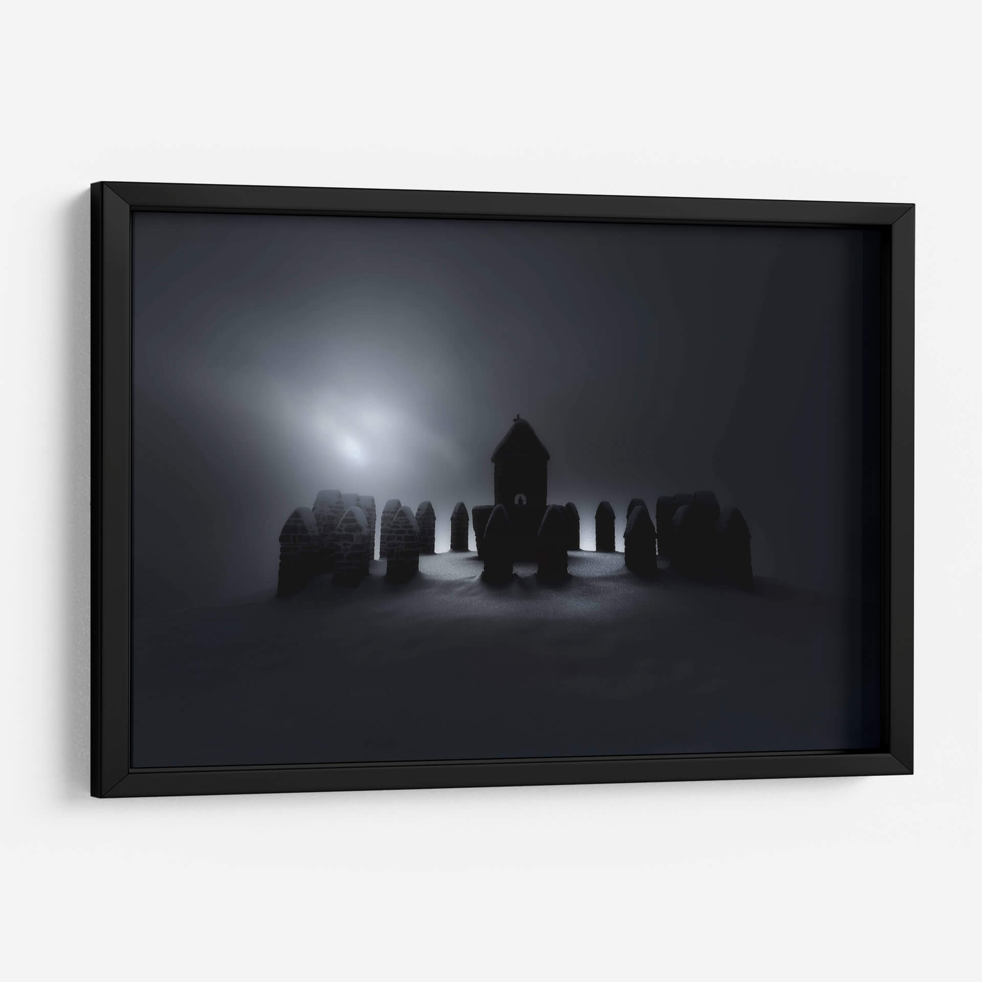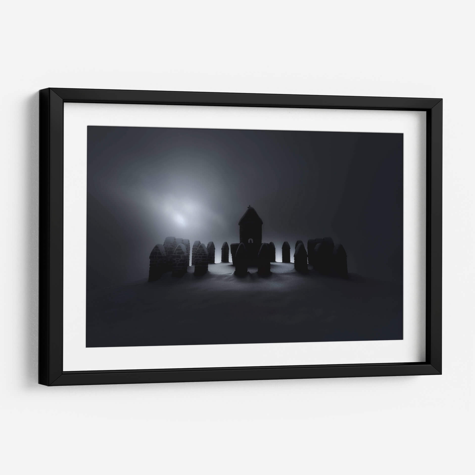 Sumérgete en la atmósfera enigmática y serena de "No de aquí" de Filippo Manini. Este cuadro decorativo captura una escena invernal desolada, donde una estructura central, evocando una pequeña capilla o monumento, se erige rodeada por una formación circular de piedras o estelas cubiertas de nieve. La iluminación dramática, con un resplandor etéreo que emana del centro y se difumina hacia los bordes oscuros, crea una sensación de misterio y contemplación. Los tonos fríos y la paleta predominantemente en grises y negros intensifican la quietud y el aislamiento de la escena. La composición simétrica y la profundidad sugerida por la niebla o la ventisca transportan al espectador a un lugar de profunda introspección. "No de aquí" es ideal para espacios que buscan un toque de melancolía poética y una atmósfera de tranquilidad silenciosa. Perfecto para salones modernos, estudios o dormitorios donde se desee una pieza de arte que invite a la reflexión y añada carácter sin abrumar.