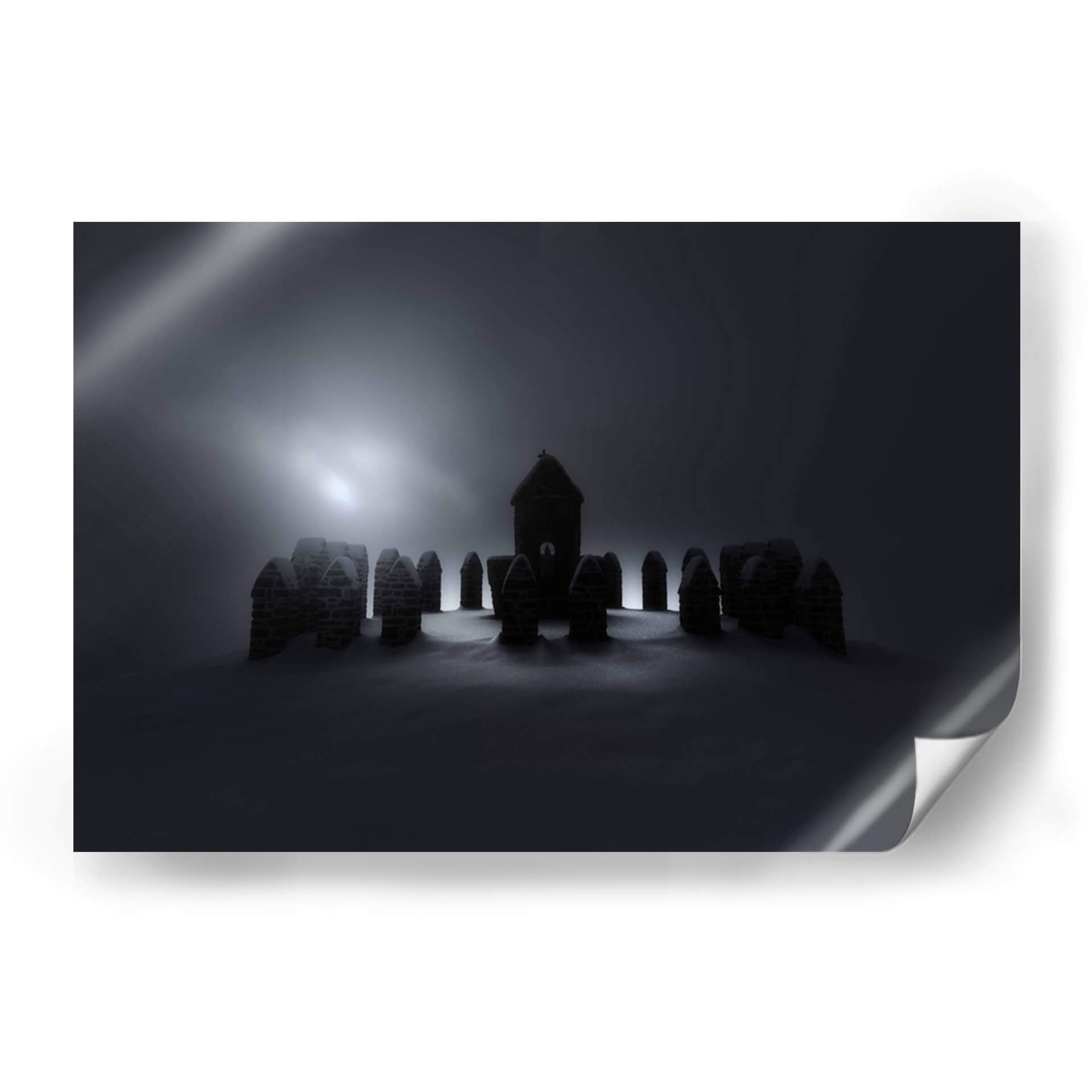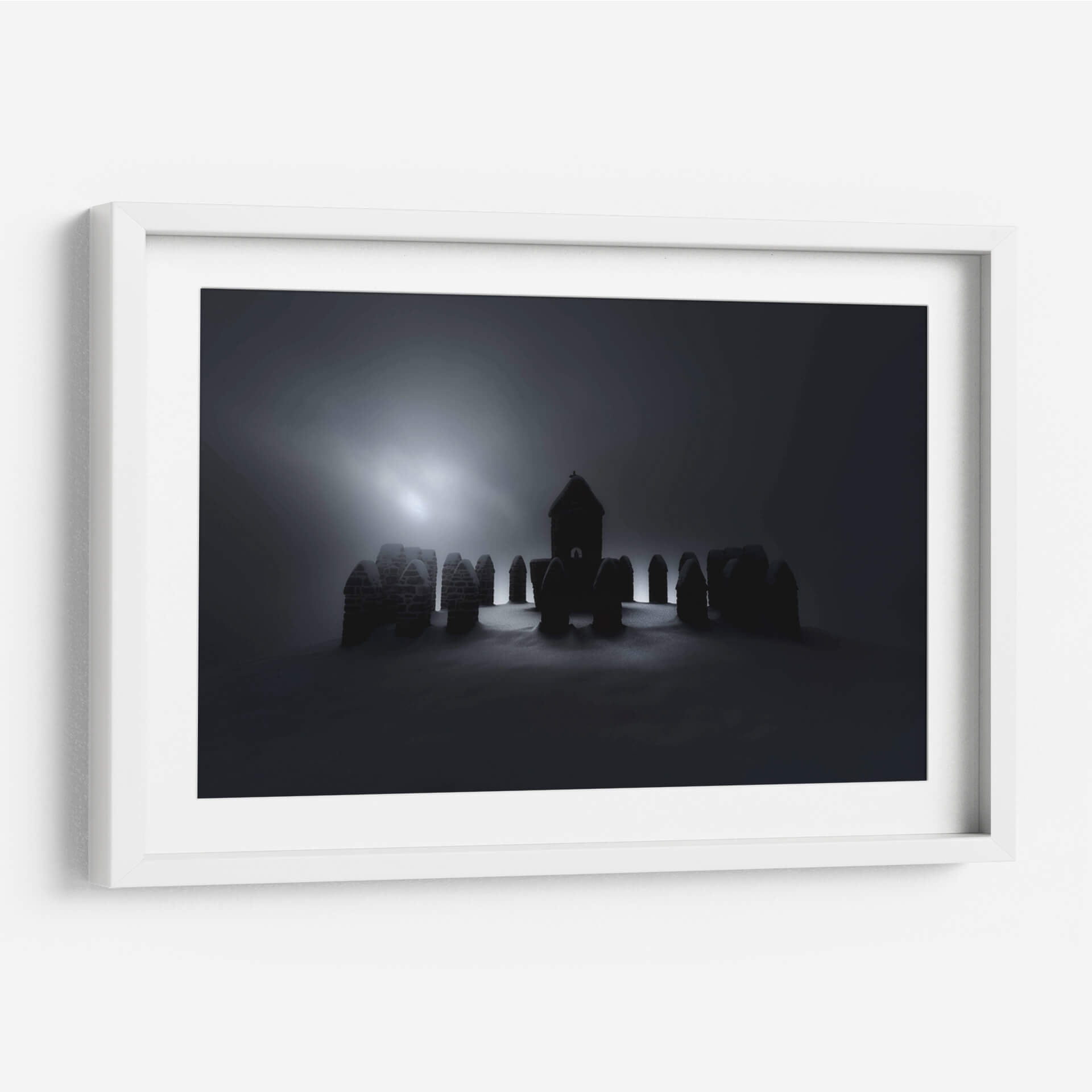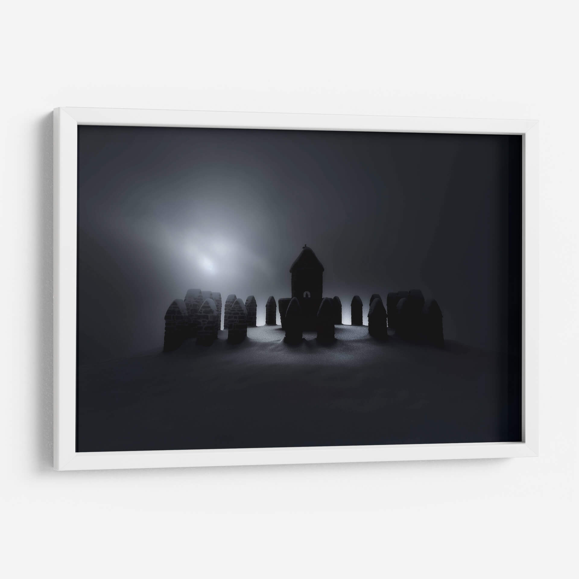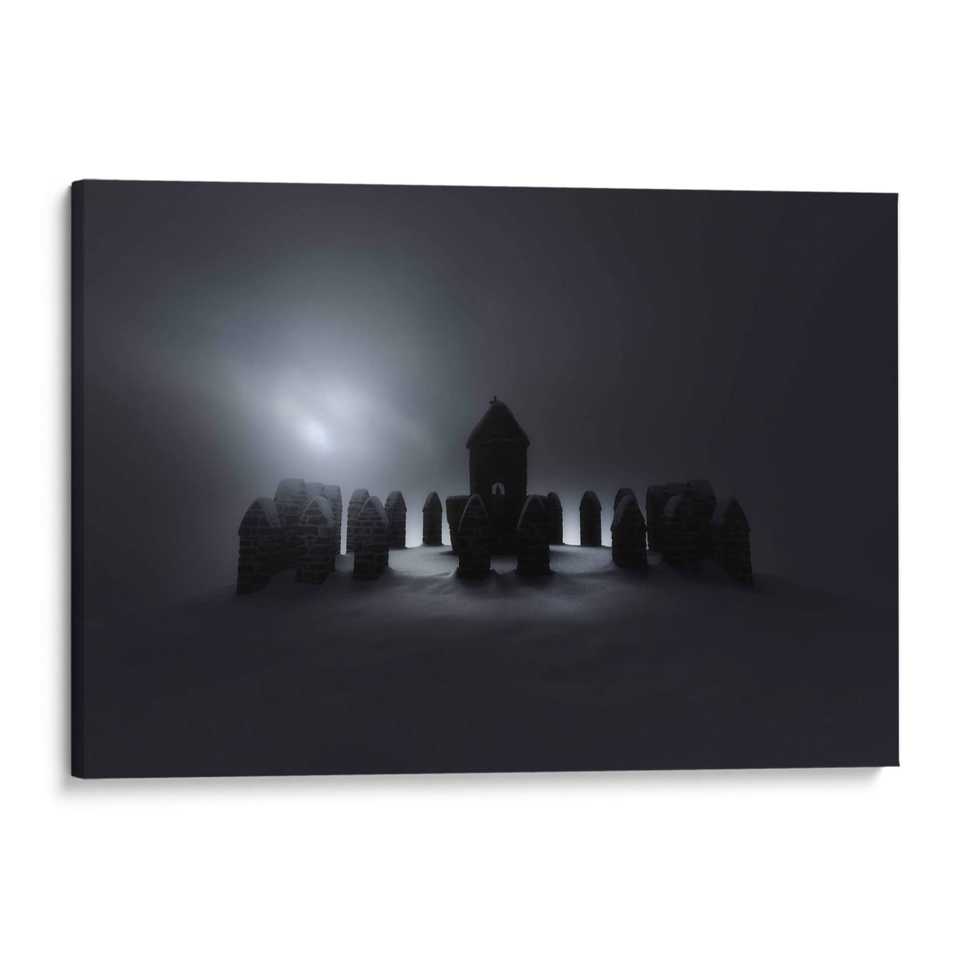 Sumérgete en la atmósfera enigmática y serena de "No de aquí" de Filippo Manini. Este cuadro decorativo captura una escena invernal desolada, donde una estructura central, evocando una pequeña capilla o monumento, se erige rodeada por una formación circular de piedras o estelas cubiertas de nieve. La iluminación dramática, con un resplandor etéreo que emana del centro y se difumina hacia los bordes oscuros, crea una sensación de misterio y contemplación. Los tonos fríos y la paleta predominantemente en grises y negros intensifican la quietud y el aislamiento de la escena. La composición simétrica y la profundidad sugerida por la niebla o la ventisca transportan al espectador a un lugar de profunda introspección. "No de aquí" es ideal para espacios que buscan un toque de melancolía poética y una atmósfera de tranquilidad silenciosa. Perfecto para salones modernos, estudios o dormitorios donde se desee una pieza de arte que invite a la reflexión y añada carácter sin abrumar.