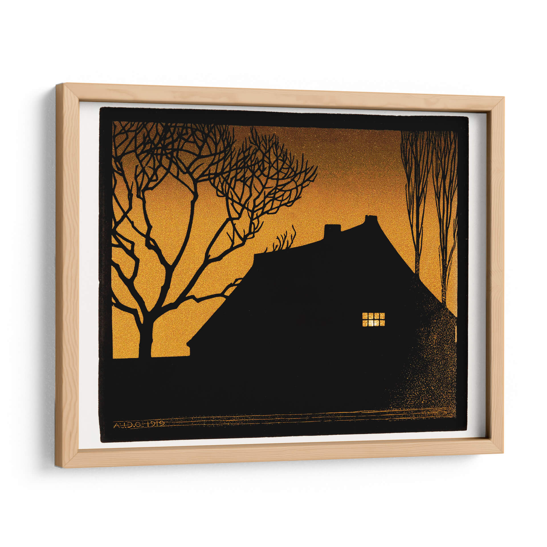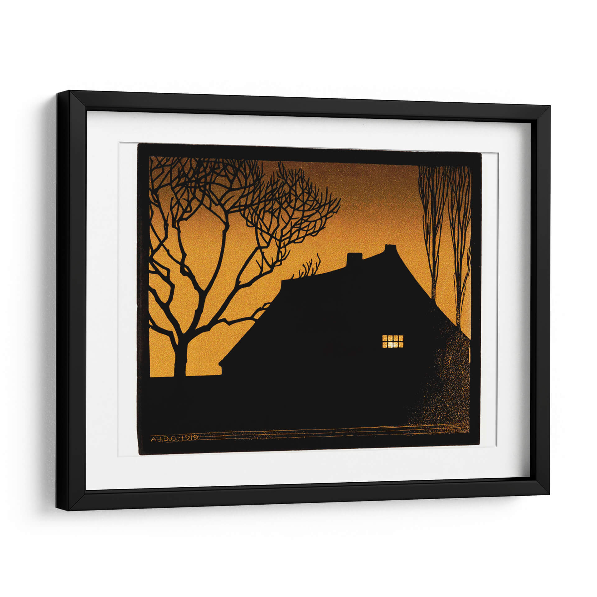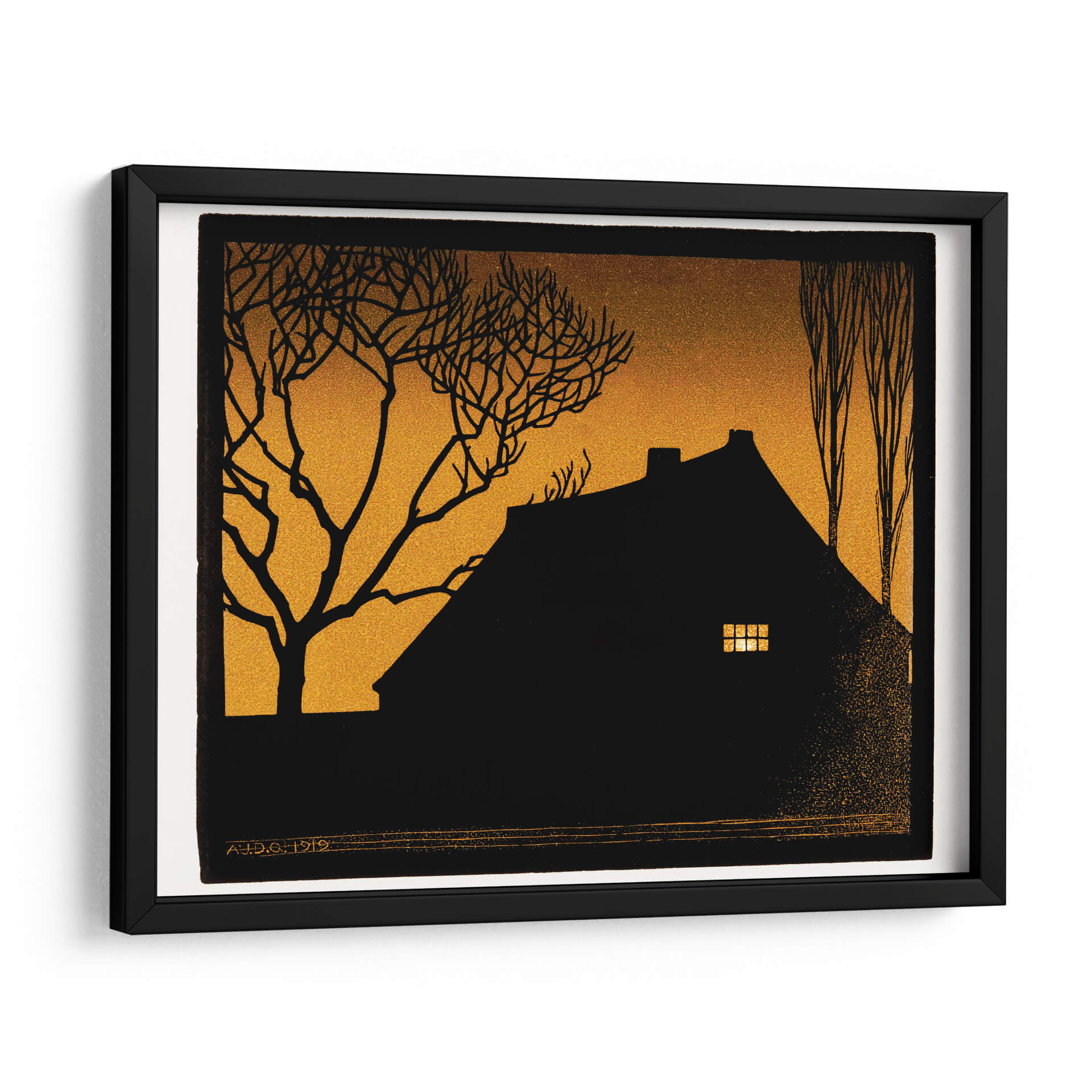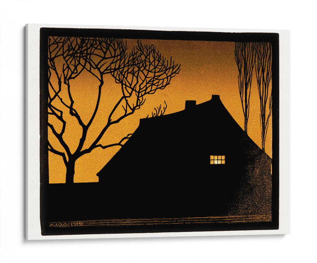 Sumérgete en la atmósfera envolvente de "Noche de invierno", una obra de arte que captura la serena belleza de una escena nocturna. Este cuadro decorativo presenta una silueta de casa oscura recortada contra un cielo crepuscular de tonos dorados y ámbar, salpicado por la luz cálida de una ventana iluminada que sugiere un refugio acogedor. Los árboles desnudos, con sus ramas intrincadas, añaden un toque de melancolía y simplicidad a la composición, evocando la quietud característica de los meses fríos. El estilo gráfico y el uso audaz de contrastes entre el negro profundo y los matices cálidos del fondo crean una pieza visualmente impactante. Ideal para quienes buscan infundir calma y un toque de misterio en su hogar u oficina, este cuadro decorativo es una invitación a la contemplación. Su paleta de colores cálidos, a pesar de evocar el invierno, aporta una sensación de calidez hogareña, convirtiéndola en una adición perfecta para salones, dormitorios o estudios que deseen un punto focal elegante y evocador.